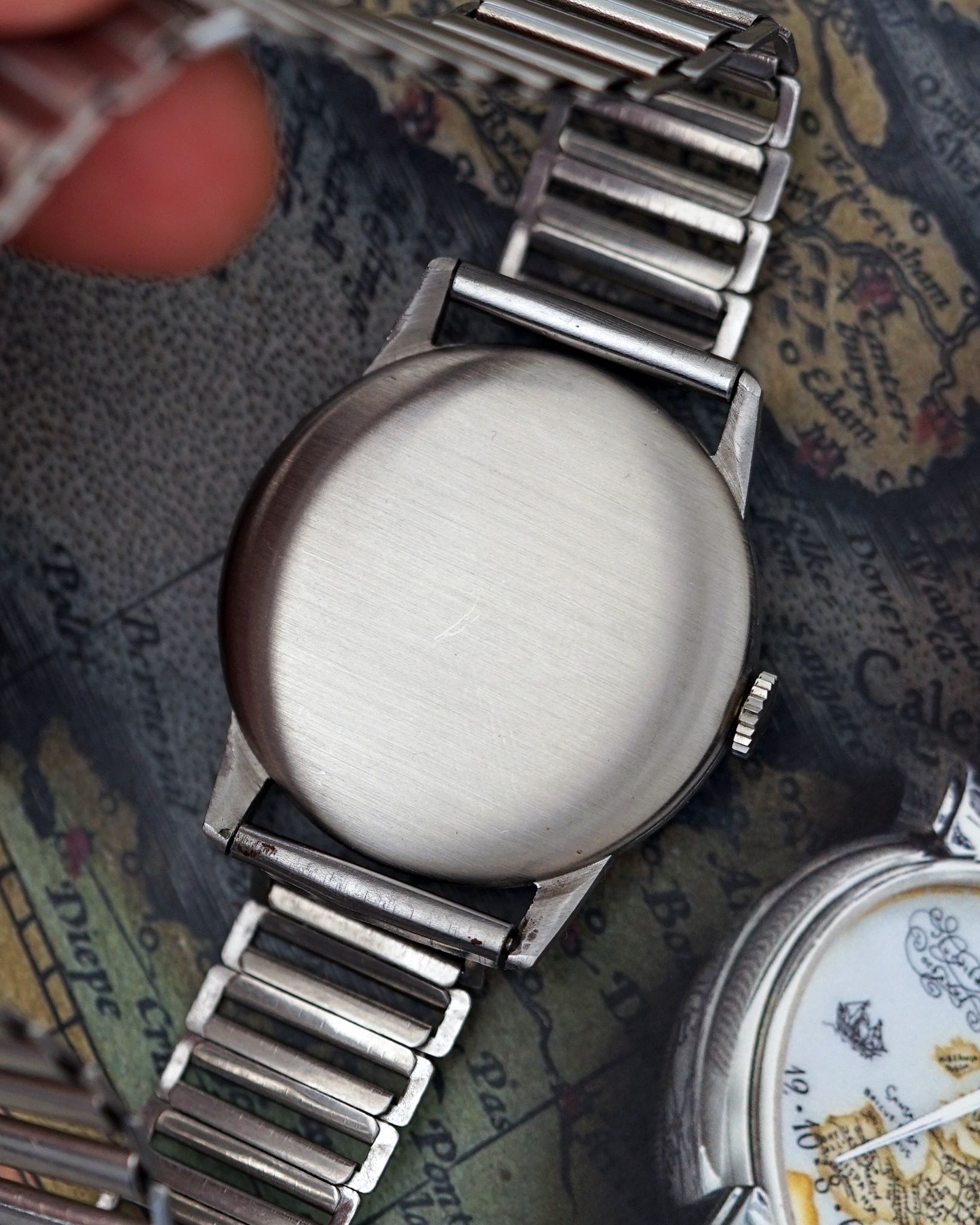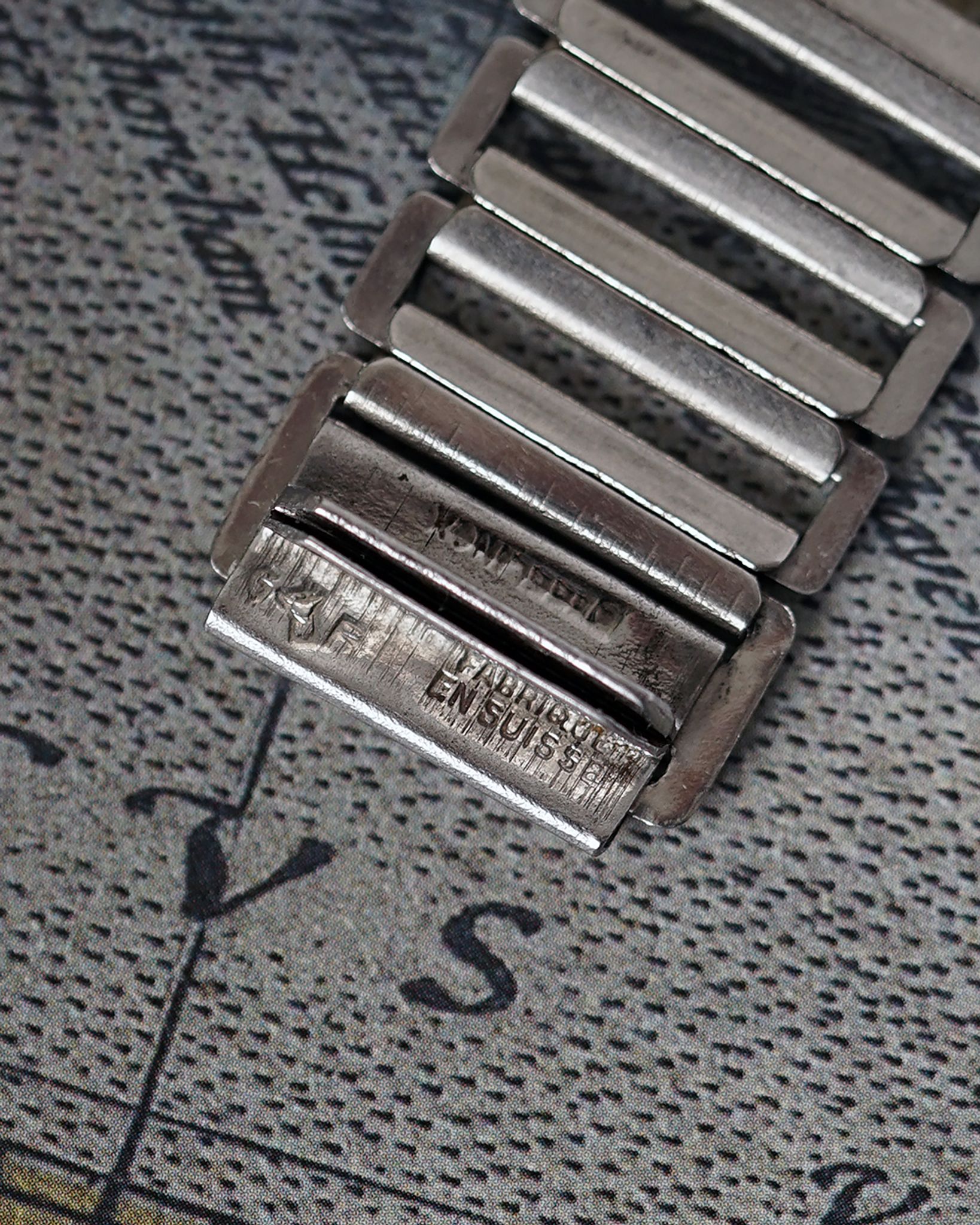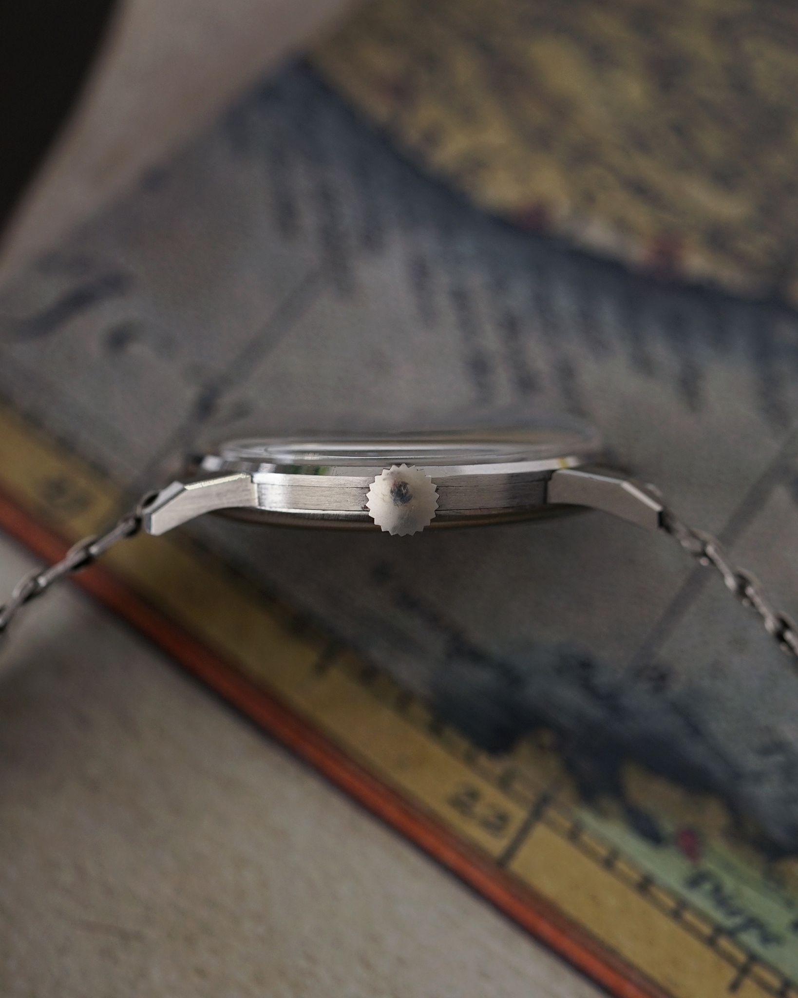 This piece remains in true new old stock condition, unworn, with only the faintest hairlines from careful handling. The crown, original and unsigned, the dial is pristine, bright, and untouched. It comes fitted with a vintage stainless steel Gay Frères 'Bamboo' bracelet, adding just the right note of period-correct cool.