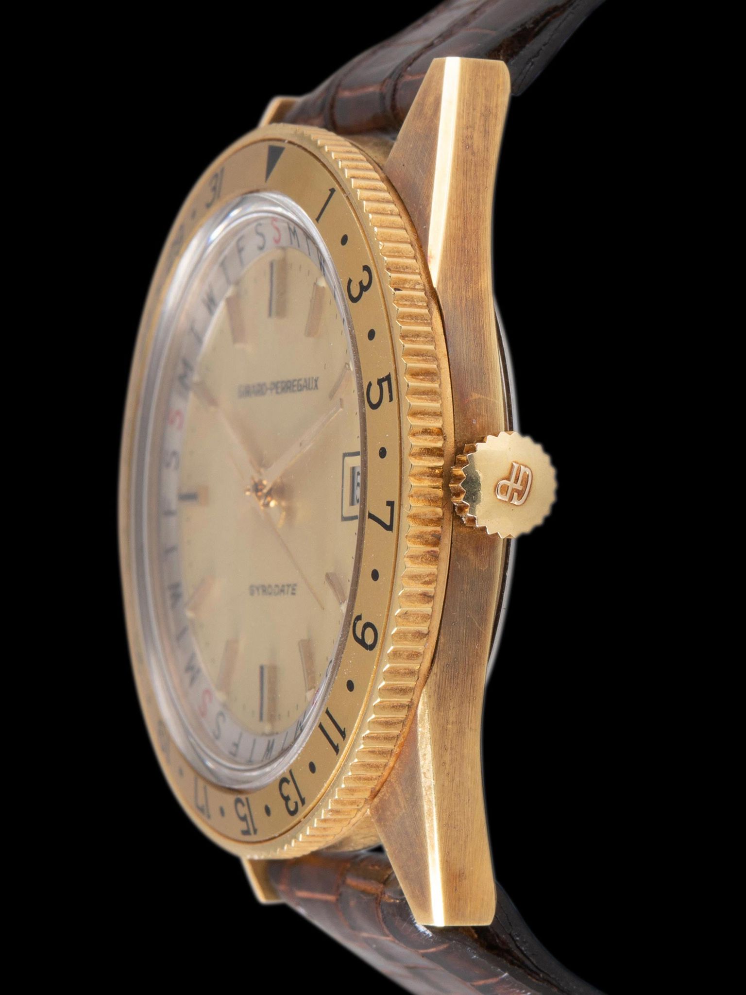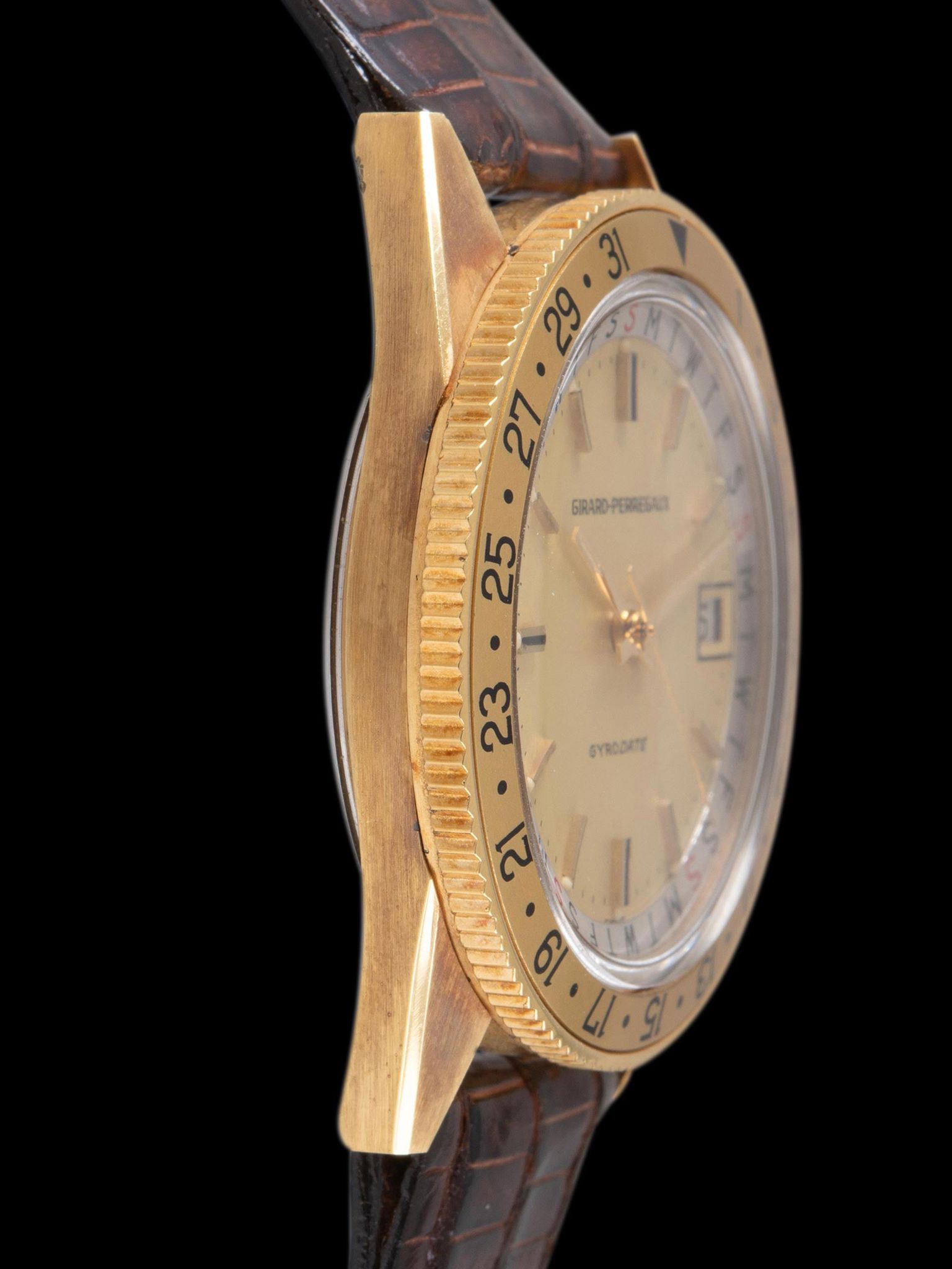 The exceptional NOS or "new old stock" case is free of any previous wear signs and has achieved a deep patina throughout the gold-plated outer shell. As a result of being NOS, the case retains beautiful, thick, crisp, and symmetrical lugs throughout, as well as its original crown. The case back retains its factory engravings in deep and crisp condition. The rotating calendar bezel is in untouched perfect condition as well. The watch comes supplied on its original Girard-Perregaux brown 2pc crocodile leather strap with a gold plaque "Girard-Perregaux" signed tang buckle.