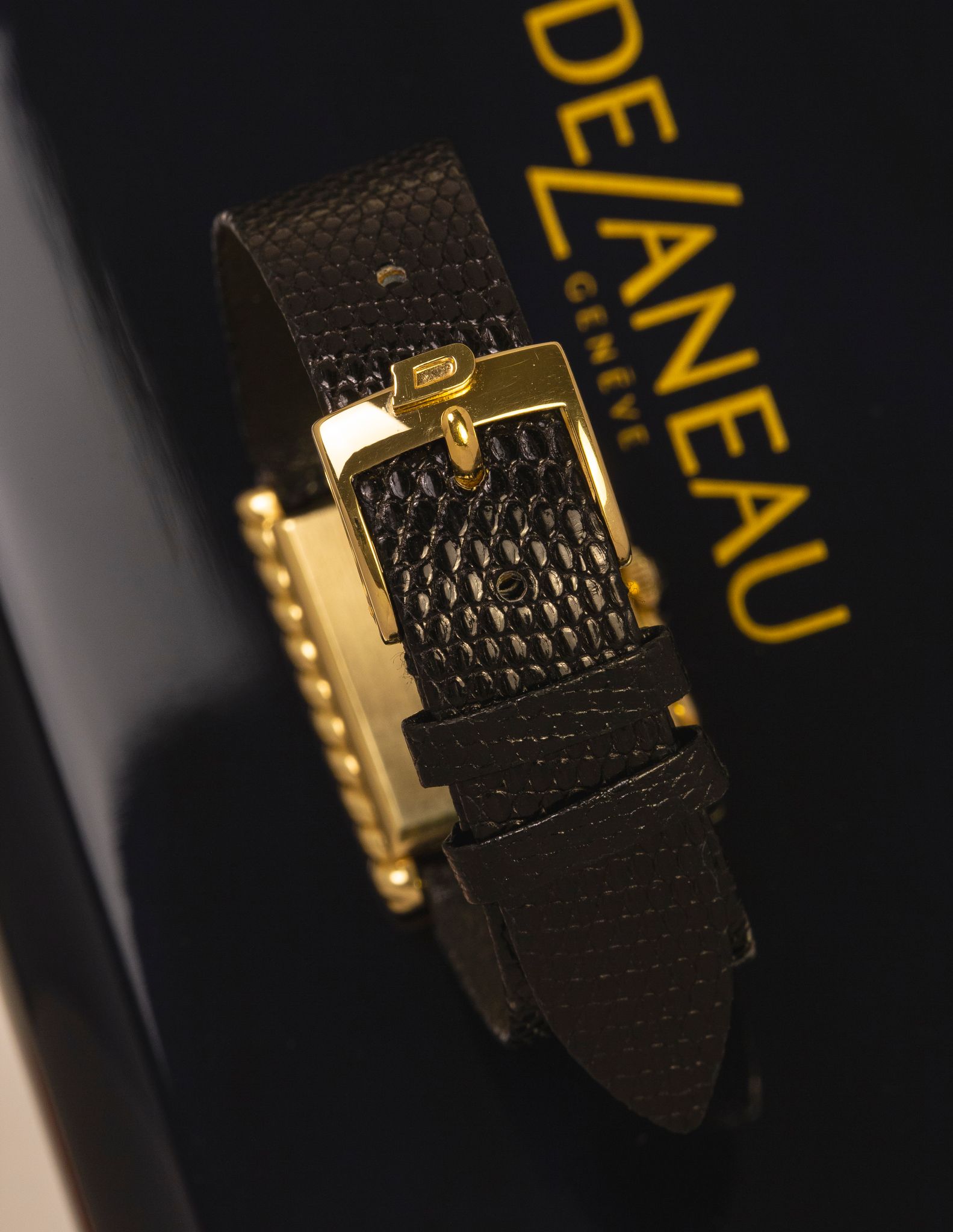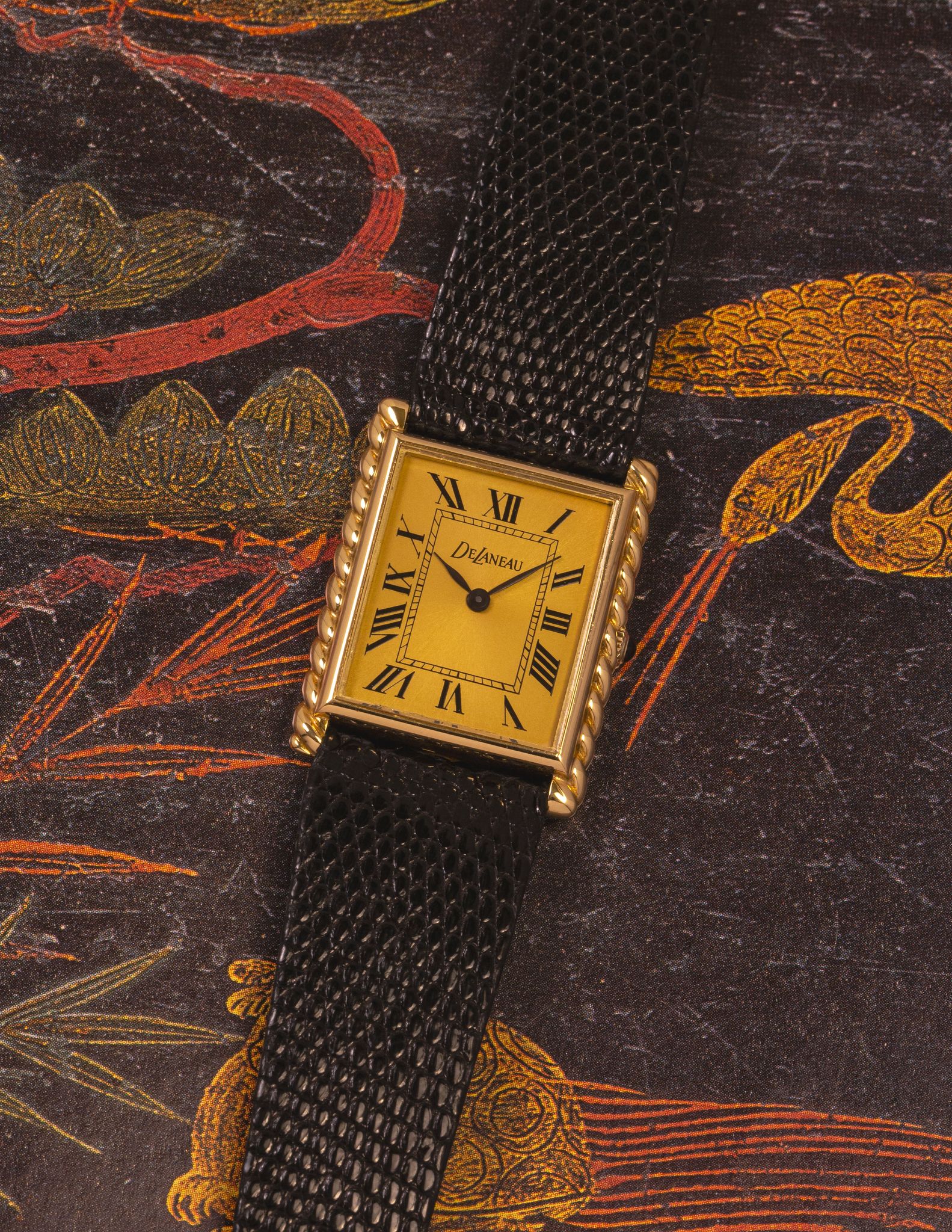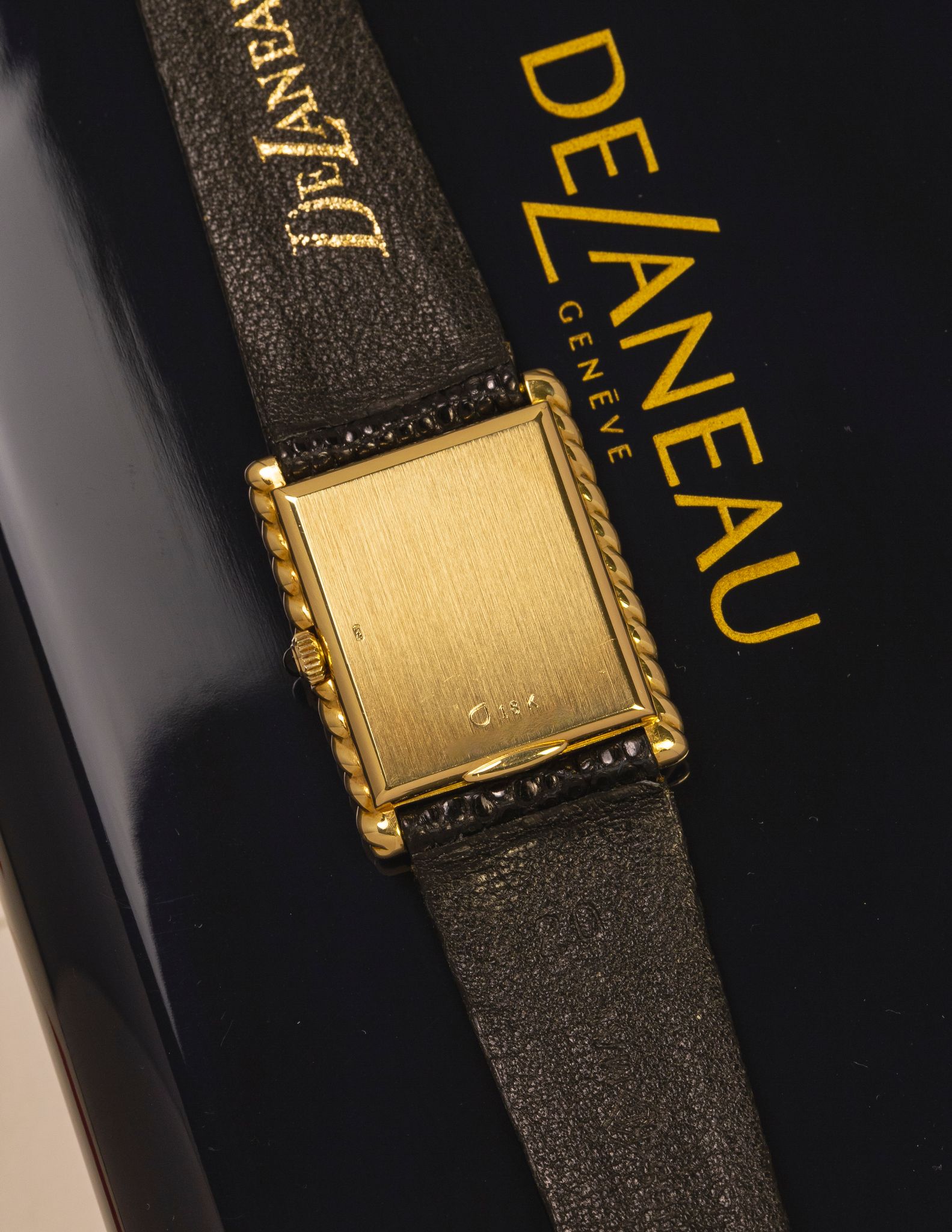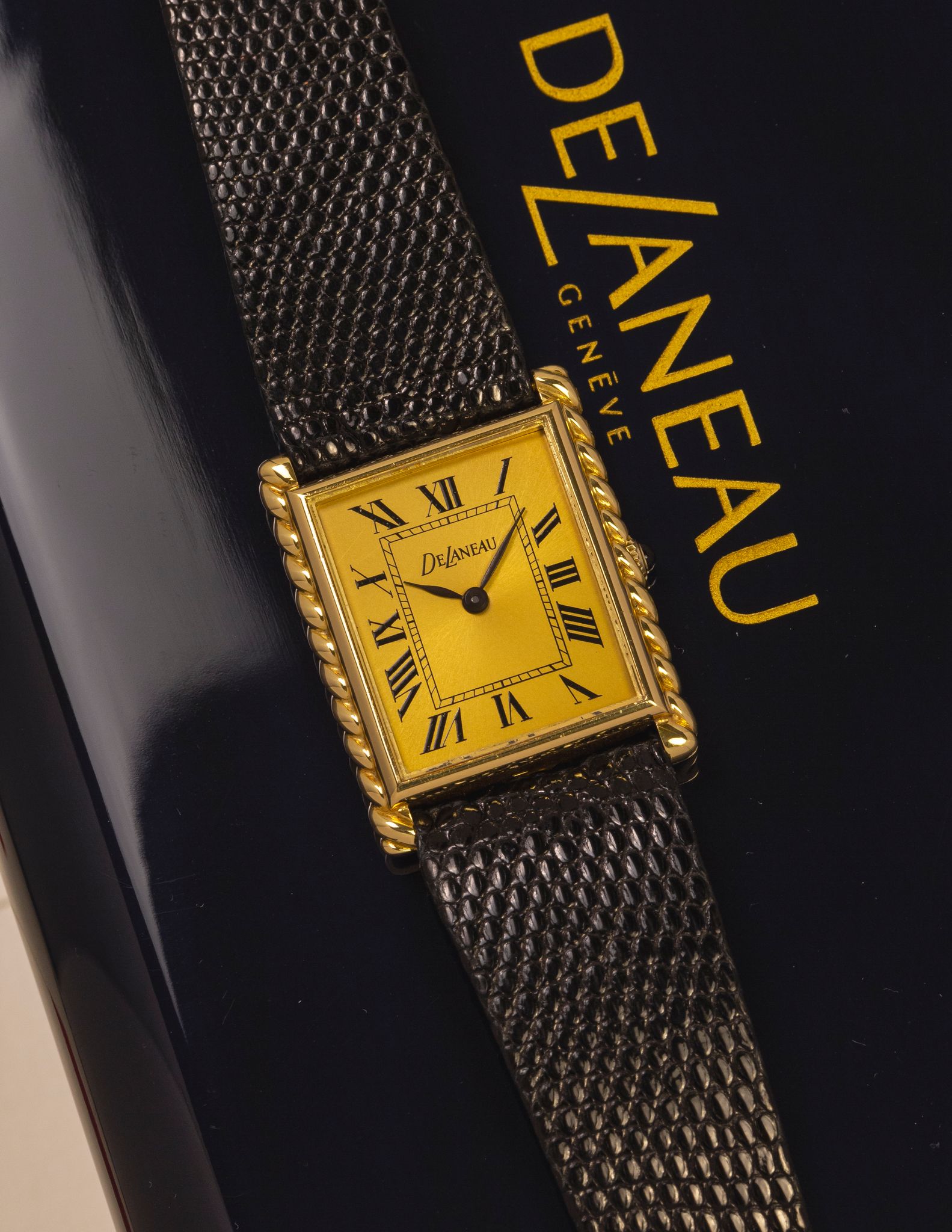 Another sensational DeLaneau for your viewing or wrist pleasure. This one coming in New Old Stock NOS conditions with full set box and papers, hewn in a lustrous 18k yellow gold "Candy Case".