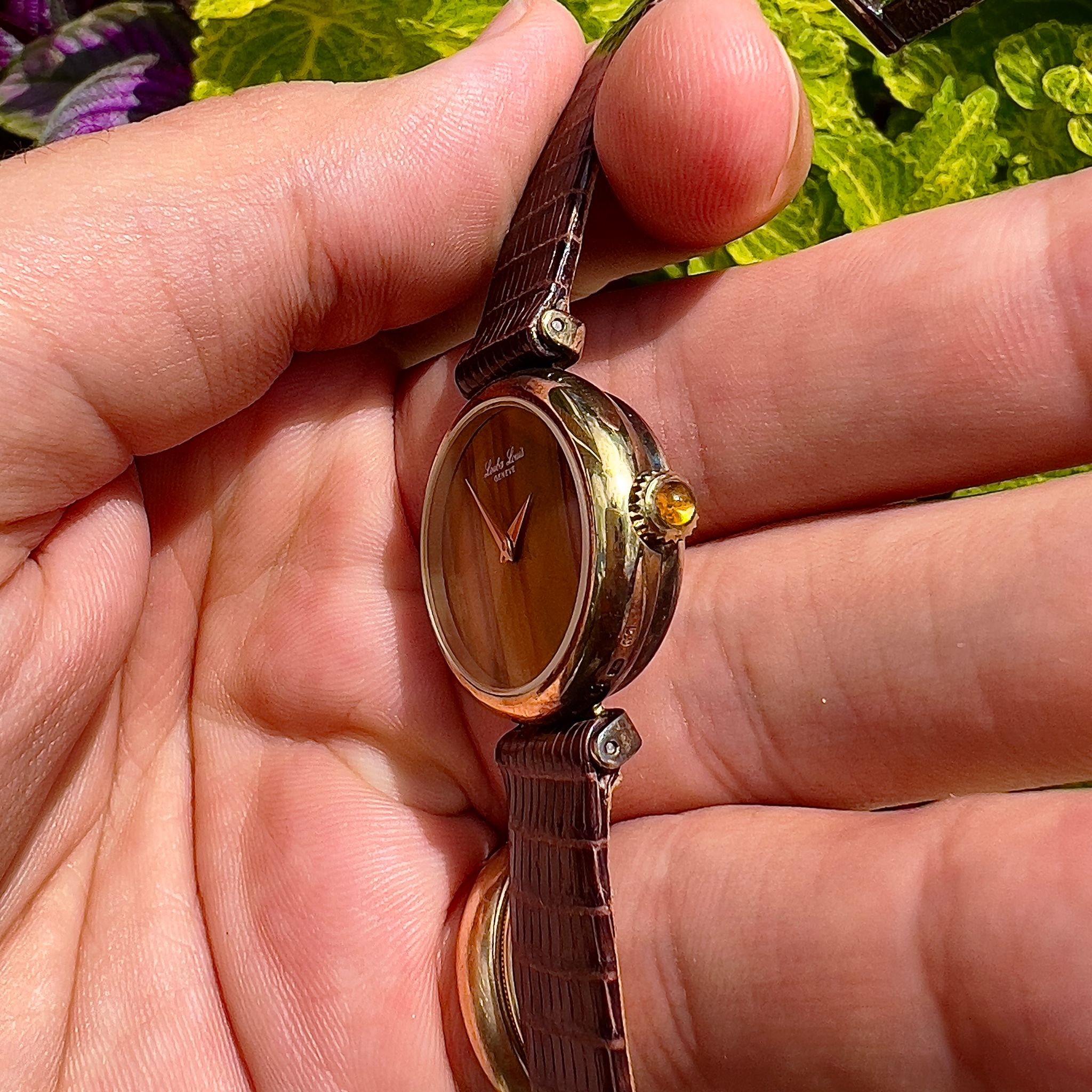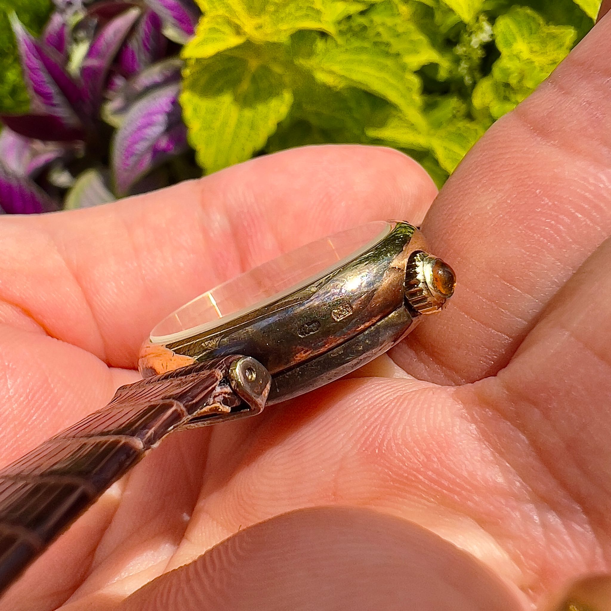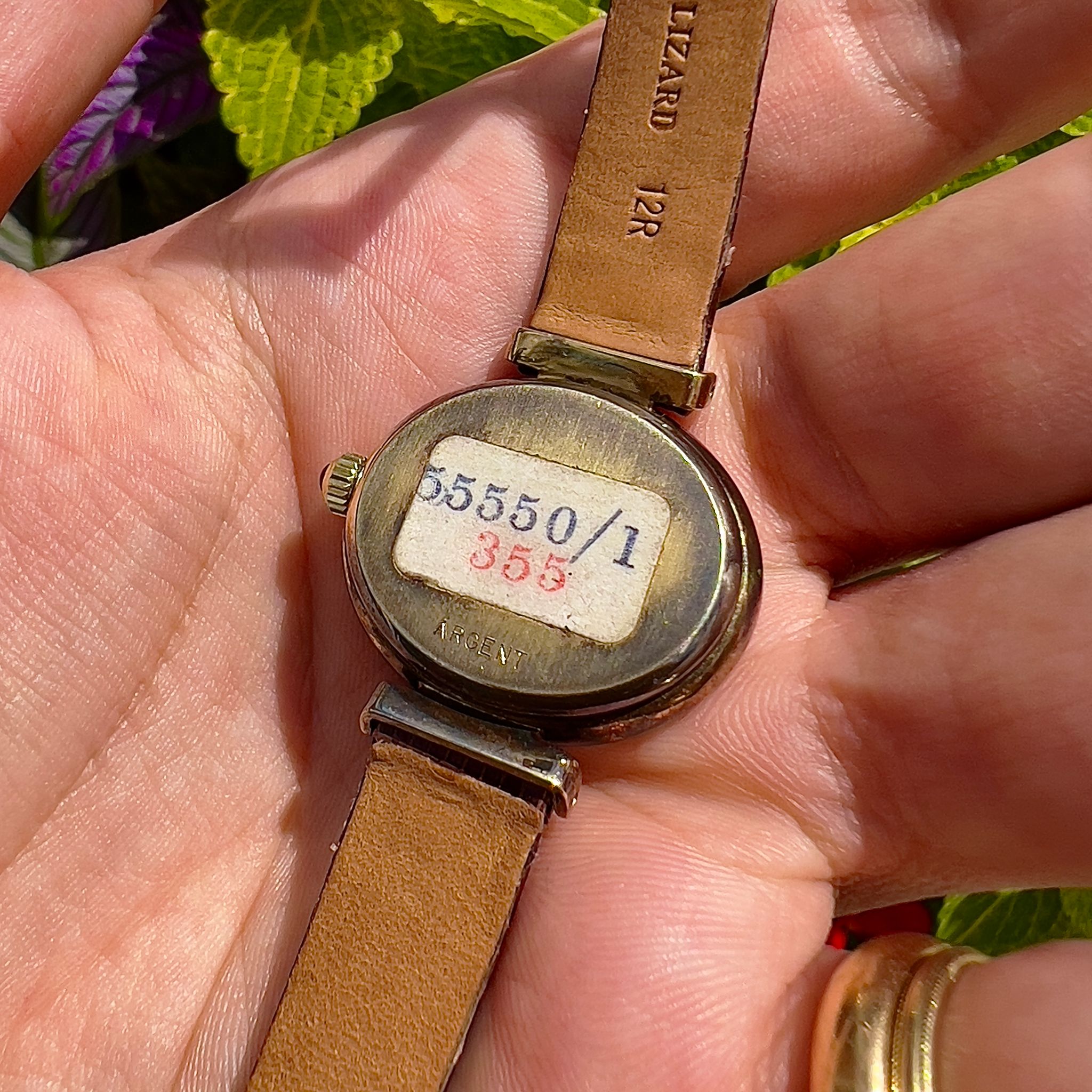 This piece is cased in gold plated sterling silver, AKA vermeil, giving it the appearance of gold but at silver’s price point. The case has grown a wonderful patina but if you’d enjoy it more in its original gold-tone a polishing cloth will take it off quite easily without it being considered “polished”.