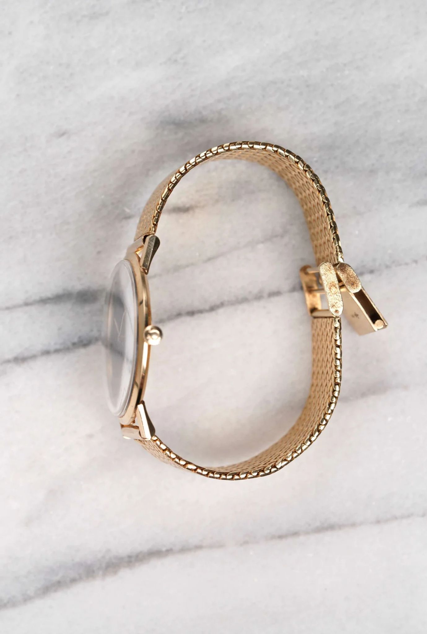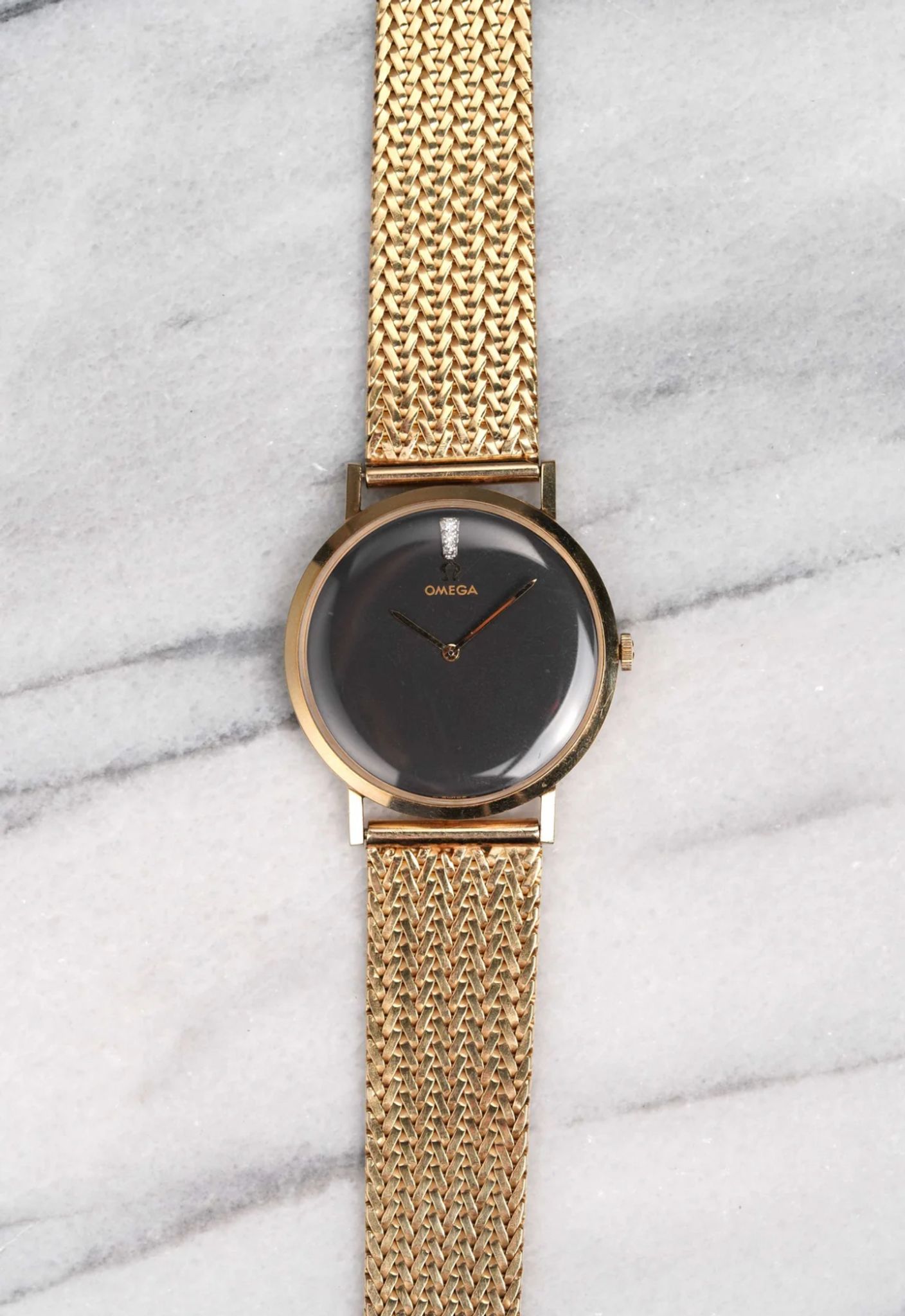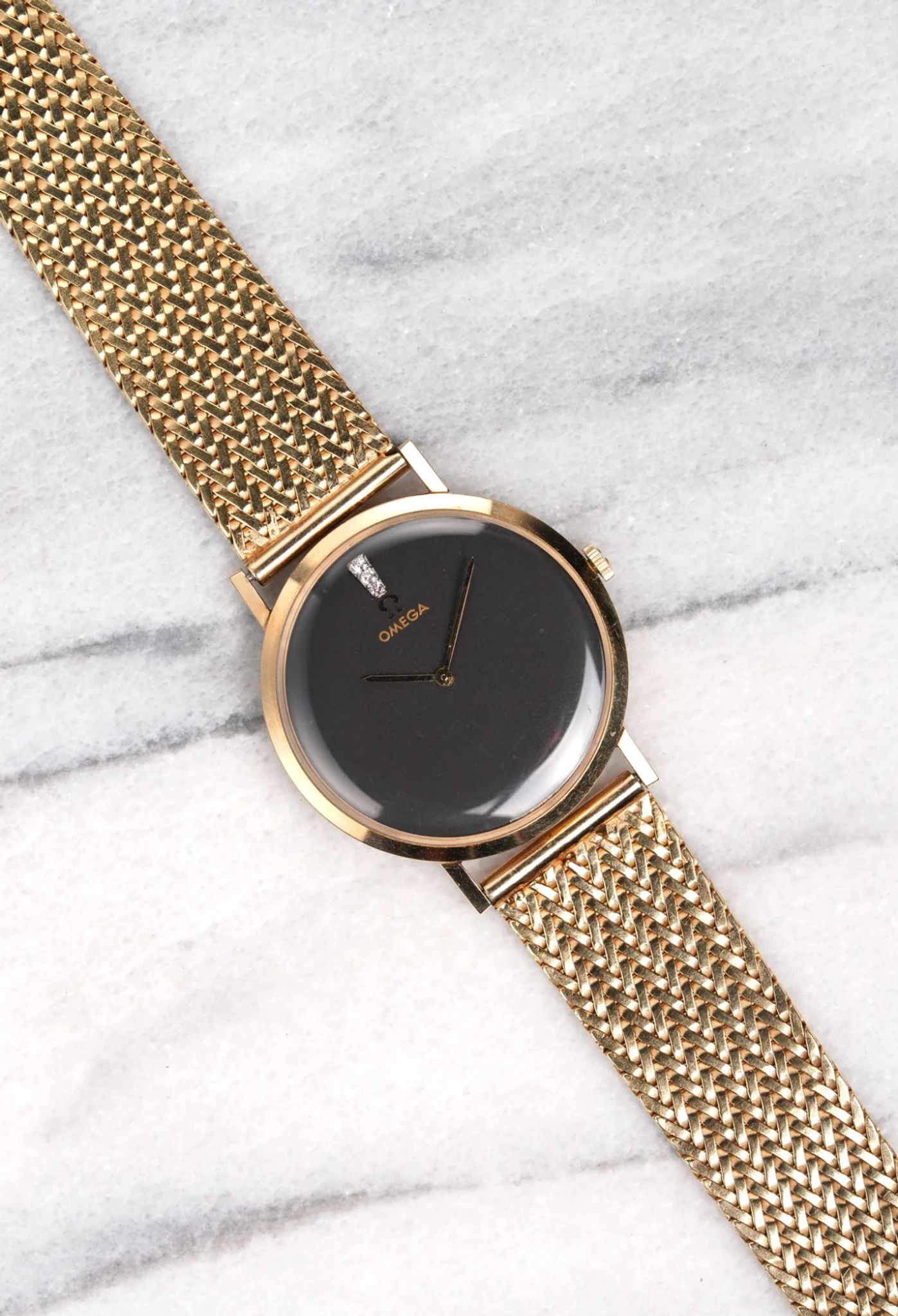 Here's a vintage Omega manual wind in 14K yellow gold with a matte black dial from the 70s. Keeps great time and is fully functional. Measurements include a 33mm case and an 18mm lug width. Its gold mesh bracelet fits up to a 6.75 inch wrist. Yellow gold case and bracelet. The piece is unisex, it can be worn by both men and women. A diamond at 12 a clock. Signed seamster emblem on the caseback. All parts are original including the dial, crown. case, and movement. the dial and case are in great cosmetic, untouched condition.