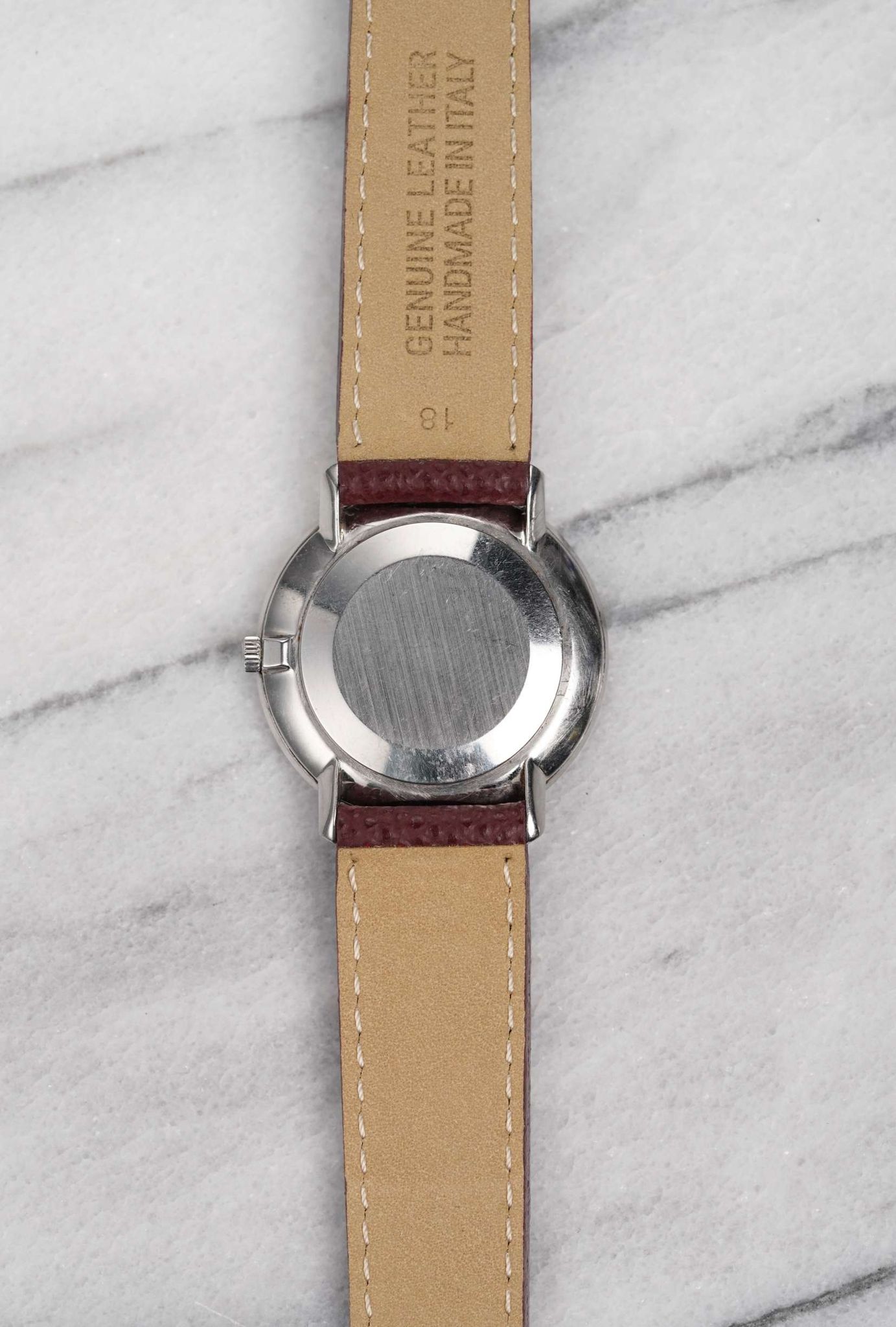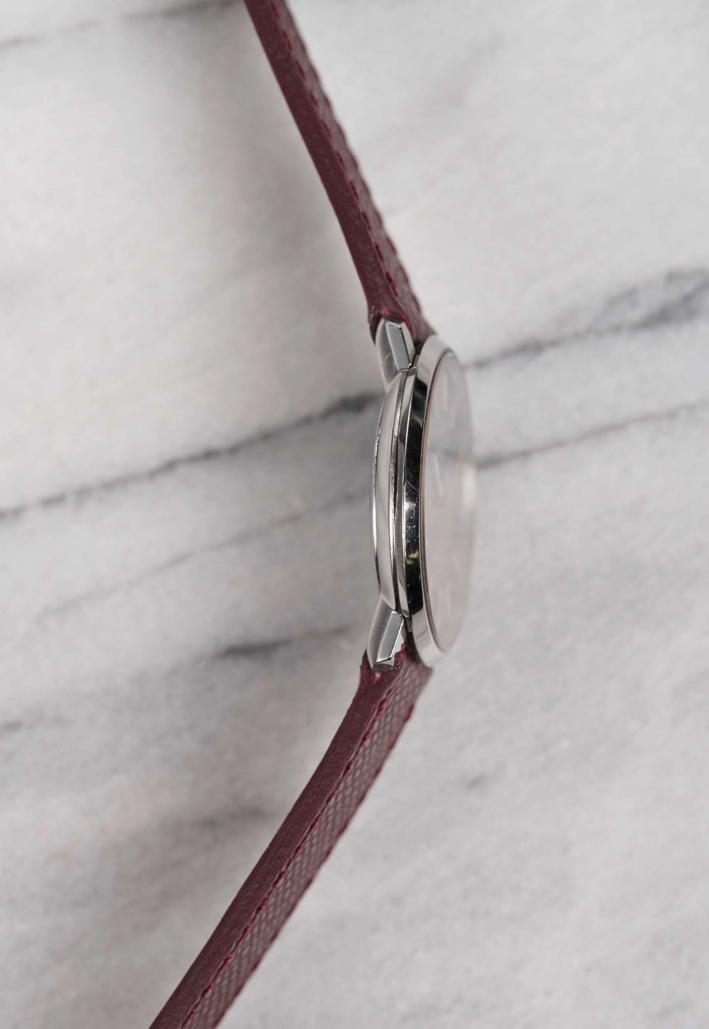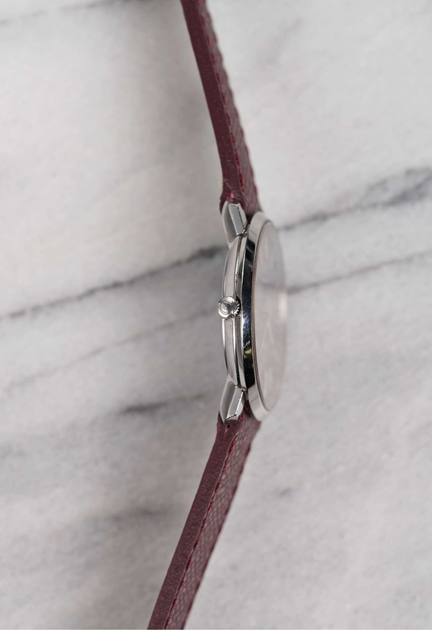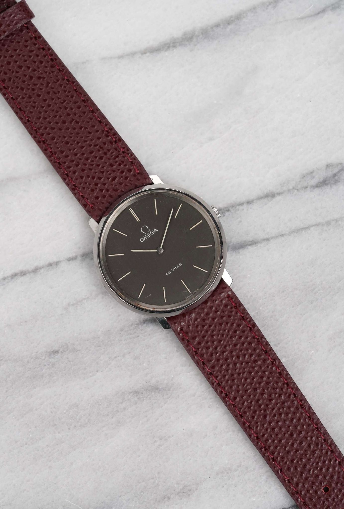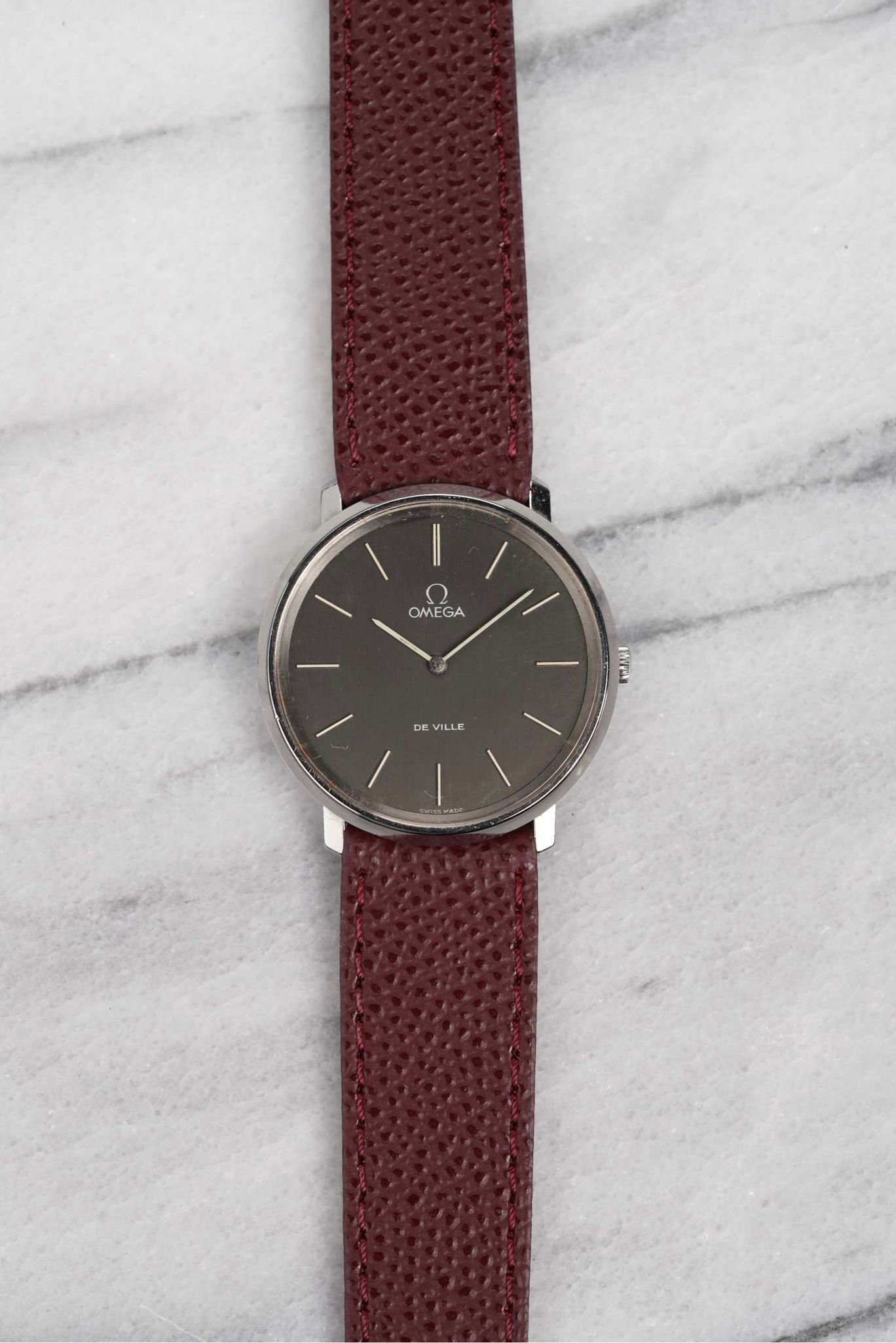 Here's a vintage Omega De Ville manual wind with a matte grey dial from the 1970s. Keeps great time and is fully functional. Measurements include a 33mm case size and 17mm lug width. It's on an aftermarket maroon leather strap (Made in Italy). Time only. Matching stick white hands and hour markers. The dial and crystal are free from any scratches or marks. All parts are original including the signed Omega crown, signed caseback, dial, and movement. Both the dial and case are in great cosmetic, untouched condition.