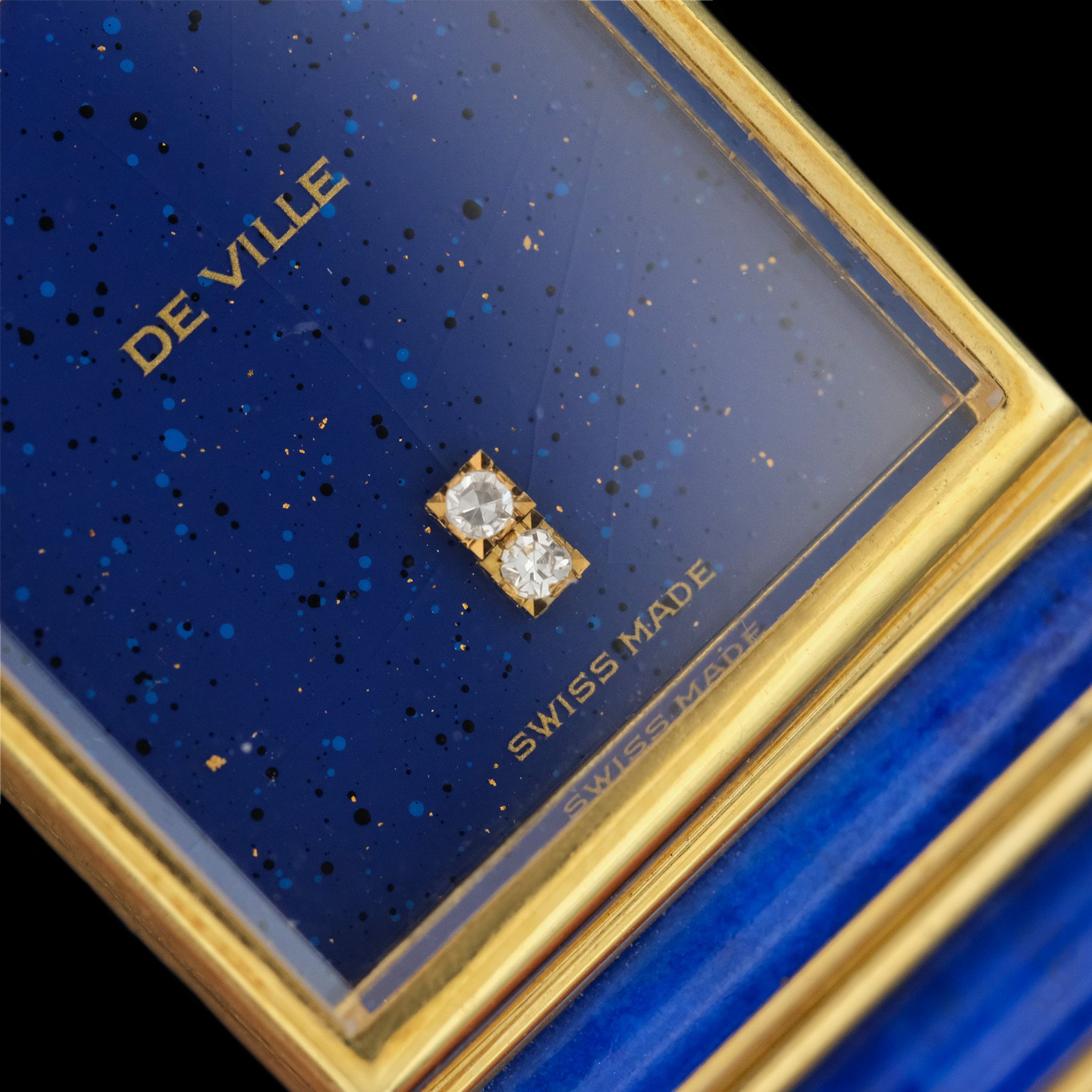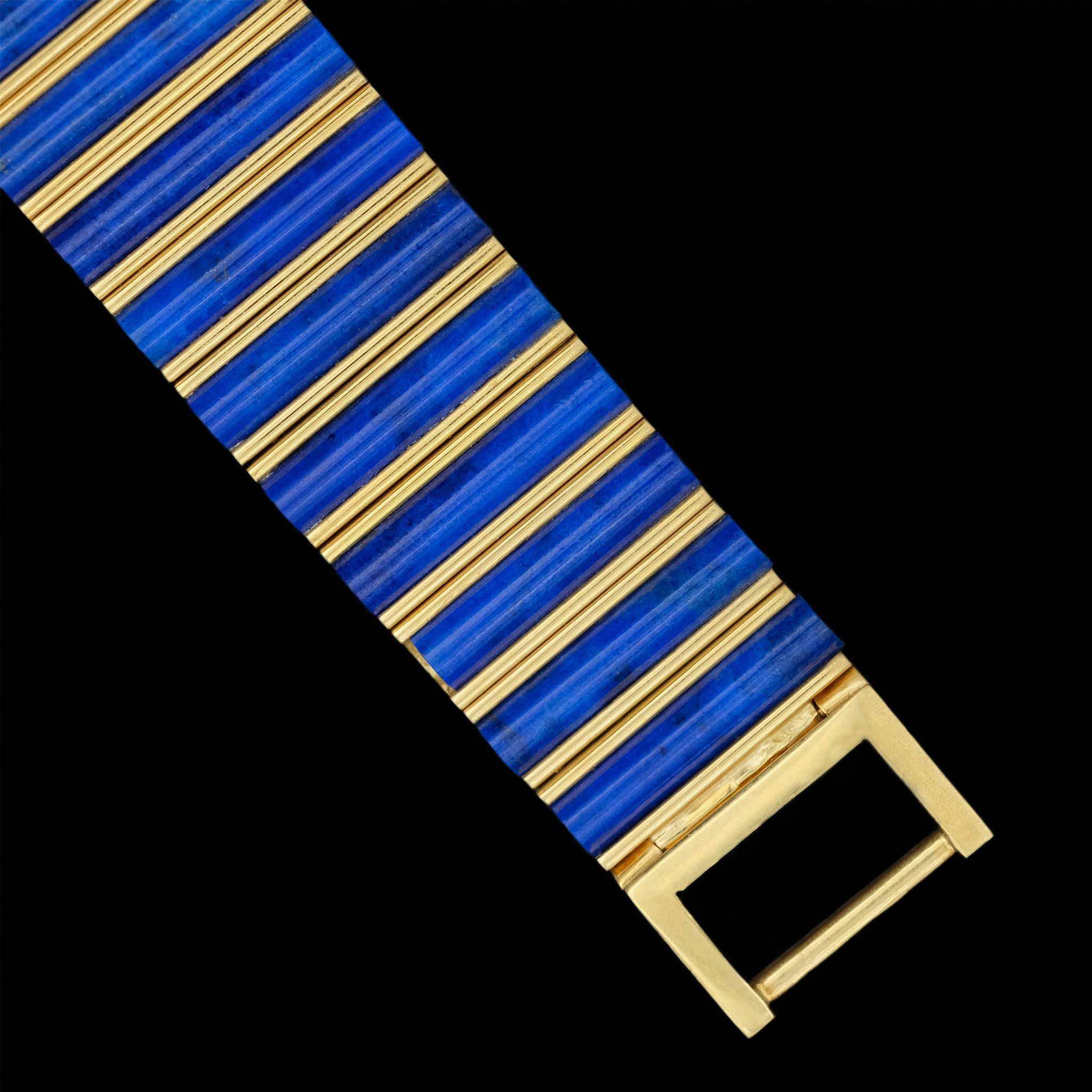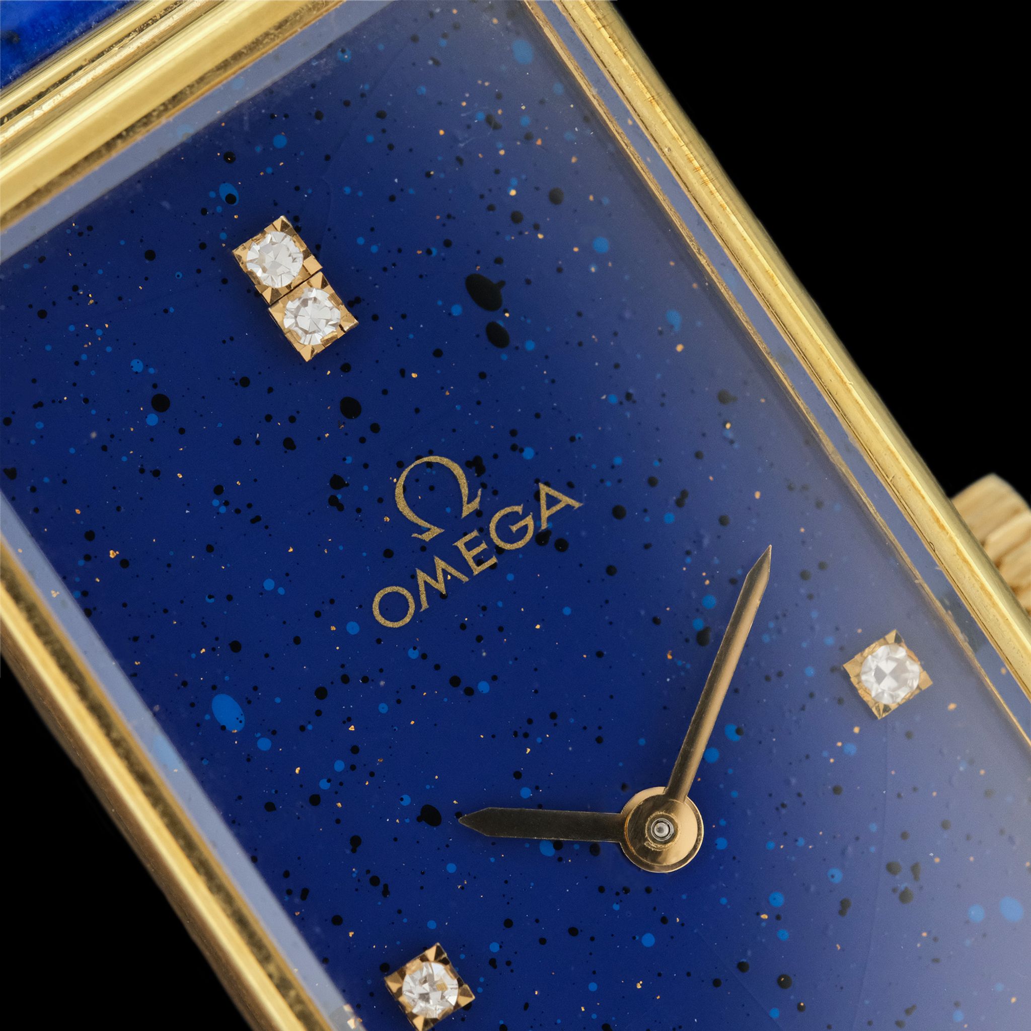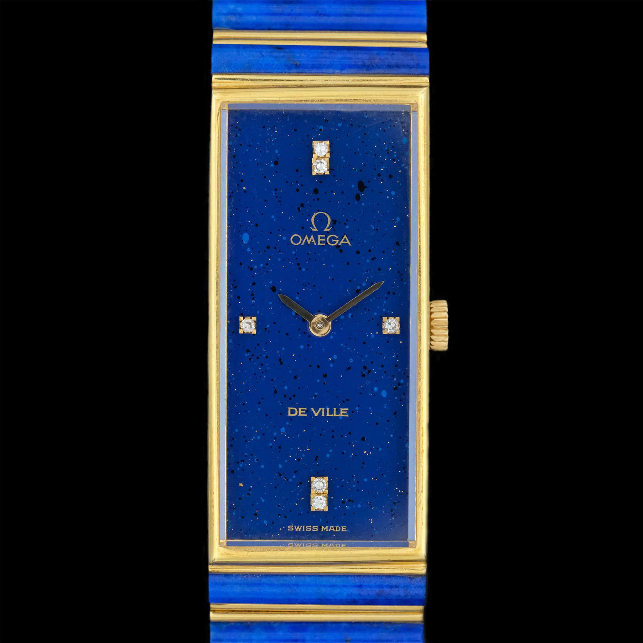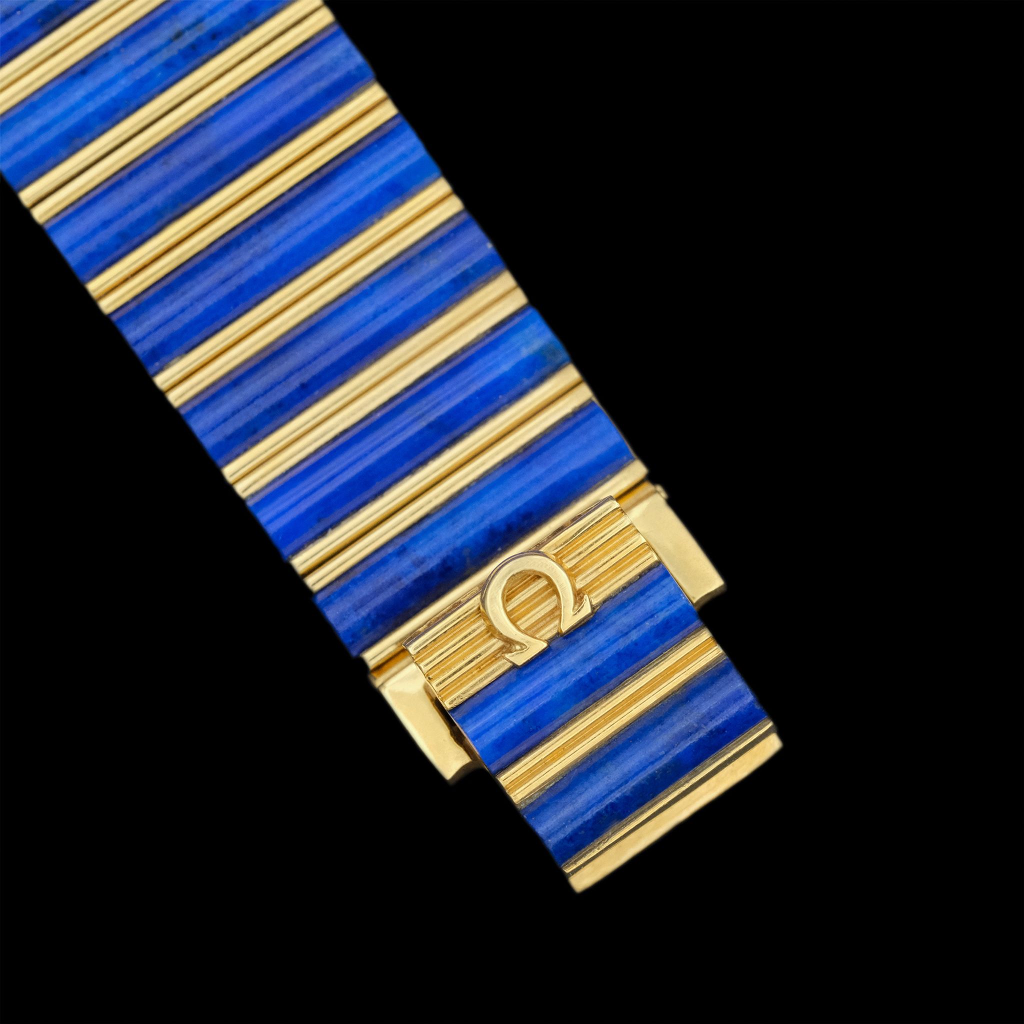 This exquisite and rare Omega DeVille comes directly from Iran, its design stands out with its distinctive lacquer dial and an oversized, elongated case. What truly sets this piece apart are the stunning lapis lazuli cylindrical inserts that run seamlessly along the entire length of the bracelet and clasp, lending it a sculptural elegance. Believed to be part of an exclusive series of unique watches crafted in the late 1970s by special commission, this watch represents one of the most beautiful and architecturally refined designs we've ever encountered.