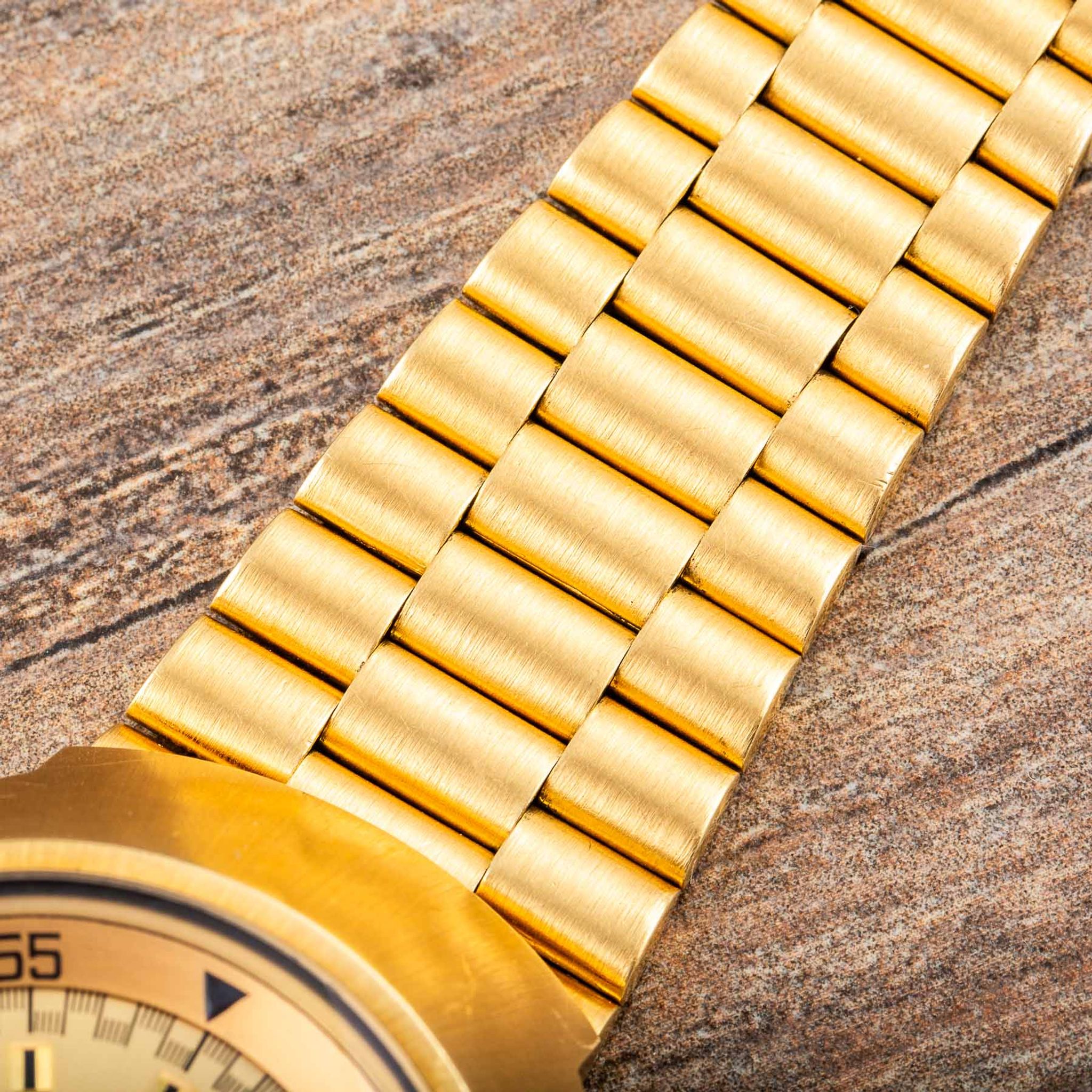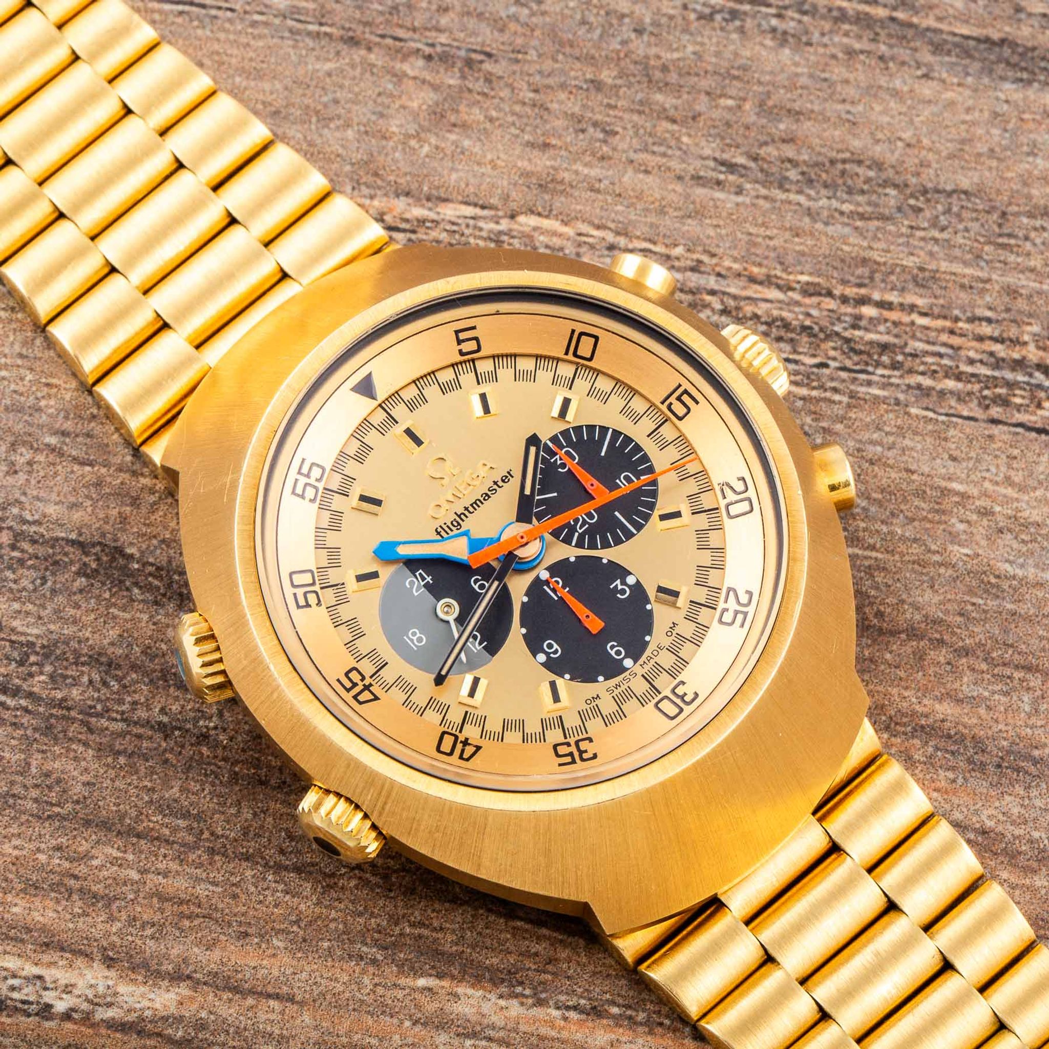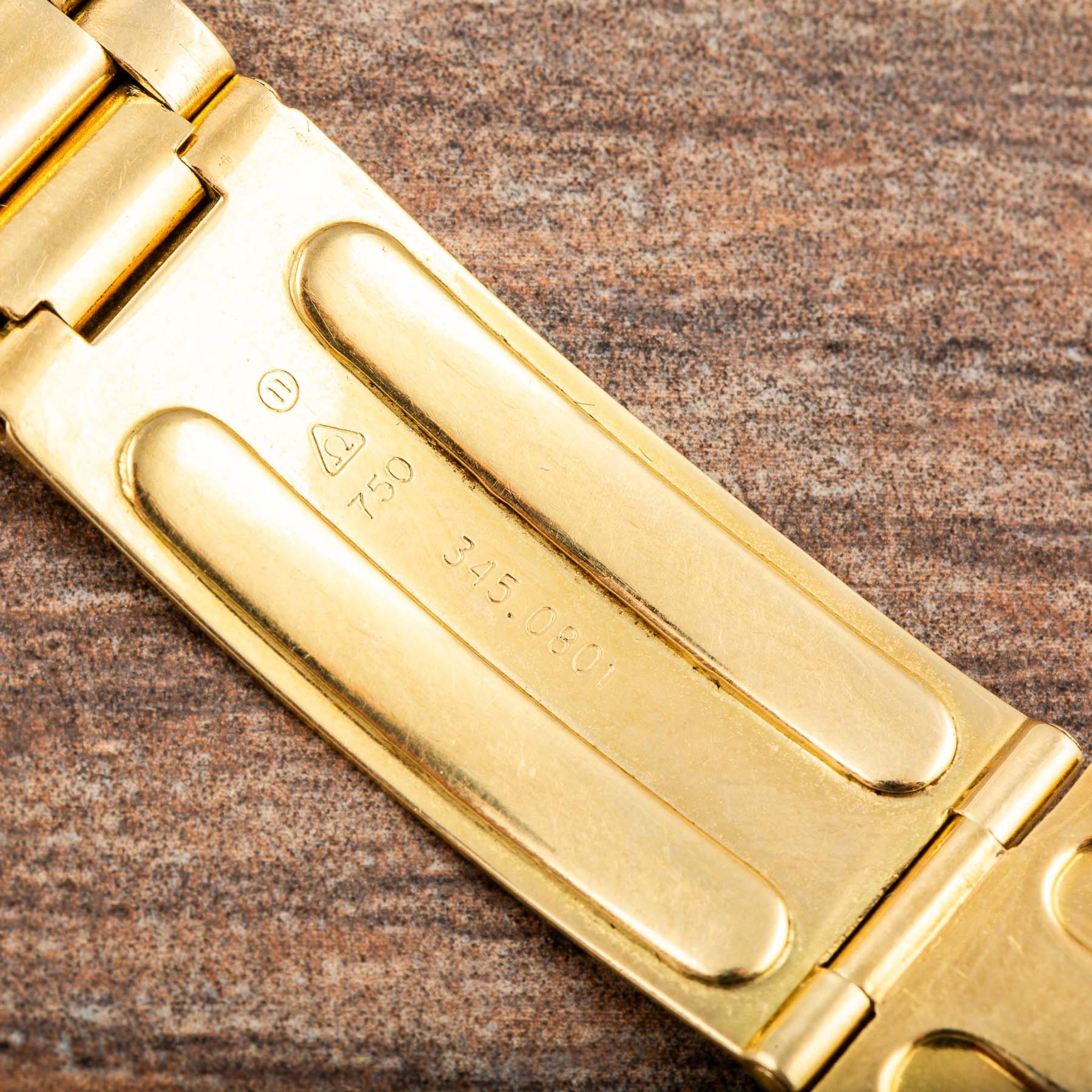 The present watch belongs to the 1971 limited edition in solid yellow gold, one of the most exclusive Flightmaster executions ever made. Only approximately 200 examples were produced in total: 120 pieces with an 18-karat yellow-gold integrated bracelet (reference BA345.0801, as seen here) and 80 pieces with a leather strap (reference BA145.013).