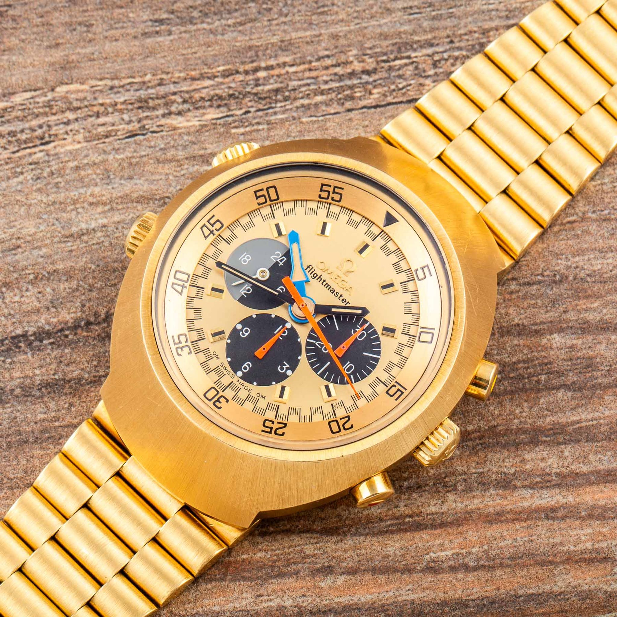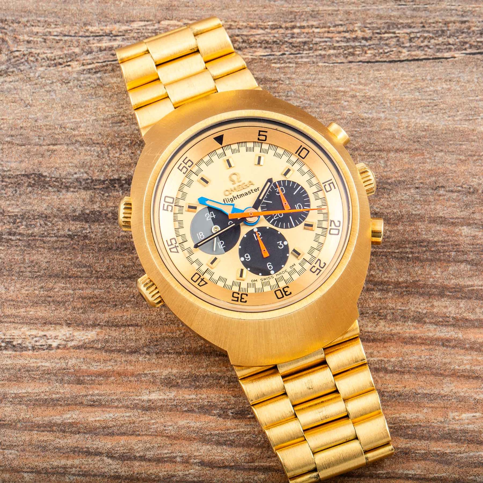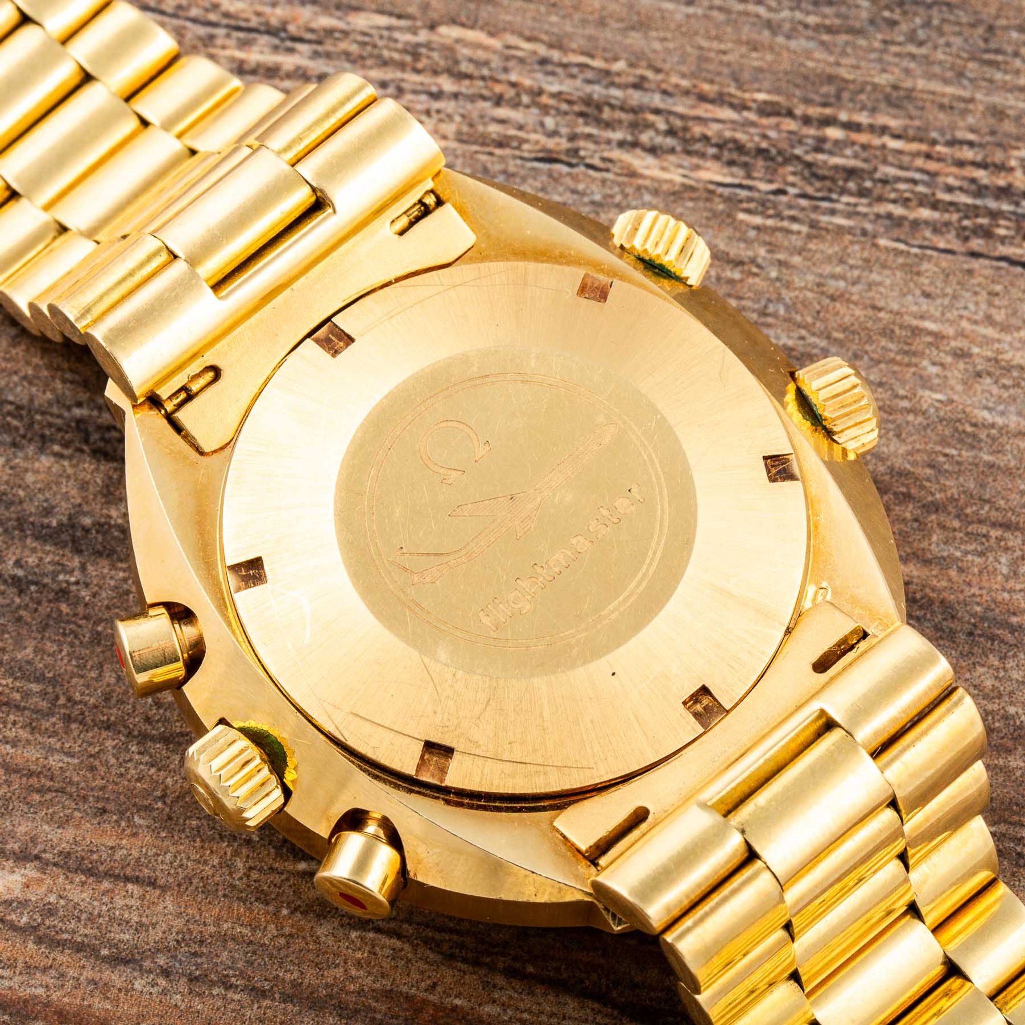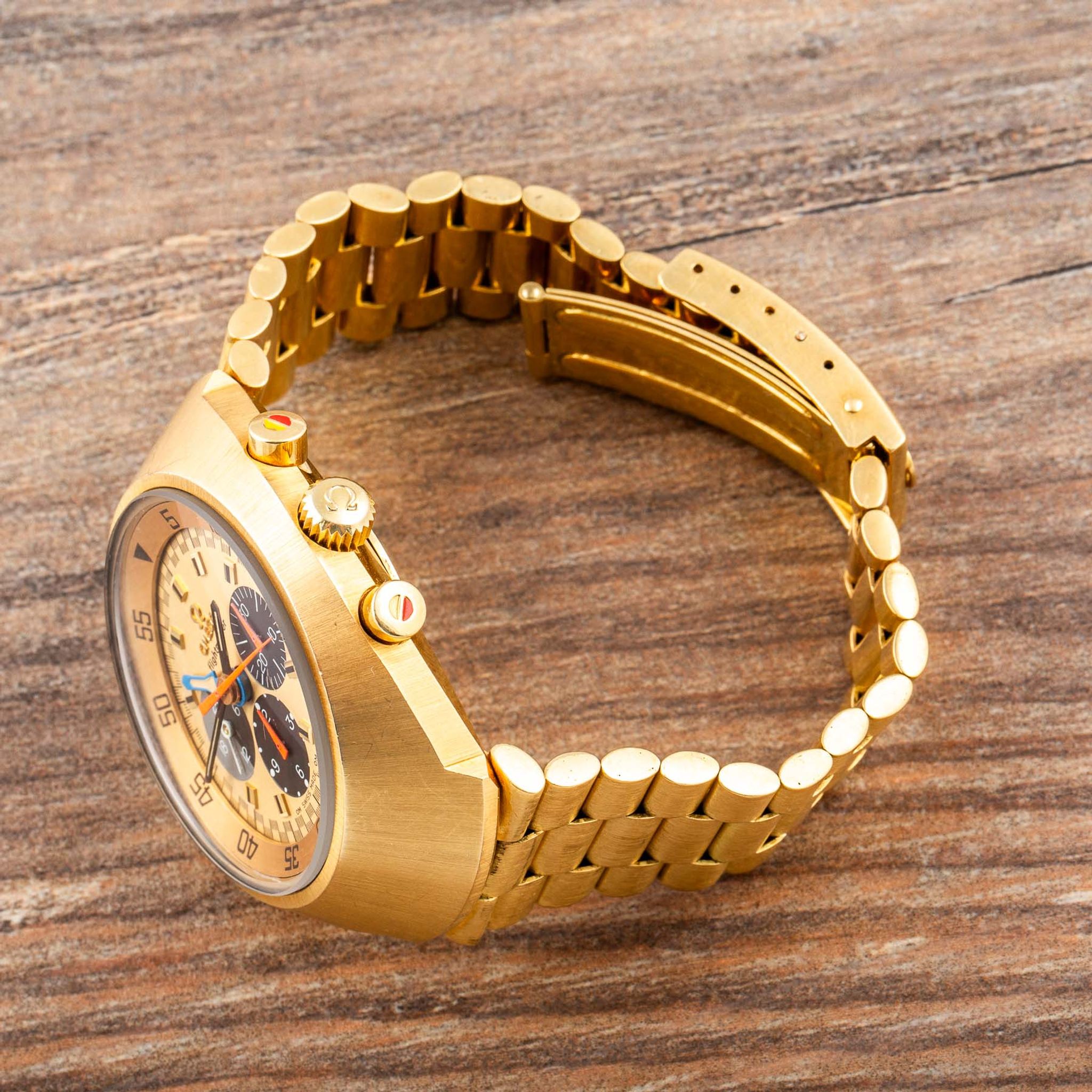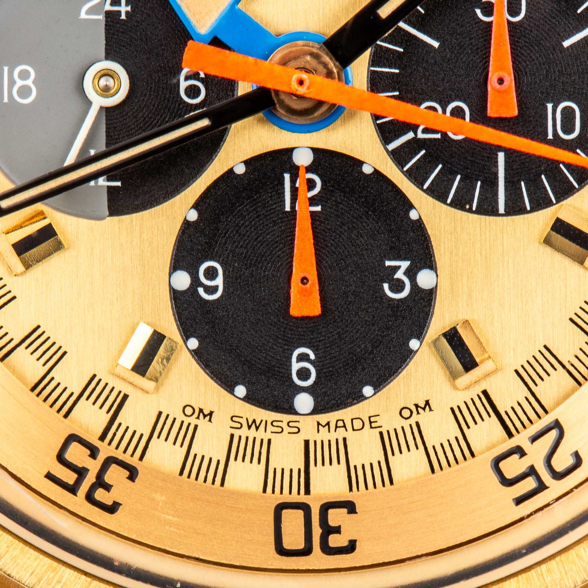 Housed in a robust yet refined 18-karat yellow-gold case, the watch is powered by Omega’s Calibre 910 manual-winding movement, renowned for its precision and reliability. The three crowns — at 3, 8, and 10 o’clock — highlight its technical sophistication, while the screw-down case back ensures durability and protection for the movement.