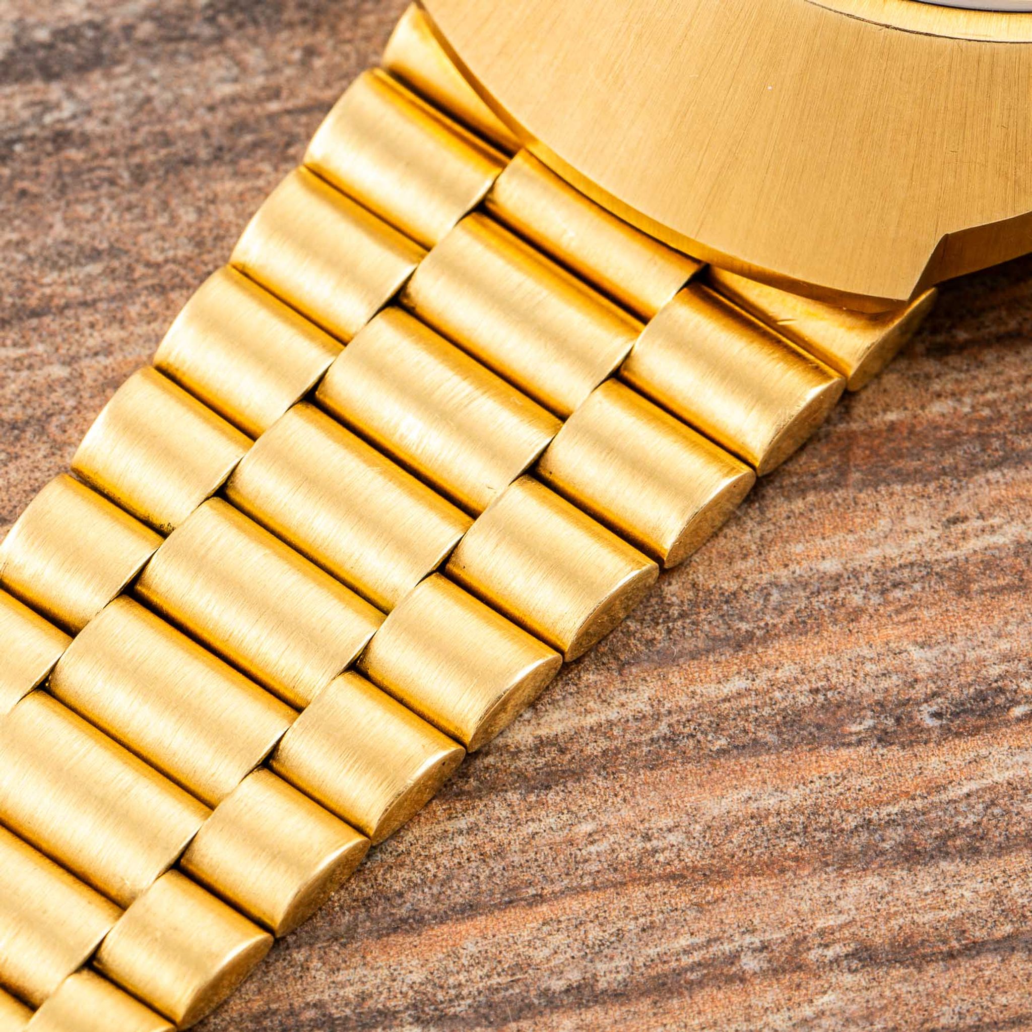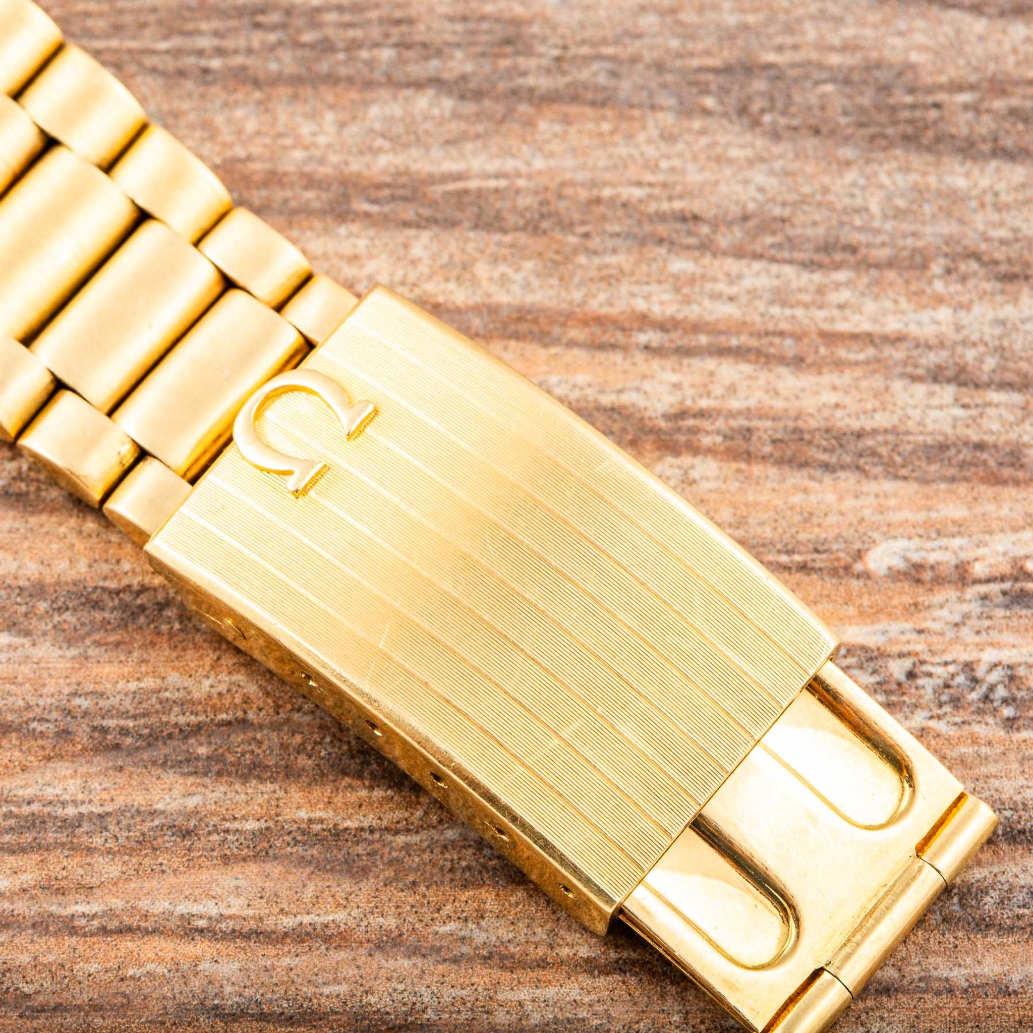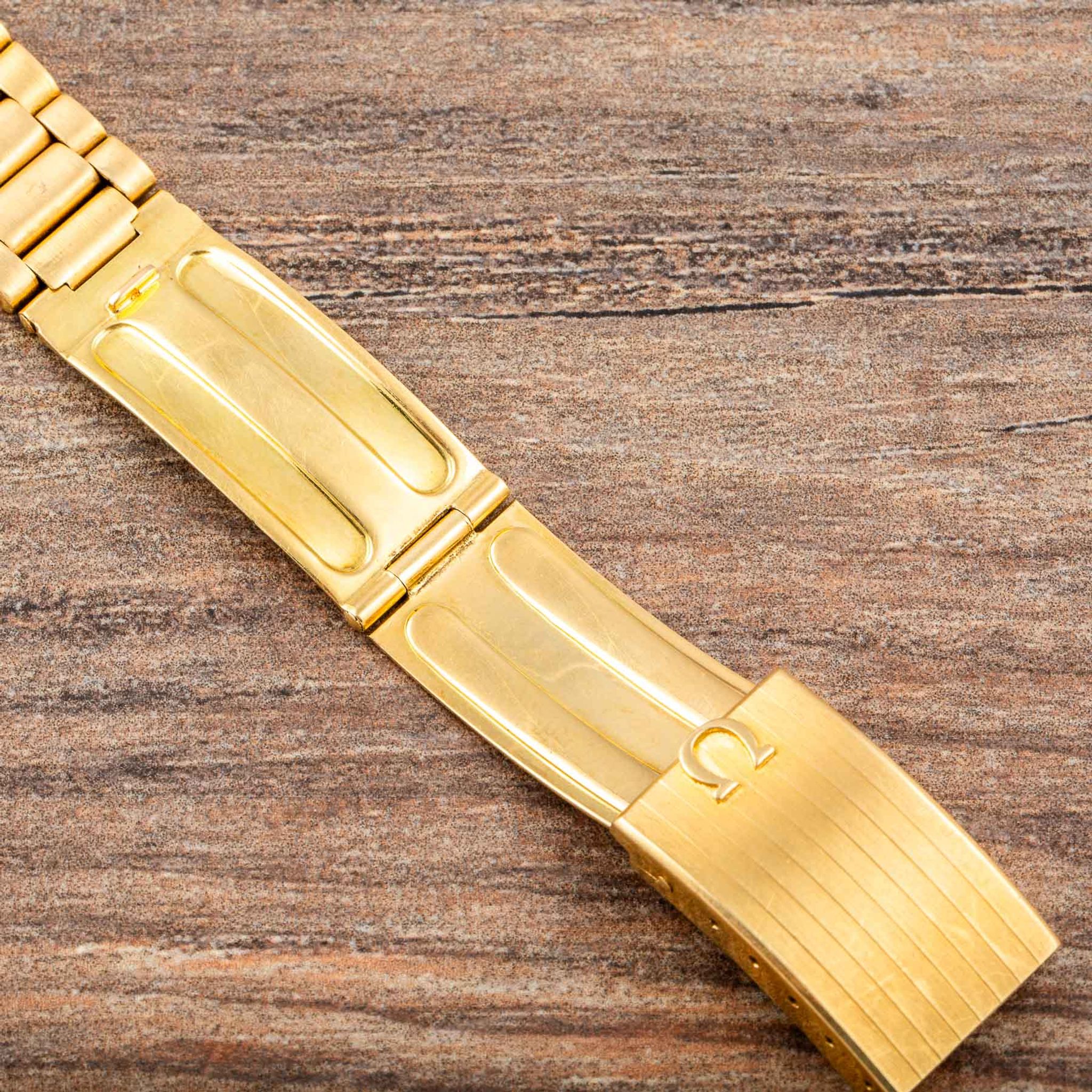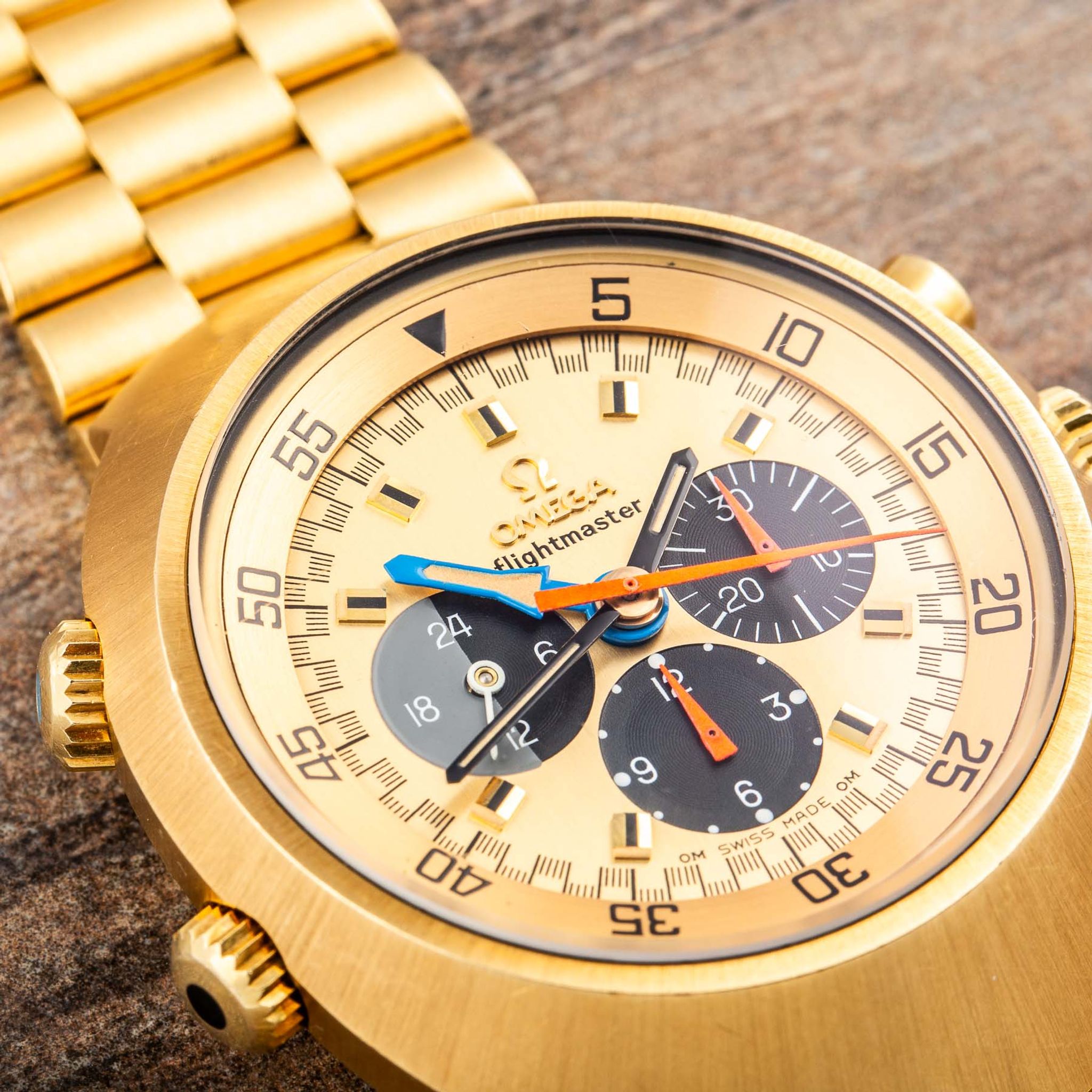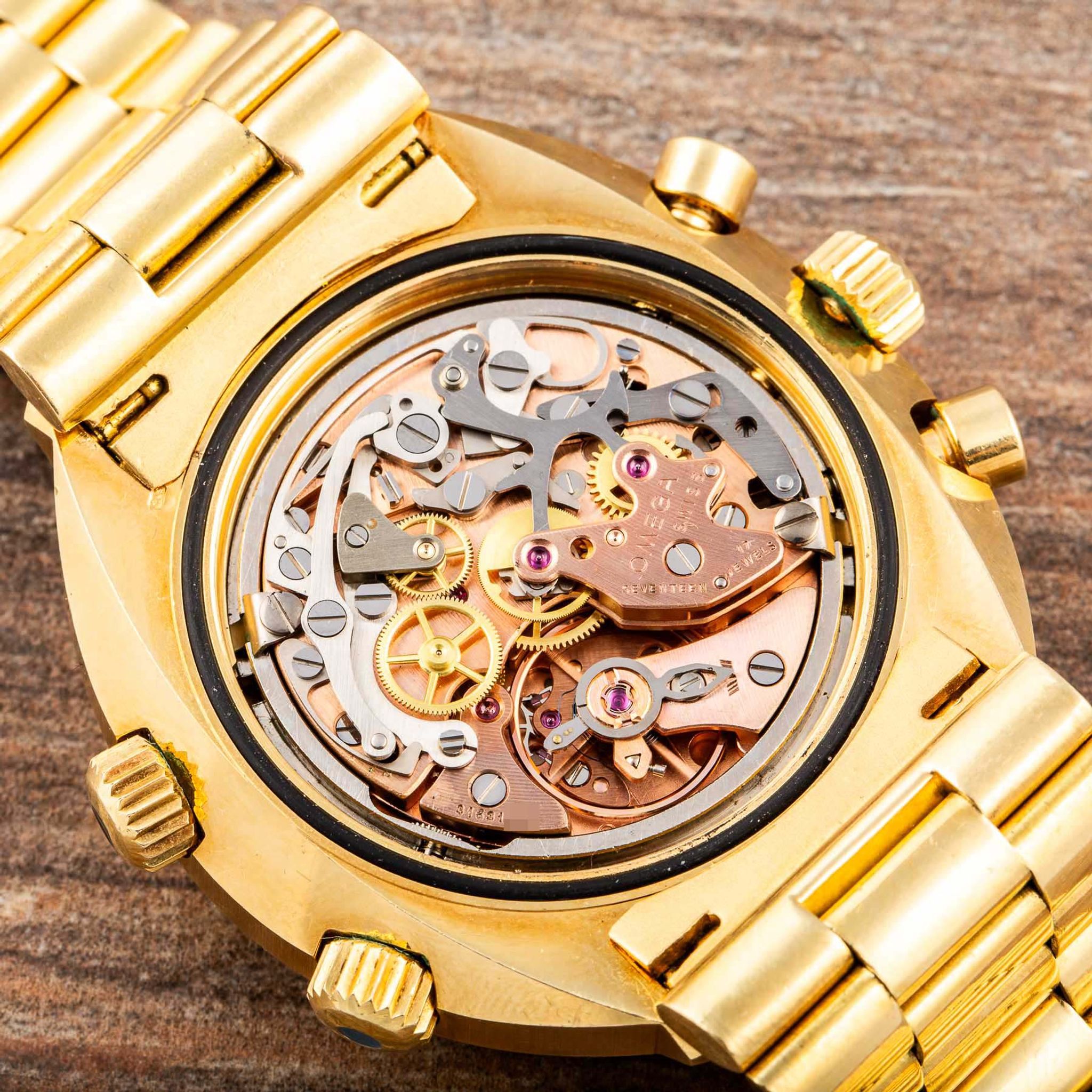 Housed in a robust yet refined 18-karat yellow-gold case, the watch is powered by Omega’s Calibre 910 manual-winding movement, renowned for its precision and reliability. The three crowns — at 3, 8, and 10 o’clock — highlight its technical sophistication, while the screw-down case back ensures durability and protection for the movement.