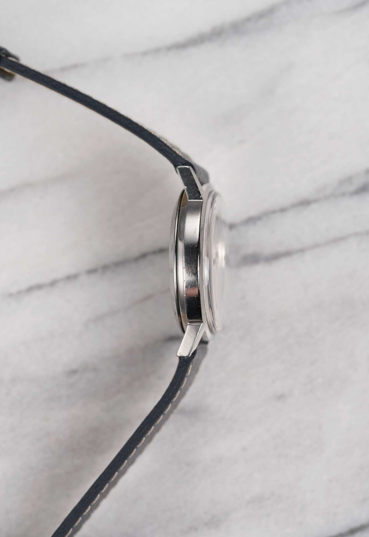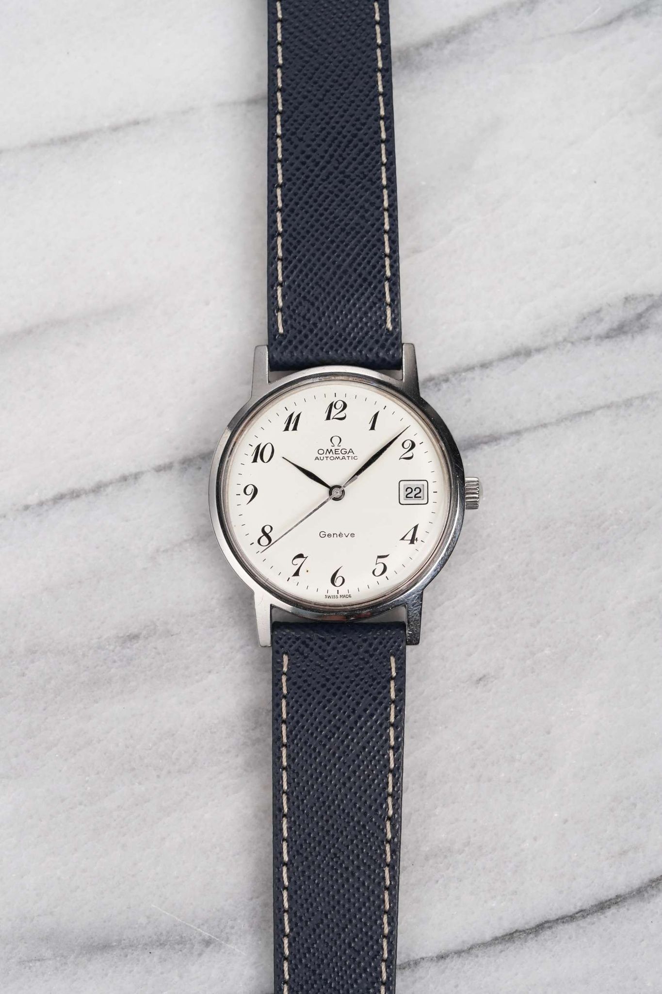 Here's a vintage Omega Geneve automatic with breguet numerals from the late 60s, early 70s. Keeps great time and is fully functional. Measurements include a 35mm case size and 18mm lug width. On a blue leather strap (Made in Italy). Date function at 3 a clock. Egg white dial with black breguet numerals and alpha (leaf) hands. Steel case and screw back caseback. The breguet numerals are uncommon to see in vintage Omega so it's a nice touch. All parts original including the signed Omega crown, dial, movement, bracelet, and caseback. Both the dial and case are in great cosmetic, untouched condition.