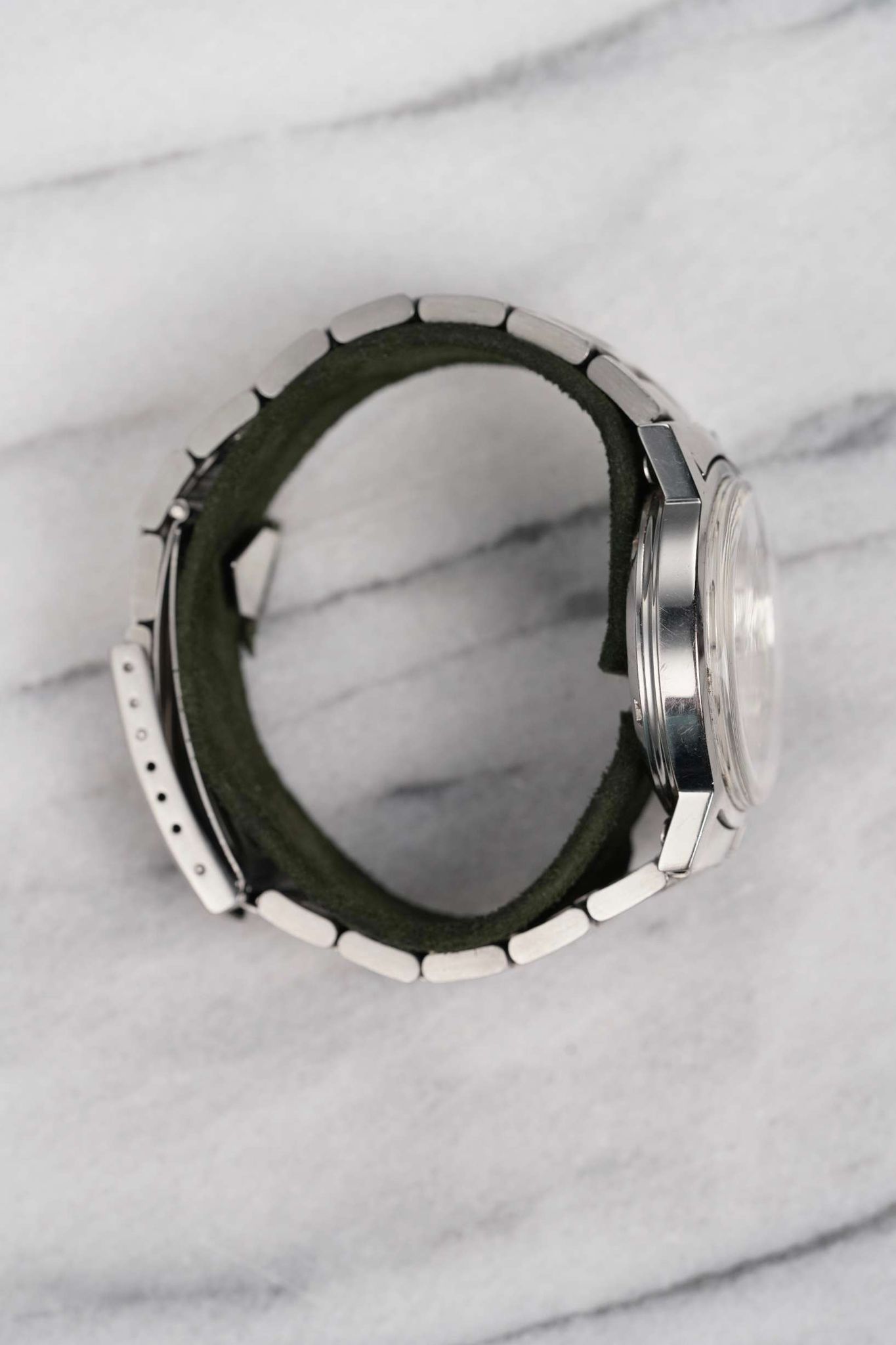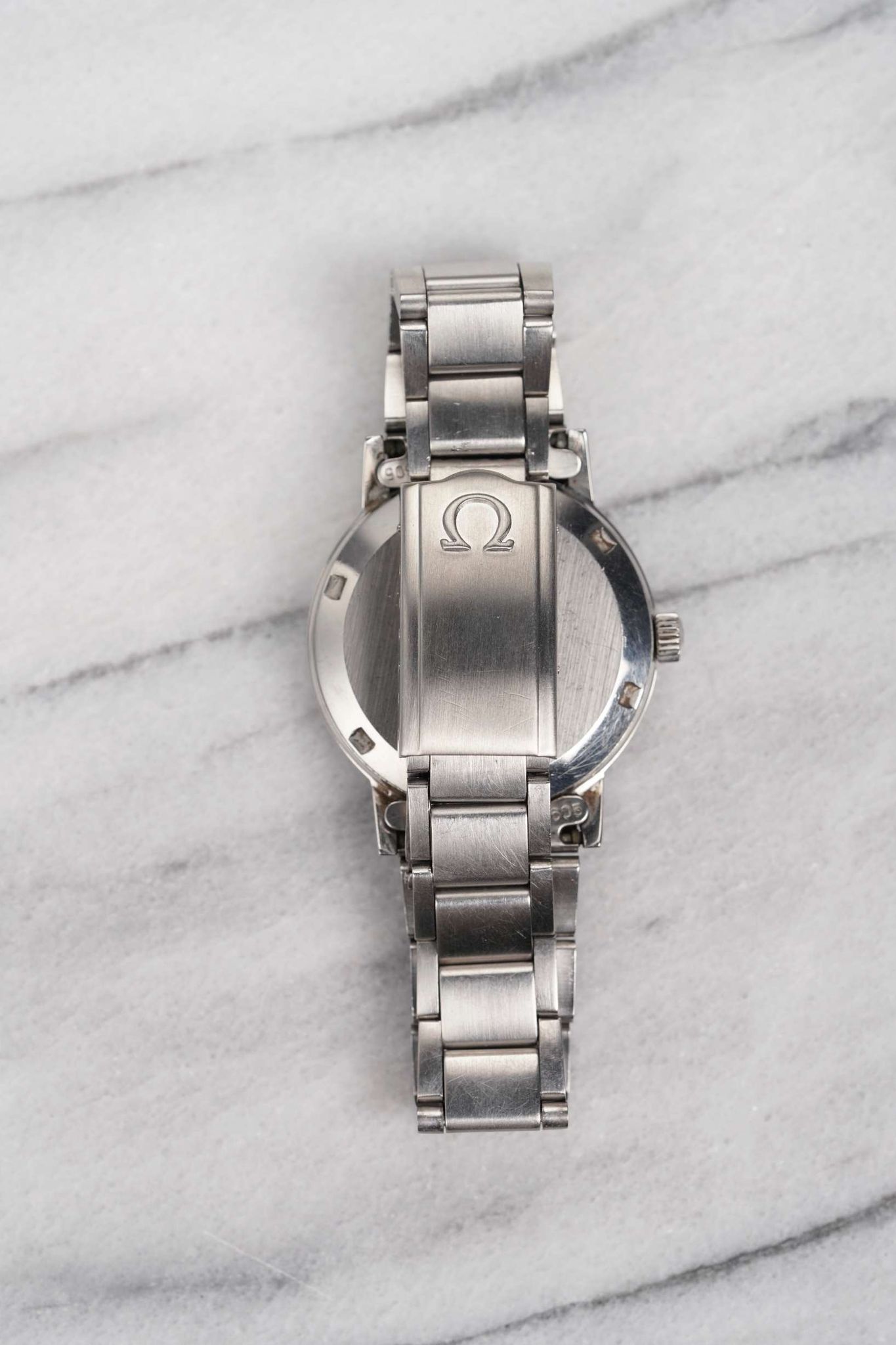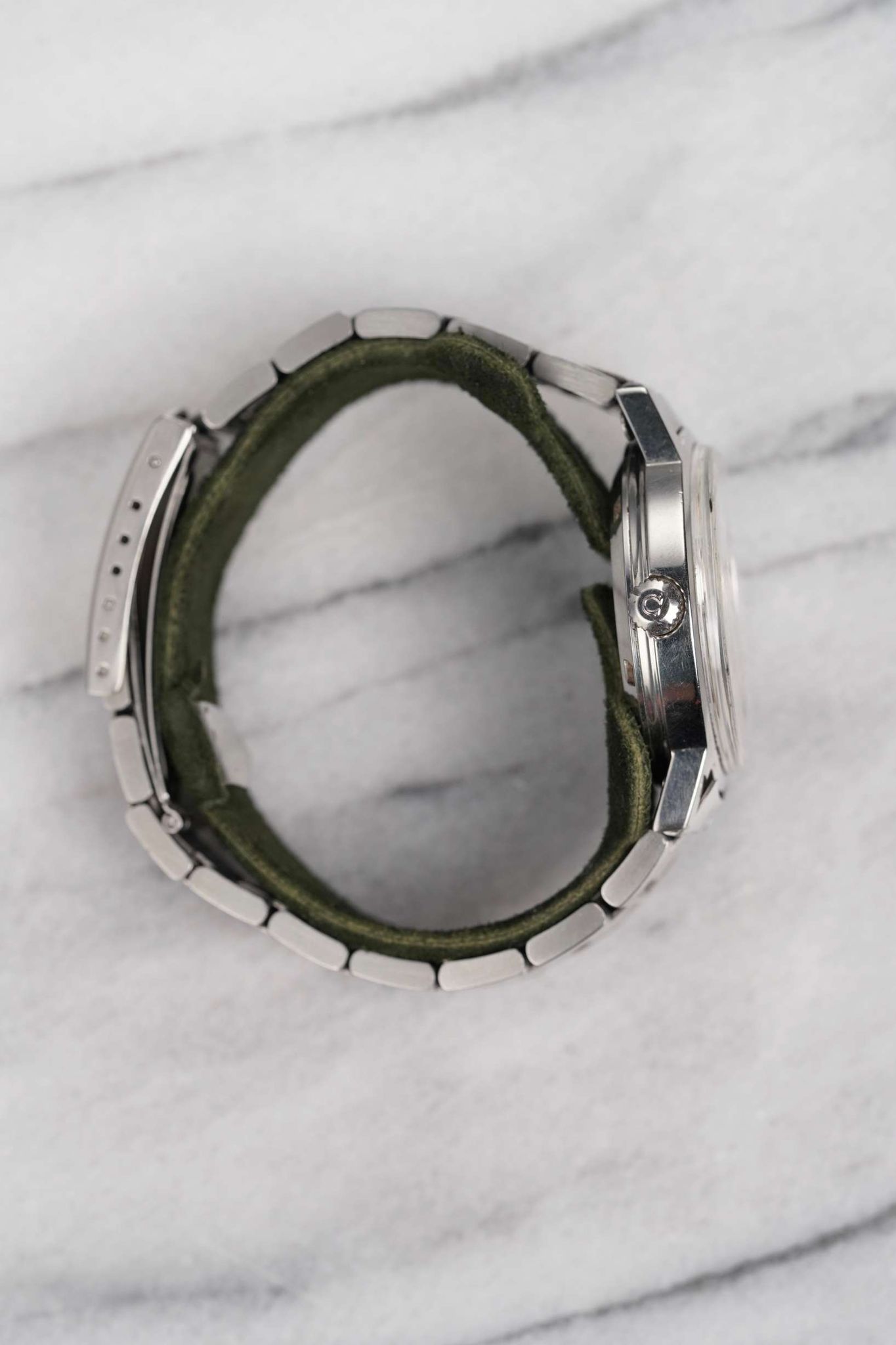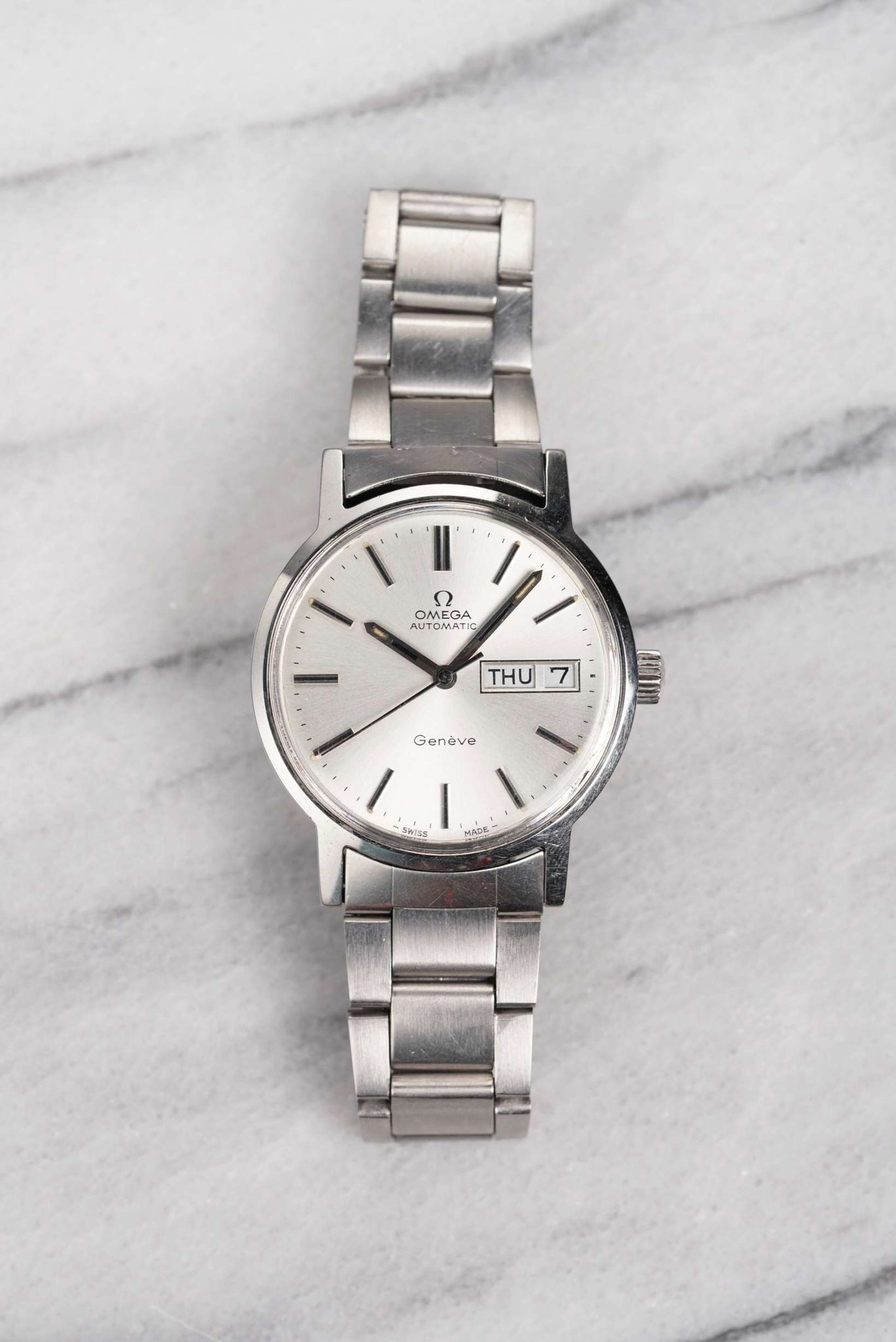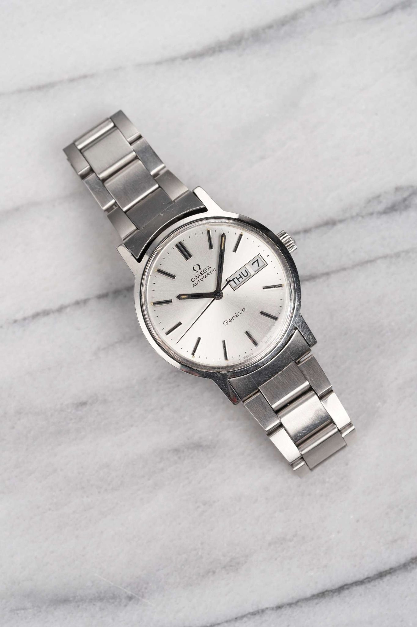 Here's a vintage Omega Geneve automatic day date with a silver dial from the 70s. Keeps great time and is fully functional. Measurements include a 34mm case size and 18mm lug width. Reference number 166.0117 with a caliber 1022. It's on an Omega stamped bracelet that can fit up to a 7 inch wrist. Features include the time and quickset day and date function at 3 a clock (pull crown all the way out). Black hands and hour markers to contrast the dial. Silver sunburst dial with great lume in both the hands and hour markers that turned yellow with age. Brushed finishing on the bracelet. The dial and crystal are free from any scratches or marks. All parts are original including the signed Omega crown, dial, movement, and caseback. Both the dial and case are in great cosmetic, untouched condition.