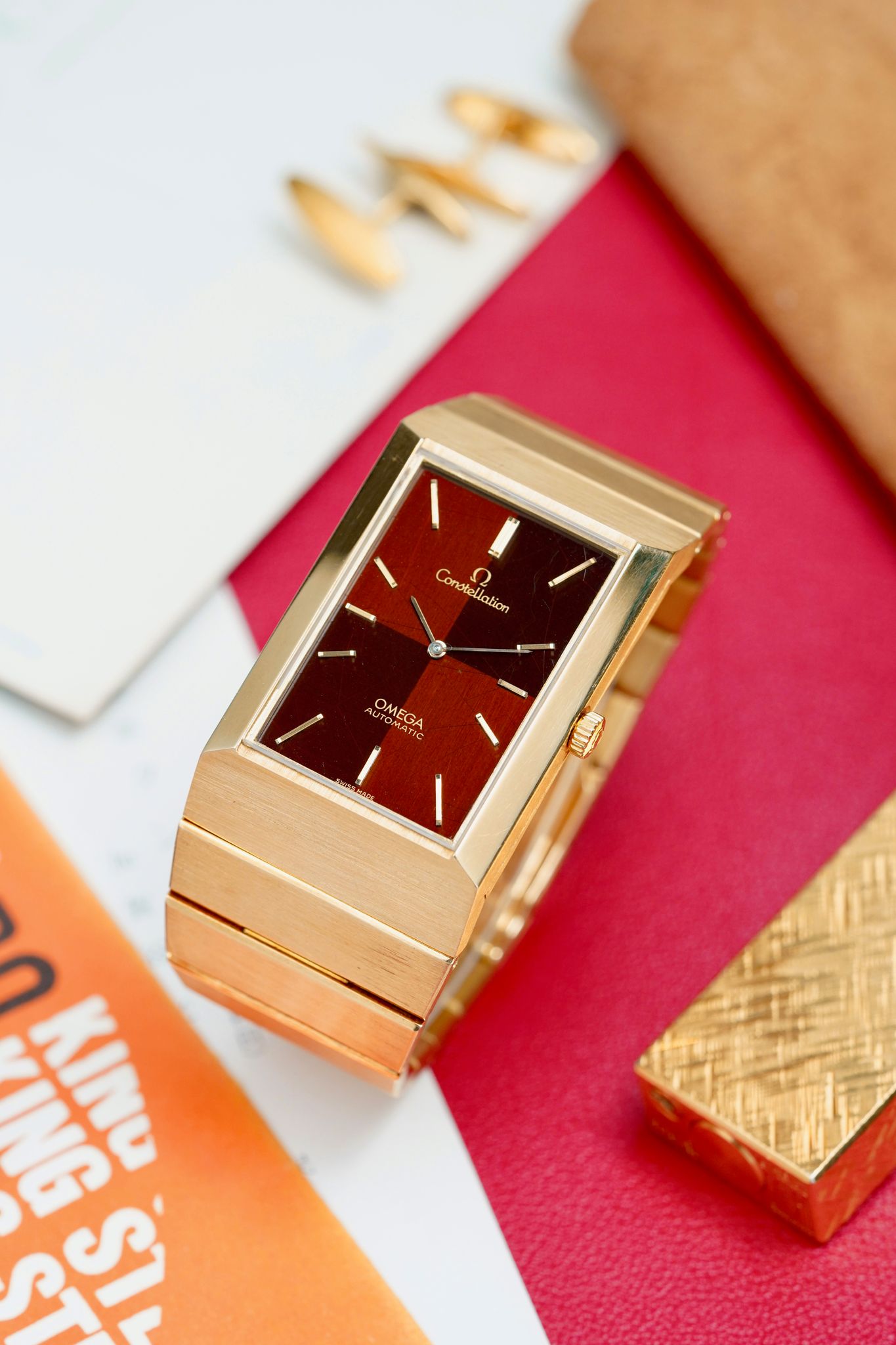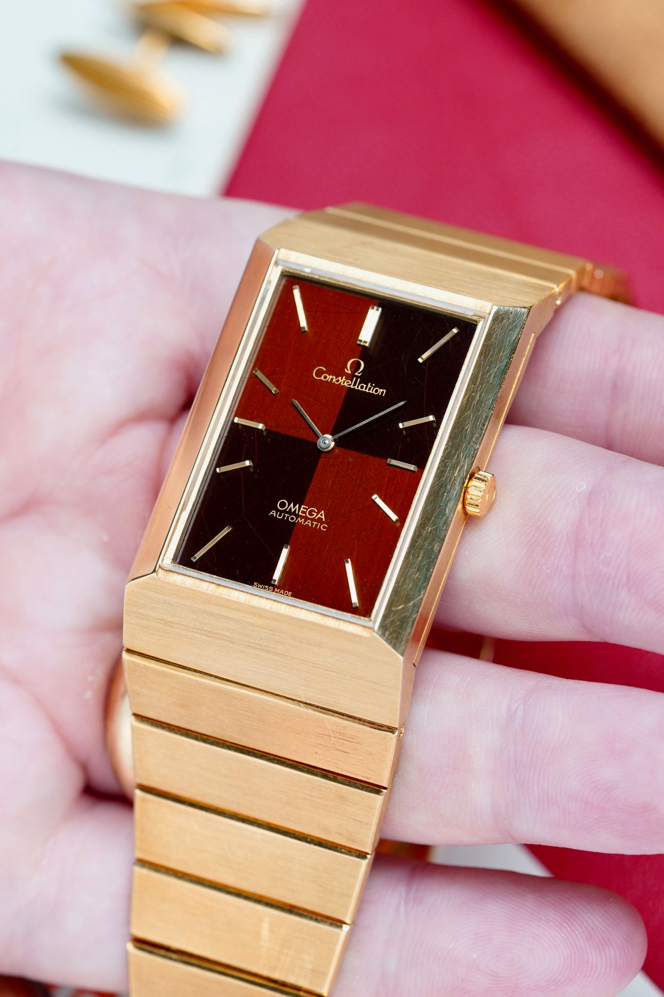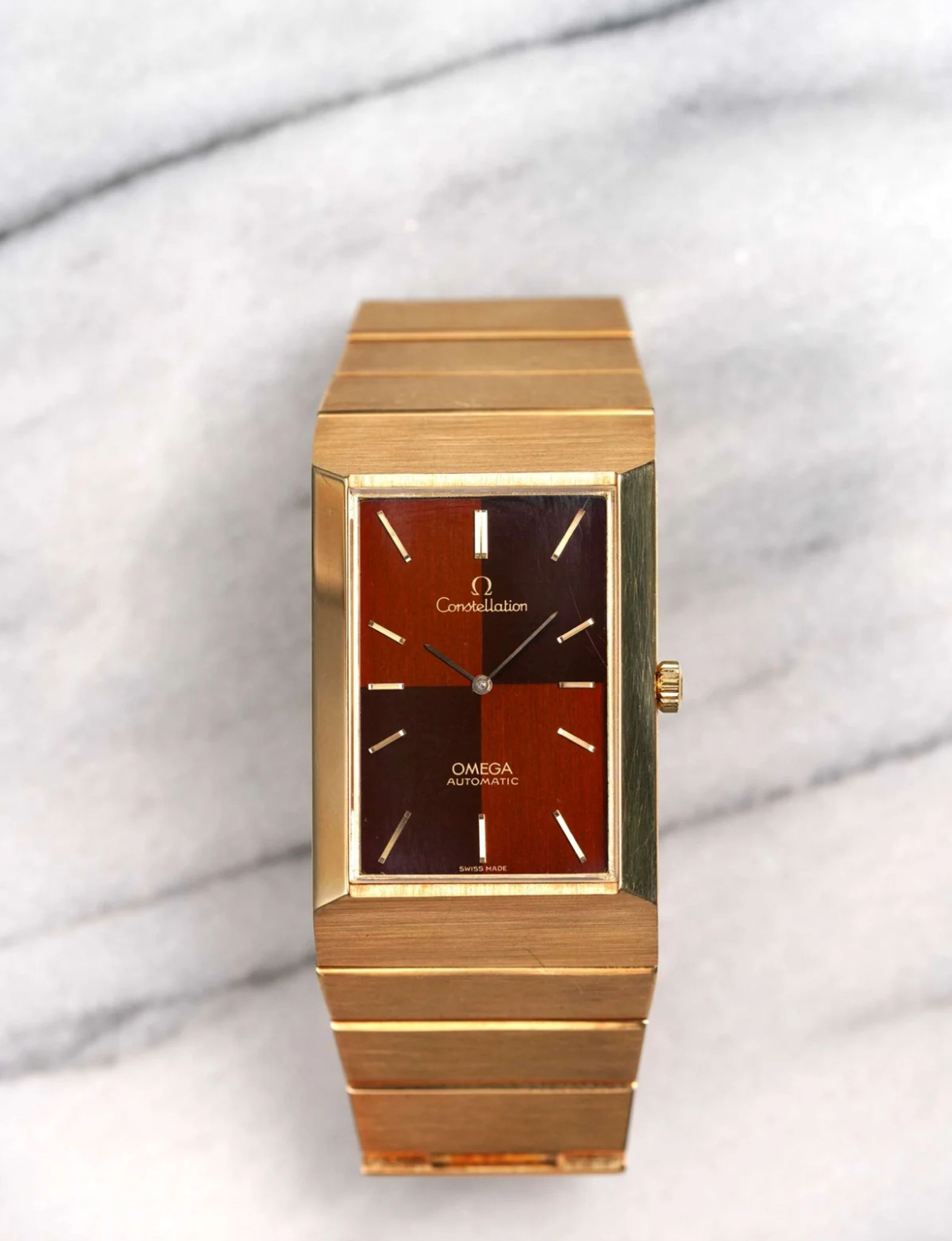 Here's a vintage Omega Constellation automatic in 18K yellow gold with a two tone brown dial from the 1970s. Unpolished condition! Keeps great time and is fully functional. Measurements include a 30x49mm case. Caliber 711. It's on its original integrated bracelet that fit up to a 7.1 inch wrist (removable screw links) Time only. Matching gold hands and hour markers. Matching gold stick hands and hour markers. Both the dial and crystal are free from any scratches or marks. This piece is quite unusual to see in the Constellation line up. This makes for a great Rolex King Midas alternative due to its style and weight. All parts are original including the signed Omega crown, dial, movement, and caseback. Both the dial and case are in great cosmetic, untouched condition.
