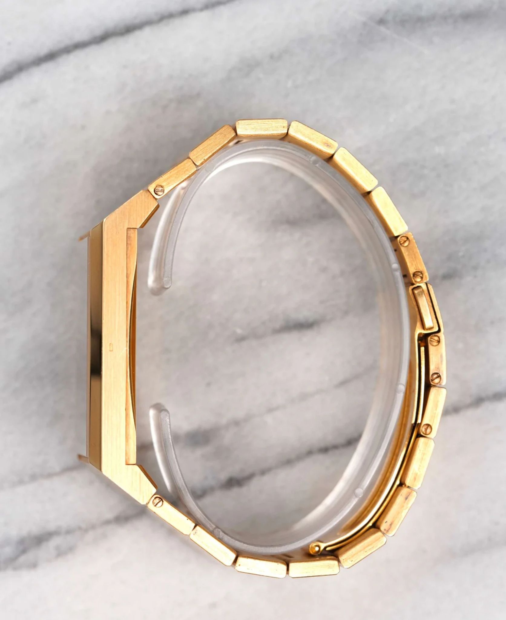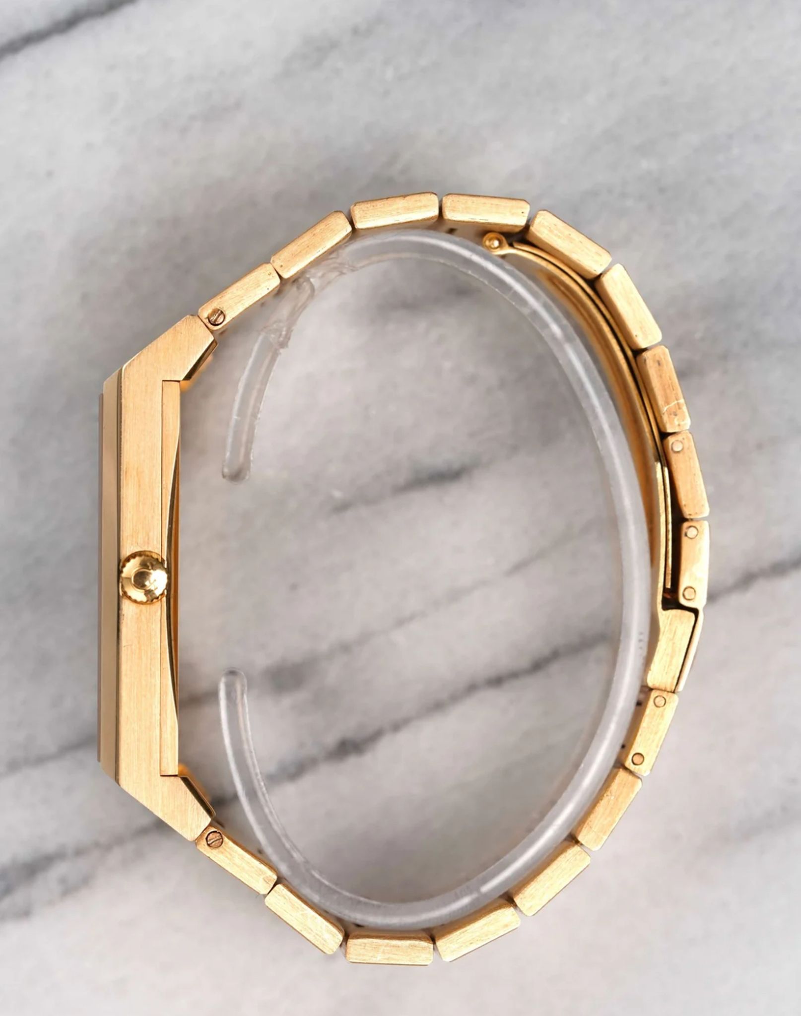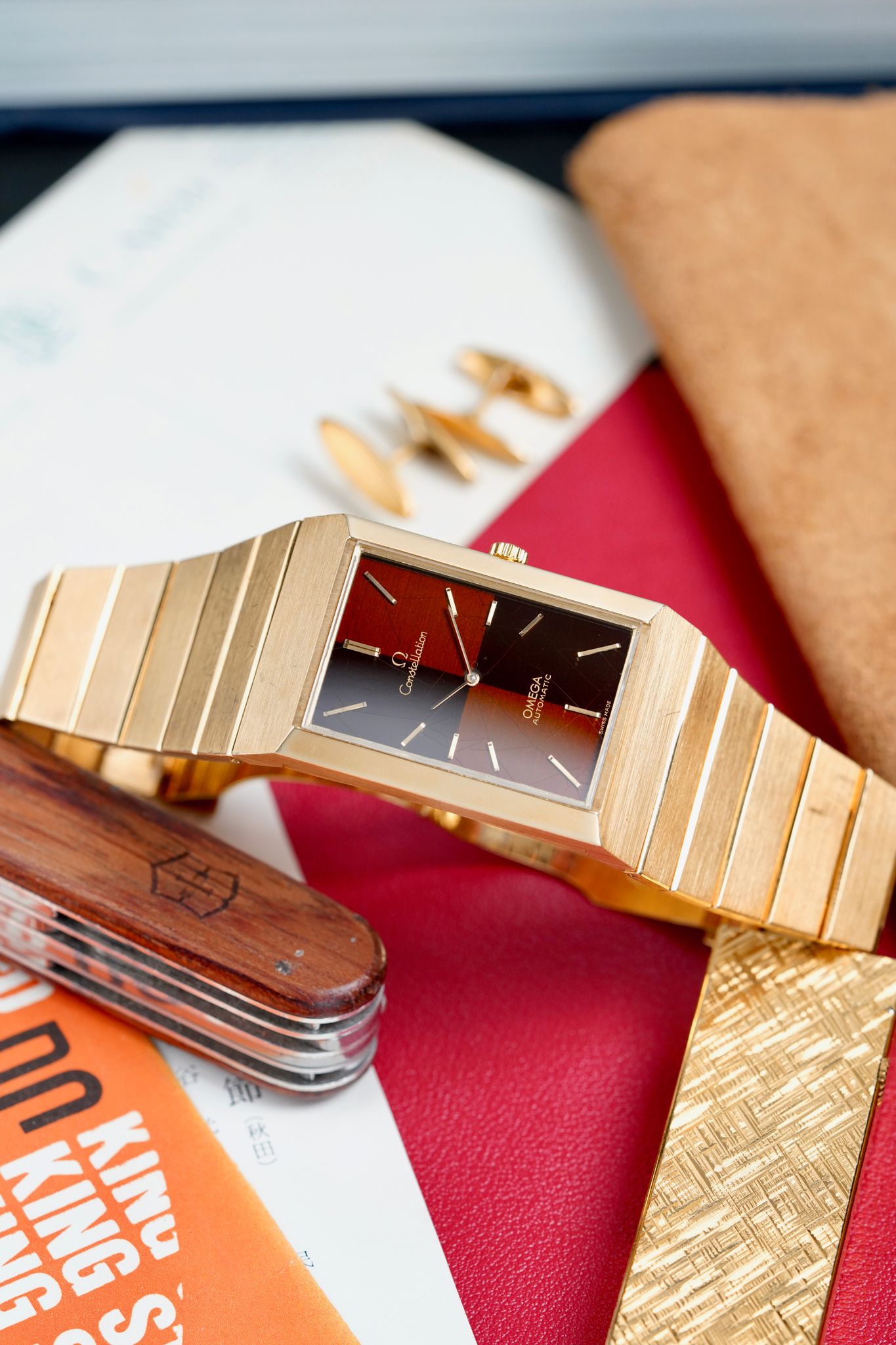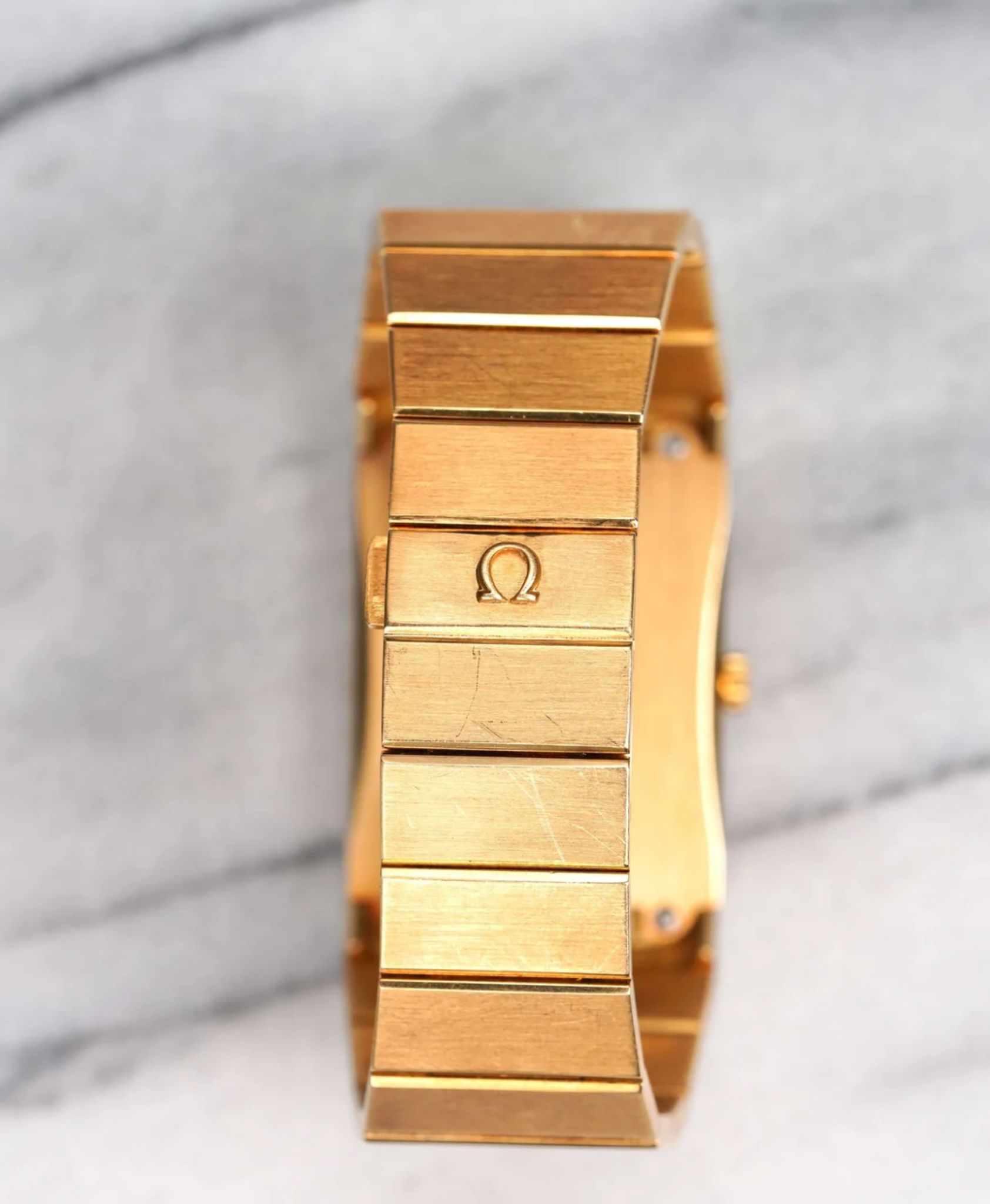 Here's a vintage Omega Constellation automatic in 18K yellow gold with a two tone brown dial from the 1970s. Unpolished condition! Keeps great time and is fully functional. Measurements include a 30x49mm case. Caliber 711. It's on its original integrated bracelet that fit up to a 7.1 inch wrist (removable screw links) Time only. Matching gold hands and hour markers. Matching gold stick hands and hour markers. Both the dial and crystal are free from any scratches or marks. This piece is quite unusual to see in the Constellation line up. This makes for a great Rolex King Midas alternative due to its style and weight. All parts are original including the signed Omega crown, dial, movement, and caseback. Both the dial and case are in great cosmetic, untouched condition.