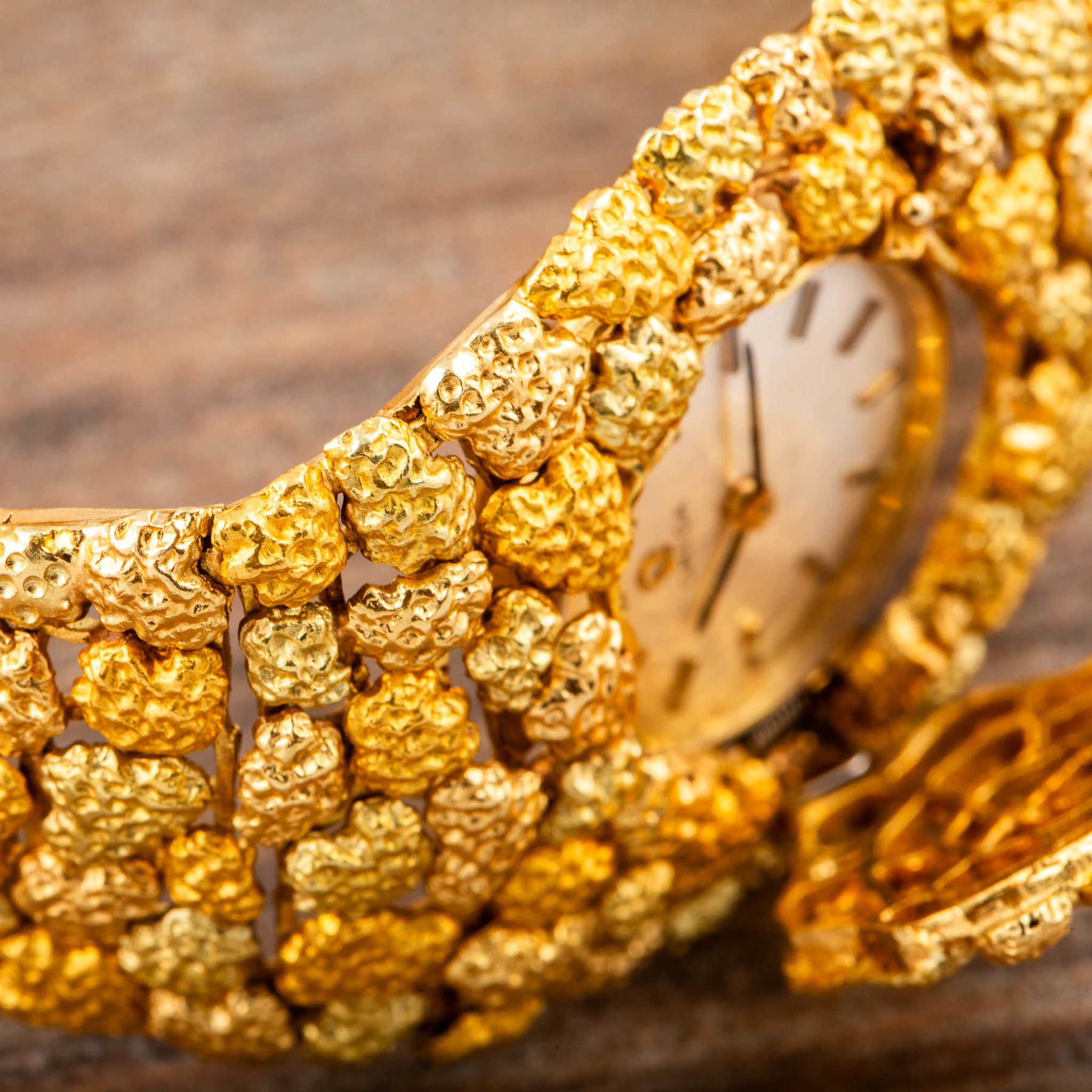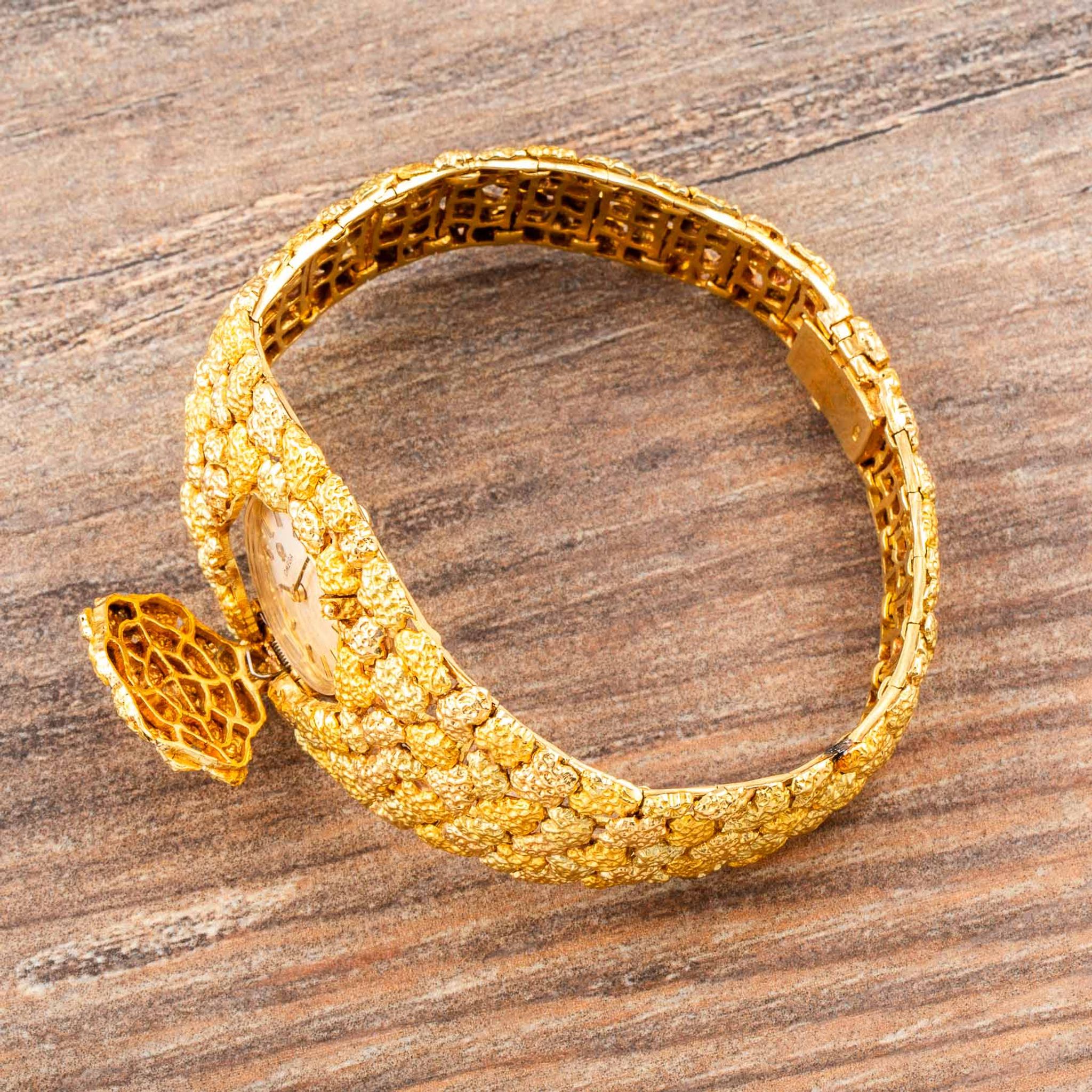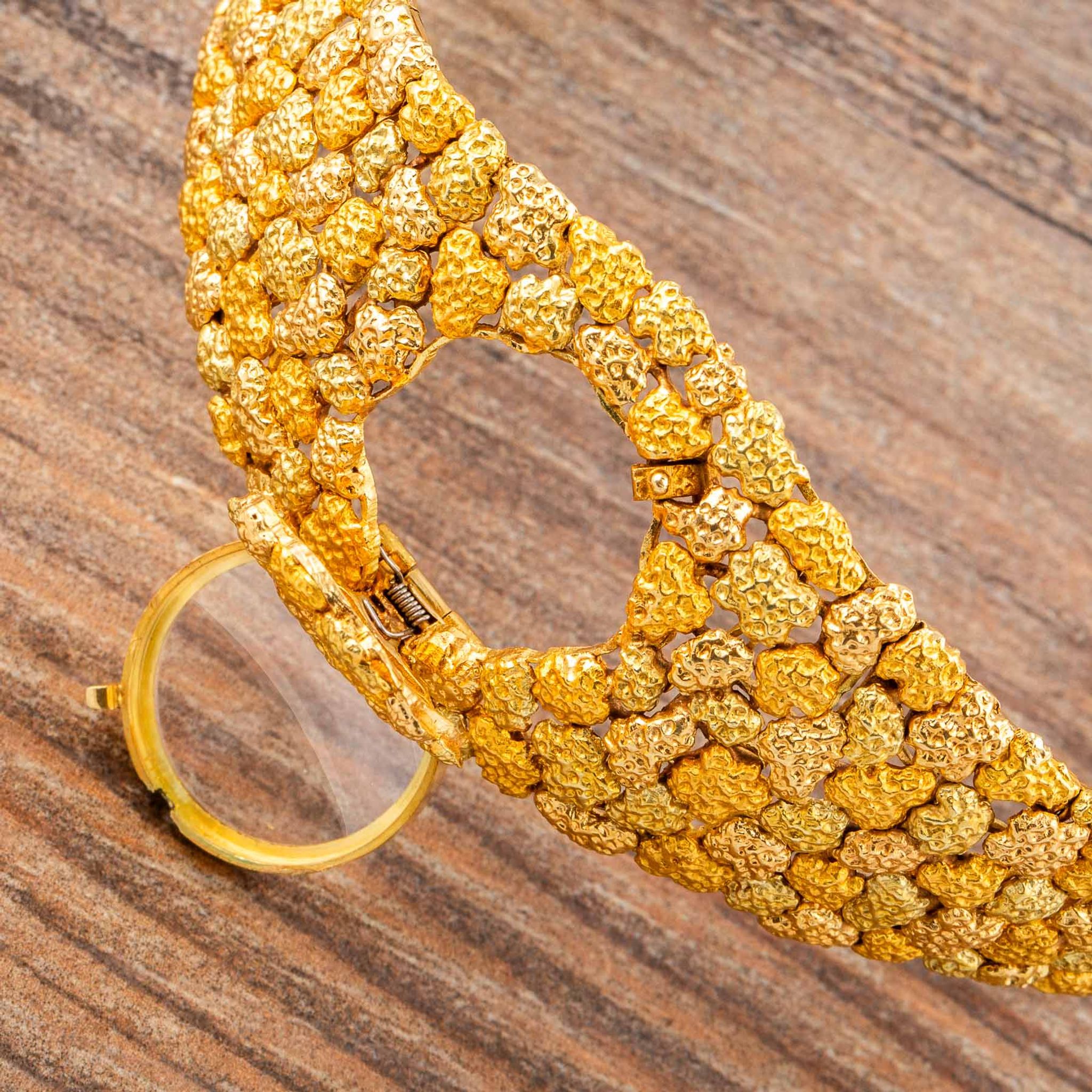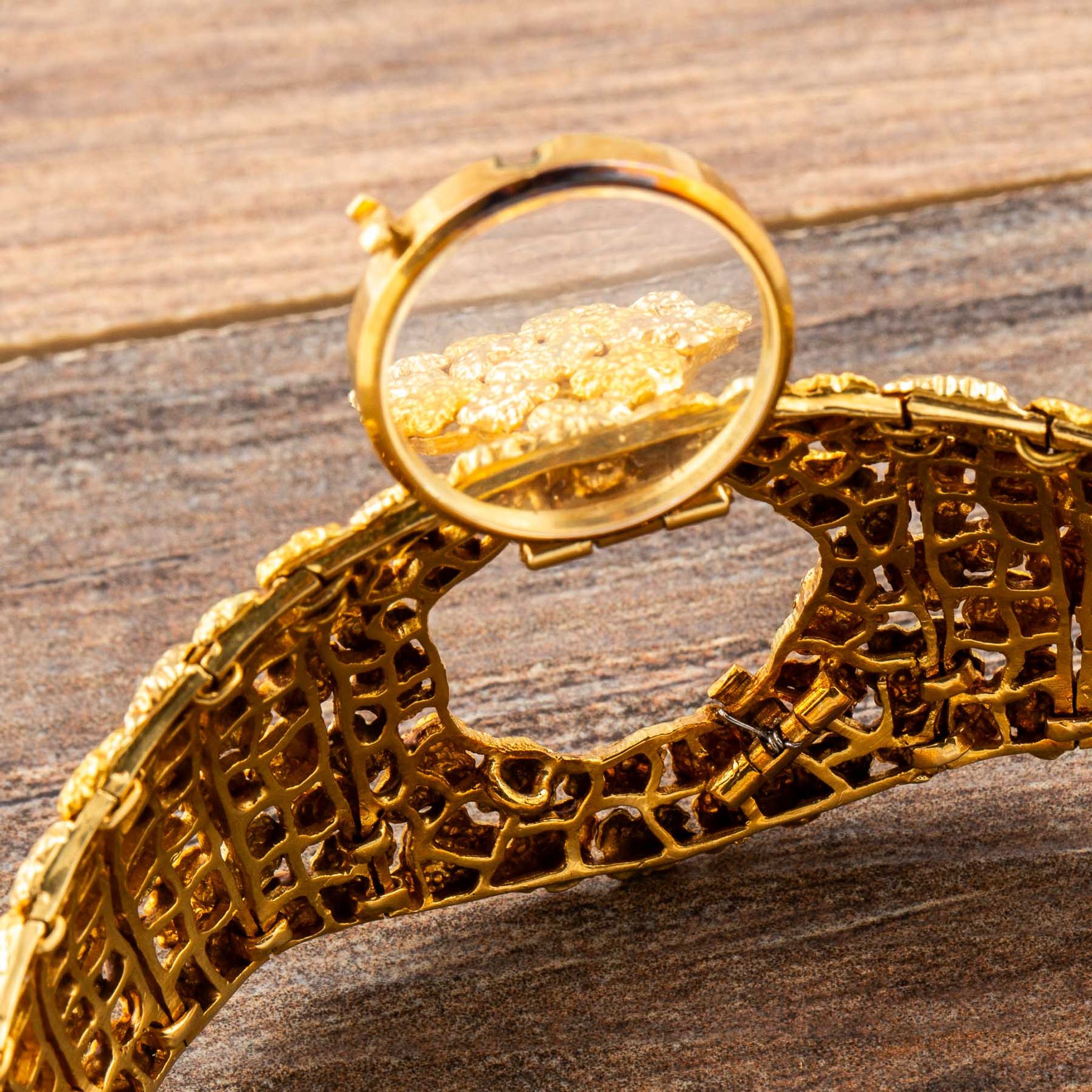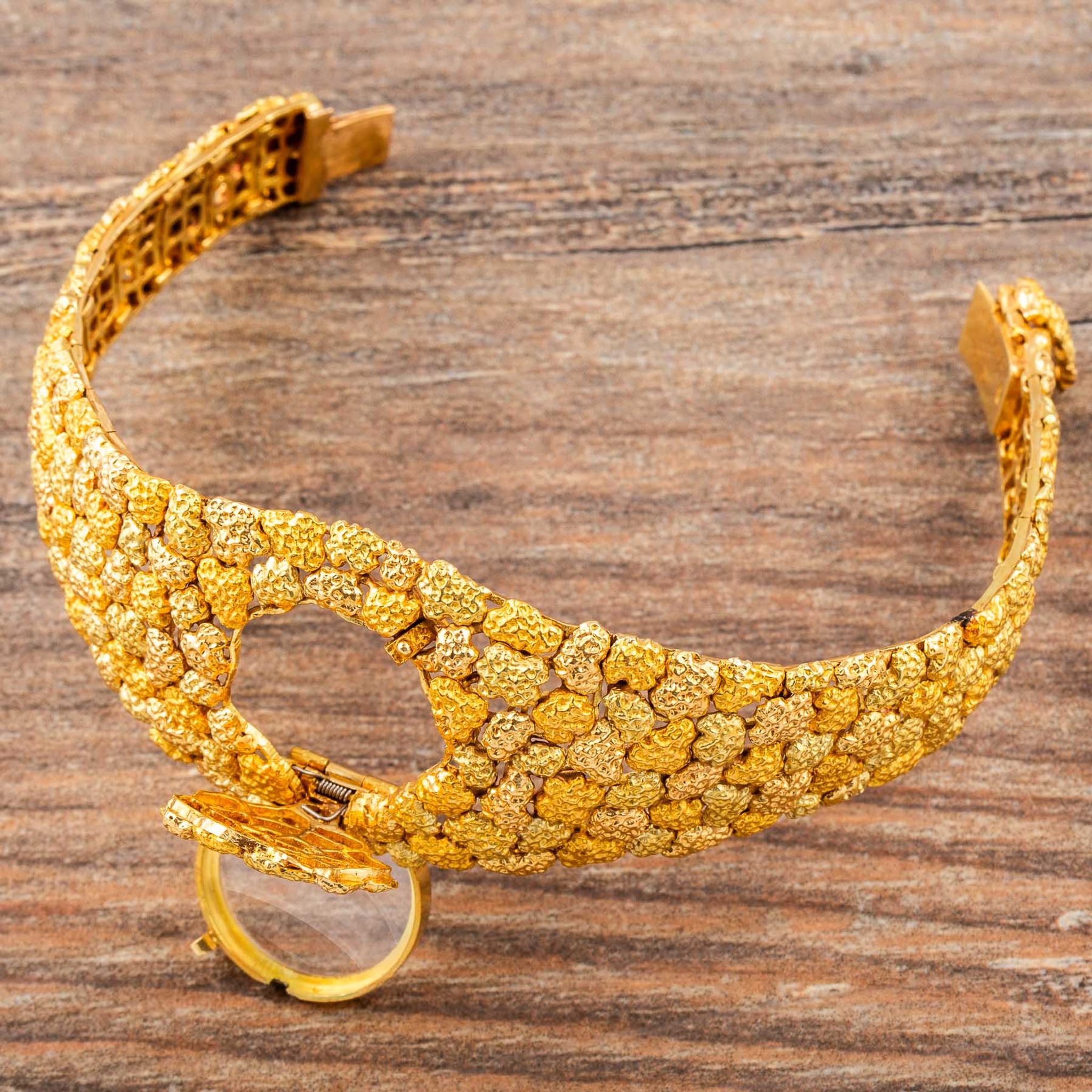The present watch is a striking example of Albert’s creative style: an 18k yellow gold “nugget” bracelet-watch, made for Omega in the 1960s. Its bold, textured links are designed to look like raw gold formations, creating a sculptural bracelet that wraps the wrist in rich, golden tones. Hidden within this organic pattern is a concealed watch dial, covered by a hinged lid that keeps the look of the bracelet uninterrupted when closed.