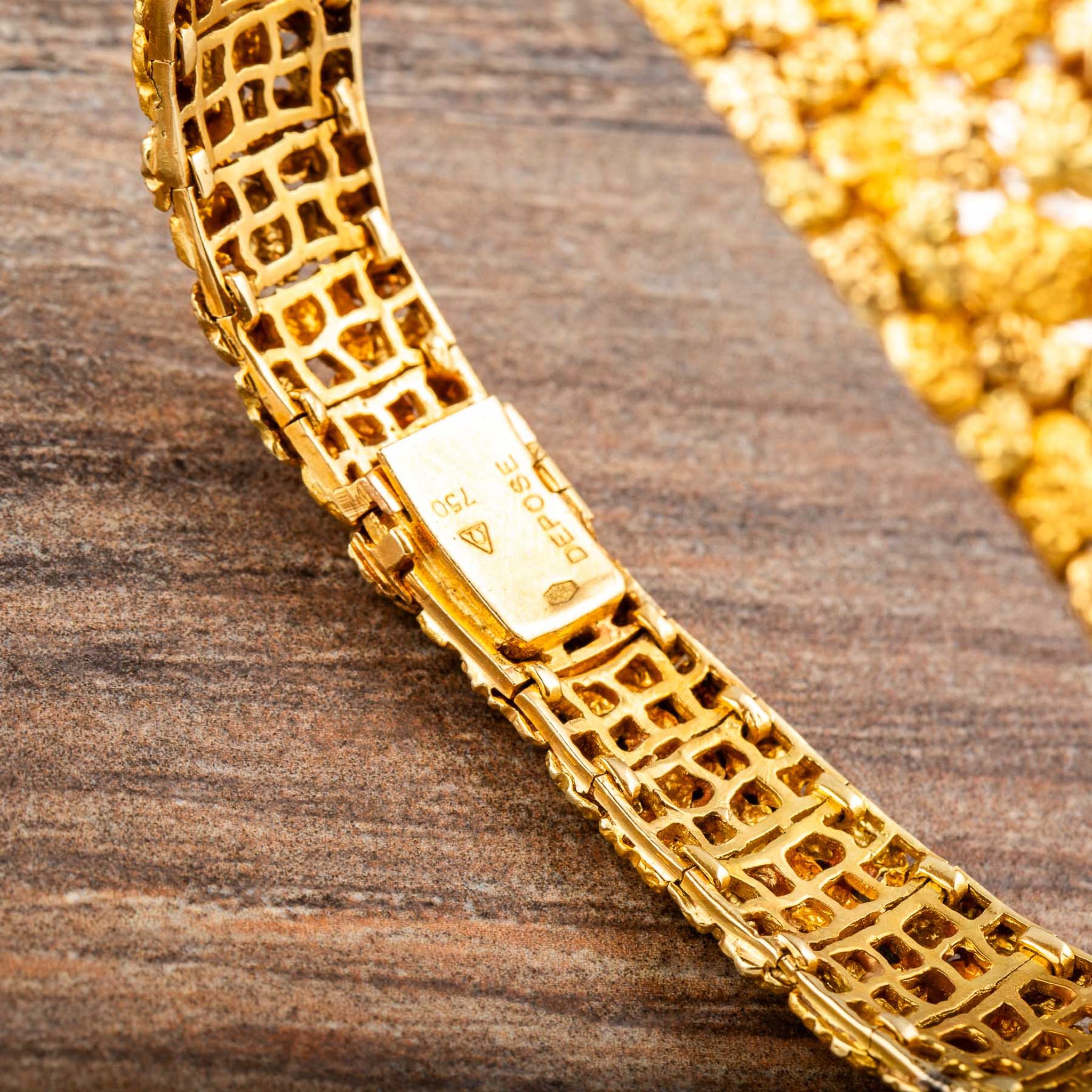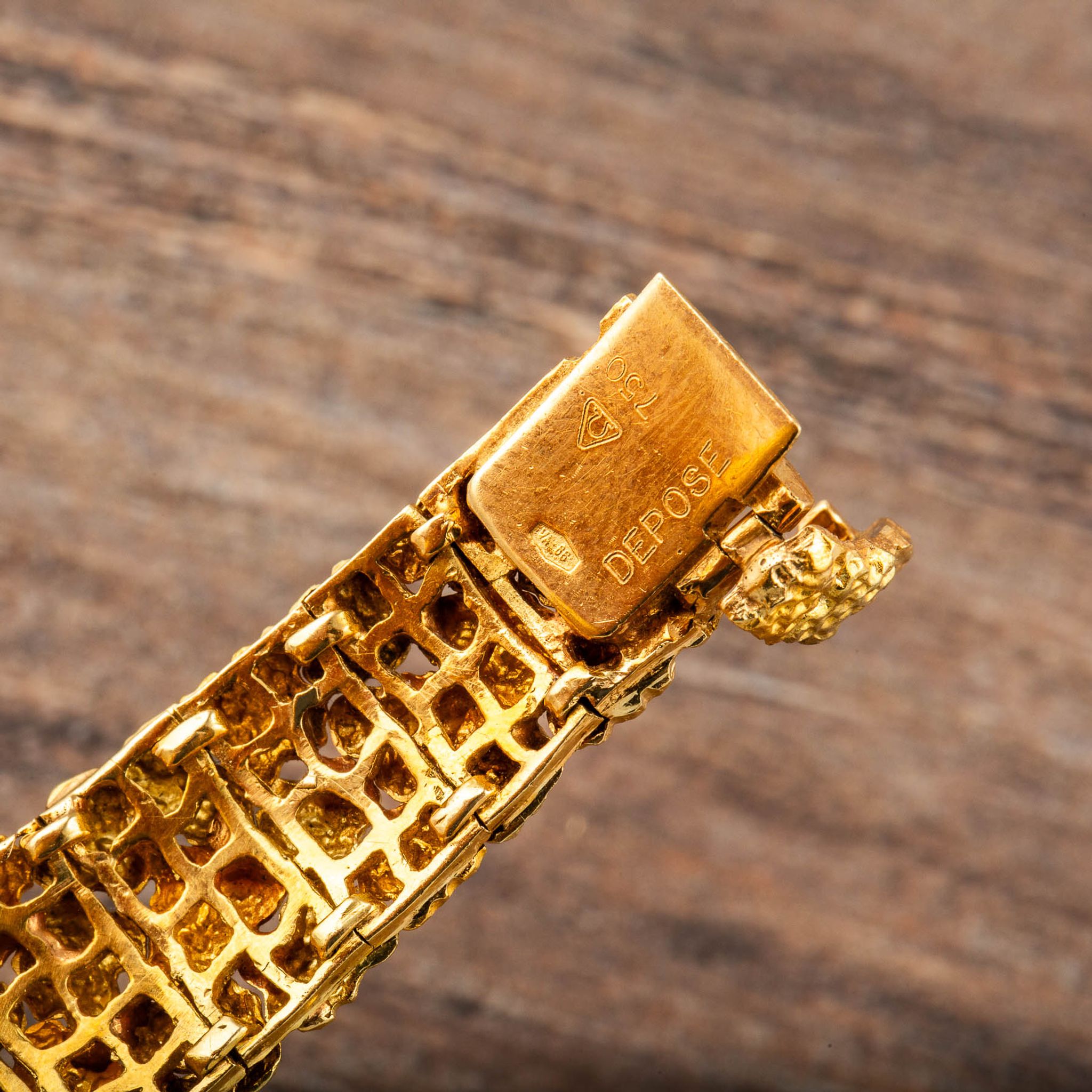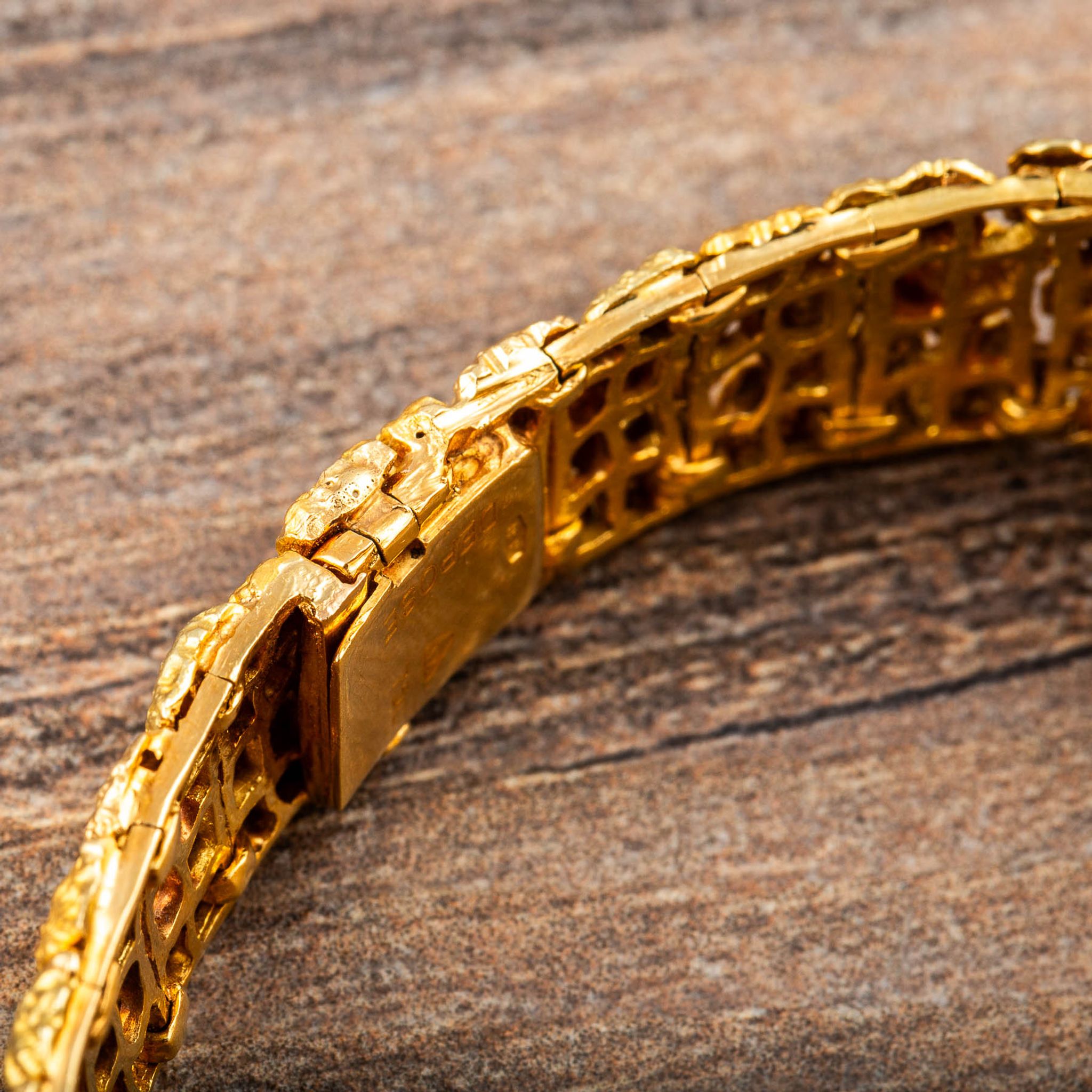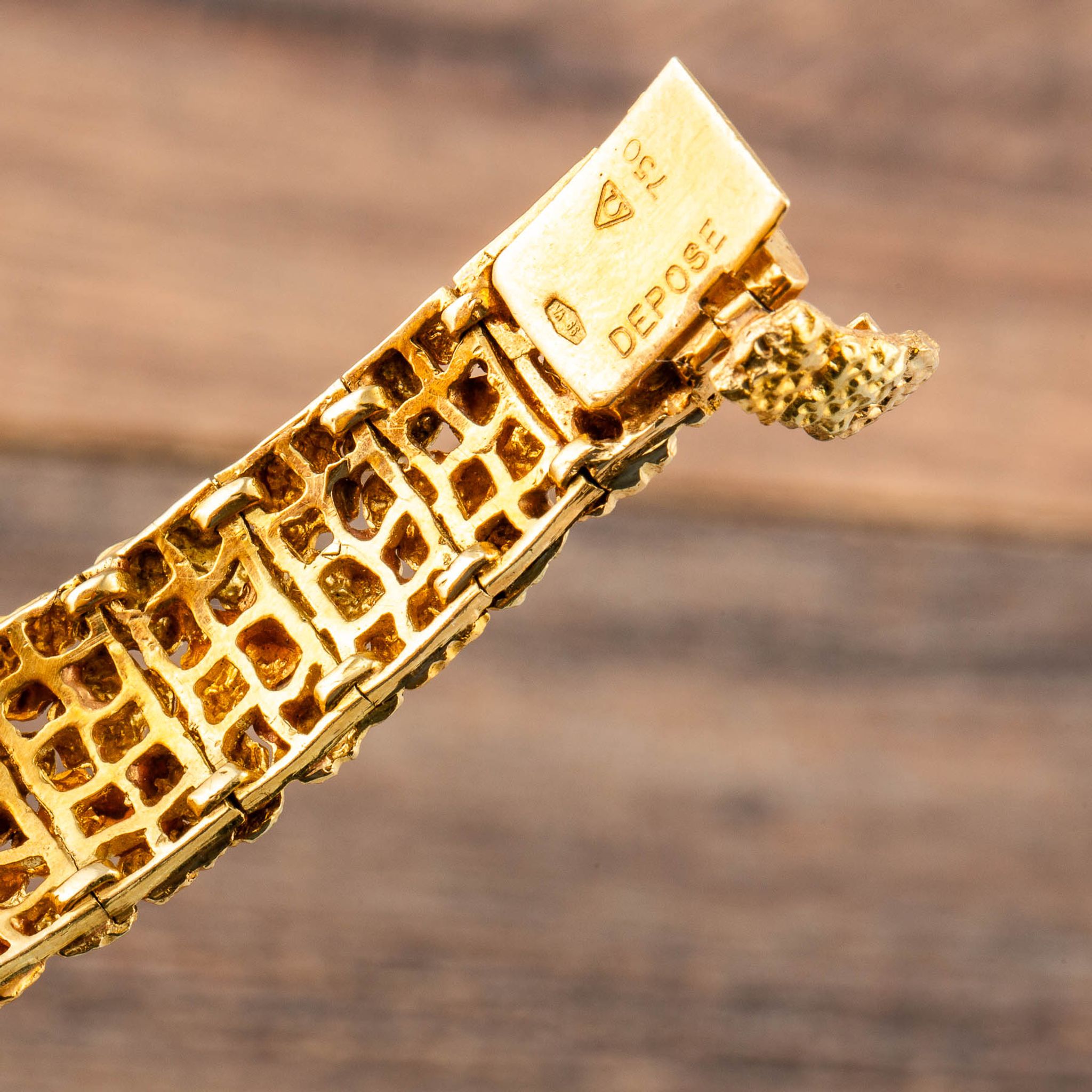 The present watch is a striking example of Albert’s creative style: an 18k yellow gold “nugget” bracelet-watch, made for Omega in the 1960s. Its bold, textured links are designed to look like raw gold formations, creating a sculptural bracelet that wraps the wrist in rich, golden tones. Hidden within this organic pattern is a concealed watch dial, covered by a hinged lid that keeps the look of the bracelet uninterrupted when closed.