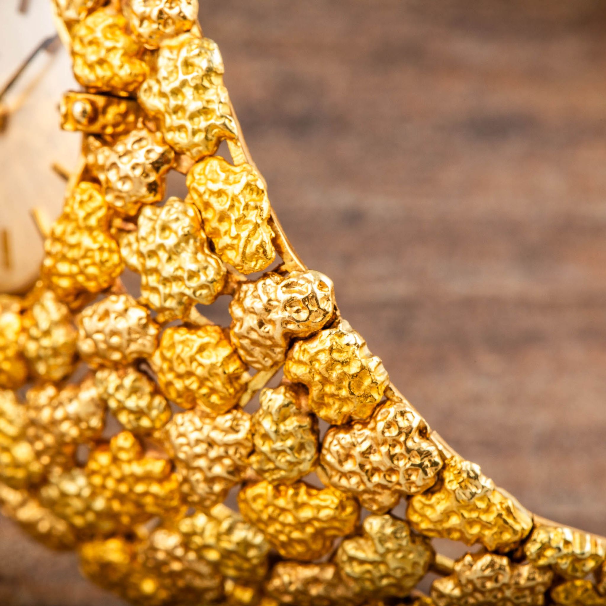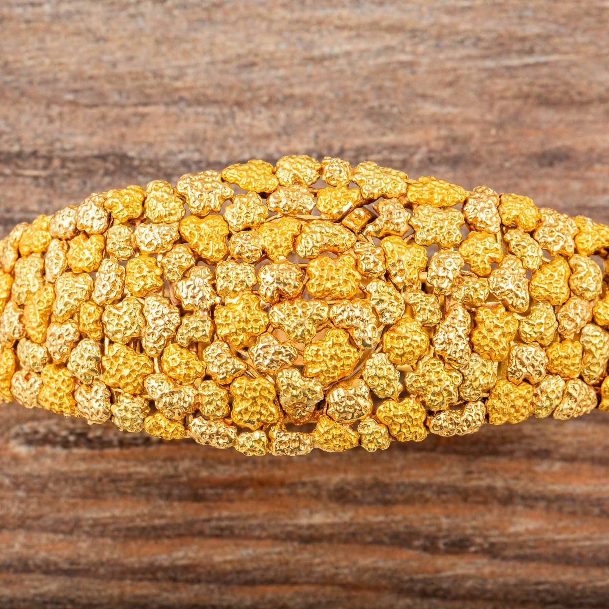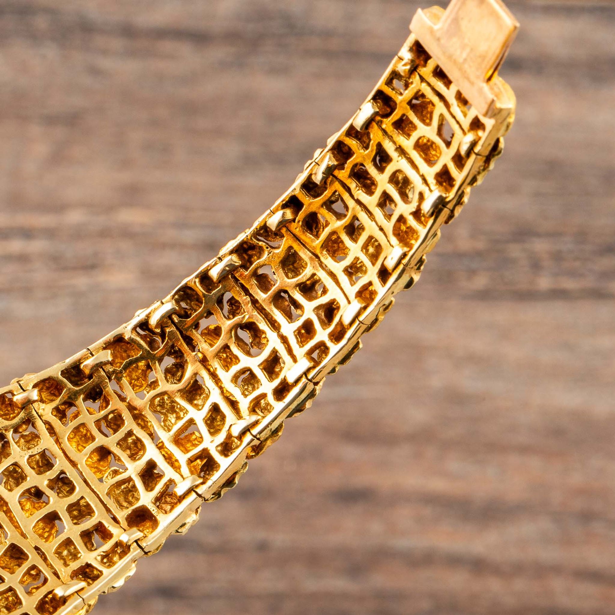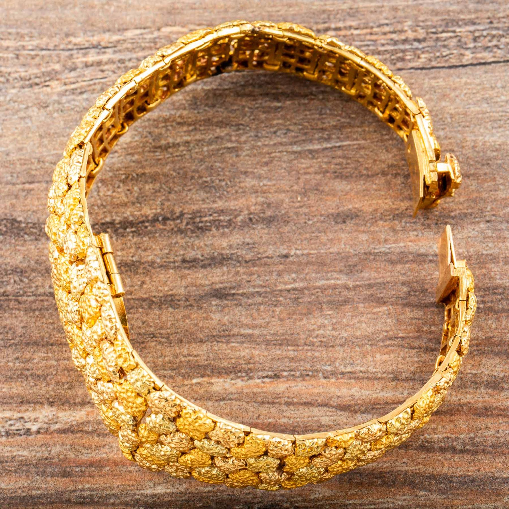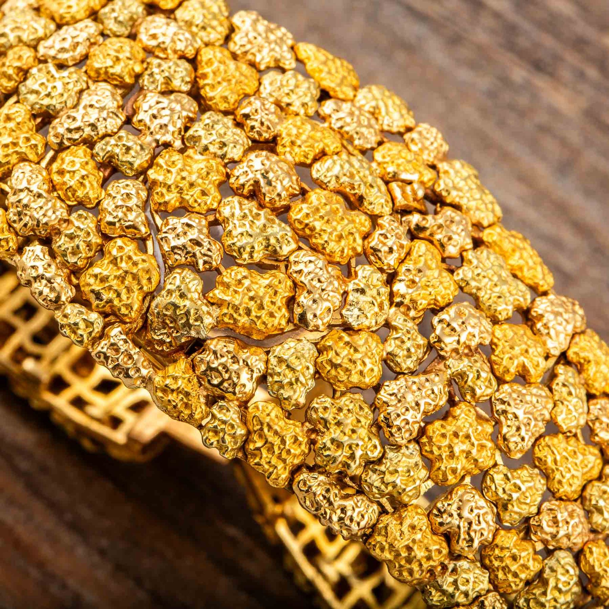 The present watch is a striking example of Albert’s creative style: an 18k yellow gold “nugget” bracelet-watch, made for Omega in the 1960s. Its bold, textured links are designed to look like raw gold formations, creating a sculptural bracelet that wraps the wrist in rich, golden tones. Hidden within this organic pattern is a concealed watch dial, covered by a hinged lid that keeps the look of the bracelet uninterrupted when closed.