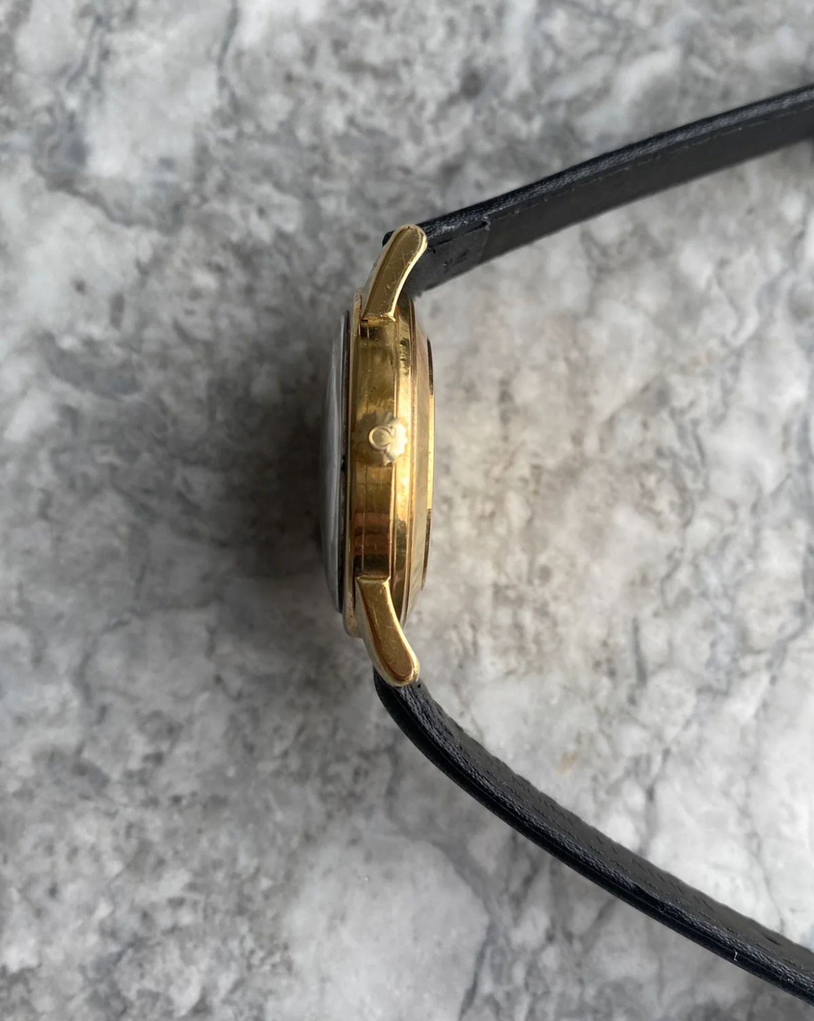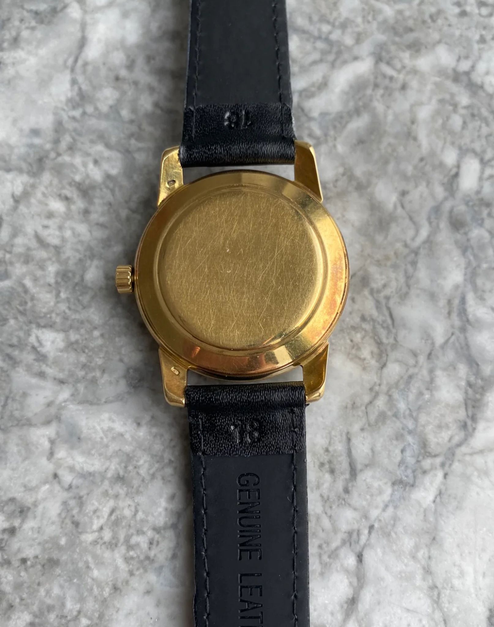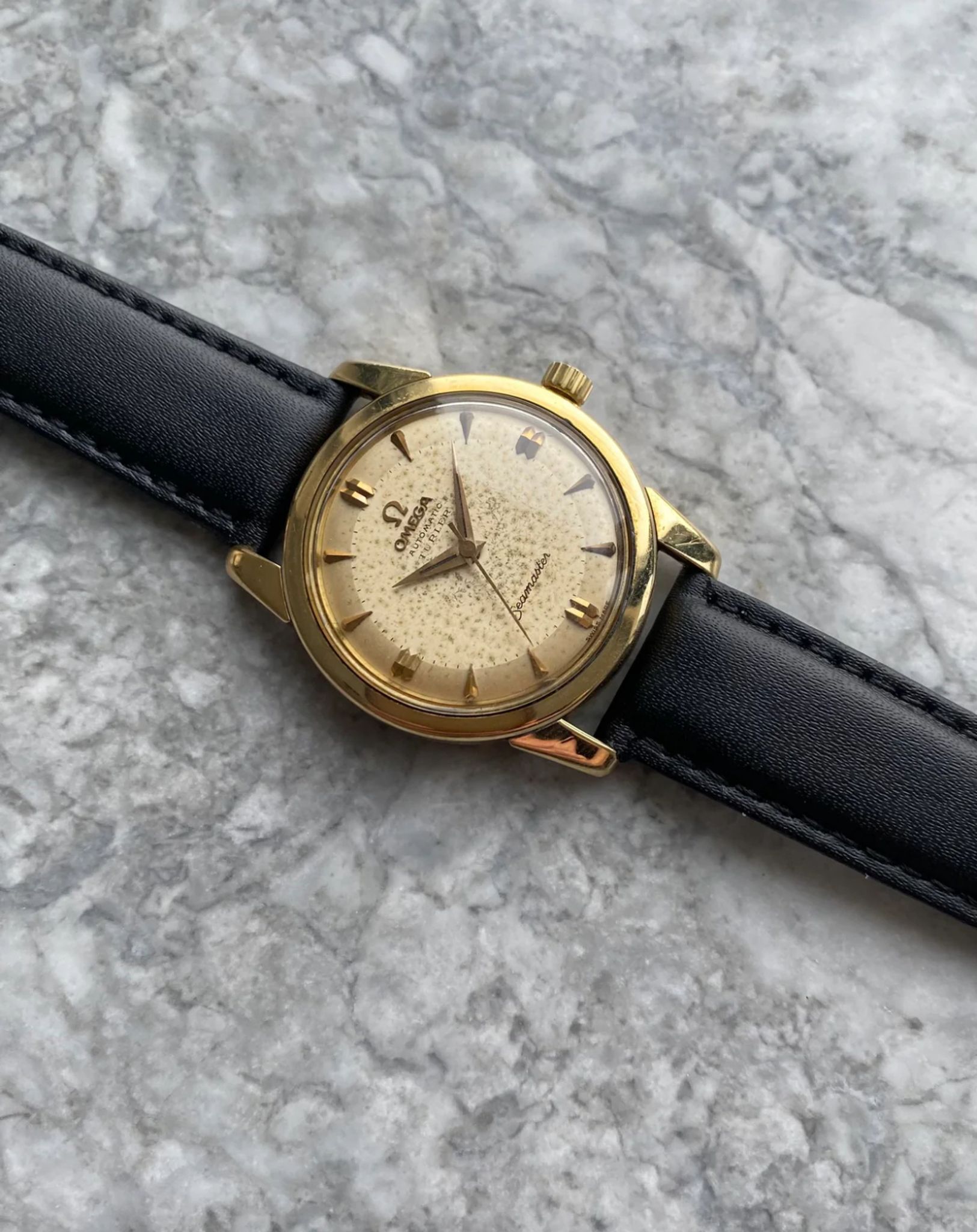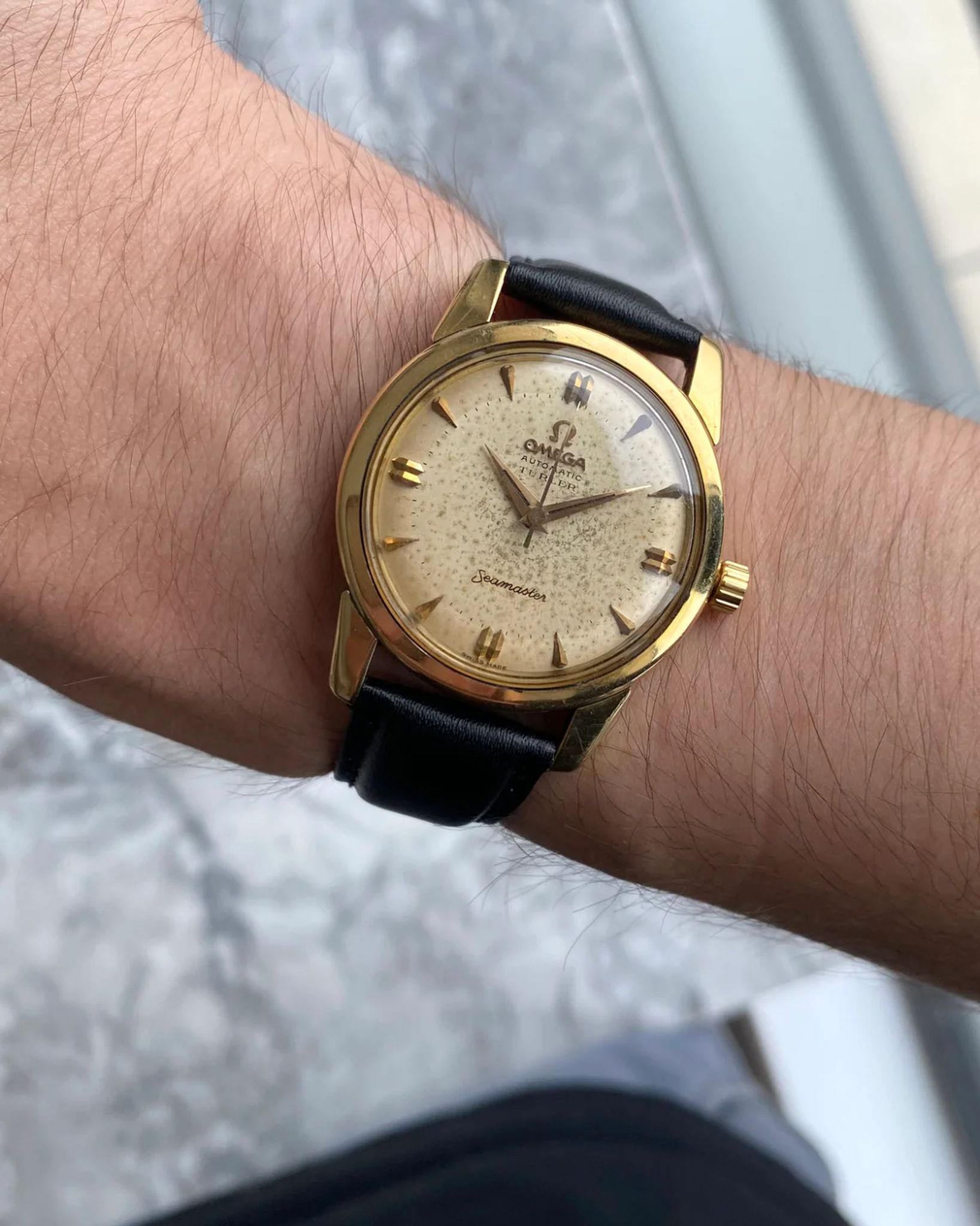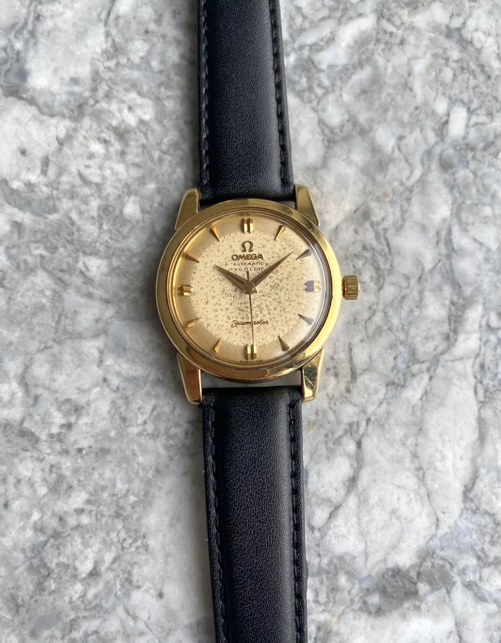 Here's a vintage Omega seamaster automatic with a \"Turler\" retail stamp from the late 50s, early 60s. Keeps great time and is fully functional. Measurements include a 34mm case size and 18mm lug width. The watch wears larger than its described 34mm case size because of the thick case and long, beefy lugs. It's on aftermarket black leather strap with a matching gold Omega buckle. Time only. 18K yellow gold case and caseback. Matching Gold dauphine hands and hour markers. The dial developed some patina as it's now a cream color. Even speckling throughout the dial as seen in photos. This example has a \"Turler\" retail stamp. Turler was a well-known jewelry retailer Europe. Turler would stamp their brand name on certain Omegas, Universal Geneve, etc. Stainless steel case and caseback. All parts are original including the signed Omega crown, dial, movement, and case back. Both the dial and case are in great cosmetic, untouched condition.