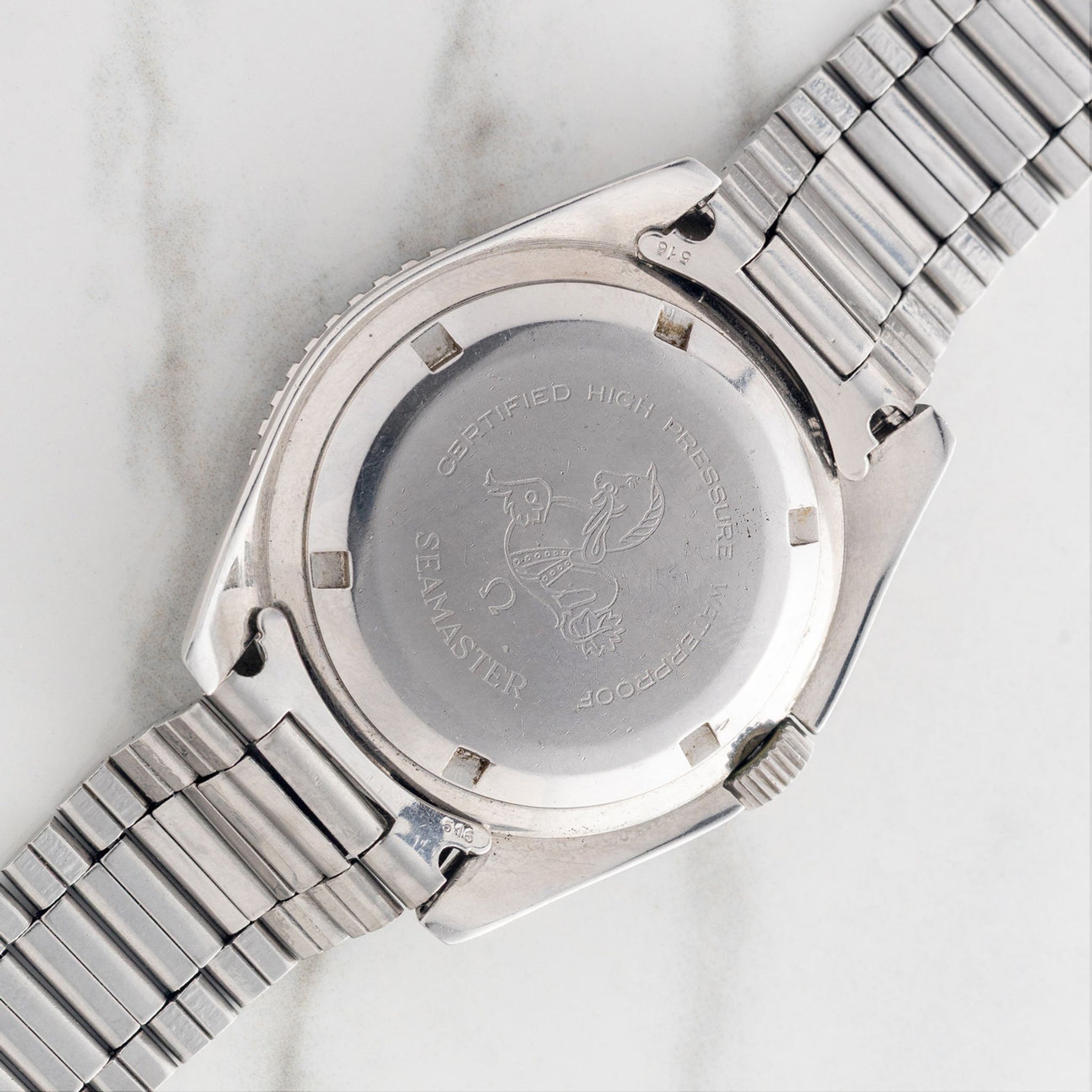 Not all variants of this ref. had the distinctive "sword" hour hand (shared by the highly desirable Rolex "MilSub") or "big triangle" marker at 12 o-clock, but this particular example boasts both of these distinctive and desirable features, which were initially intended to add legibility under high-stress situations such as military use. This piece has remained in stunning vintage condition with beautifully preserved dial/hands as well as sharp and unpolished case/bracelet. Adding to its provenance is an Archive Extract from Omega confirming its production on January 4th, 1968 and delivery to Hong Kong. We couldn't be more thrilled to offer this true collector grade piece to its next custodian.