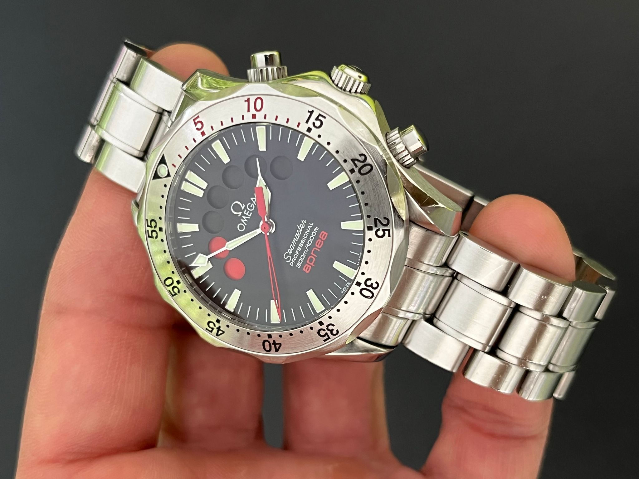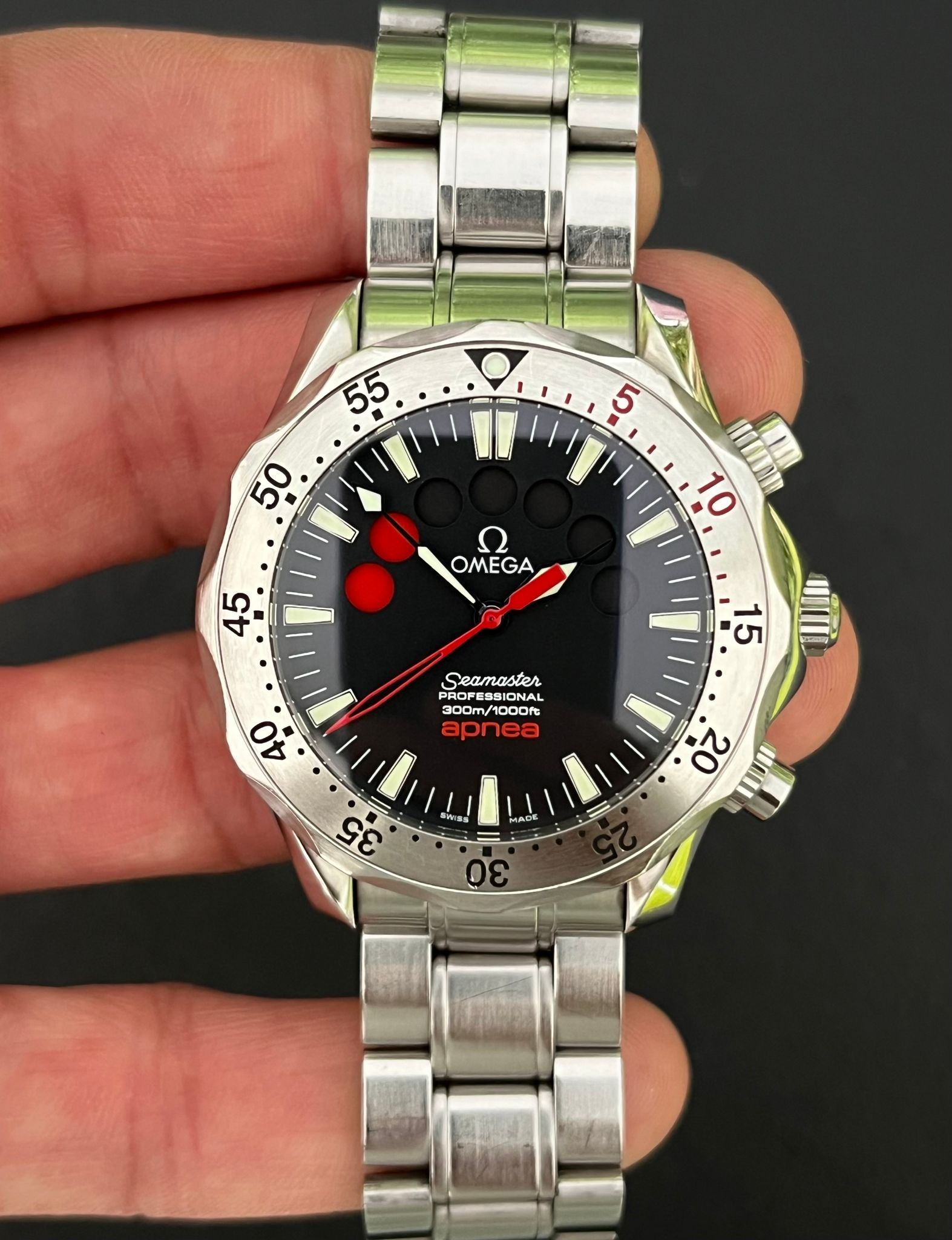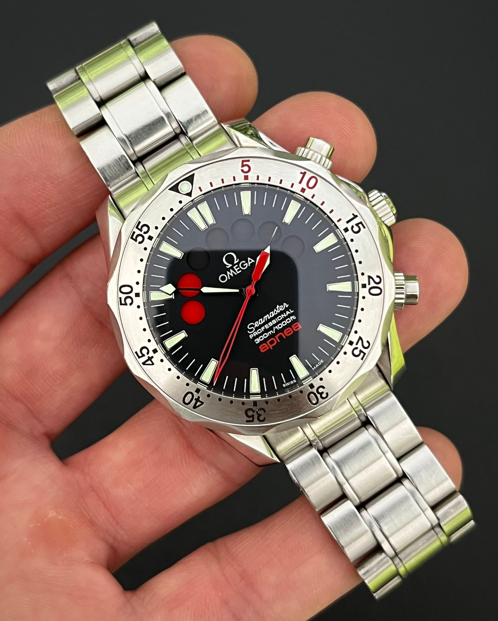 The Omega Seamaster Apnea, reference 2595.50, is a unique diving watch developed in collaboration with renowned freediver Jacques Mayol. Designed specifically for freediving, this model features a distinctive timer dial that counts down seven red circles, each representing a one-minute interval, ideal for apnea or breath-hold diving. Powered by the Omega Caliber 3601, the Apnea offers reliable automatic movement and is encased in a robust 42mm stainless steel case with a unidirectional rotating bezel, providing essential functionality and water resistance up to 300 meters. The black dial, highlighted with red accents and silver hands, enhances underwater visibility, while the screw down crown and pushers adds additional protection for deep dives.