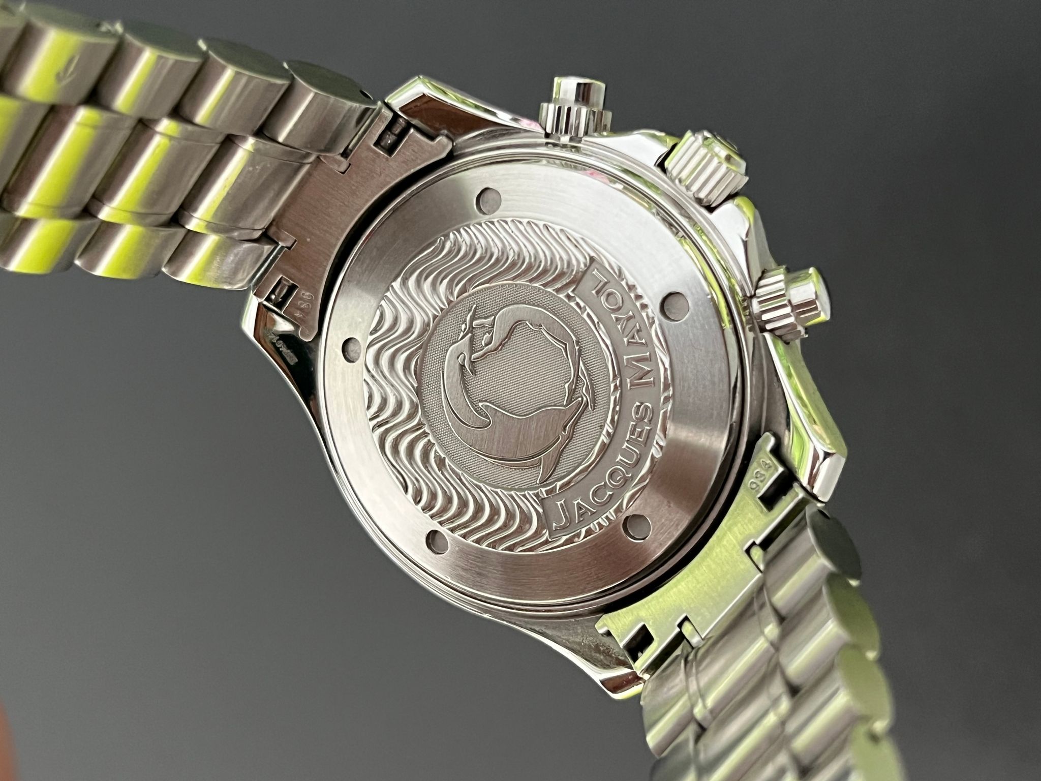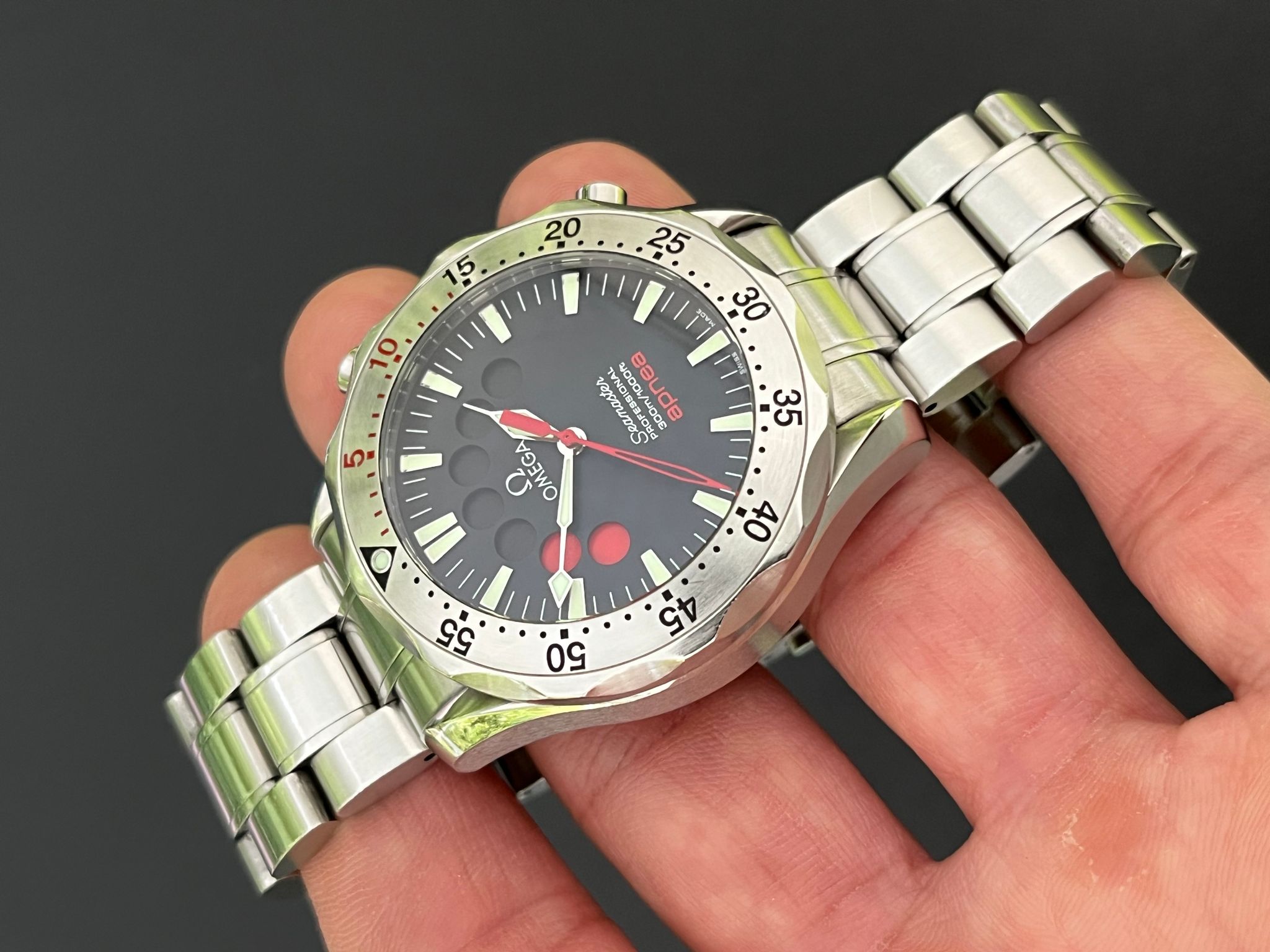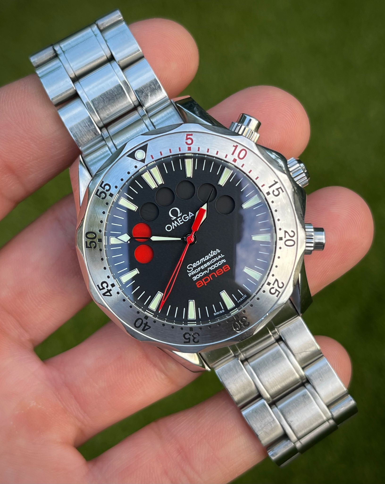 The Omega Seamaster Apnea, reference 2595.50, is a unique diving watch developed in collaboration with renowned freediver Jacques Mayol. Designed specifically for freediving, this model features a distinctive timer dial that counts down seven red circles, each representing a one-minute interval, ideal for apnea or breath-hold diving. Powered by the Omega Caliber 3601, the Apnea offers reliable automatic movement and is encased in a robust 42mm stainless steel case with a unidirectional rotating bezel, providing essential functionality and water resistance up to 300 meters. The black dial, highlighted with red accents and silver hands, enhances underwater visibility, while the screw down crown and pushers adds additional protection for deep dives.