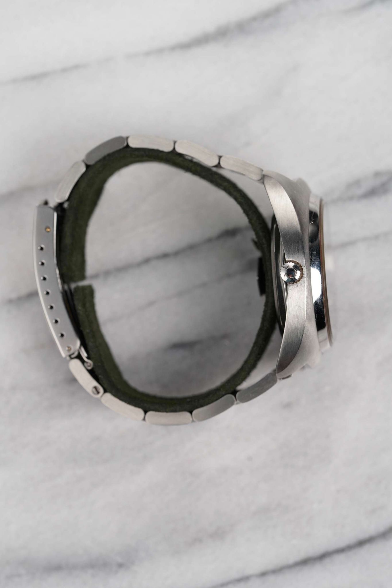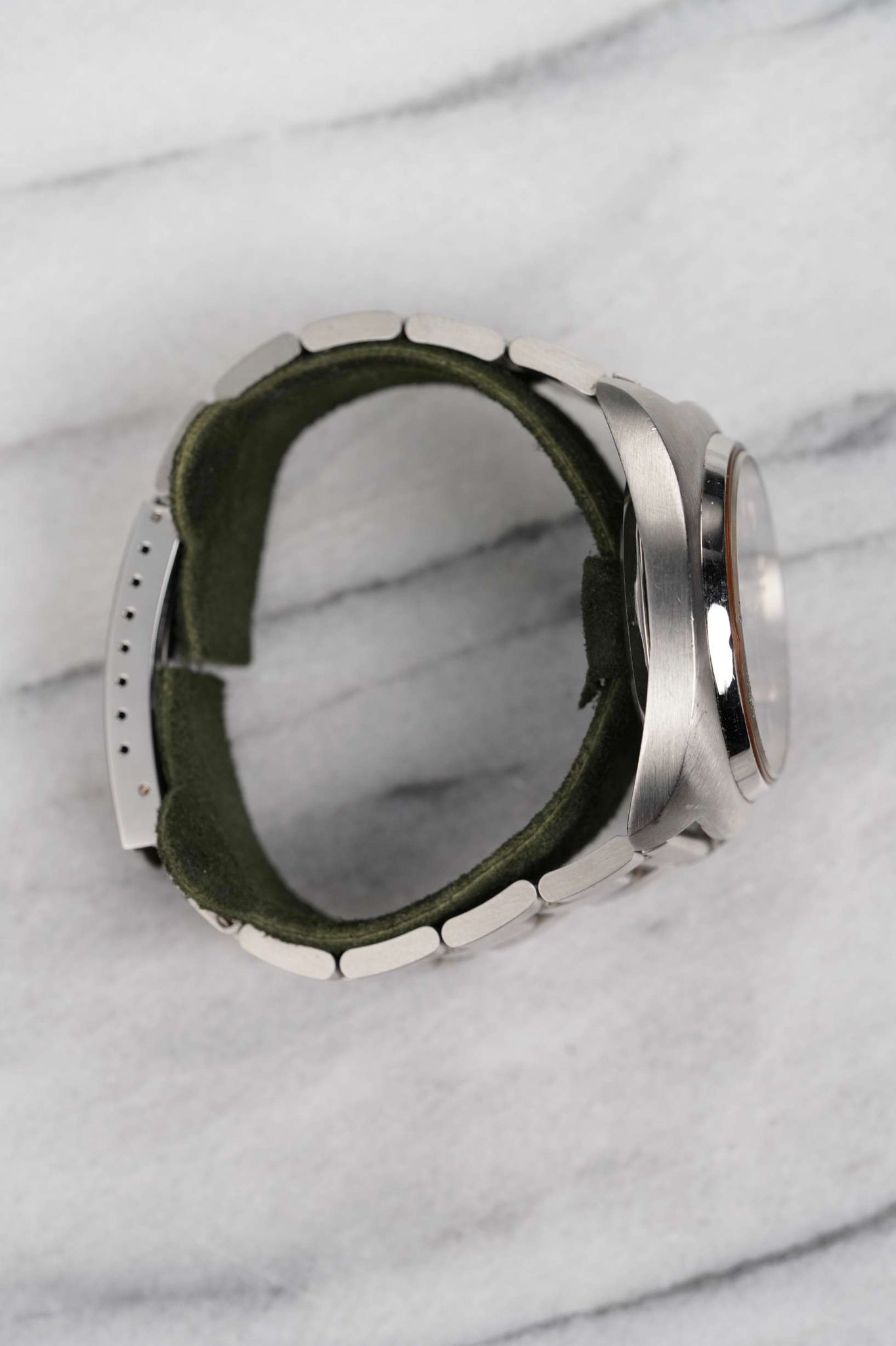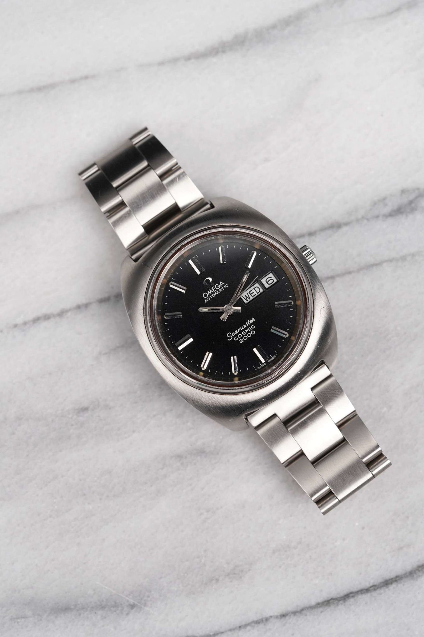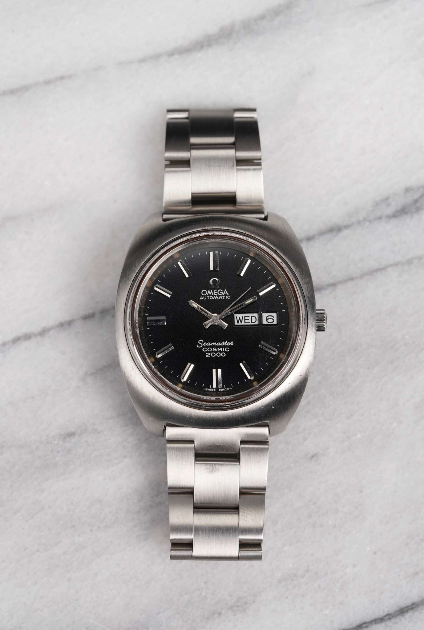 Here's a vintage Omga Seamaster Cosmic 2000 with a black dial from the late 60s, early 70s. Keeps great time and is fully functional. Measurements include a 38mm case size and 20mm lug width. It's on its original bracelet that fits up to a 7 inch wrist. Features include the time and quickset date function at 3 a clock. The lume in both the hands and lume plots near the hour markers turned to a yellow color over time, due to age. The dial and crystal are free from any scratches or marks. Stainless steel case and caseback. All parts are original including the signed Omega crown, dial, movement, and caseback. Both the dial and case are in great cosmetic, untouched condition.