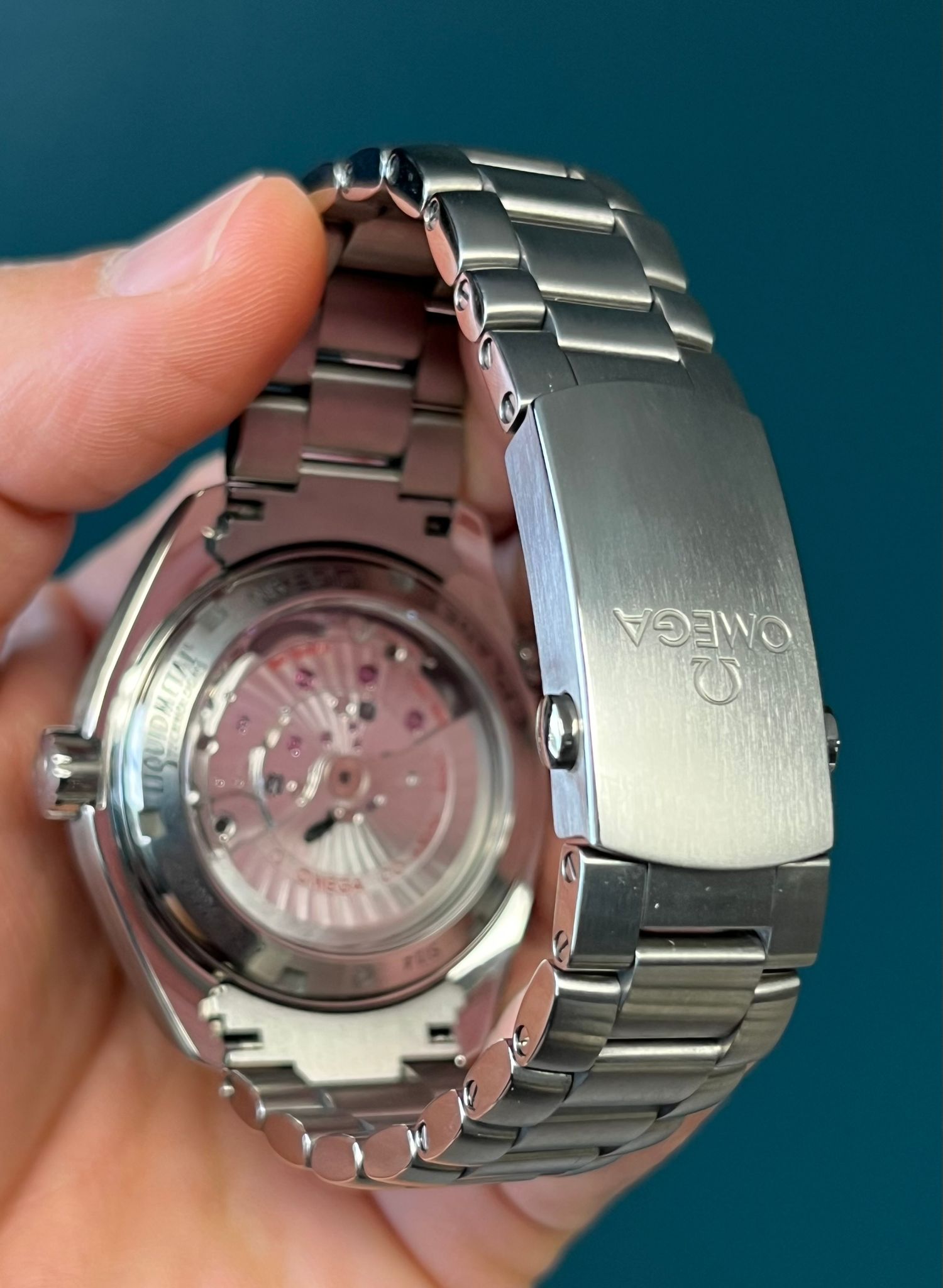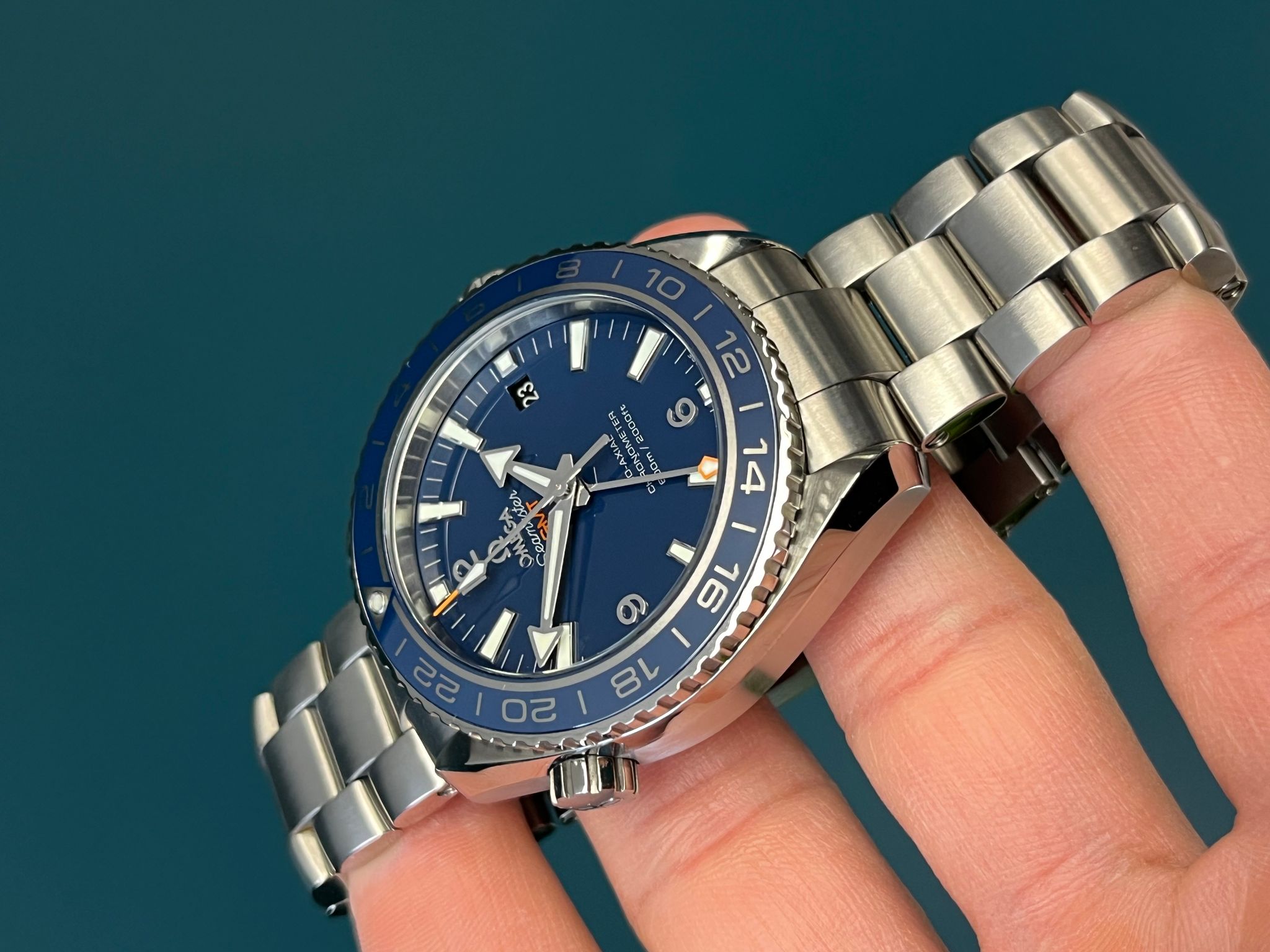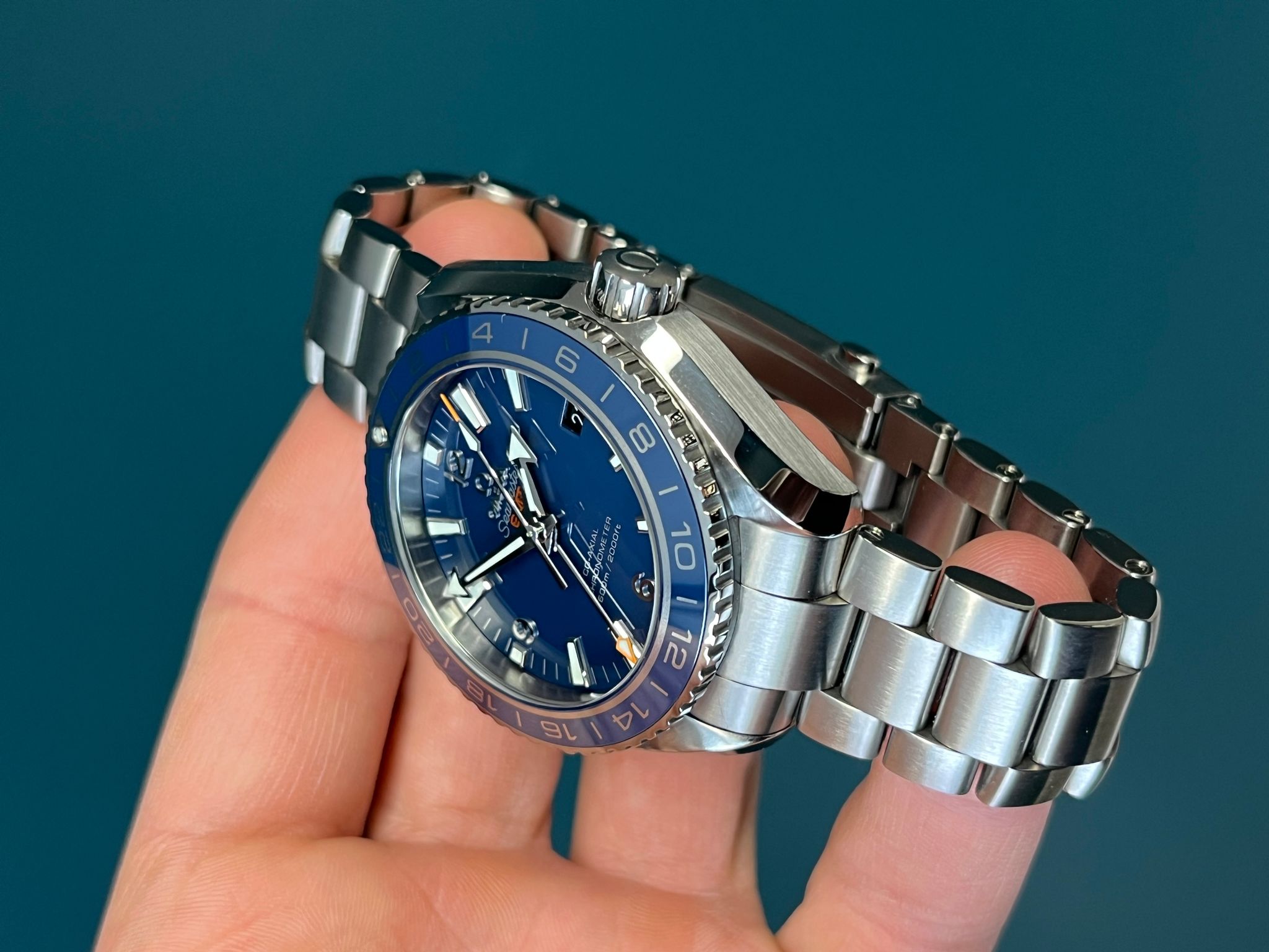 Striking blue dial + ceramic bezel: The blue polished dial is laser-engraved with Omega’s signature wave pattern. The 24‑hour bezel insert is a matching blue ceramic ring, ideal for dual-time viewing .
