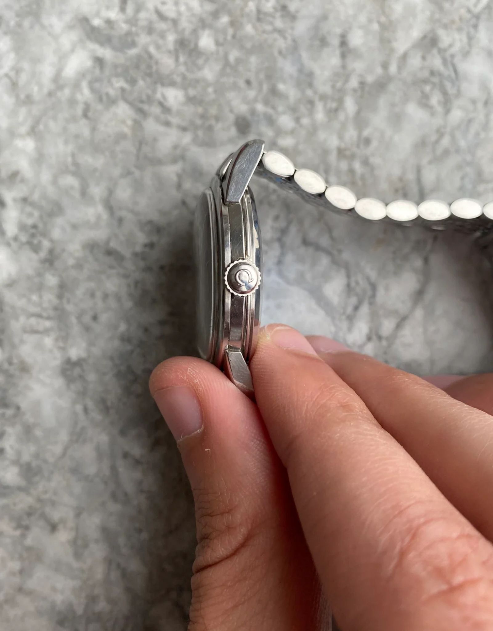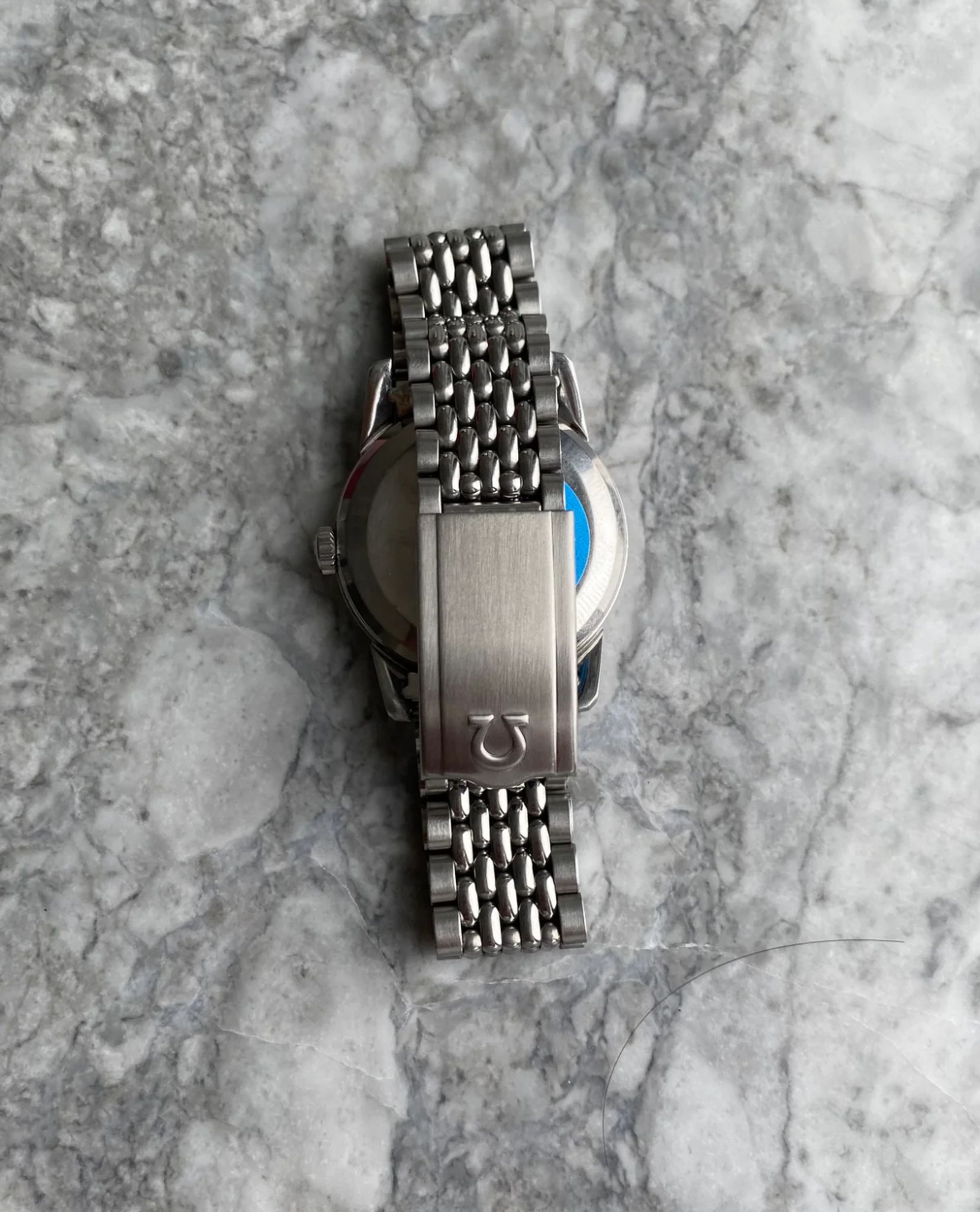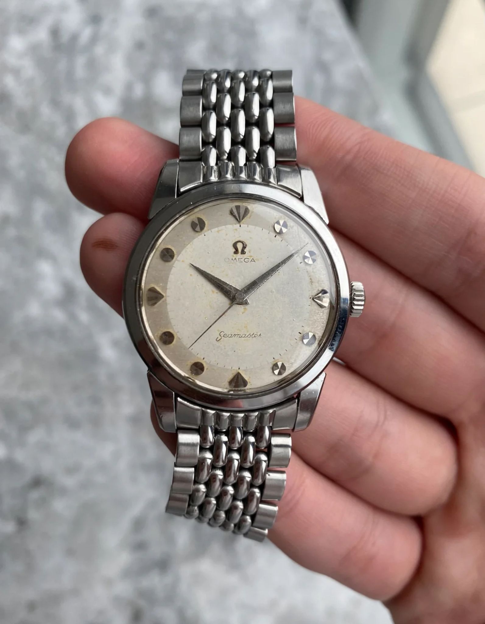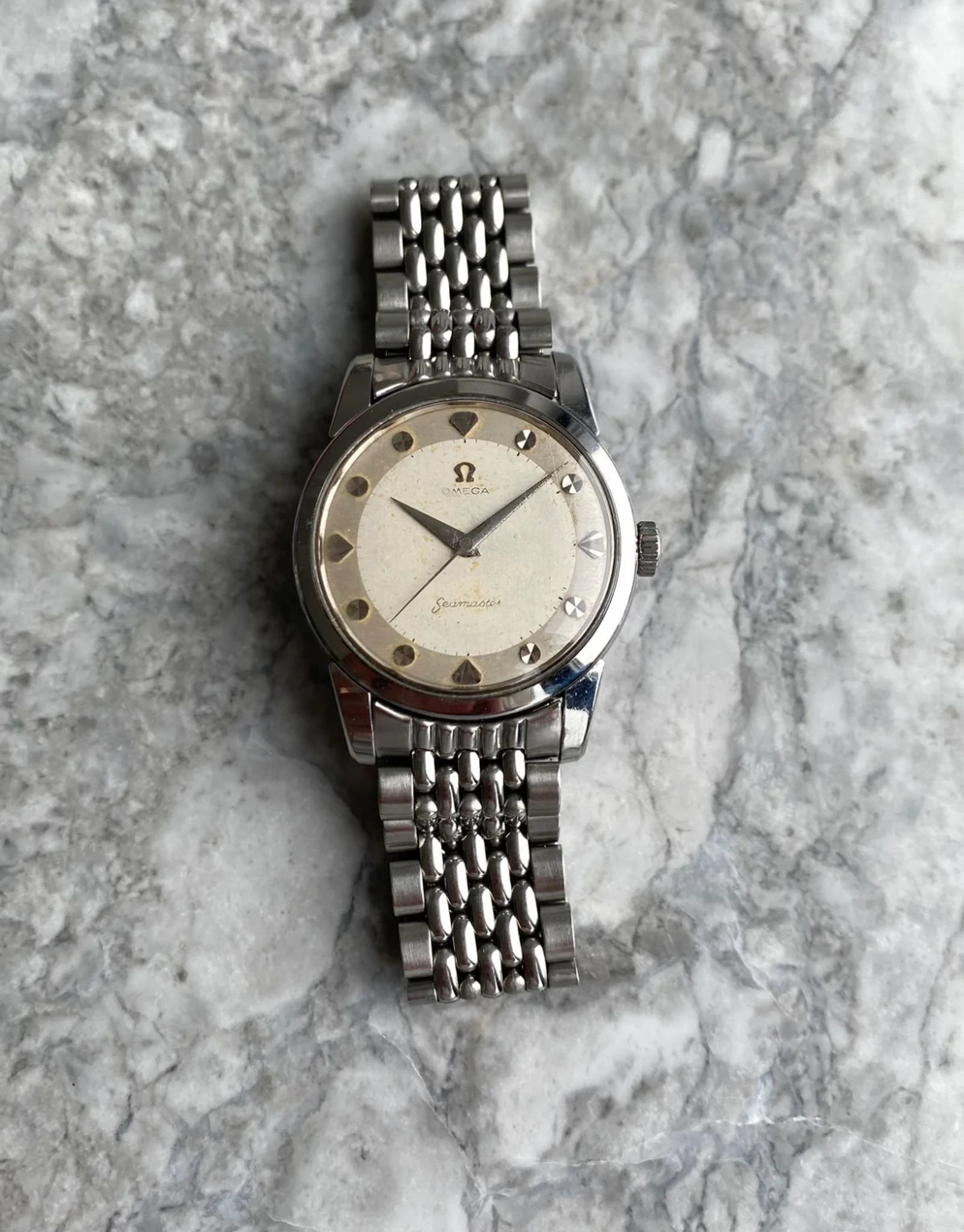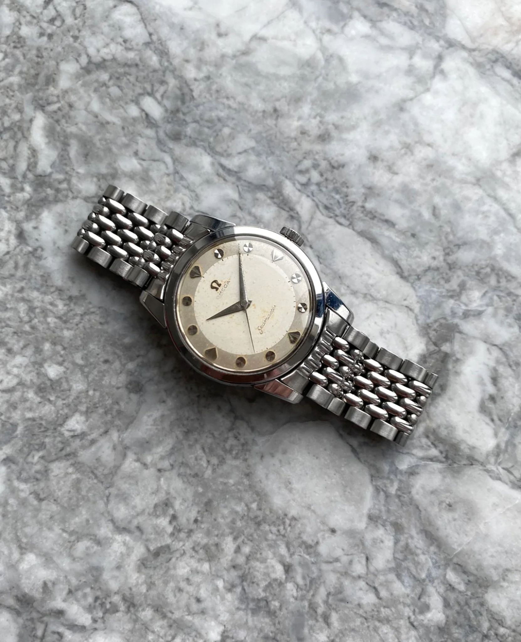 Here's a vintage Omega seamaster automatic with a white/ cream dial from the late 50s, early 60s. Keeps great time and is fully functional. Measurements include a 34mm case size and 18mm lug width. It's on an aftermarket beads of rice bracelet that fits up to a 7.25 inch wrist. The watch wears larger than its described size because of its thicker case and lugs. The dial has a two tone look with a silver outer edge and white towards the middle. The dial has some even spotting, as seen in the photos. The “Omega” text is slightly fading as seen in photos. Dauphine hands and hour markers. Stainless steel case and caseback. The dial and crystal are free from any scratches or marks. All parts are original including the signed Omega crown, dial, movement, and caseback. Both the dial and case are in great cosmetic, untouched condition.