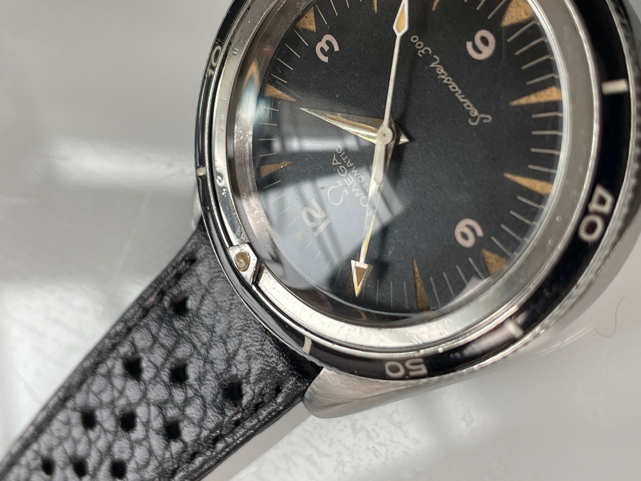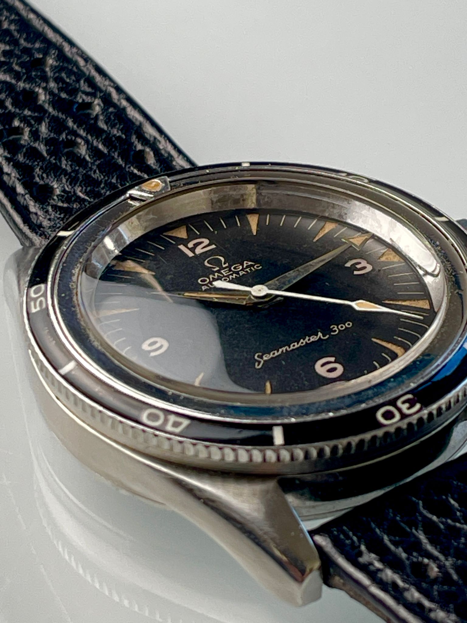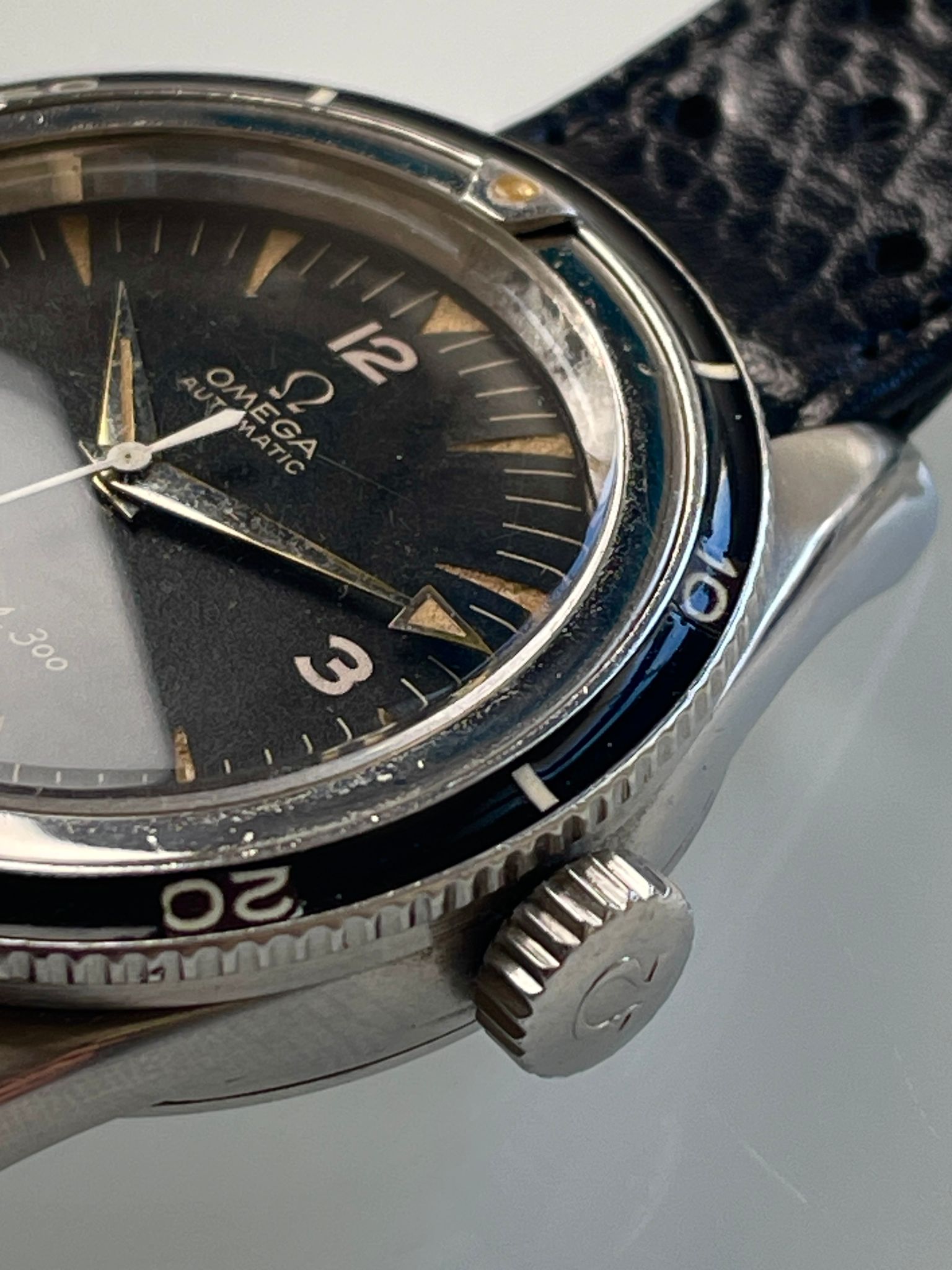 Here is a transitional Seamaster 300, with shark teeth tritium indexes and reversed broad arrows hands set. It has the reference 165.014-62 but retains all the DNA of the primitive Seamaster 300. The last mohican with the elegance of the 4 digits CK serie.
