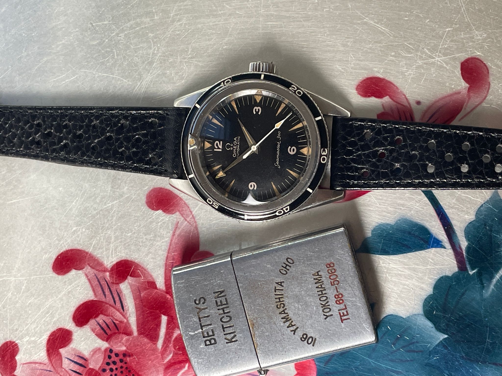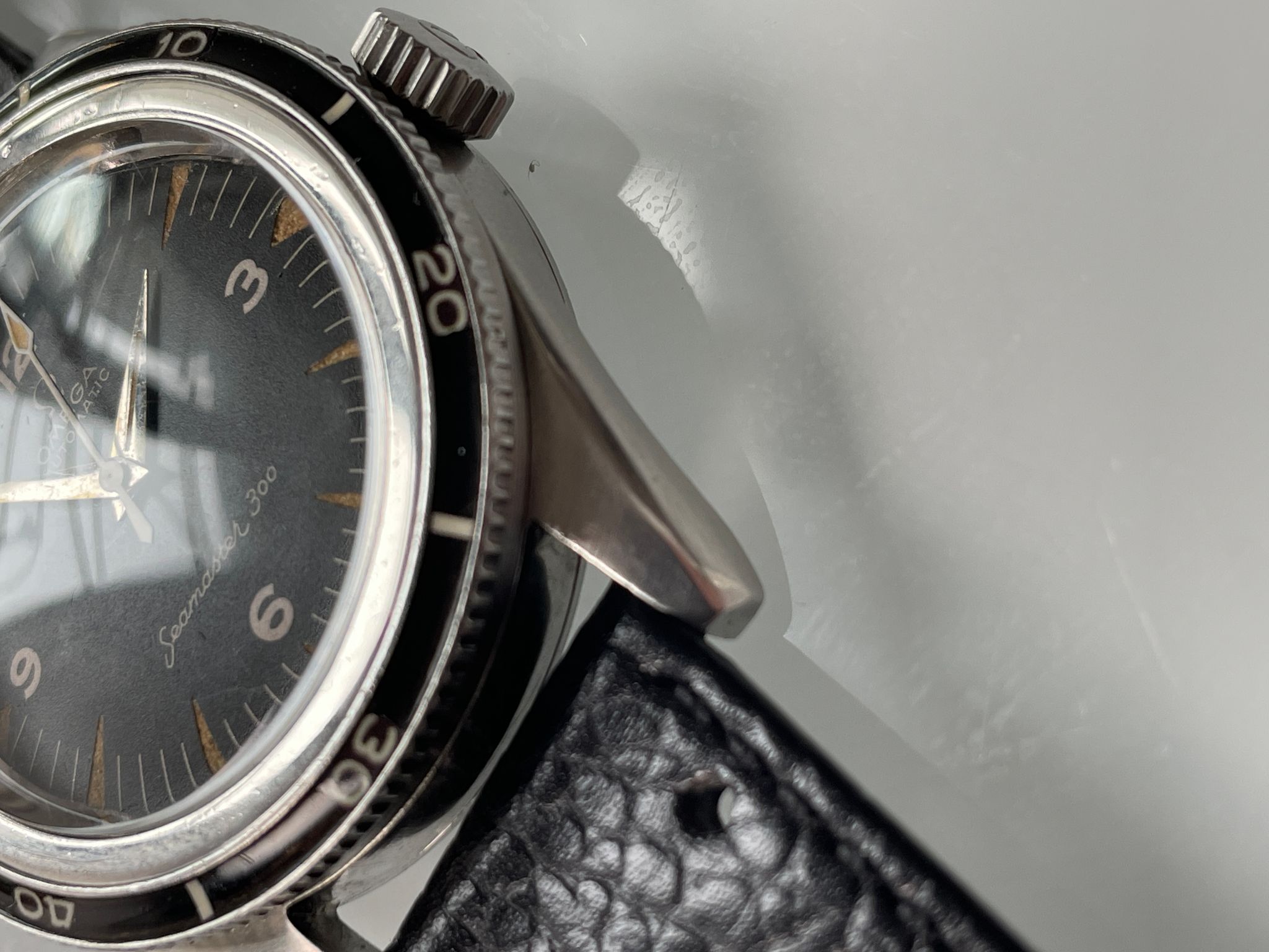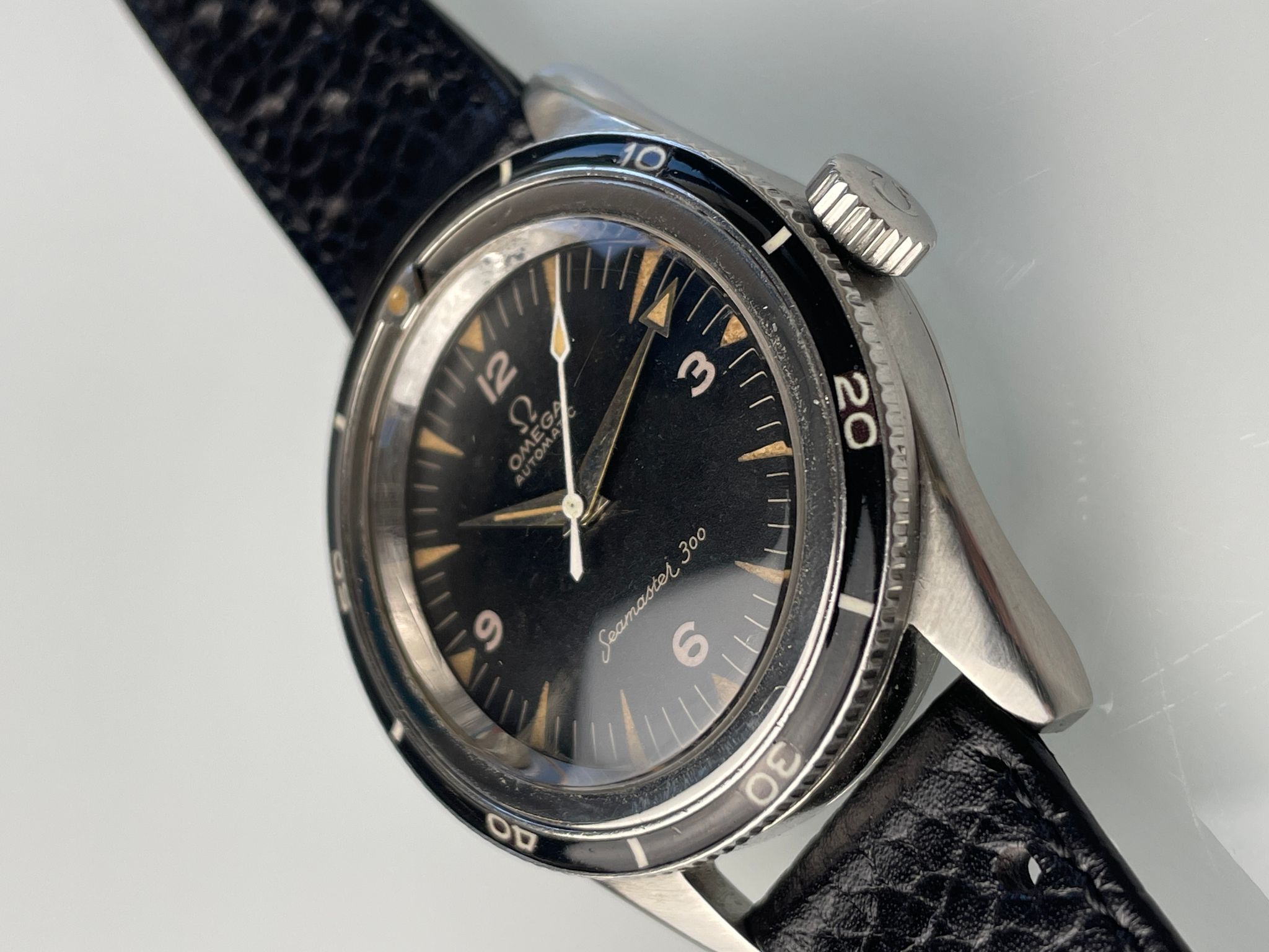 Here is a transitional Seamaster 300, with shark teeth tritium indexes and reversed broad arrows hands set. It has the reference 165.014-62 but retains all the DNA of the primitive Seamaster 300. The last mohican with the elegance of the 4 digits CK serie.