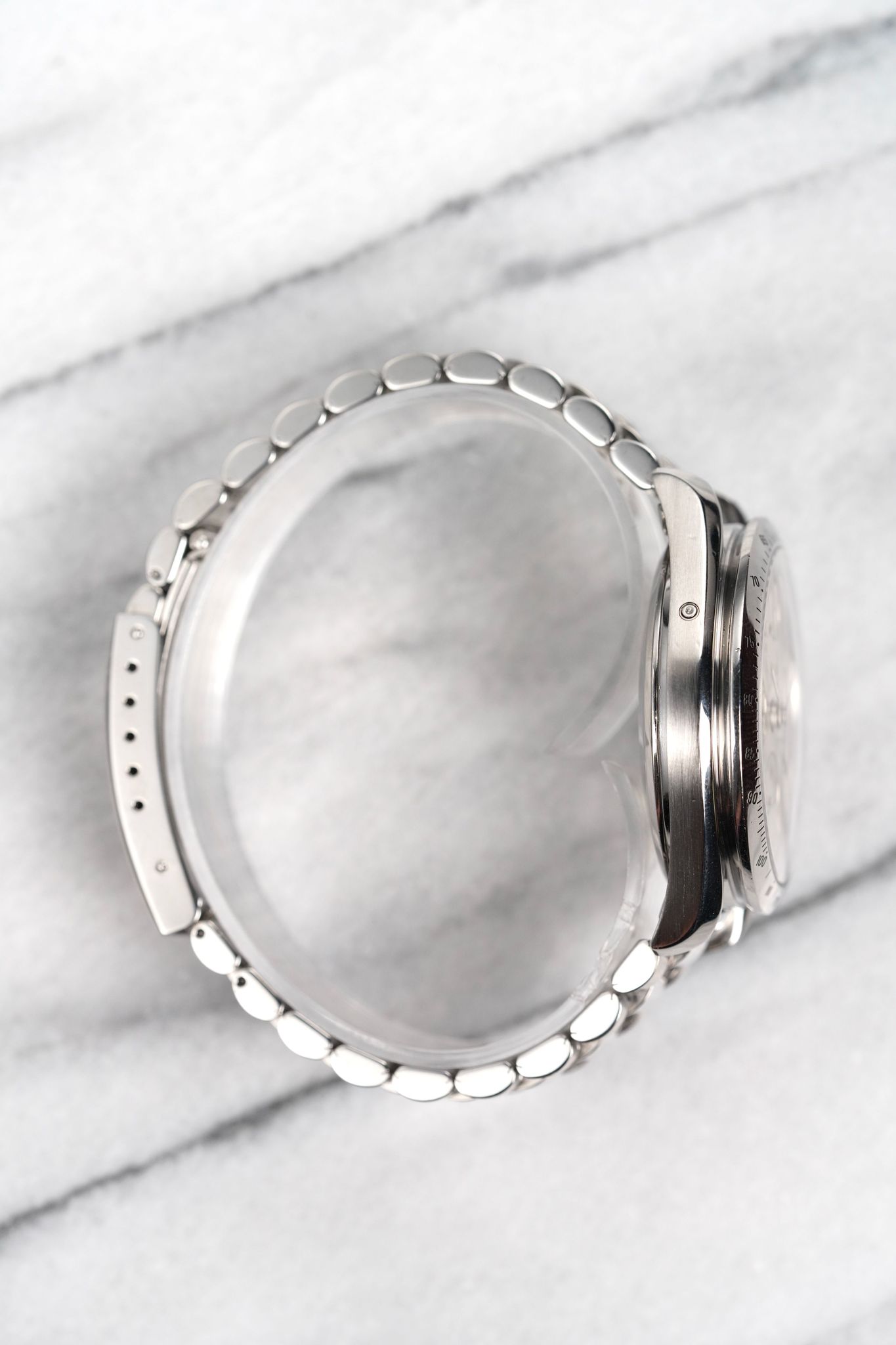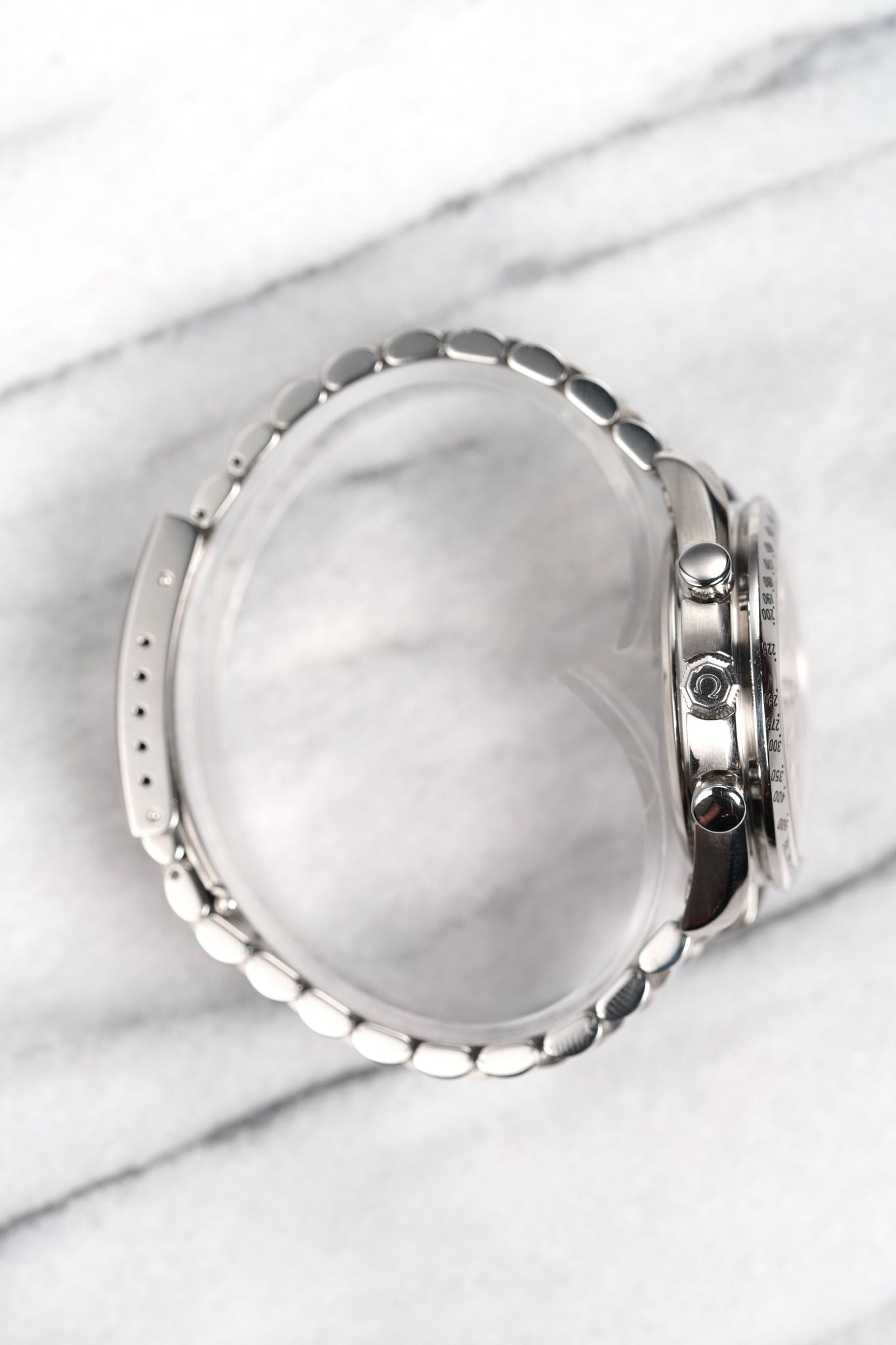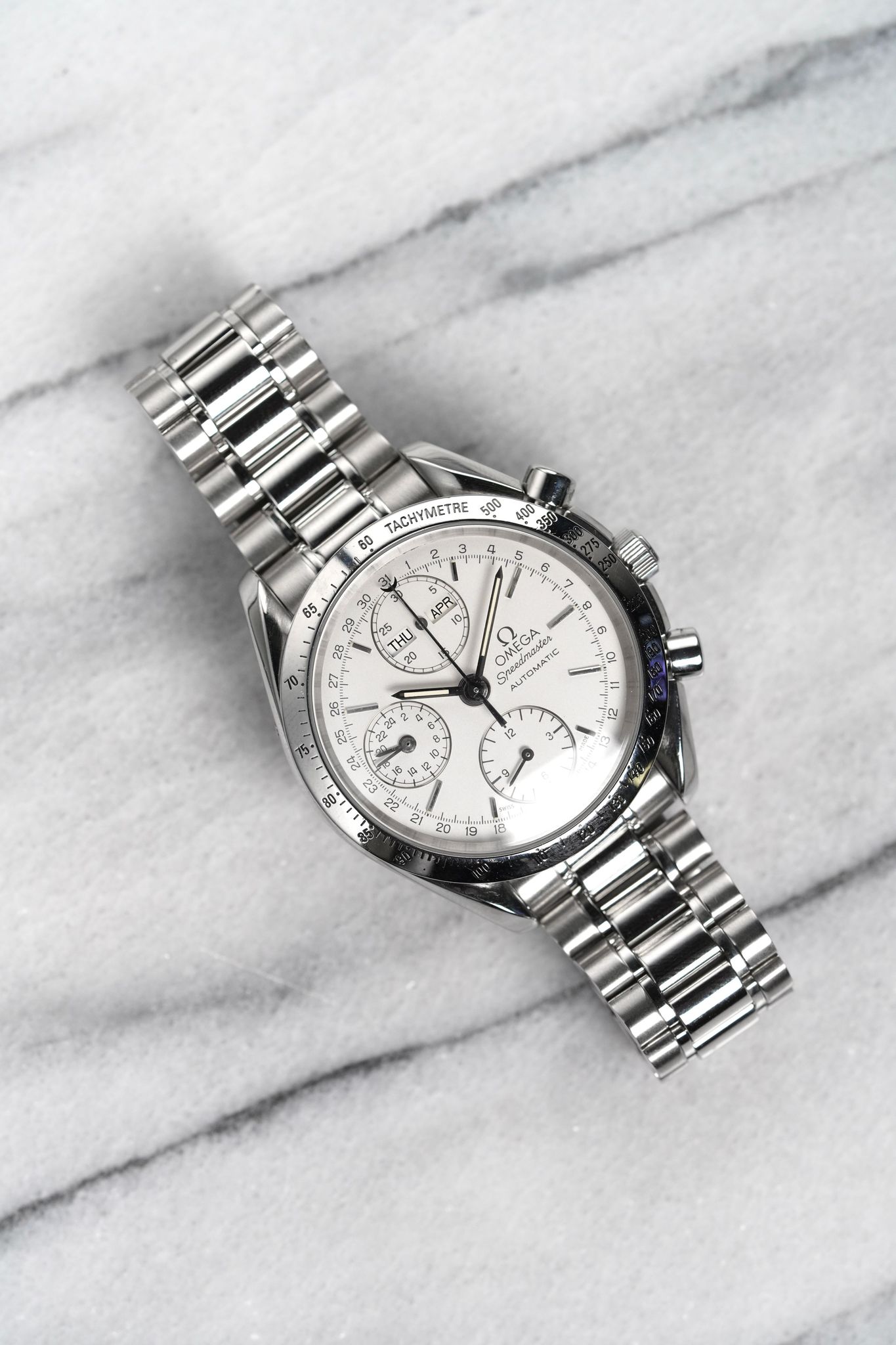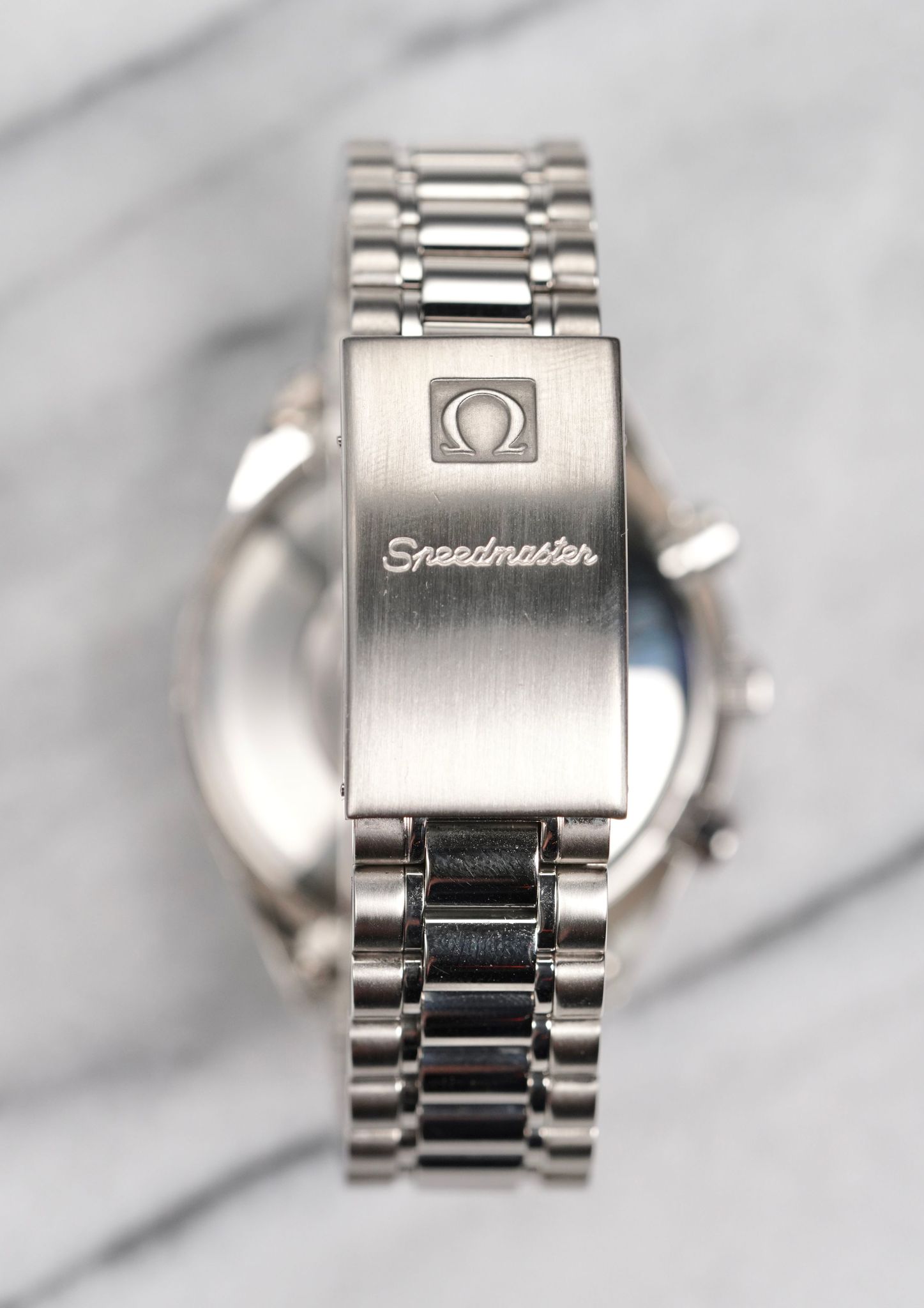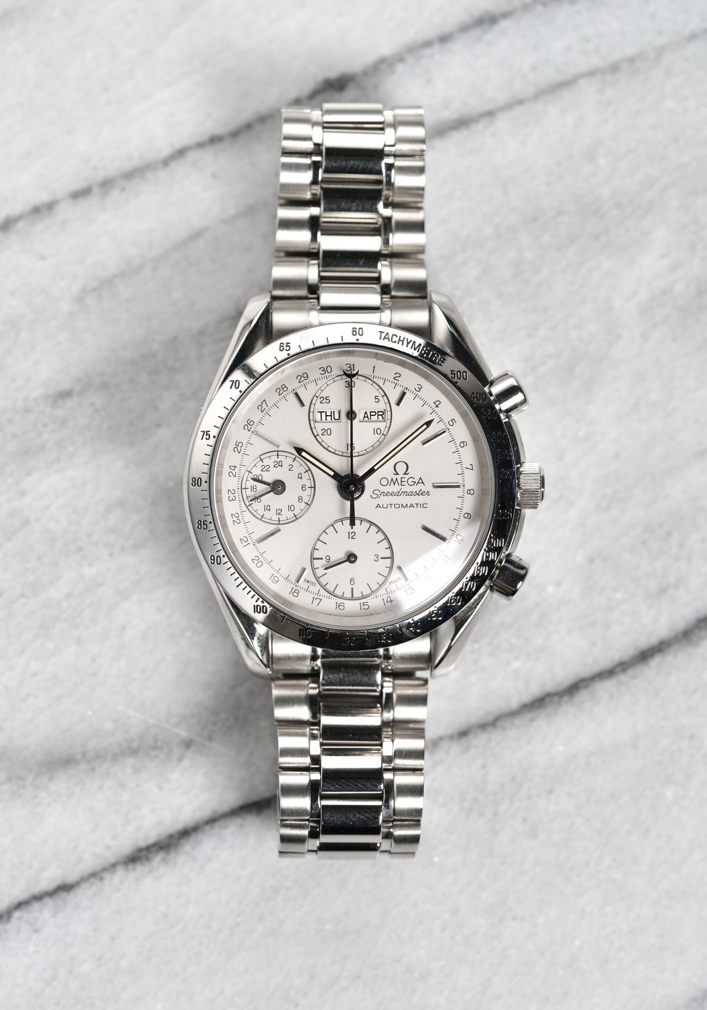 Here's an Omega Speedmaster reference #3521.30 triple date chronograph with a white dial from the late 90s, early 2000s. Keeps great time and is fully functional. Measurements include a 39mm case size and 18mm lug width. On its original Omega stamped bracelet that fits up to a 7.25 inch wrist. Features include the time, chronograph function, day, date, and month. Steel case and caseback. The lume in both the hands and lume plots near the hour markers developed a yellow patina. Both the dial and crystal are free of any scratches or marks. All parts are original including the signed Omega crown, caseback, dial, and movement. Both the dial and case are in great cosmetic, untouched condition.