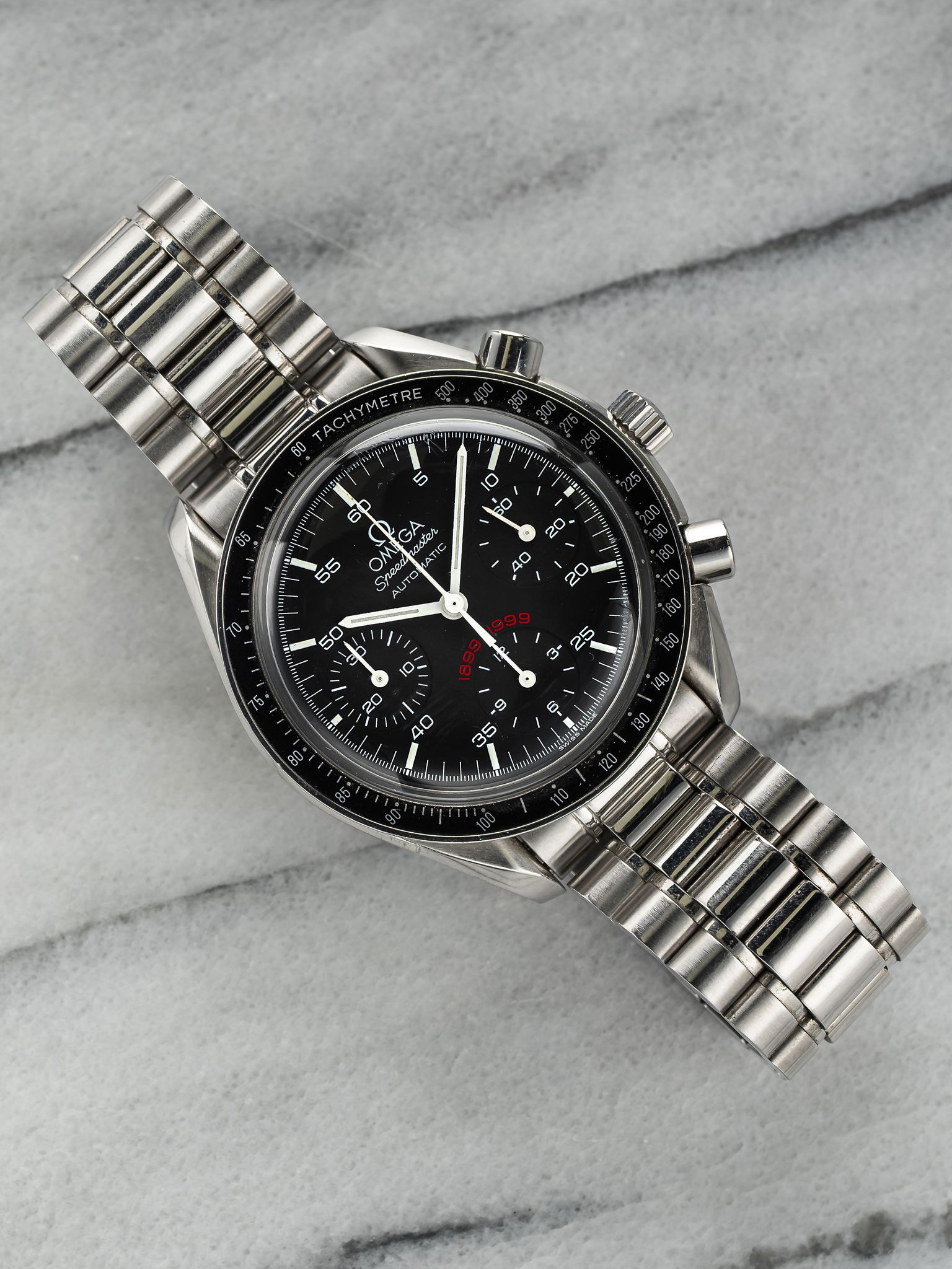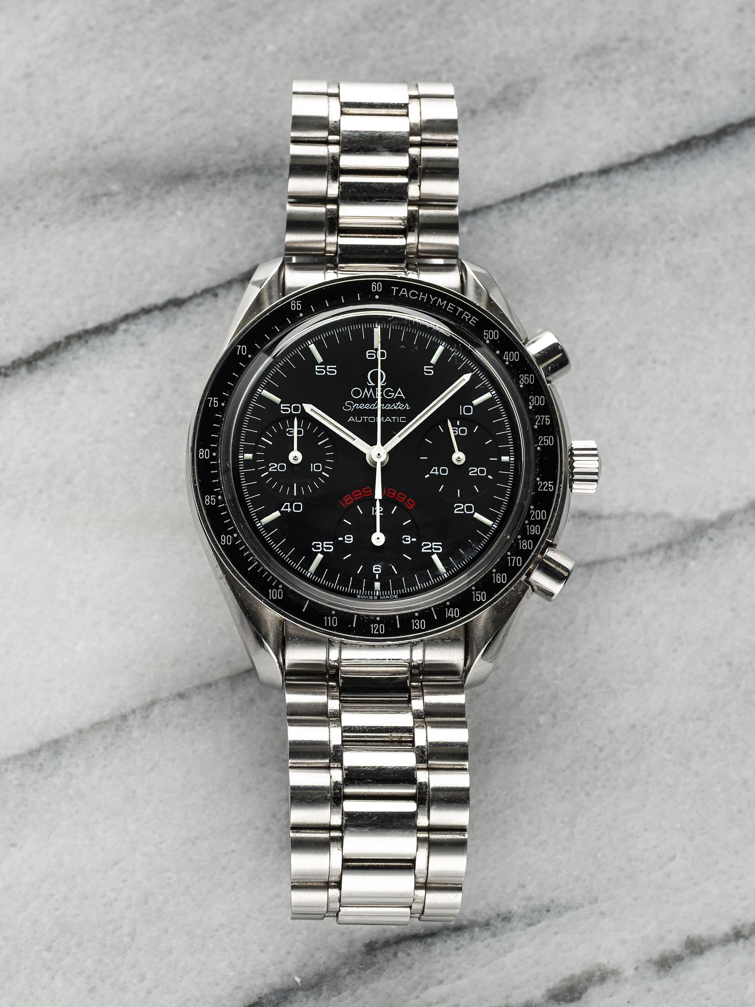 Here's an Omega Speedmaster automatic chronograph reference number 3510 with a black dial from 1999. Limited edition, issued 0548/1999, this Speedmaster marks the 100th year anniversary for a sporting event in Milan. Keeps great time and is fully functional. Measurements include a 39mm case and 18mm lug width. On its original Omega stamped bracelet that fits up to a 7.25 inch wrist. Black sub dials. Matching patina in both the hands and hour markers. The sub dials are for the seconds, 30 minute track, and 12 hour track. Brushed finishing on the sides of the case and bracelet. All parts are original including the signed Omega crown, caseback, dial, and movement. Both the dial and case are in great cosmetic, untouched condition.