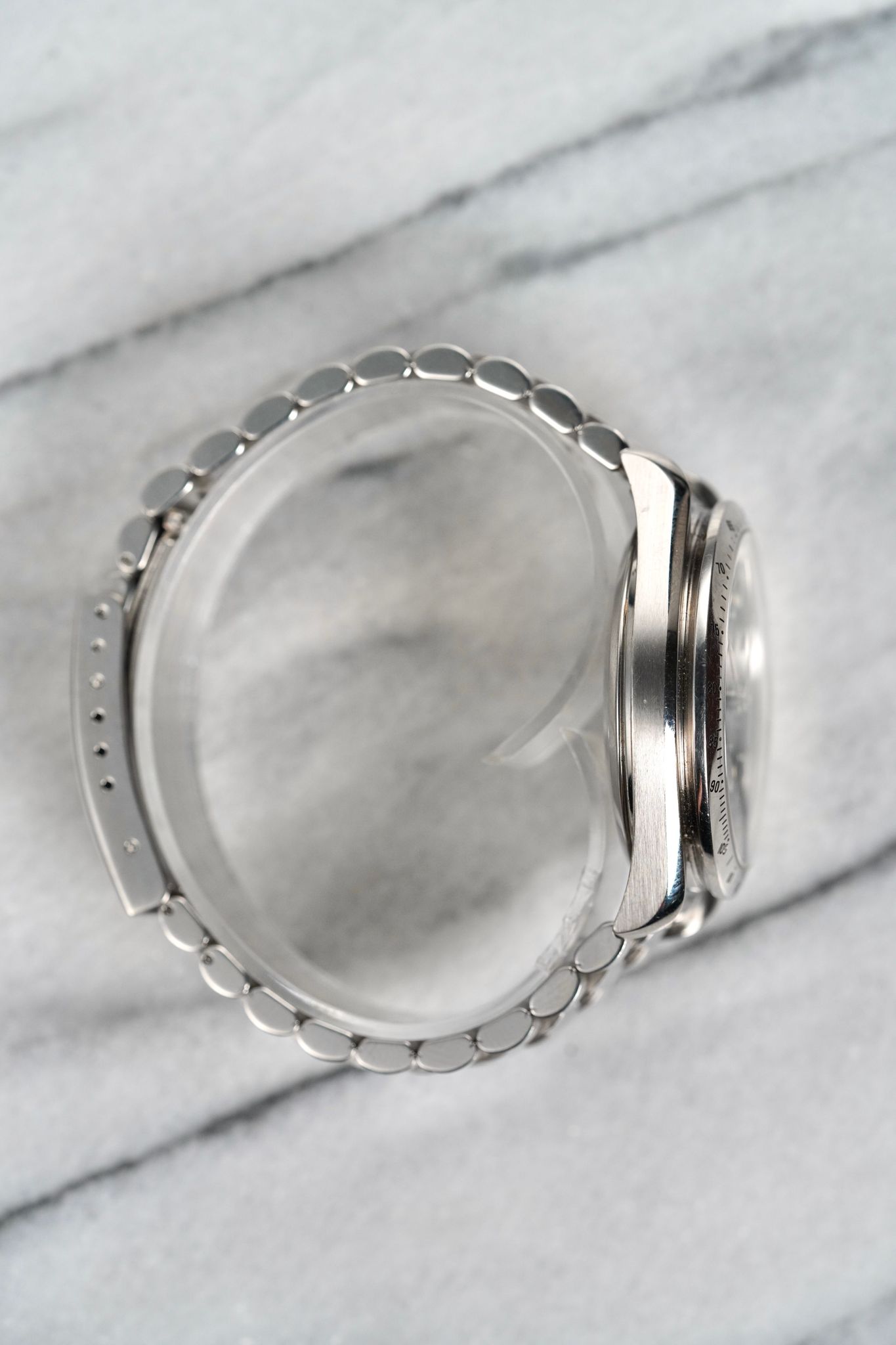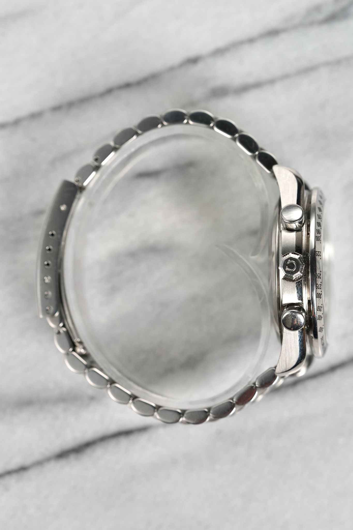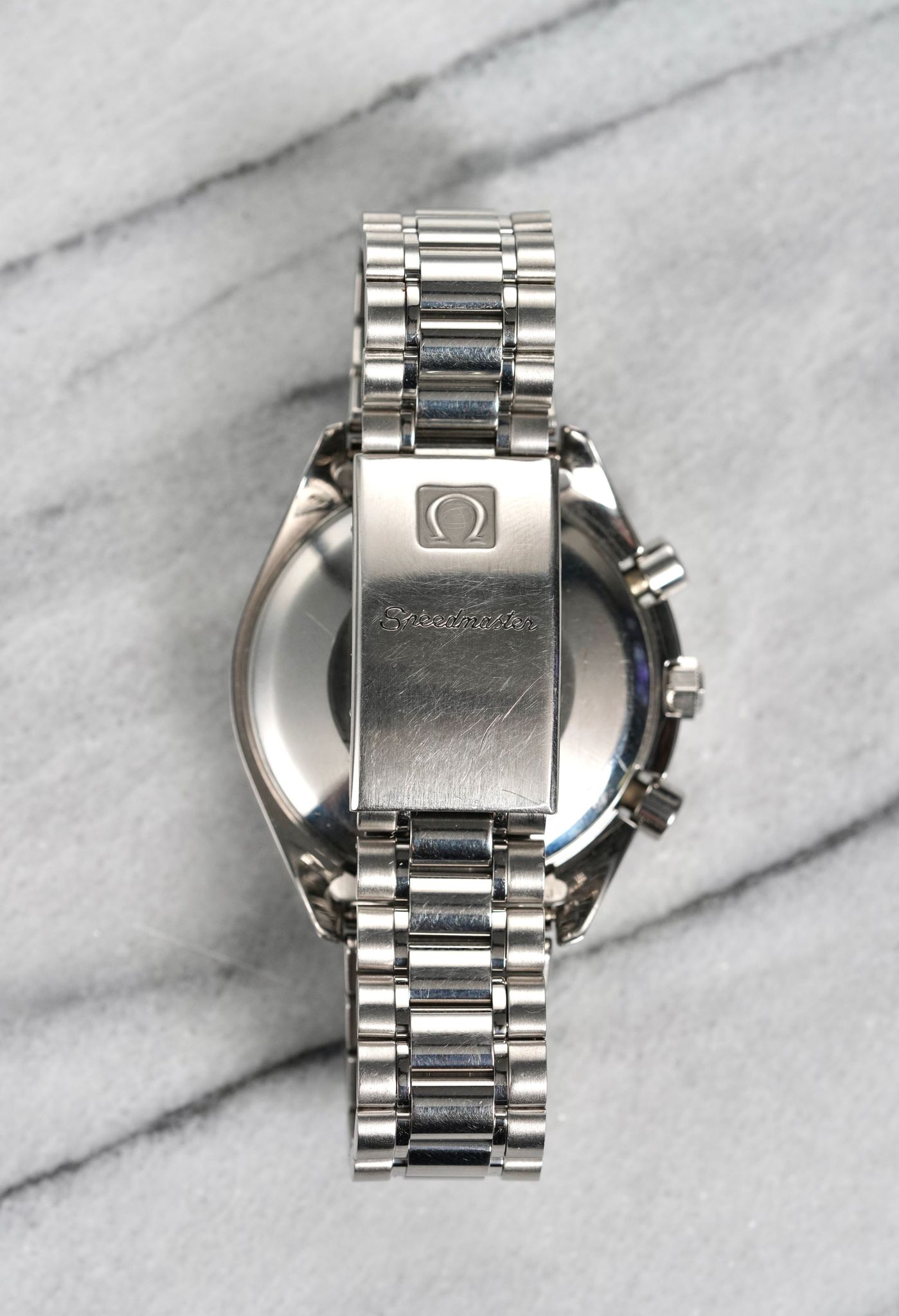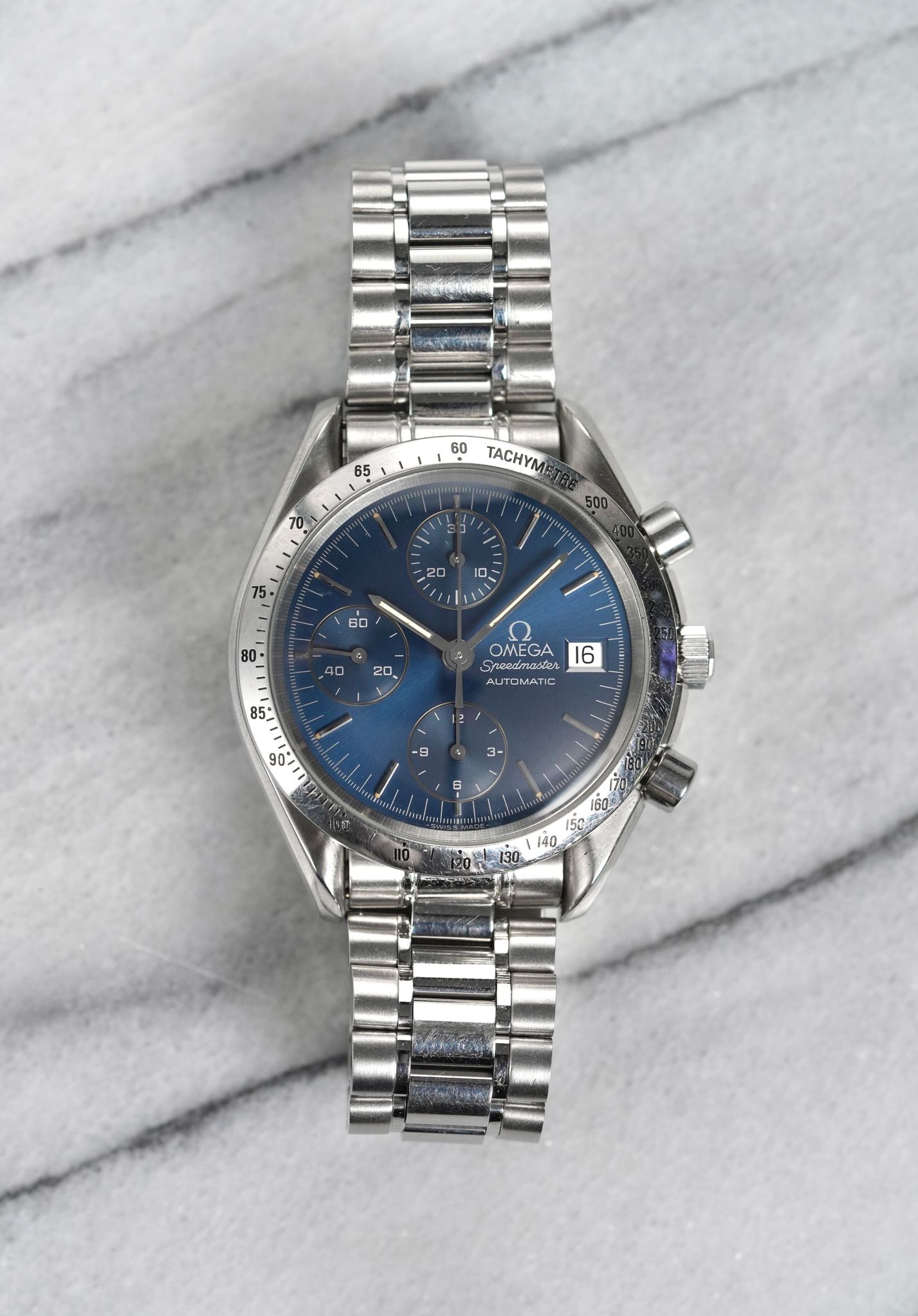 Here's an Omega speedmaster date automatic chronograph with a blue sunburst dial from the 90s. Reference number 3511.80. Keeps great time and is fully functional. Measurements include a 39mm case size and 18mm lug width. On its original Omega stamped bracelet that fits up to a 7.25 inch wrist. Time, chronograph, and quickset date function at 3 a clock. Lume in both the hands and lume plots aged to a slight cream color. Steel case and caseback. All parts are original including the signed Omega crown, caseback, dial, and movement. Both the dial and case are in great cosmetic, untouched condition.