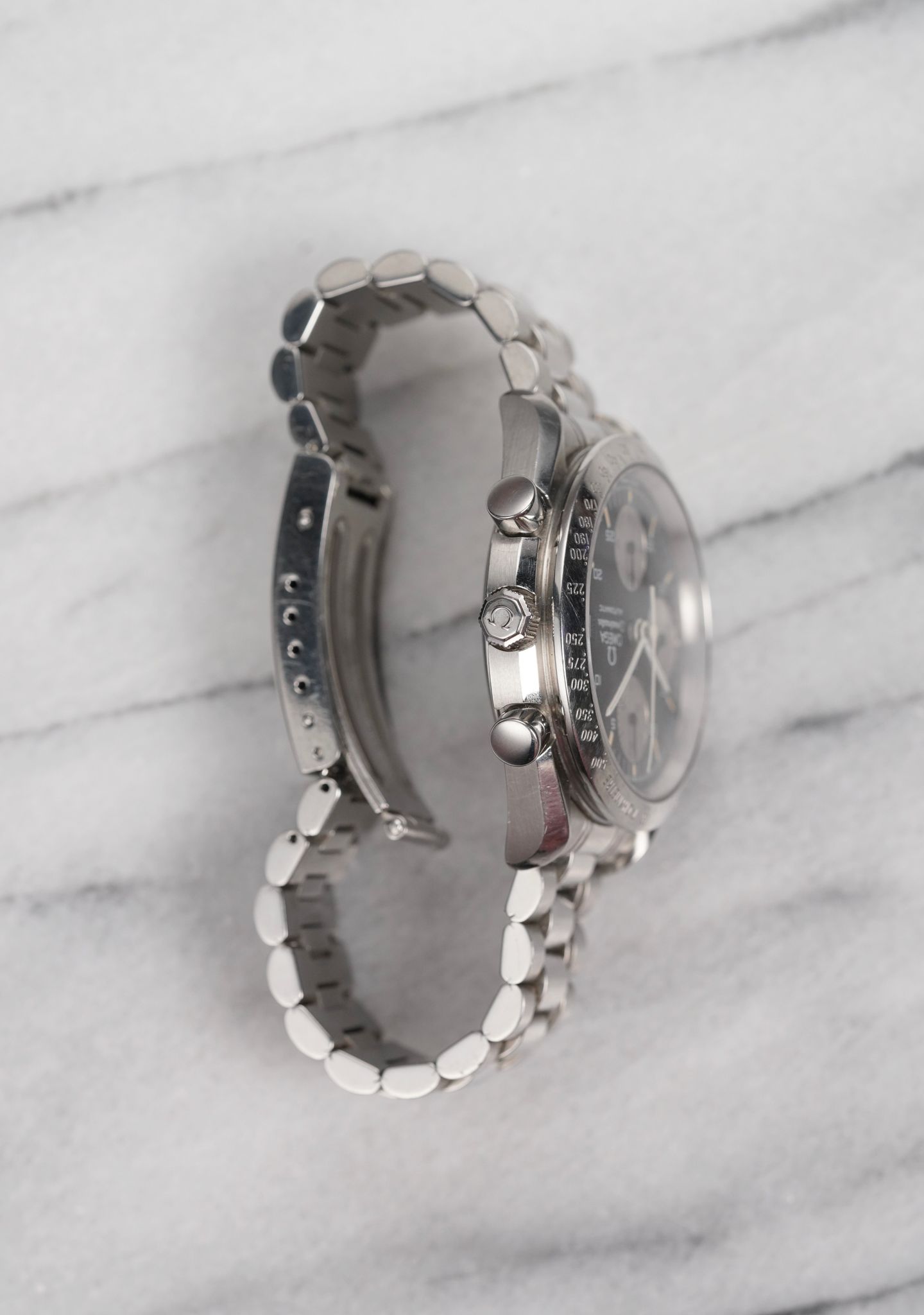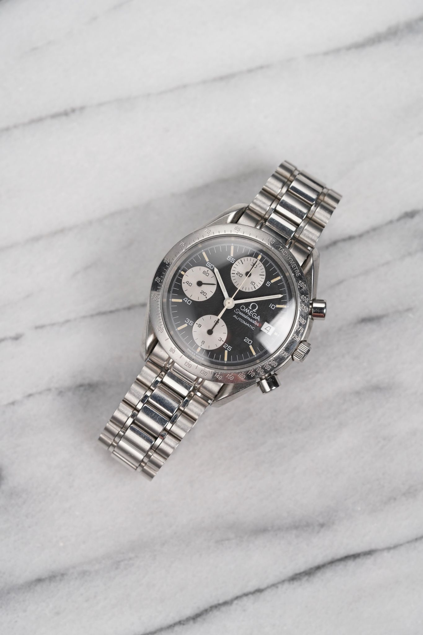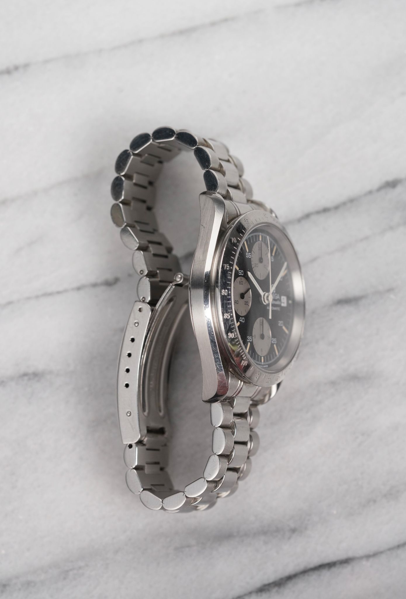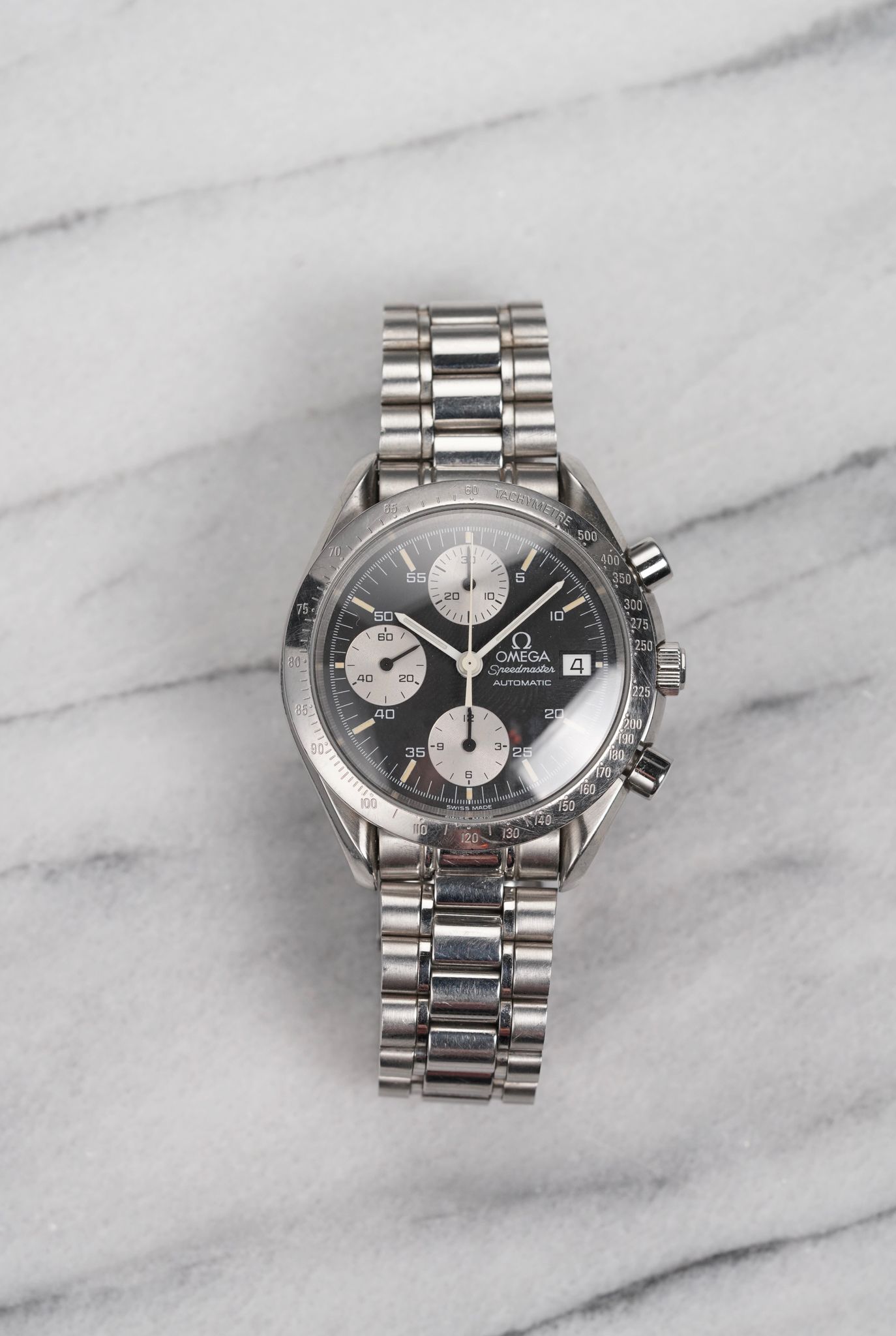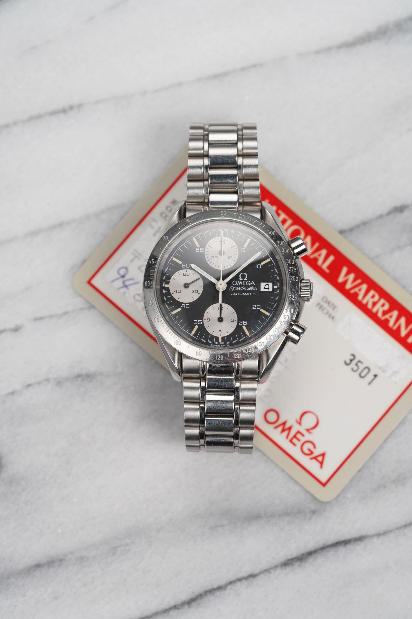 Here's an Omega speedmaster reduced date automatic chronograph reference 3511.50 with a black panda dial from the late 90s, early 2000s.Comesz with its original card. Keeps great time and is fully functional. Measurements include a 39mm case size and 18mm lug width. On its original Omega stamped bracelet. The bracelet fits up to a 7 inch wrist. Time, chronograph, and quickset date function at 3 a clock. The lume in both the hands and hour markers developed to a nice matching patina. Steel case and caseback. All parts are original including the signed Omega crown, caseback, dial, and movement. Both the dial and case are in great cosmetic, untouched condition.
