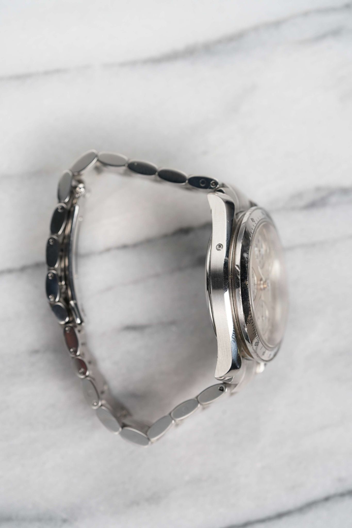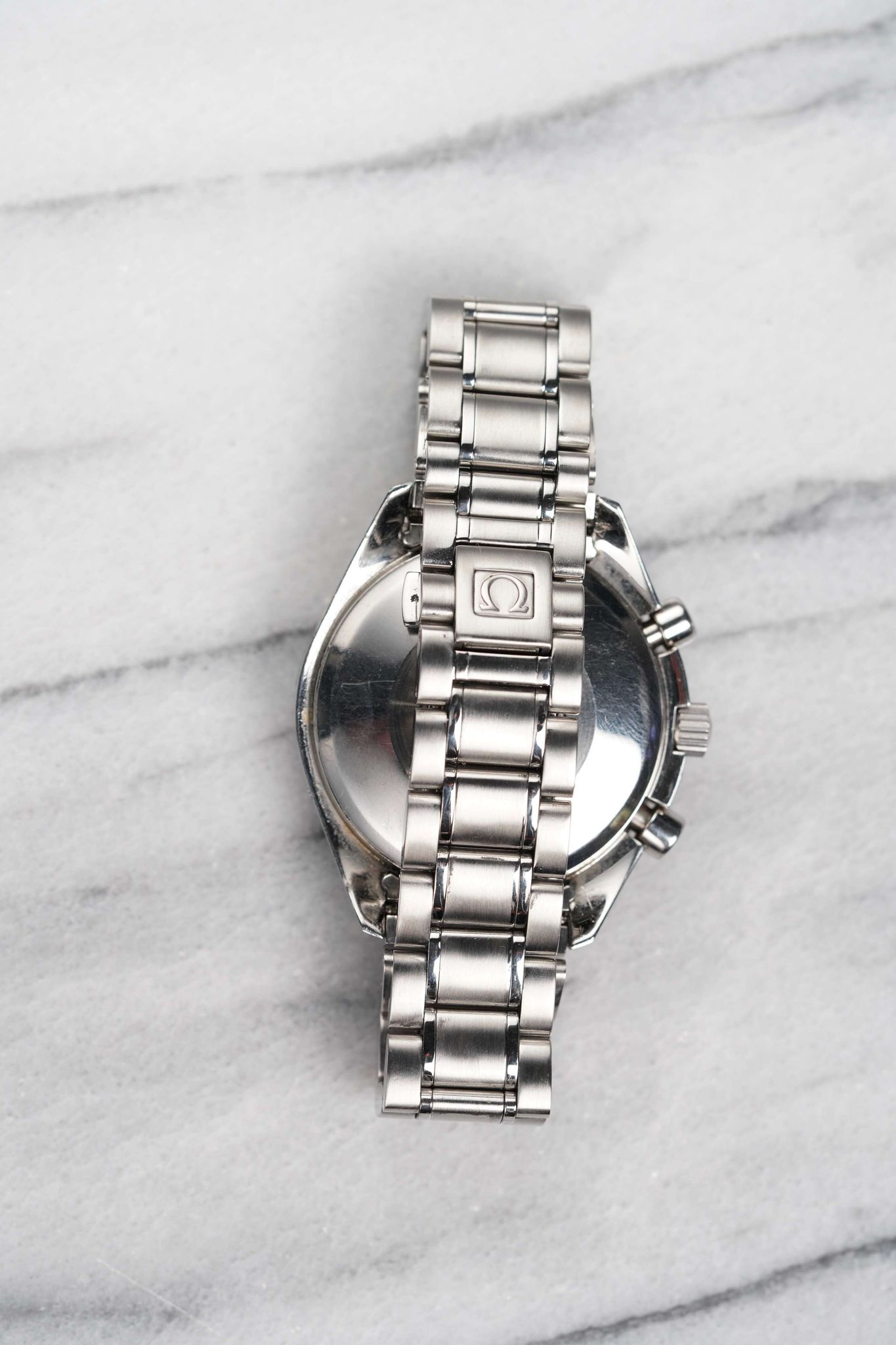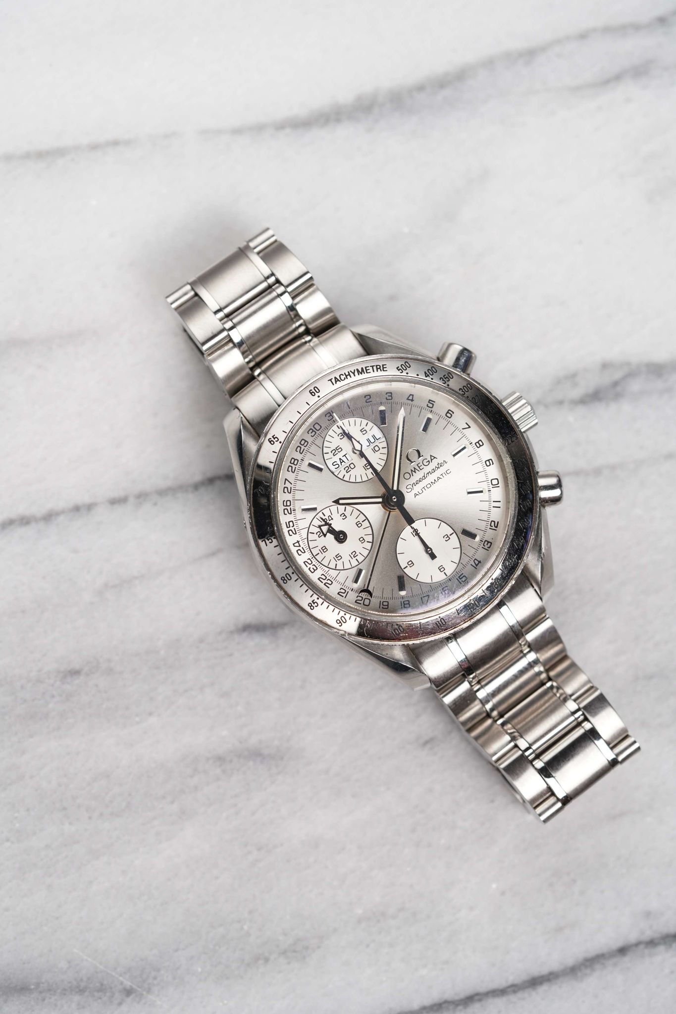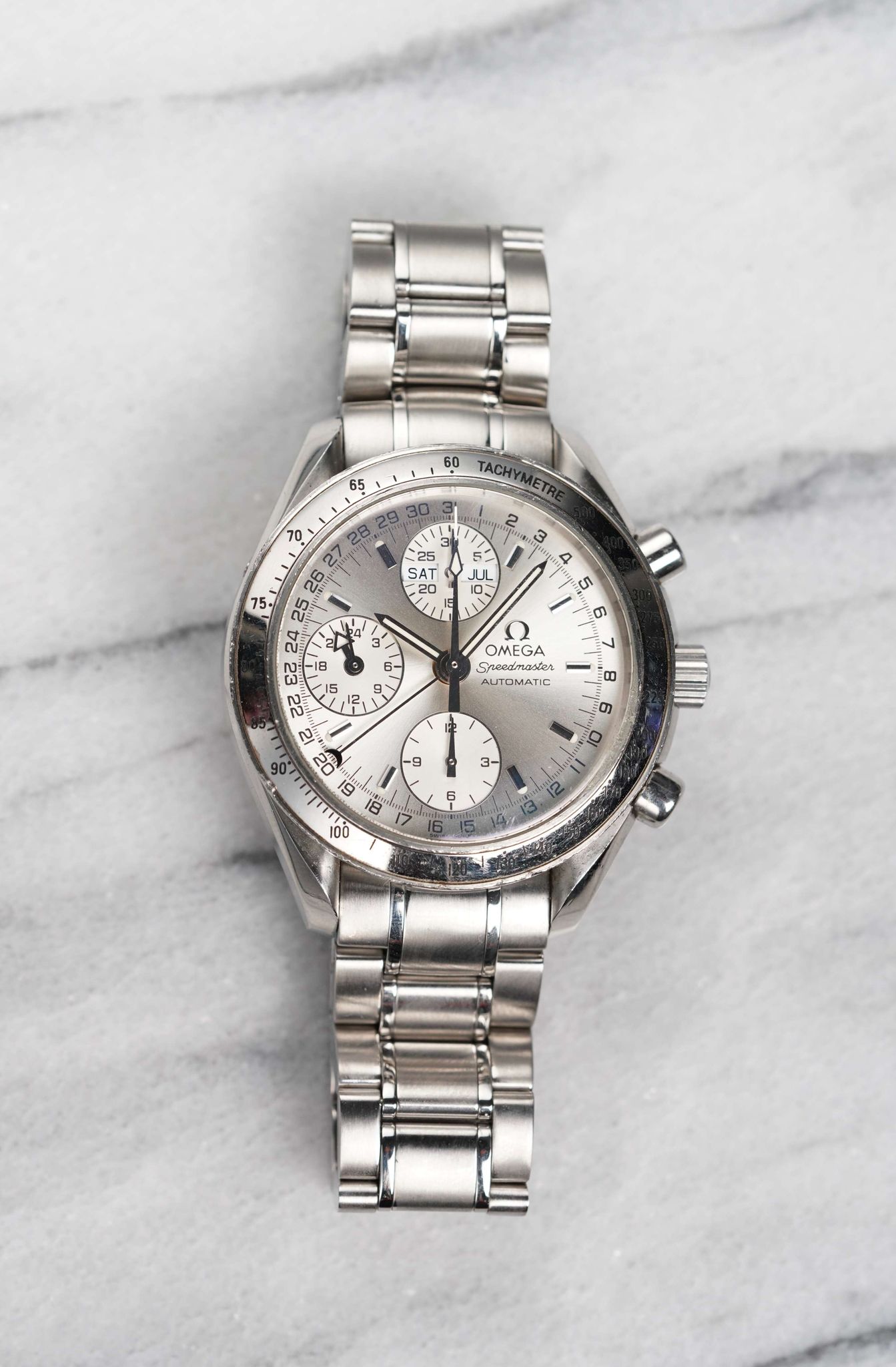 Here's an Omega Speedmaster 3523.30.00 Triple Calendar Automatic from the late 90s, early 2000s. Keeps great time and is fully functional. Measurements include a 38mm case size and 18mm lug width. It's on its original bracelet which fits up to a 7 inch wrist. Features include the day, date, month, time, and chronograph. Silver sunburst dial. To start some of the features, there's a small button on the left side of the case. Steel case and caseback. All parts are original including the signed Omega crown, dial, caseback, and movement. Both the dial and case are in great cosmetic, untouched condition.