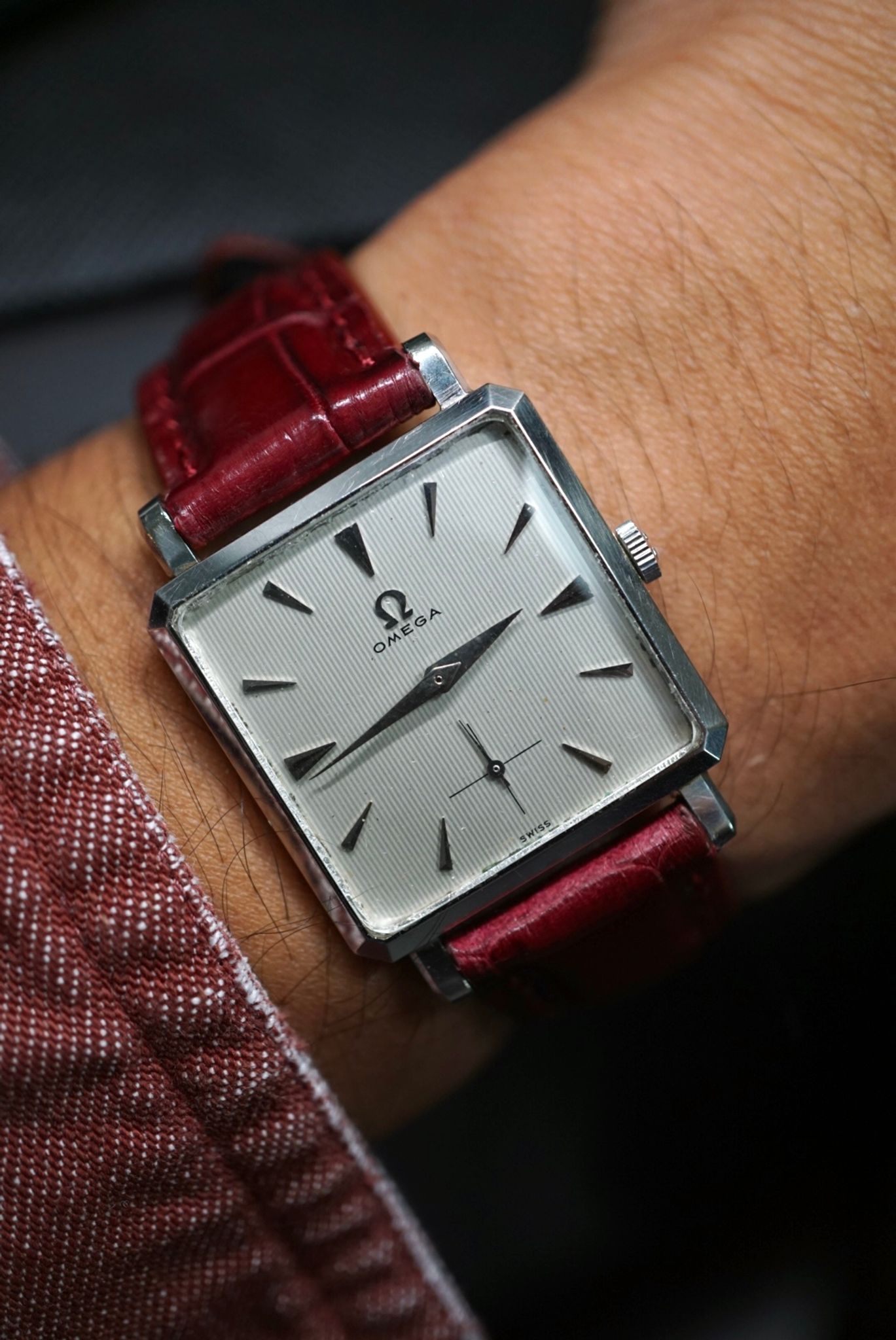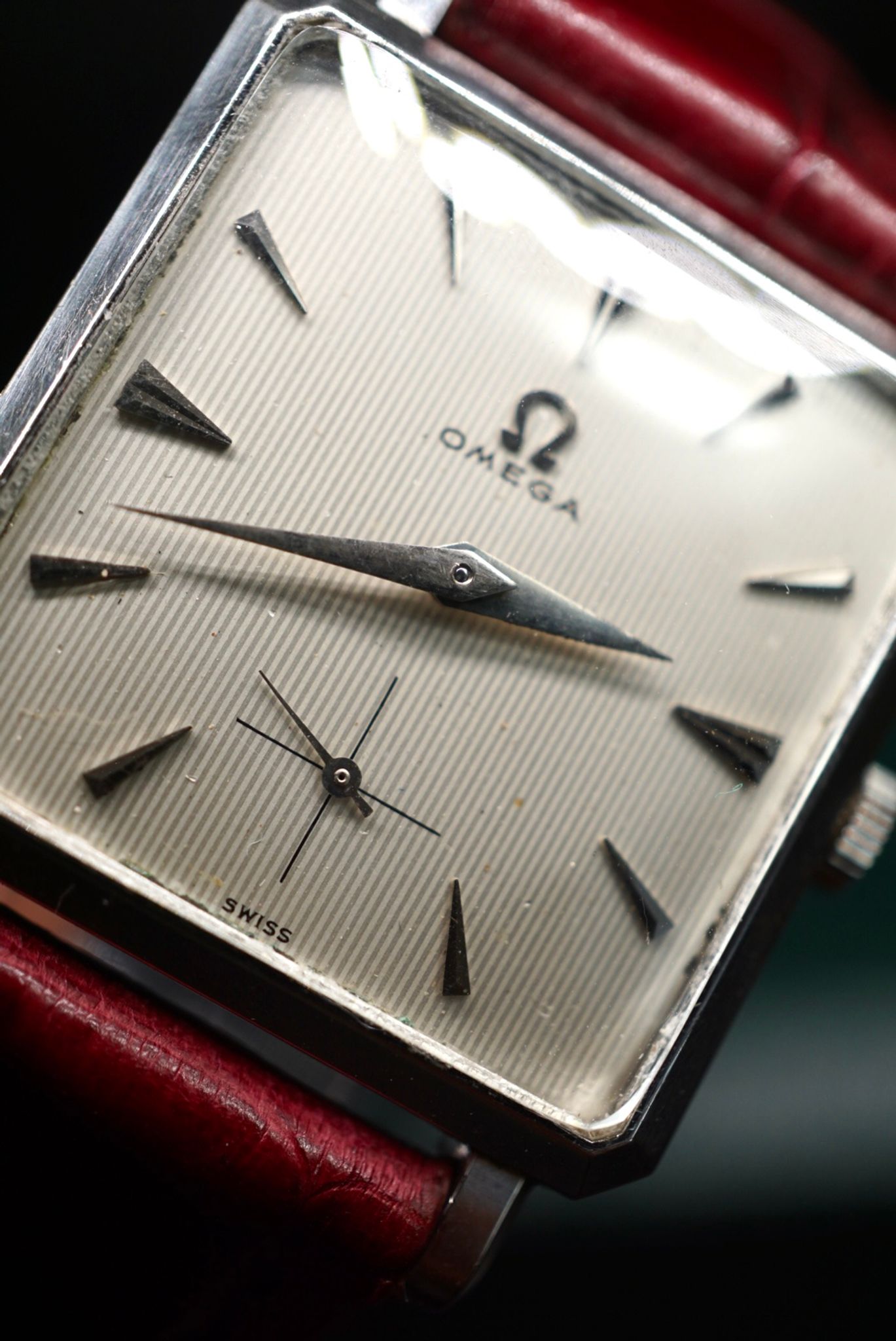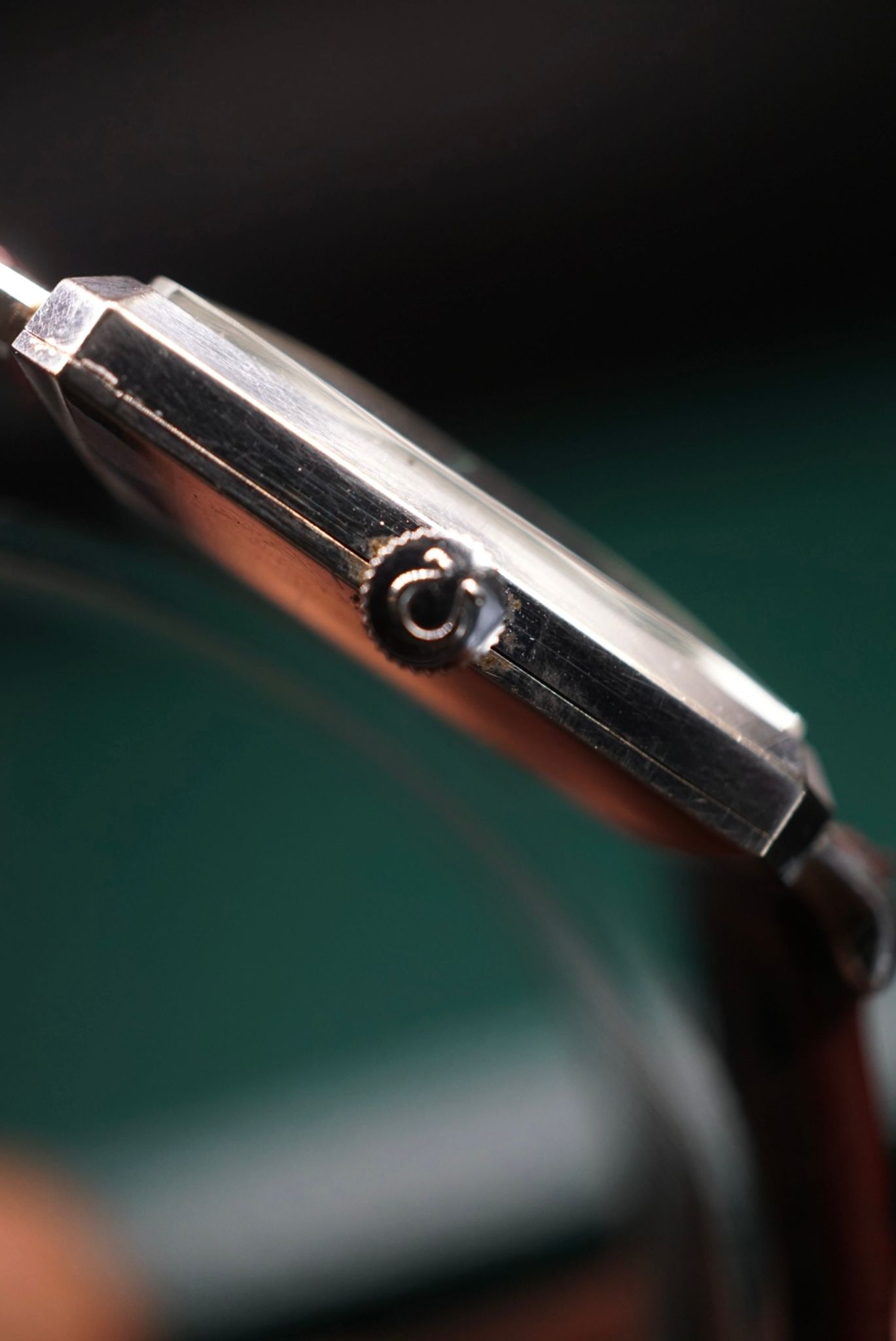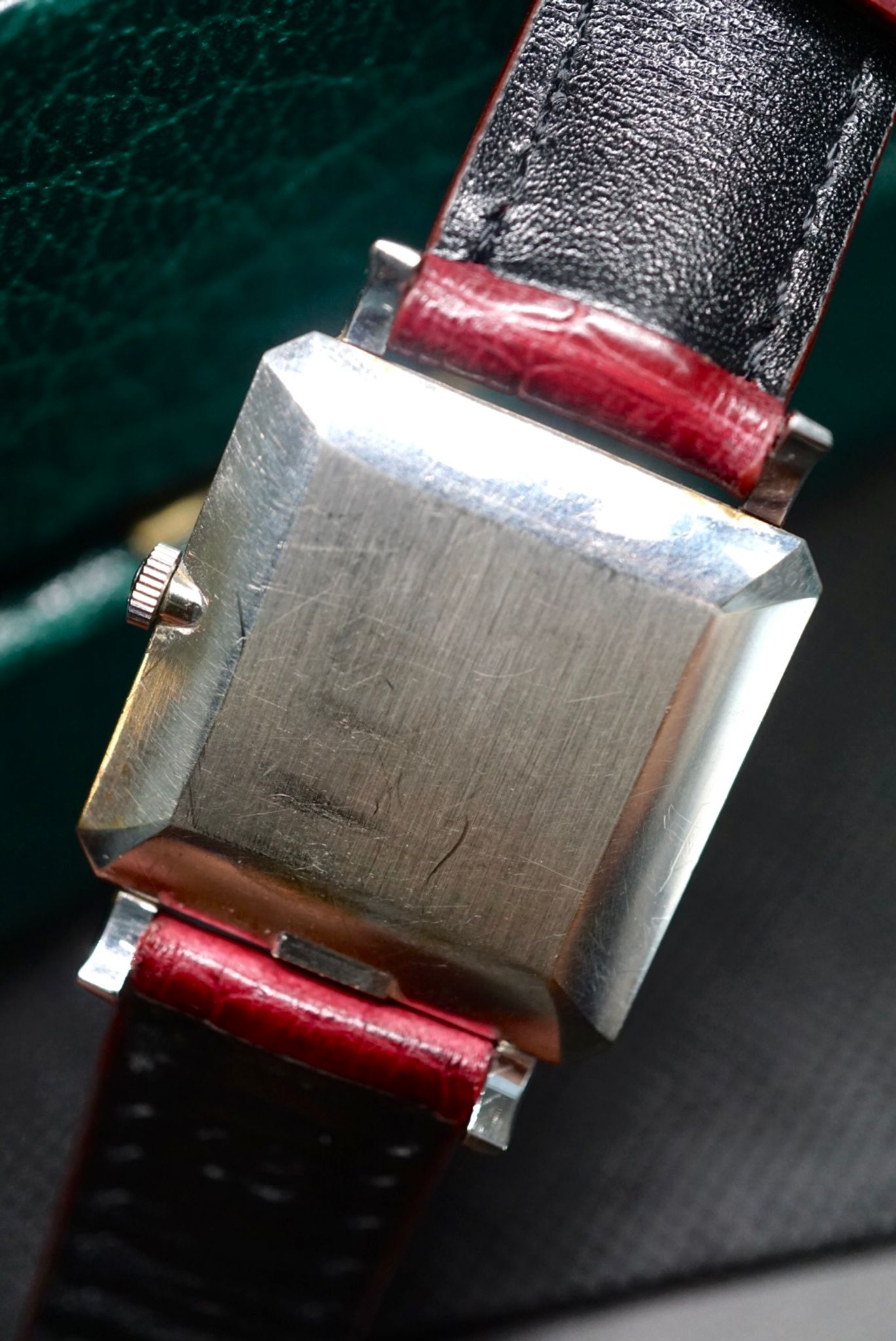 Lovely Omega tank in 14-carat white gold. The case on this one is very sharp with visible faceted lugs and a non-polished case back, the dial has a tapestry-like cream dial. Powered by cal. 302 manual wind dating back to 1956. Top condition and a great value for a solid white gold piece from that era.