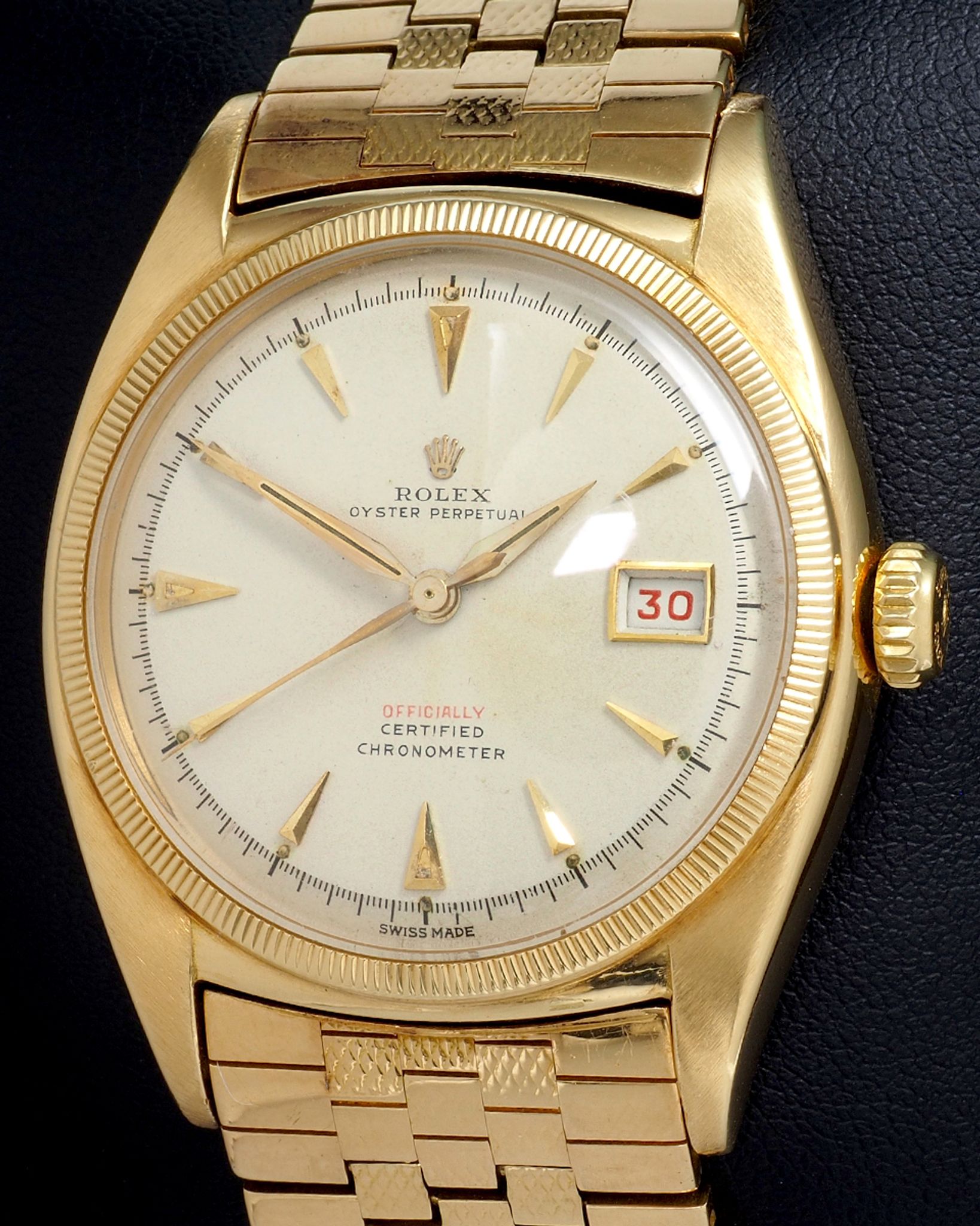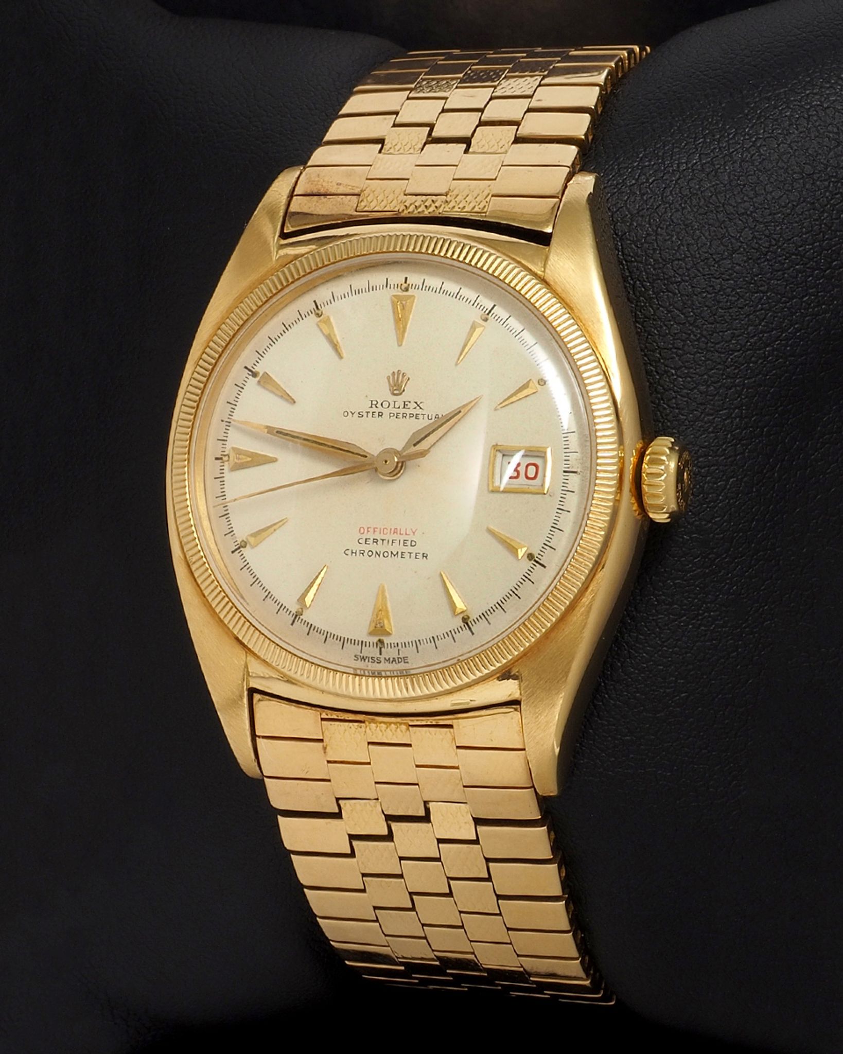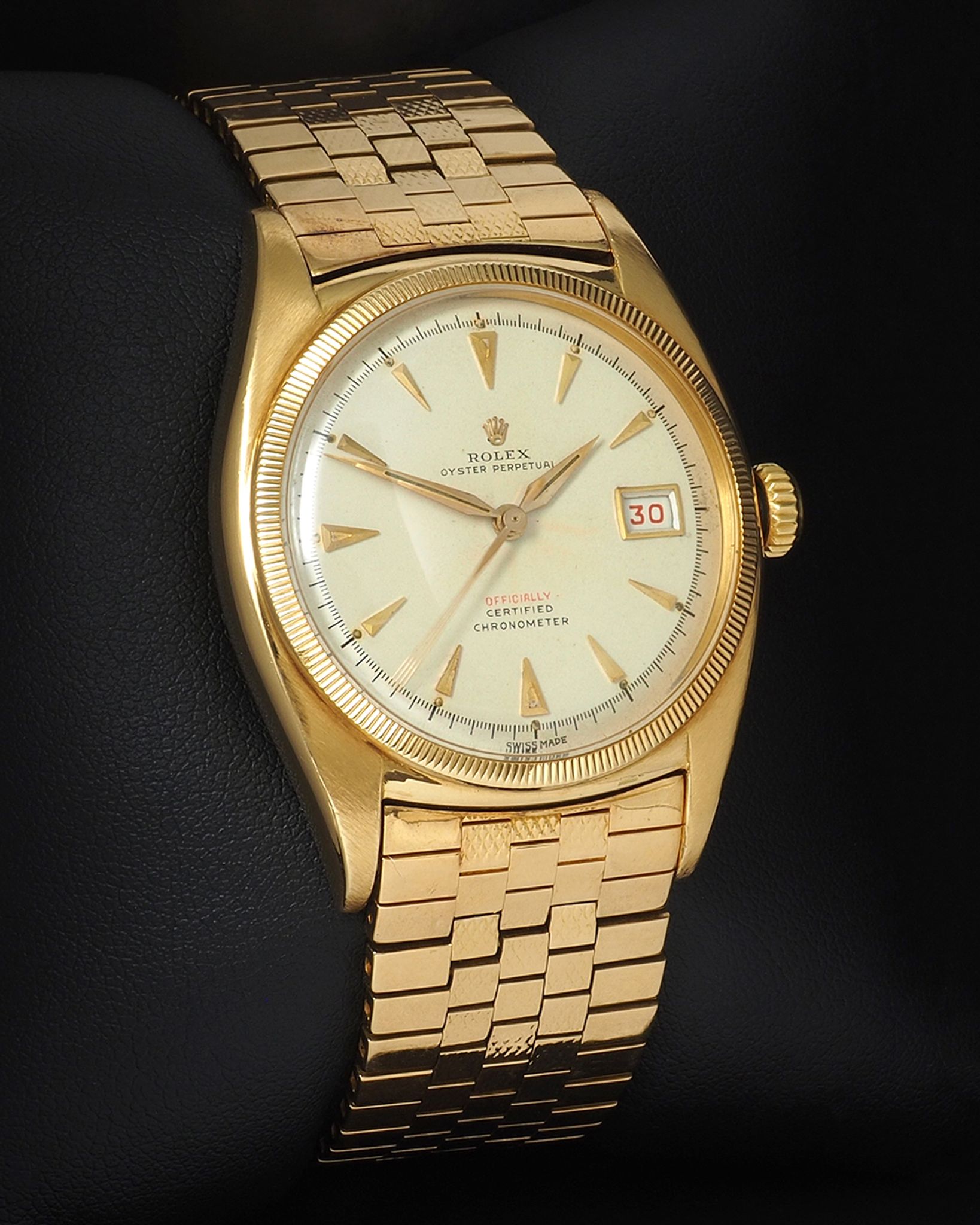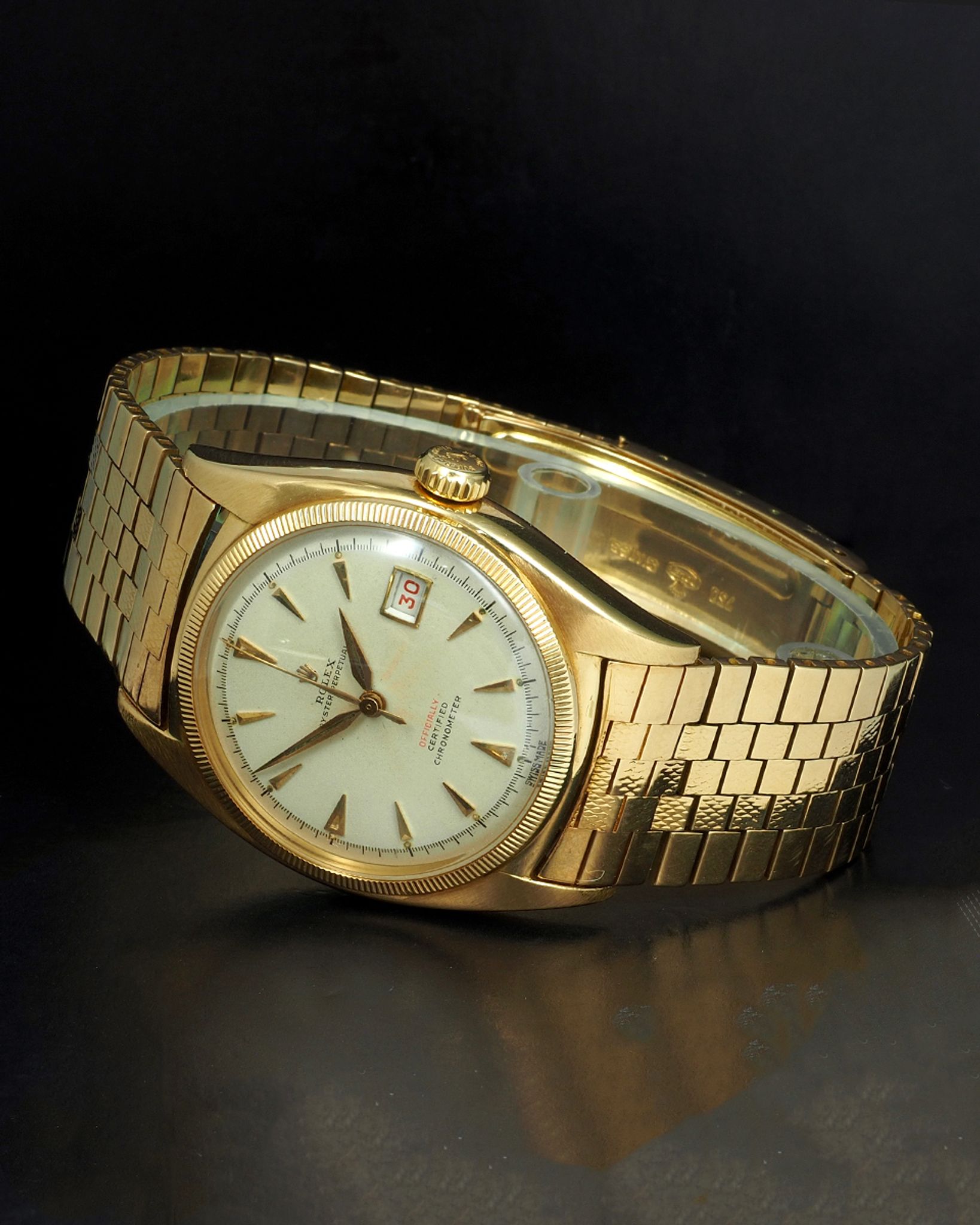 Charming vintage Rolex Datejust reference 6105 in yellow gold. Manufactured in 1951 it presents the early OCC “Officially Certified Chronometer”. The dial presents sandwich indexes and creamy white patina, the word “Officially” is in red a rare feature that is found only on early OCC 1950s watches, all red date disc and “millerighe” bezel and further embellished by a superb brick Rolex bracelet with florentine finish on the central links. The watch comes with the original box, chronometer certificate and warranty.