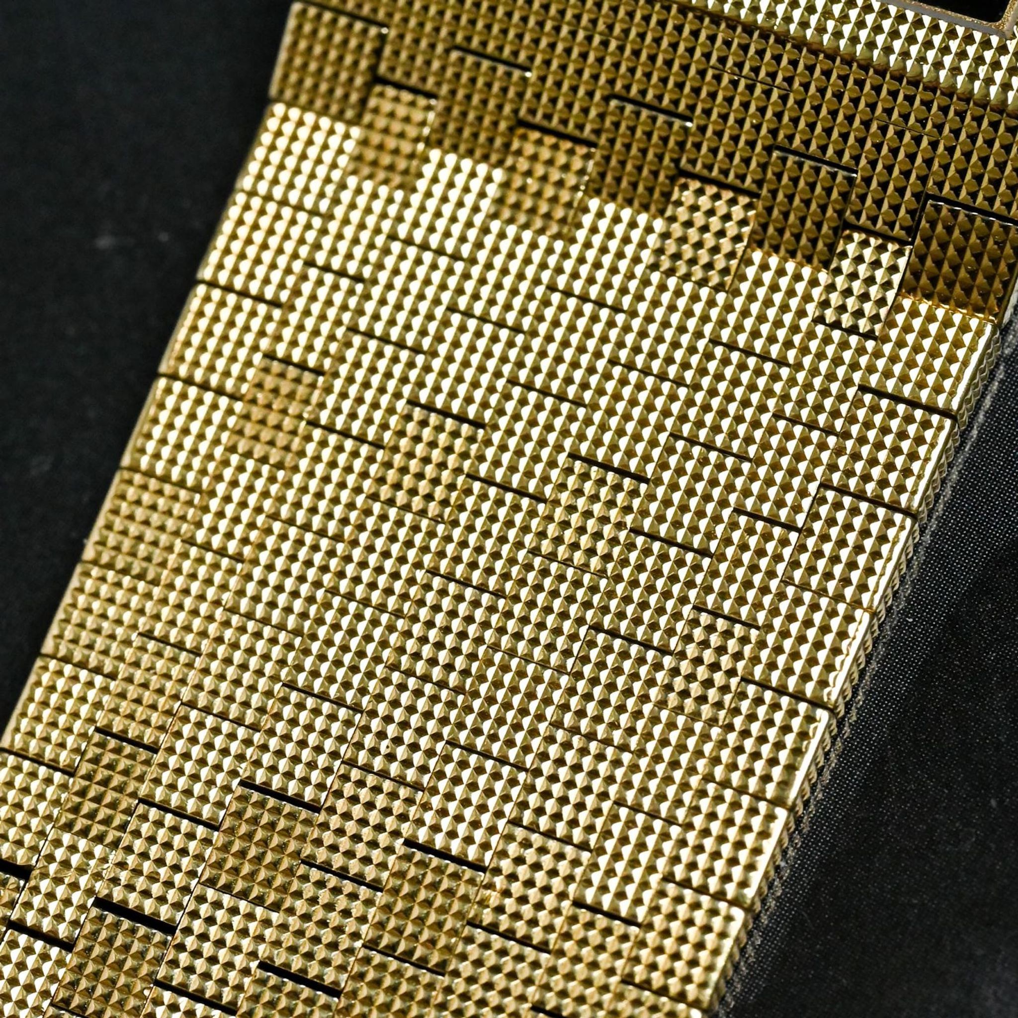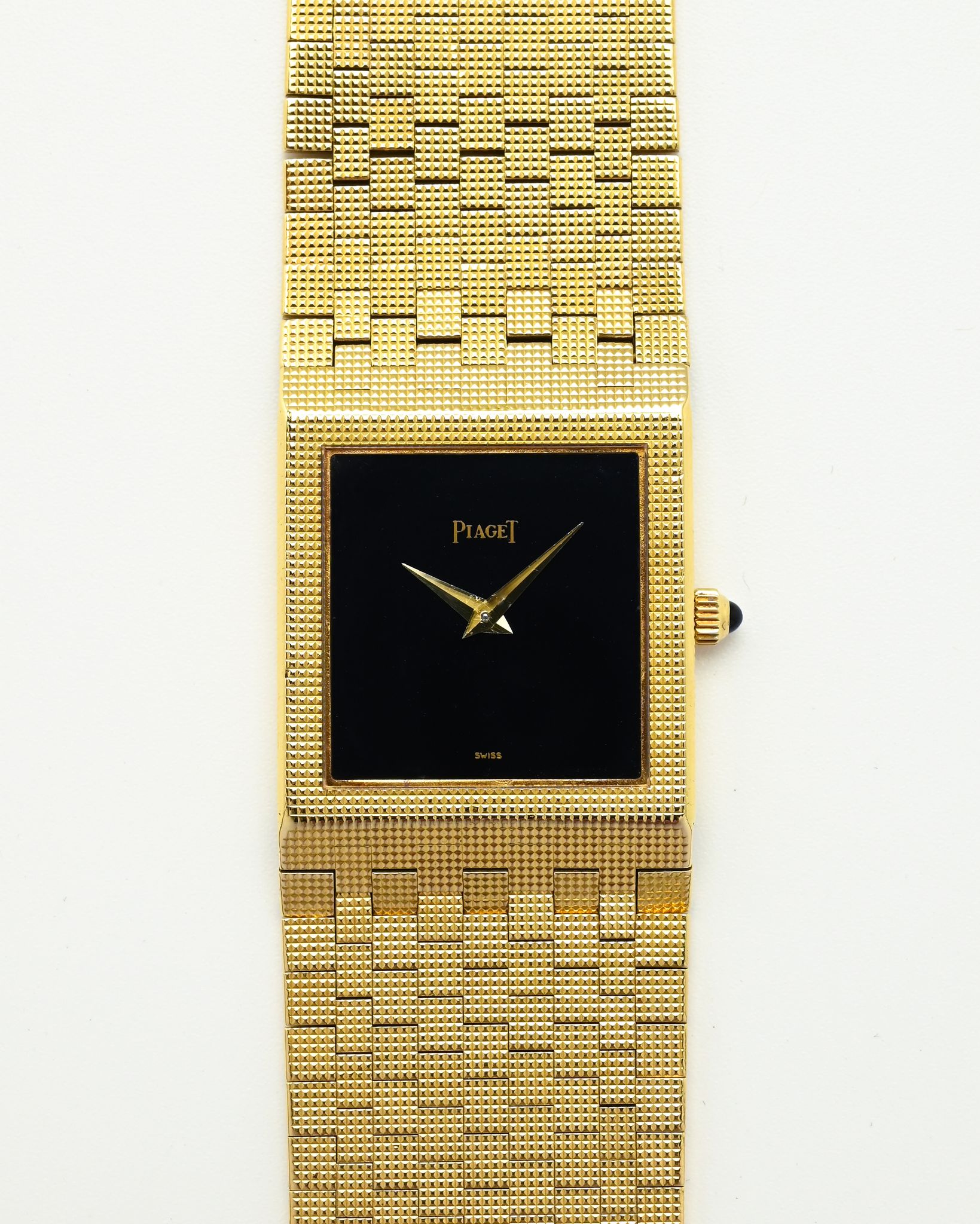 This model, dating from 1978 and delivered in New York, features a superb onyx dial that creates a striking contrast with the yellow gold. Completely covering the case and bracelet, the “Clou de Paris” decorative motif is made up of small pyramid-shaped reliefs.