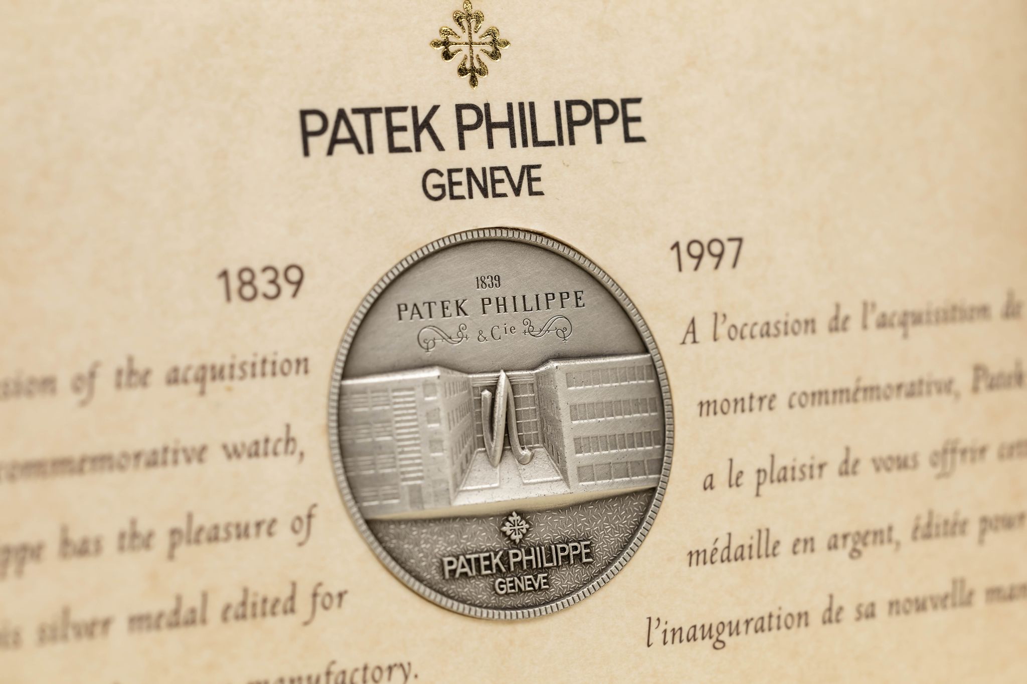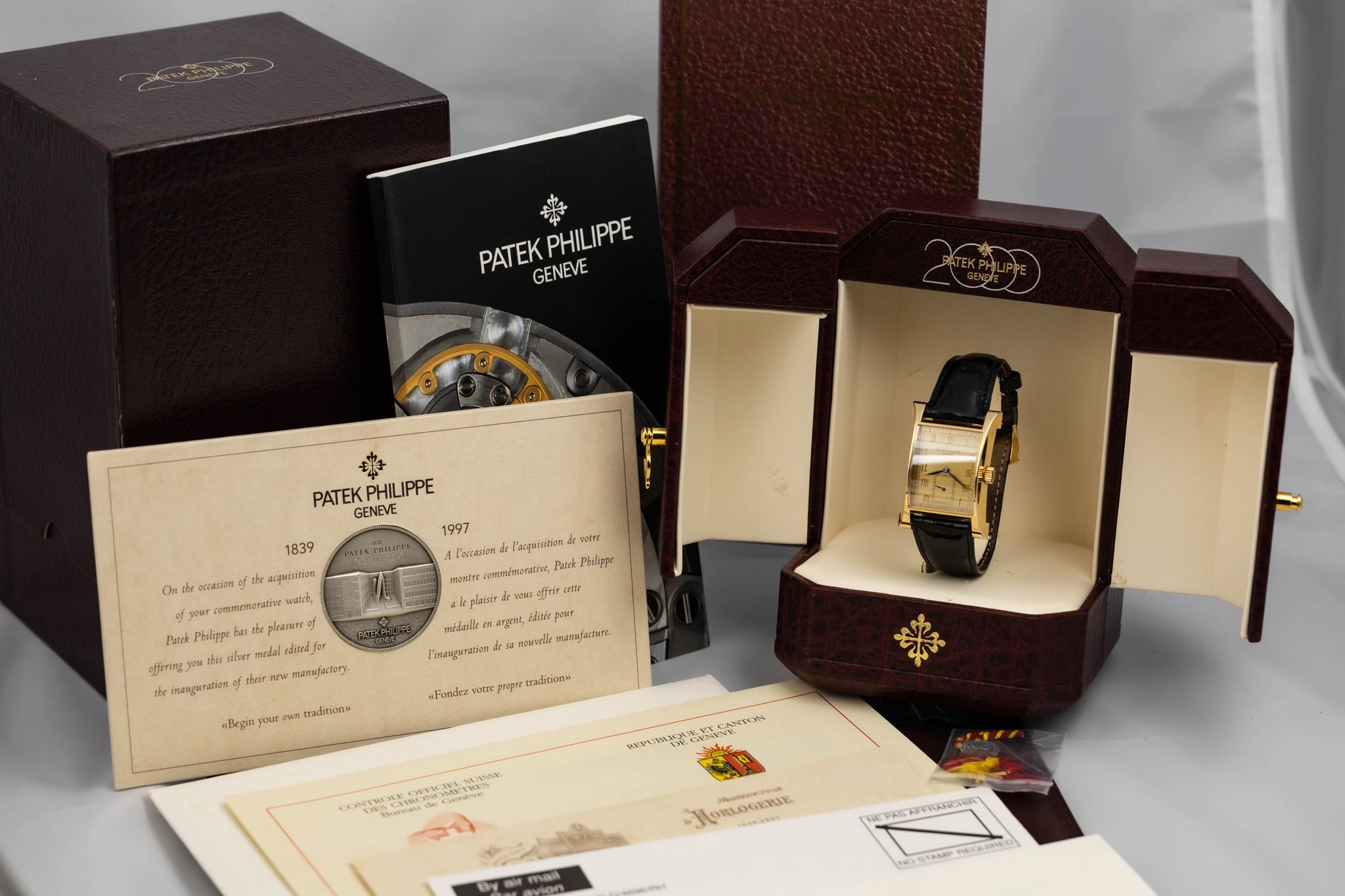 The case remains unpolished, with all hallmarks clearly visible. The s dial is in pristine condition, featuring subsidiary seconds at 6 o'clock and applied Roman numerals. This rare watch is powered by the caliber 215 manual wind movement. It comes complete with its original papers, Patek Philippe Archive, Patek strap, inner and outer boxes and commemorative coin.