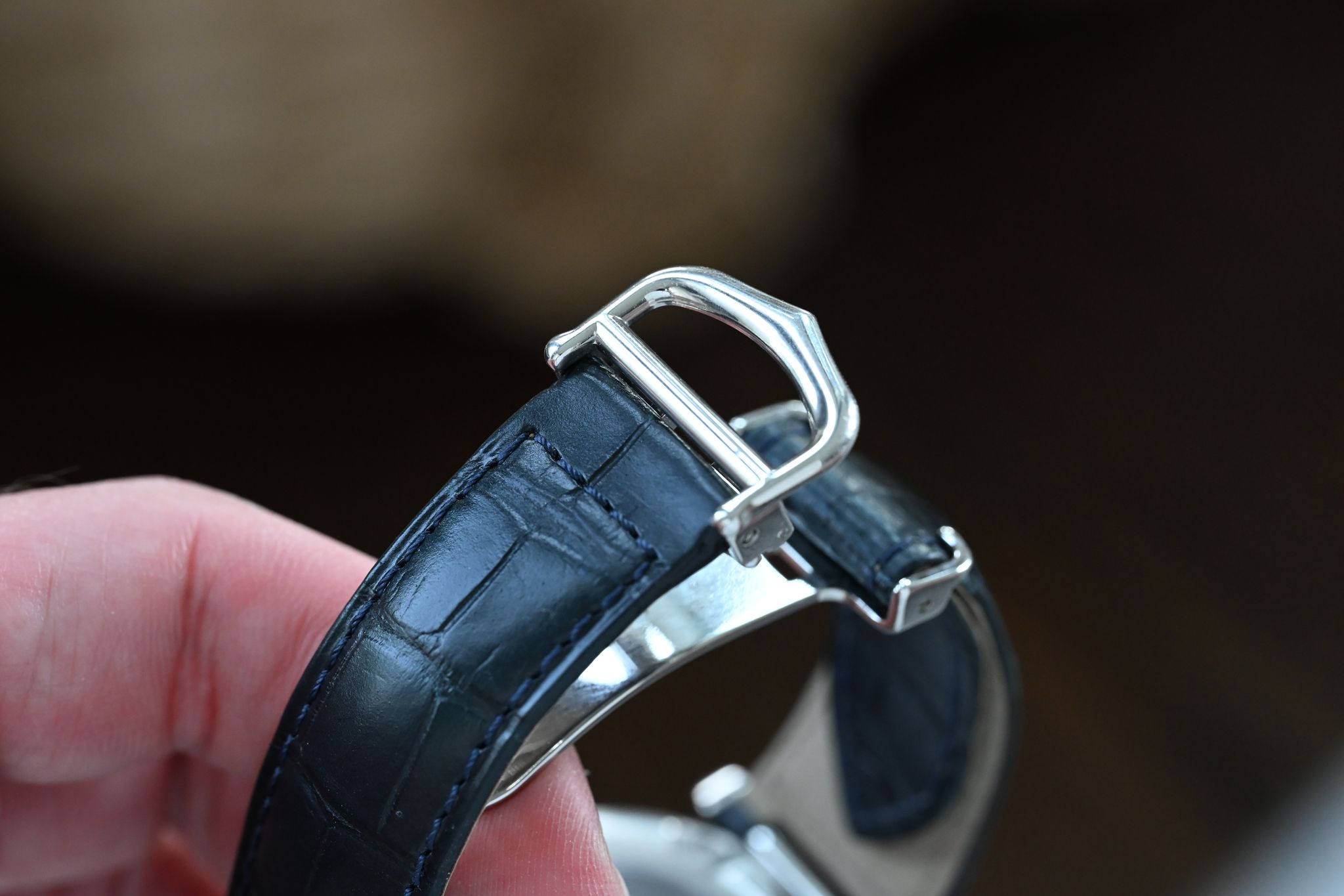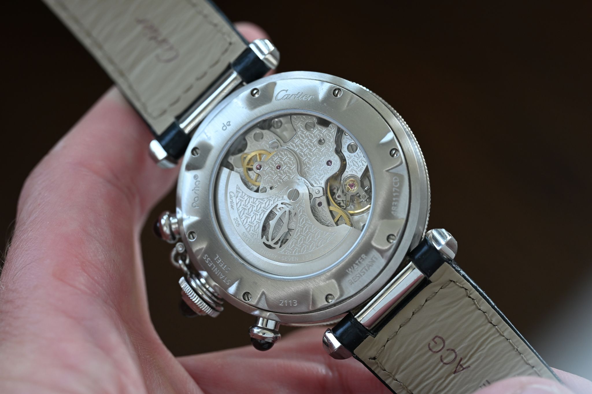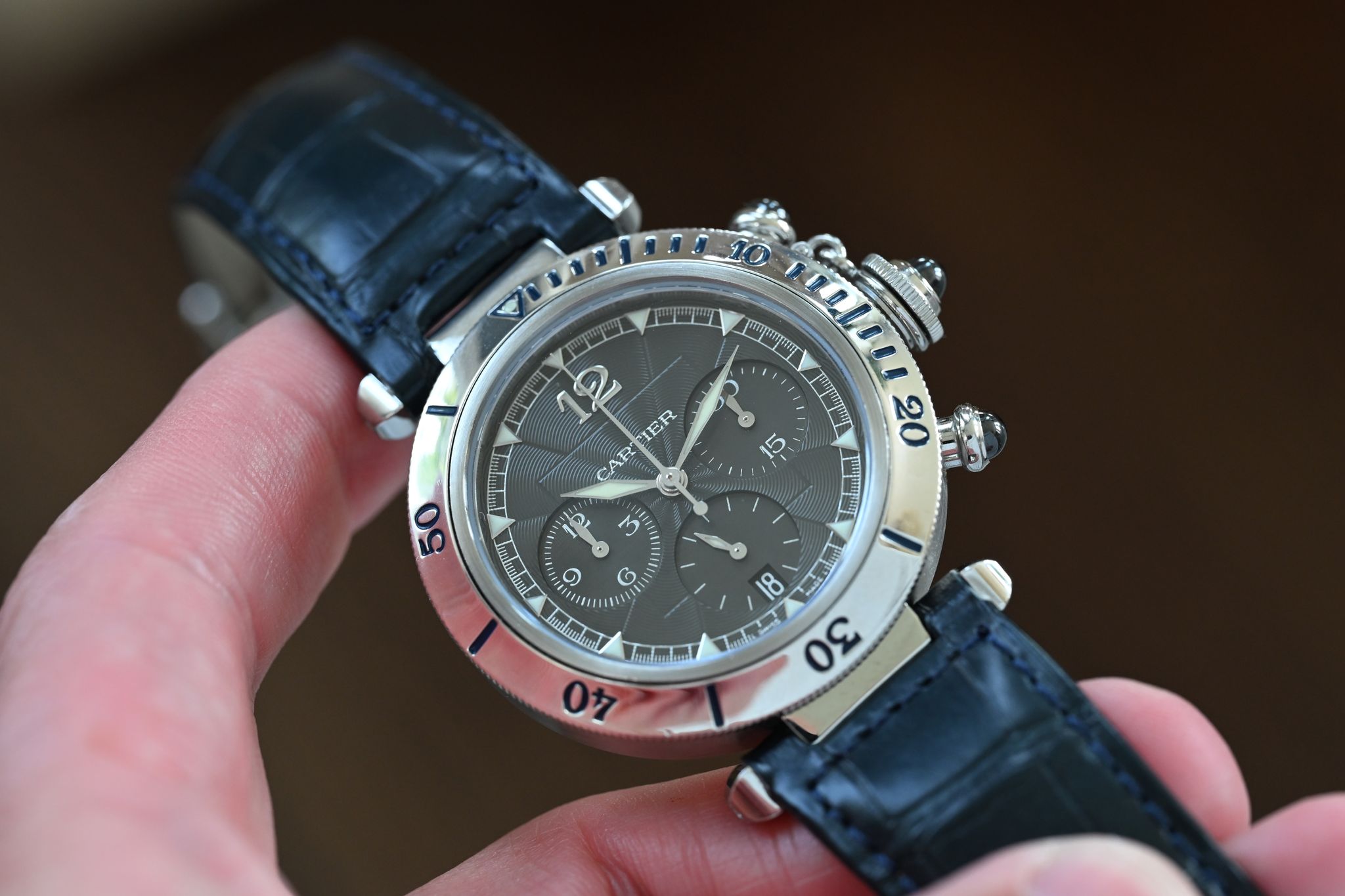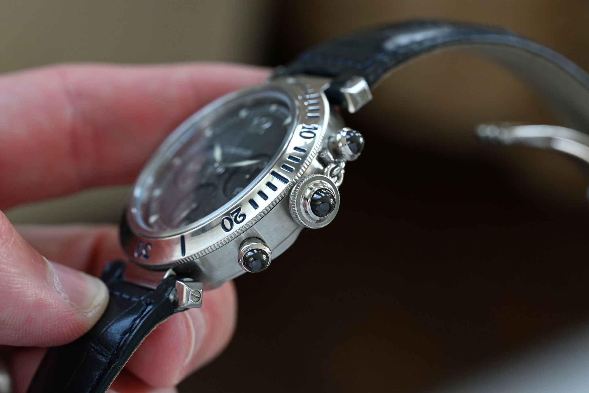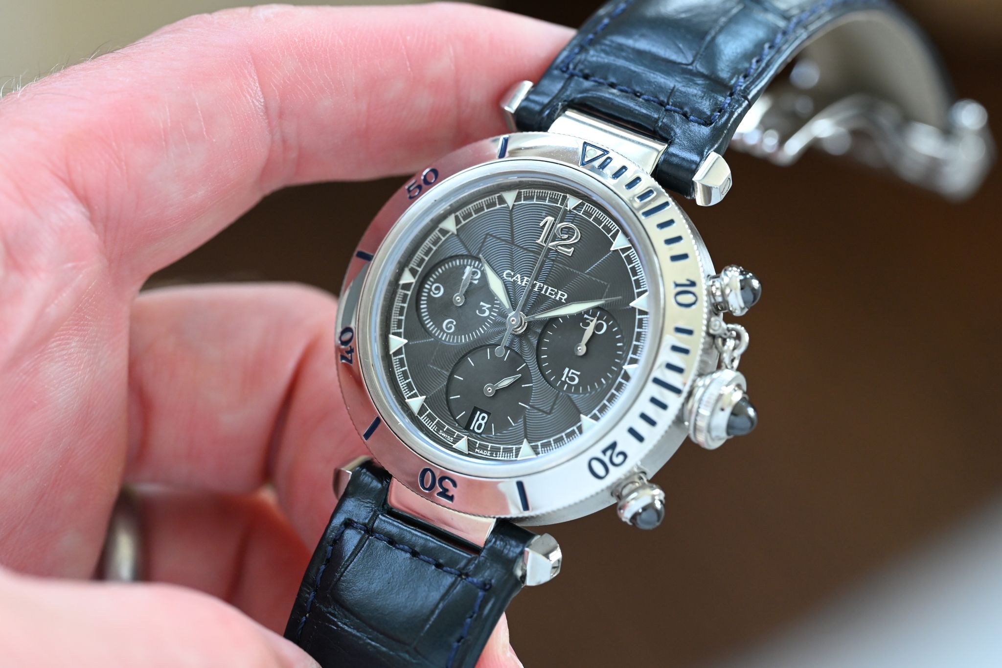 Cartier Pasha 38 Automatic Chronograph with beautiful charcoal guilloche dial, 38mm stainless steel case & exhibition case back with original strap & adjustable deployant buckle.