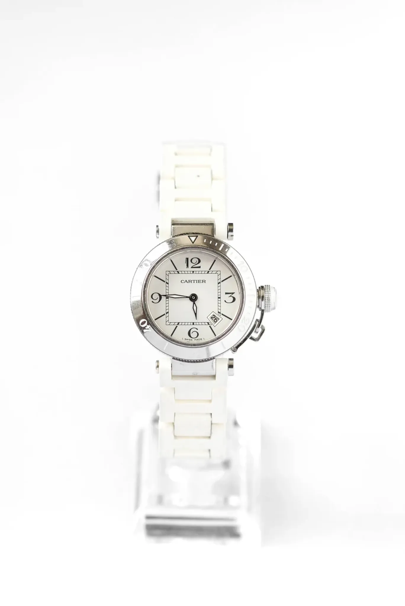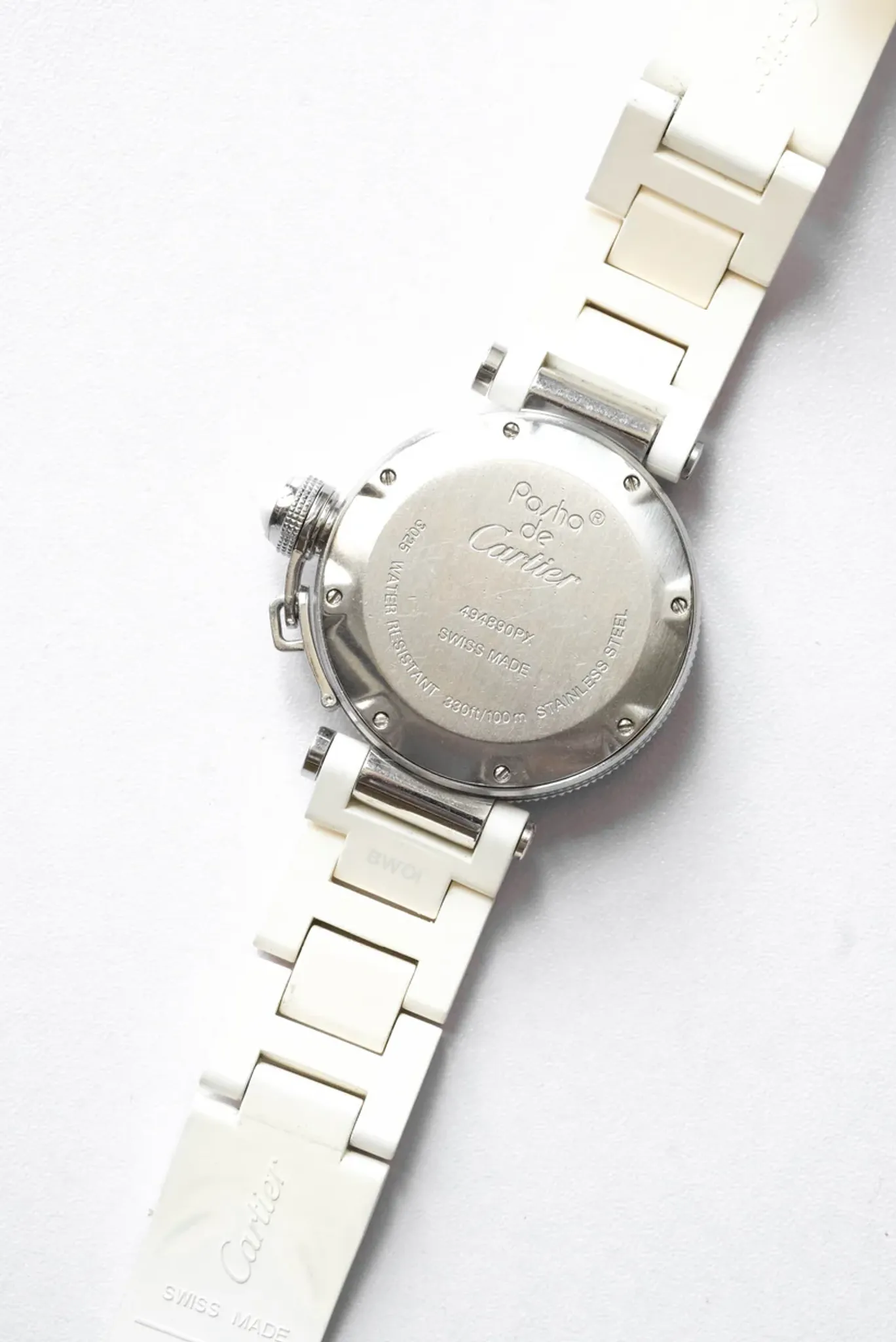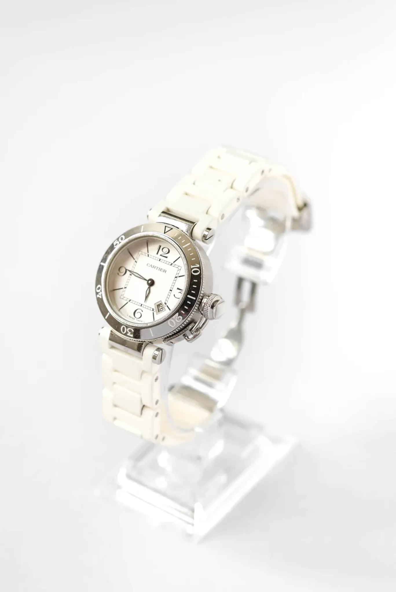 The Pasha de Cartier is the perfect watch for open sea adventures ! The Seat Lady version, as the name suggests, is particularly well-proportioned for a feminine wrist. With its 33 millimeters in diameter, it will be the sporty companion for your summers (and your winters ?). The dial of the Pasha offers easy readability and has a date function, because we all know how we lose track of date on vacation ! The white cabochon, secured by a small chain, highlights the model's water resistance. Its rubber strap with a deployant clasp is particularly comfortable in hot weather!