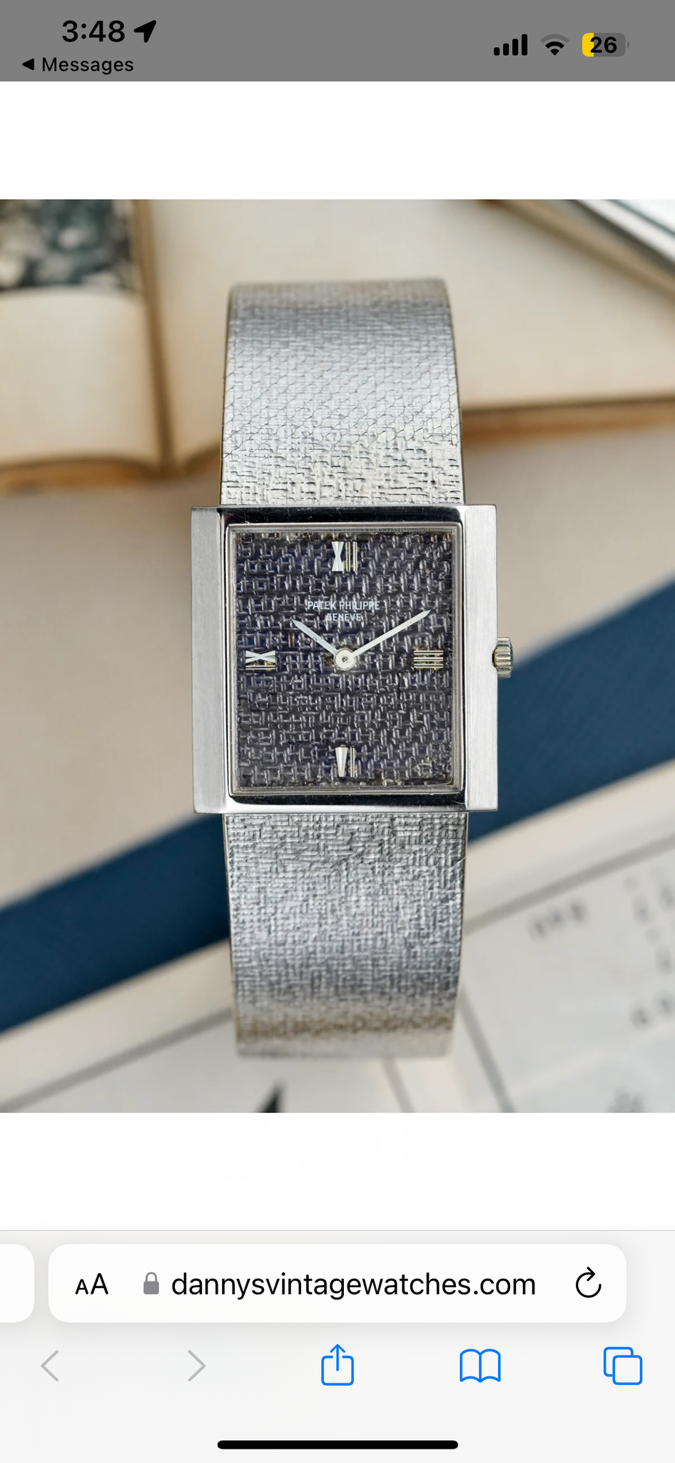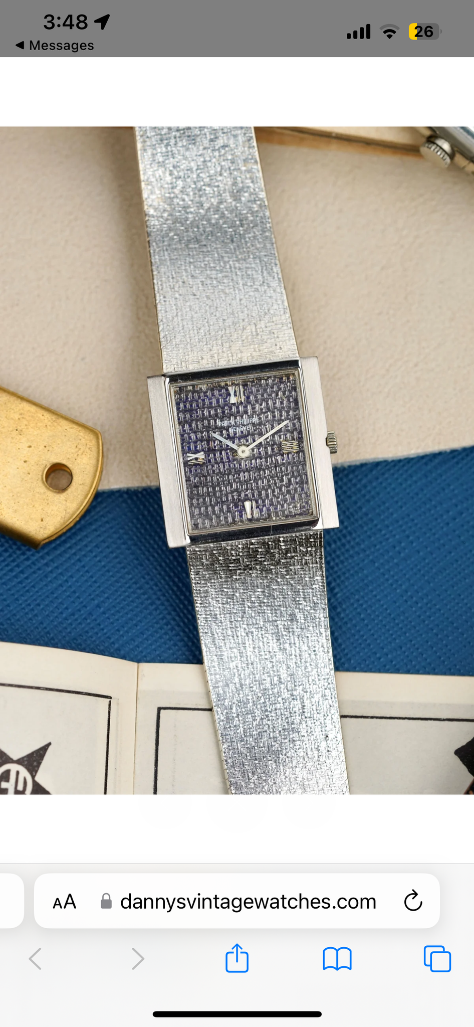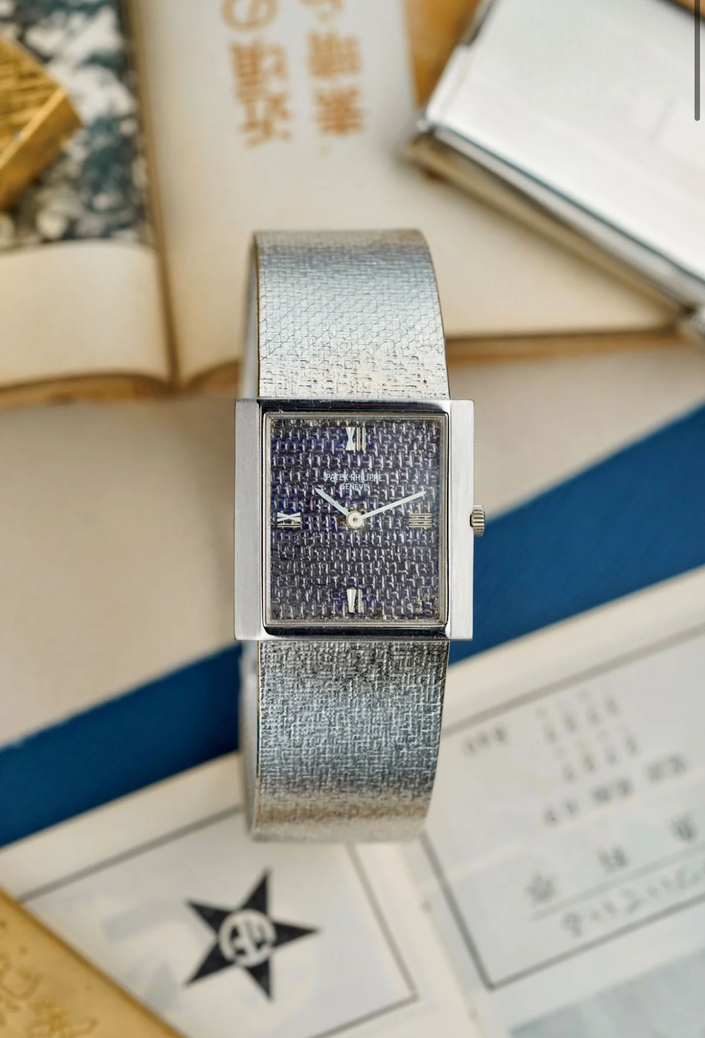 Here we have a unique vintage integrated 18kt white gold Patek Philippe with a fully integrated dial and bracelet pattern. The bracelet and dial both have the same texture throughout which gives it a sleek look. The case houses a clean blue Roman numeral dial with applied markers at 3,6,9, and 12. The dial is in good condition overall fading to a faint blue and almost silver color with no cracks or marks. It features an unpolished sharp case and bracelet powered by a manual wind movement. It keeps great time and is fully functional. Case size is 26mm including the crown. The watch is from the 80’s and its a total of …. Grams of 18kt white gold