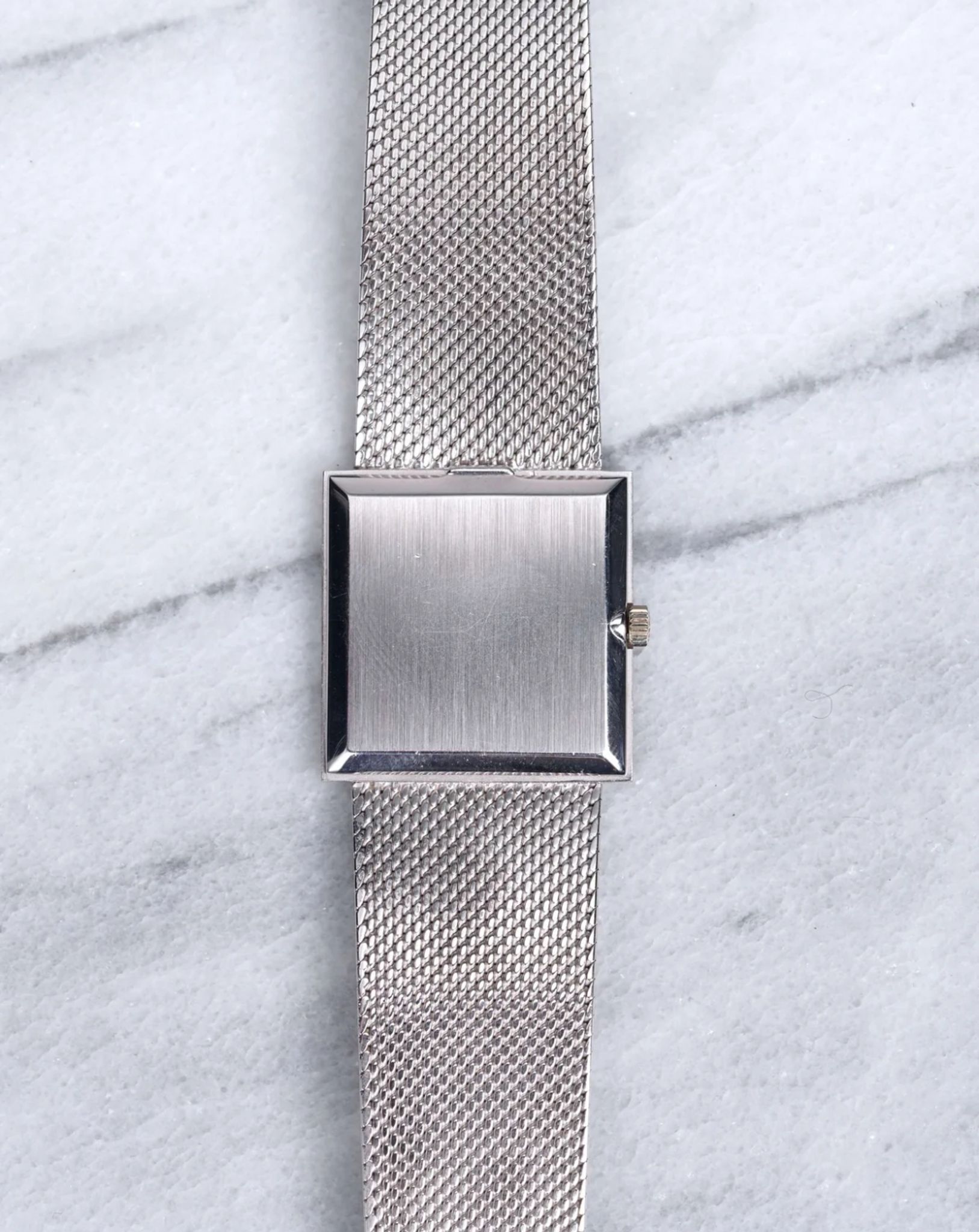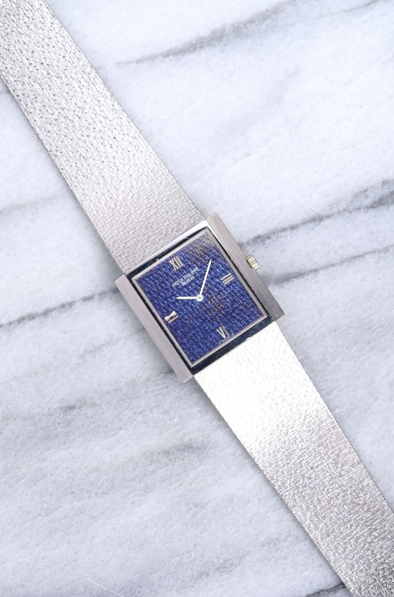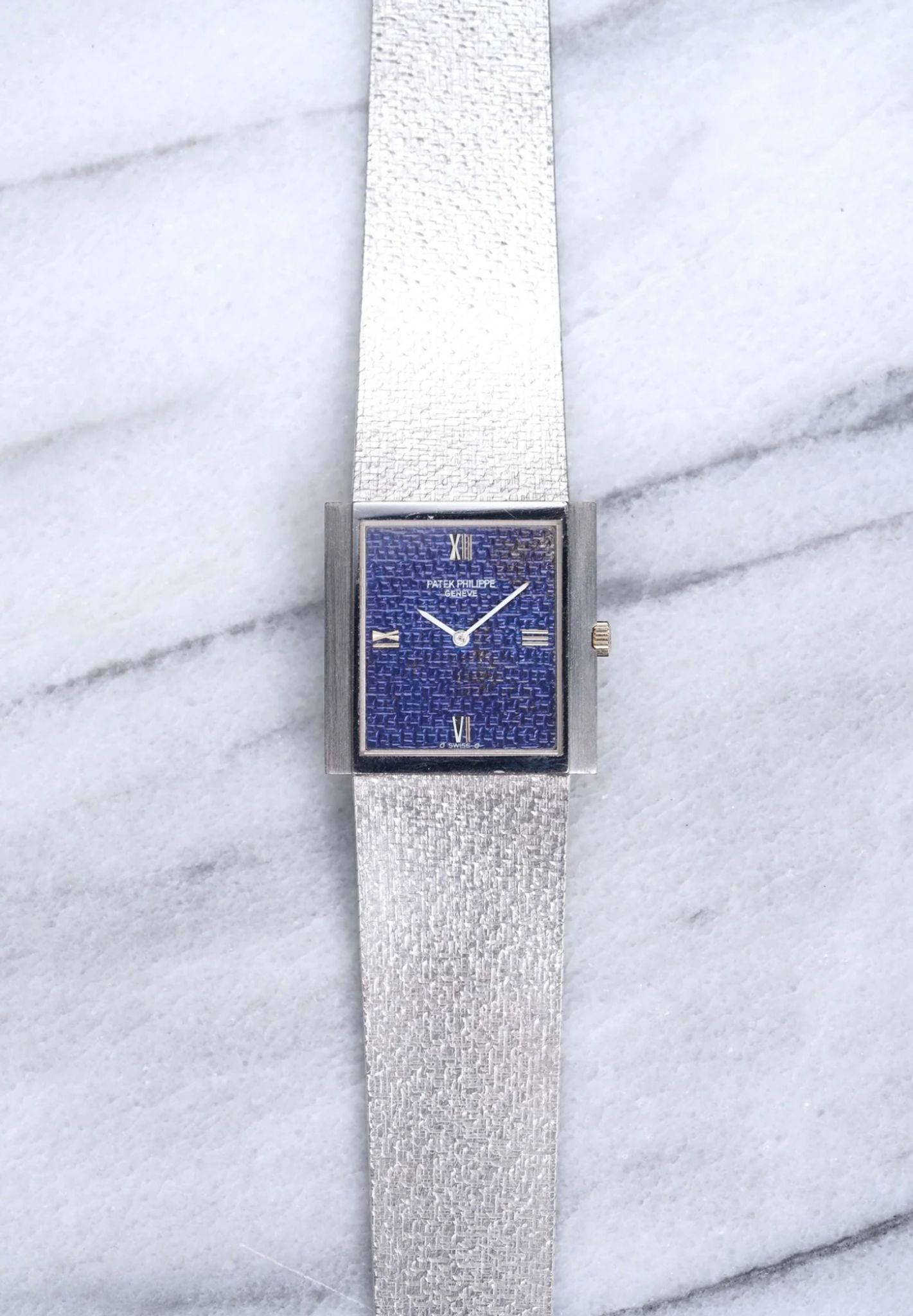 Here we have a unique vintage integrated 18k white gold Patek Philippe with a blue linen dial from the 1970s. Keeps great time and is fully functional. The bracelet fits up to a 7 inch wrist. Measurments include a 25x30mm case size. The bracelet and dial both have the same texture throughout which gives it a sleek look. The case houses a clean blue Roman numeral dial with applied markers at 3,6,9, and 12. The dial has some marks throughout the dial as seen in photos. It features an unpolished sharp case and bracelet powered by a manual wind movement. It keeps great time and is fully functional. Case size is 26mm including the crown.