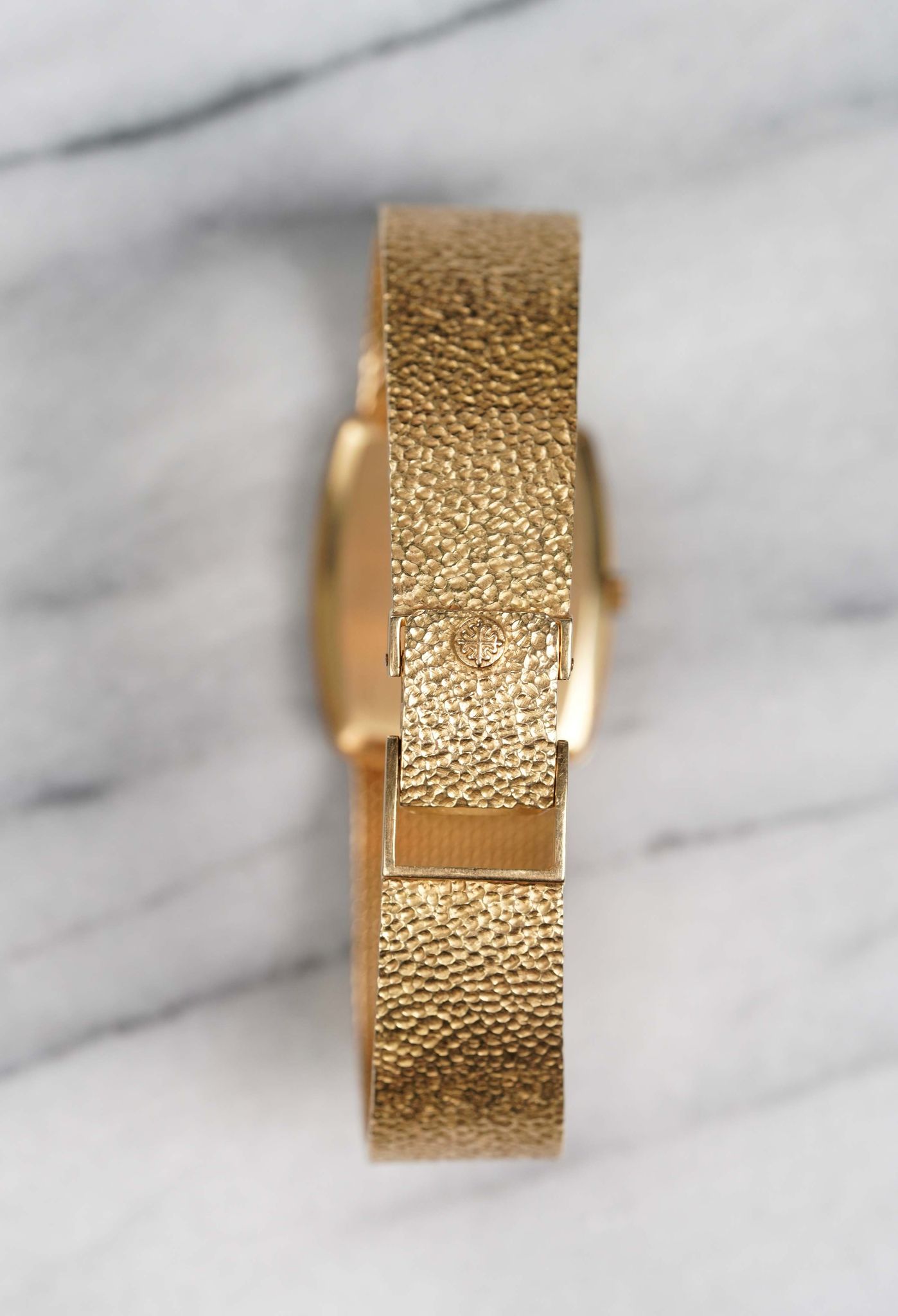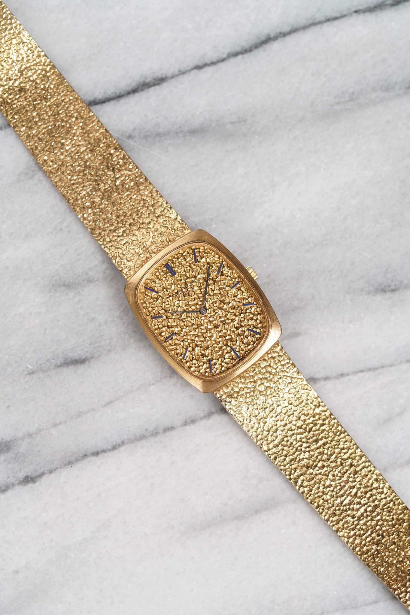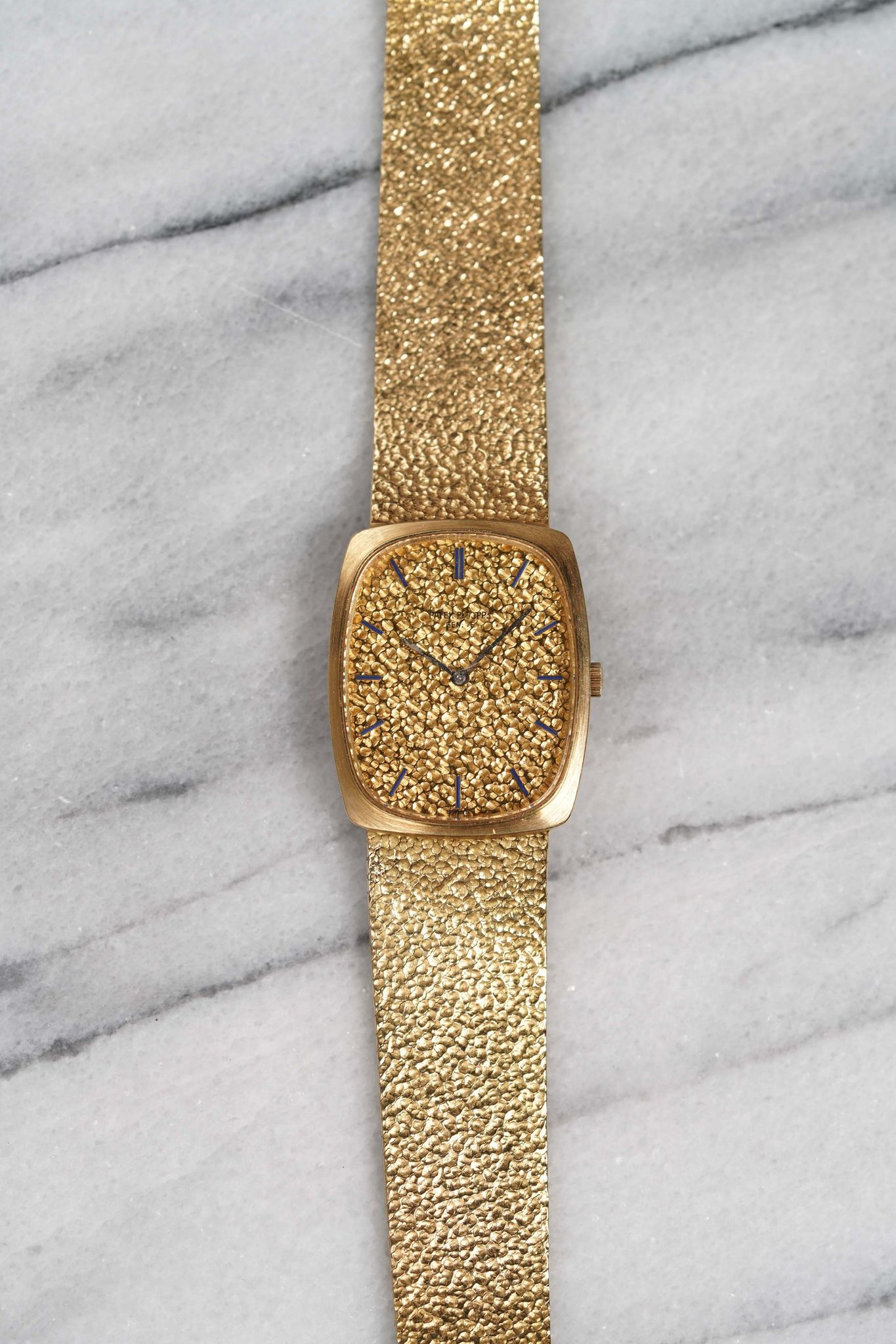 Here's a vintage Patek Philippe reference 3567 manual wind in 18K yellow gold with a champagne pebble textured (hammer finish) dial from the 70s. Recently serviced! Keeps great time and is fully functional. Measurements include a 28mm case across and an 18mm lug width (signed clasp) that fits up to a 7.5 inch wrist (the bracelet has been extended for a larger wrist) Nice texture on both the integrated bracelet and dial. Blue hour markers as seen in the photos. Matching black stick hands and hour markers. White gold case and bracelet. Very funky example. The piece is great alternative and value from other pieces offered by Patek. All parts are original including the dial, case, and movement. the dial and case are in great cosmetic, untouched condition.