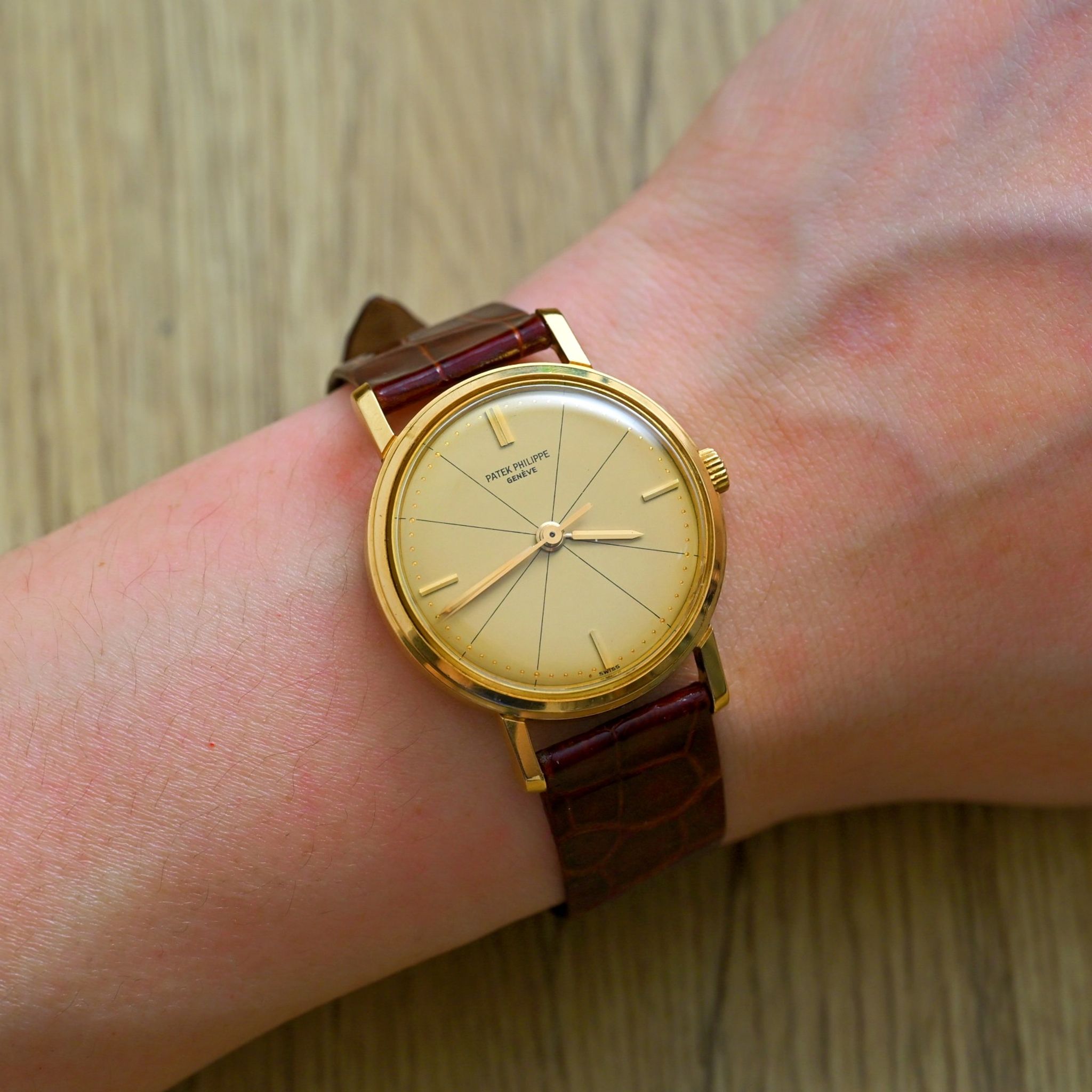 Dial: Excellent condition pure and simple gold dial with fine black lines dividing the dial into eight sections along with matching hands