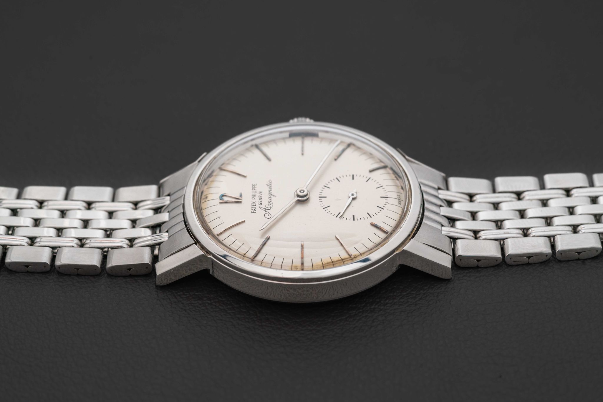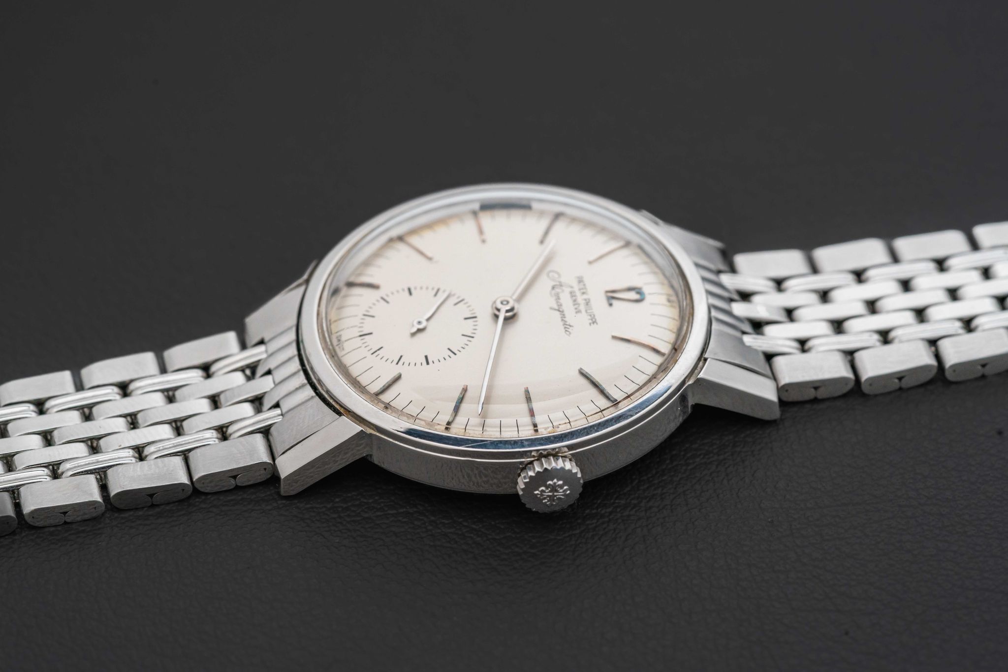 This Patek Philippe Amagnetic is in good, honest vintage condition. The case is sharp, and appears unpolished. The dial on this particular example is overall very nice, but shows some wear/aging around the edges of the dial, as shown in the photos. Further, the watch is fitted on a rare period Gay Freres beads-of-rice bracelet, dated to 1963.