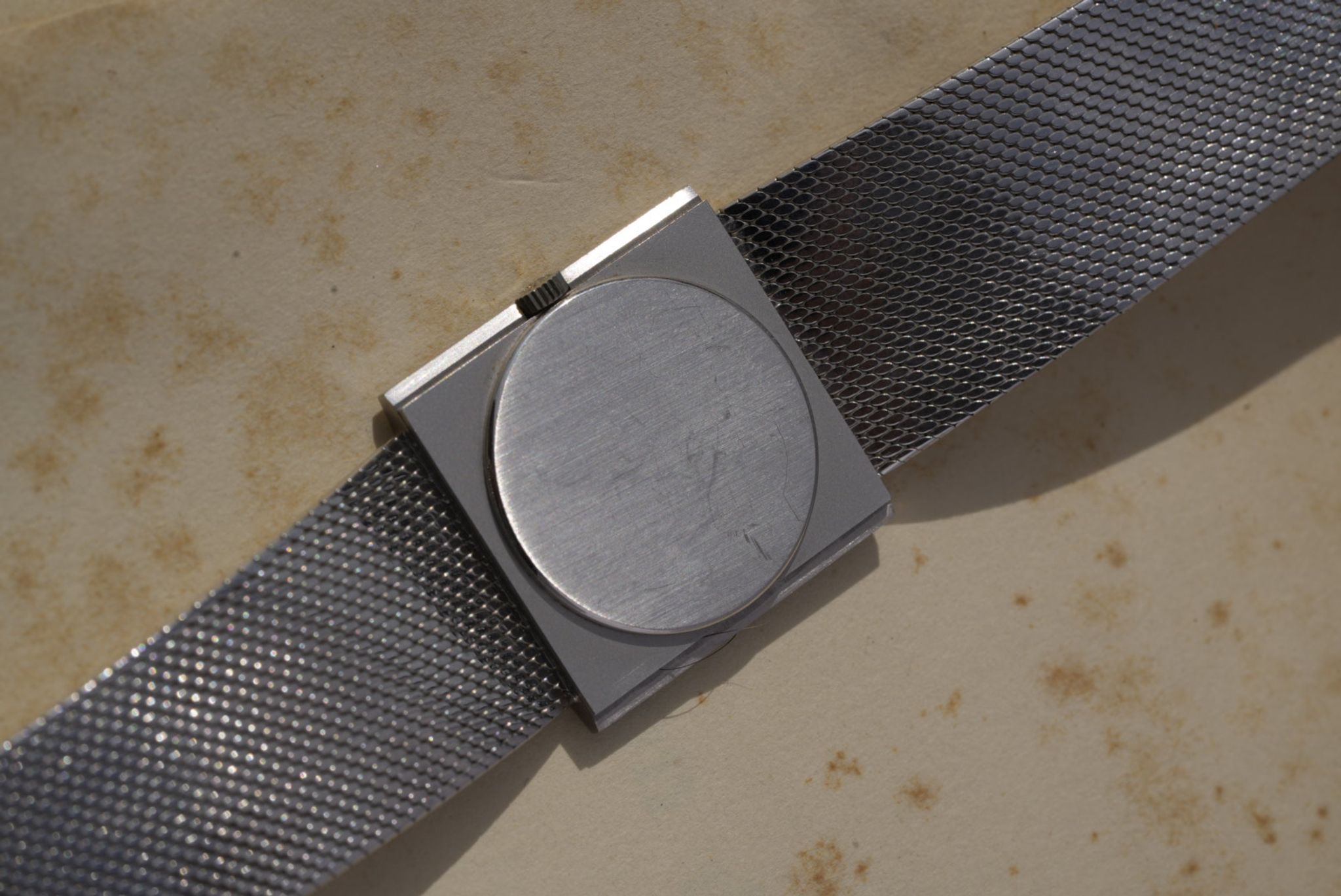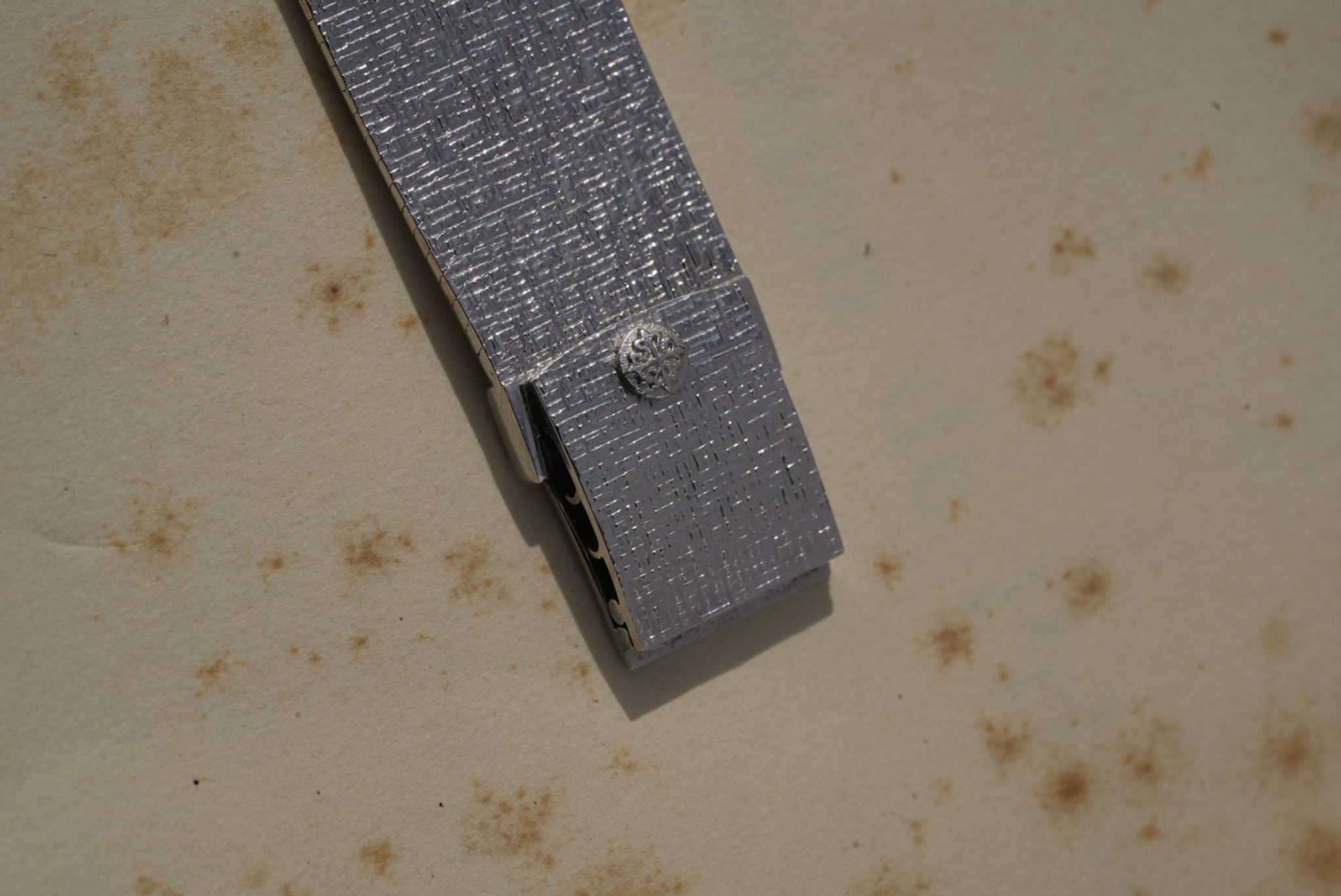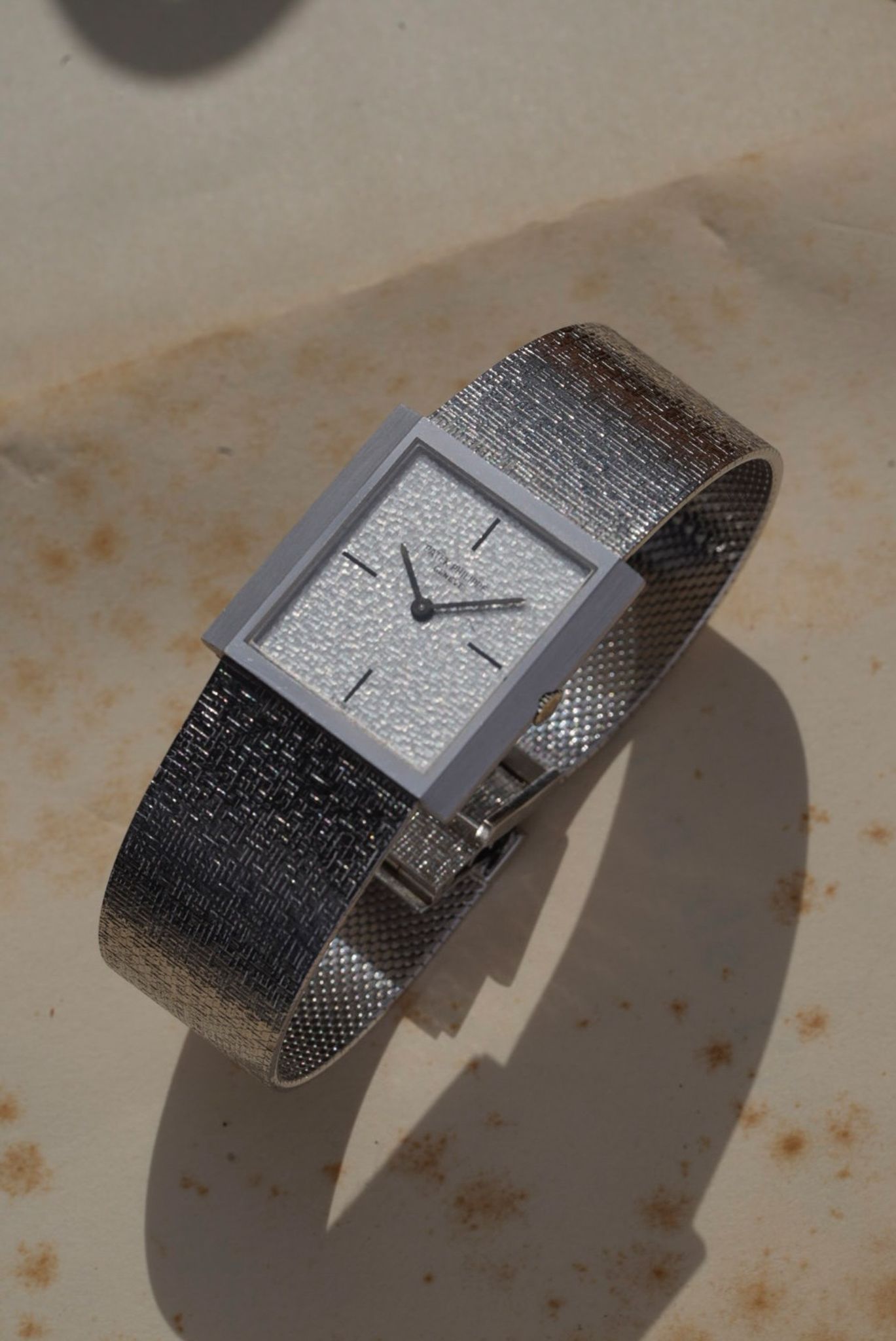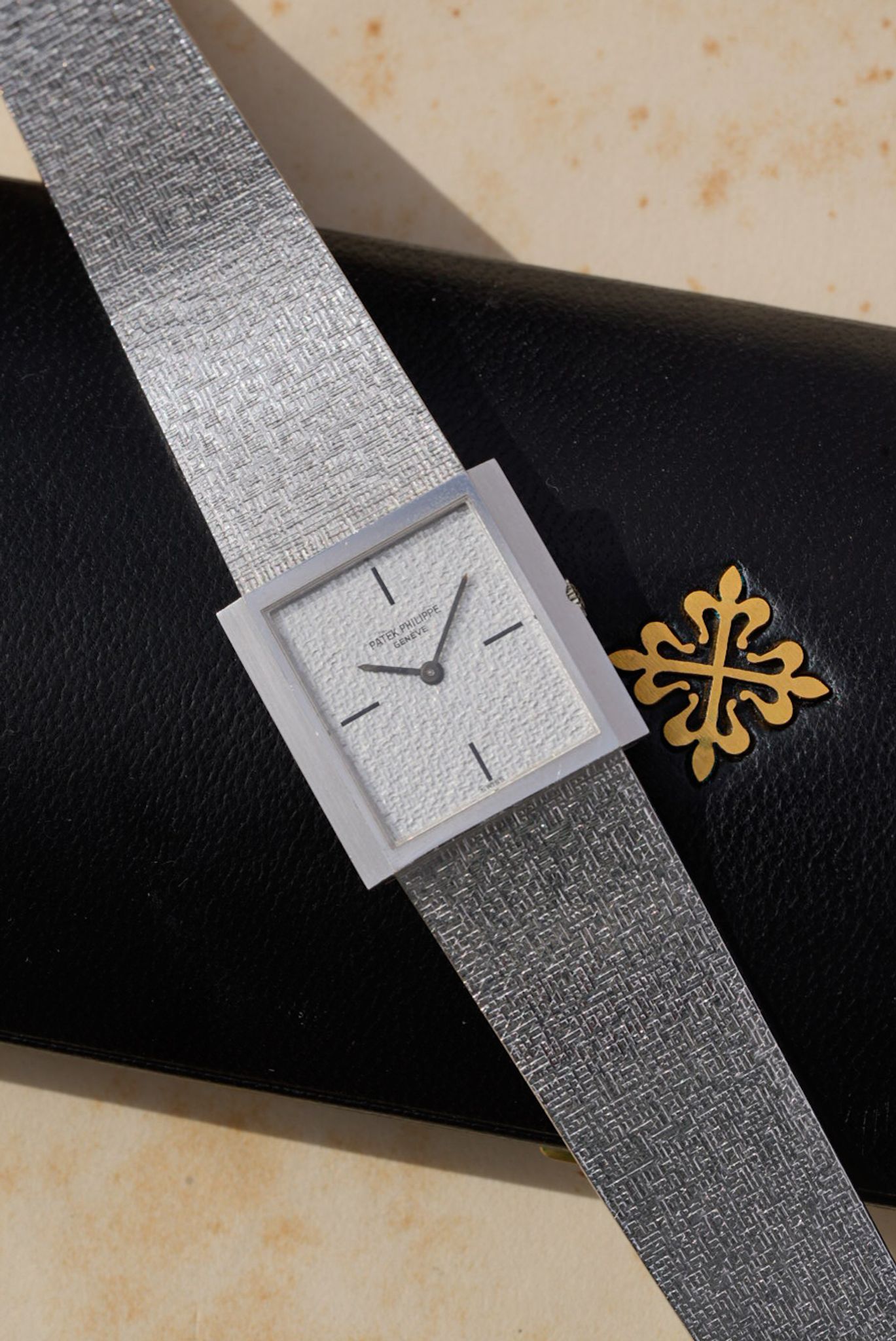 Patek Philippe 3491/3 in 18k white gold, a dress watch from the 1970s featuring a 33-34 mm case and integrated signed bracelet. It is powered by the manual-wind caliber 23-300 PM. Silver sunburst dial with applied indexes and baton hands. Sold with original box, in mint condition.