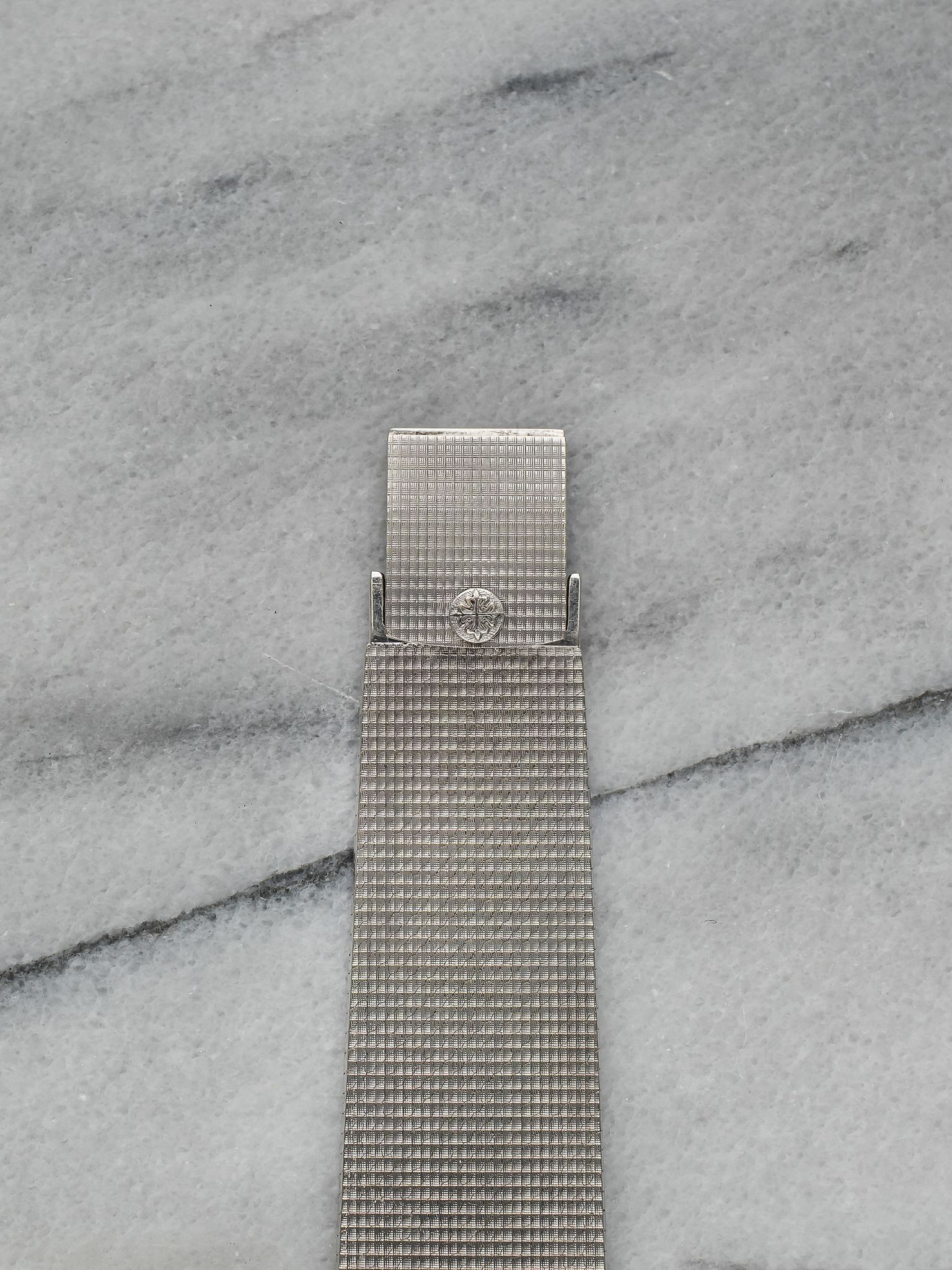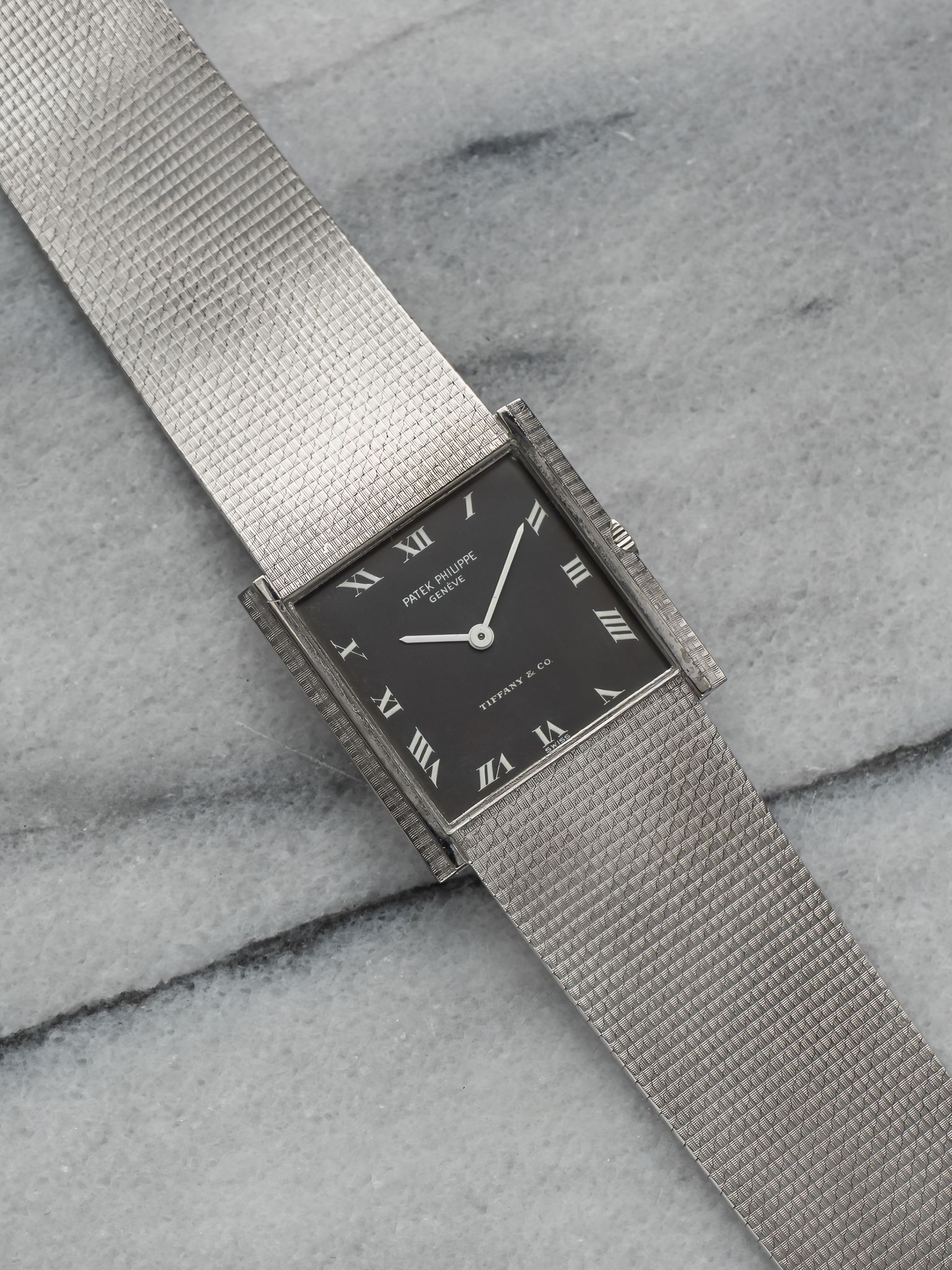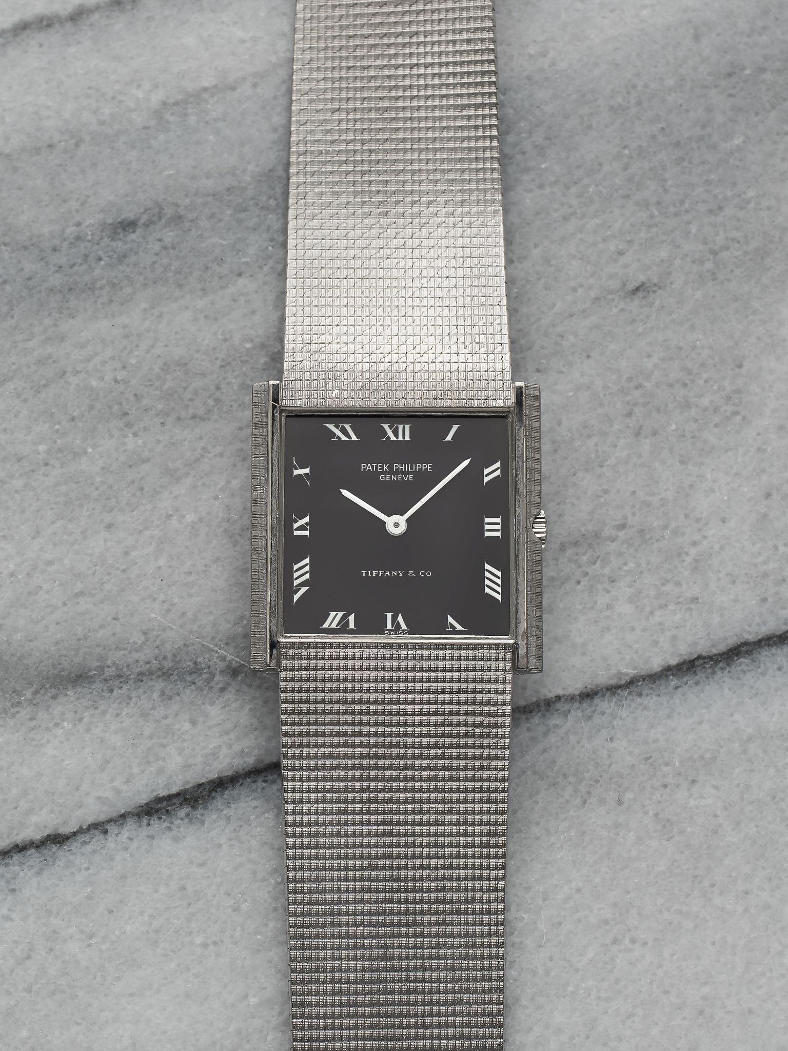Here's a vintage Patek Philippe reference number 3494 manual wind in 18K white gold with a grey Roman numeral dial from the 80s. Tiffany & Co stamp at 6 o’clock. Recently serviced. Keeps great time and is fully functional. Measurements include a 32mm case across and an 18mm lug width (signed clasp) that fits up to a 7 inch wrist. Matching white hands and hour markers. White gold case and bracelet. The piece is unisex , it can be worn by both men and women. Interesting texture on the integrated bracelet, as seen in photos. There is an engraving on the casebook, as seen in photos. The piece is great alternative and value from other pieces offered by AP. All parts are original including the dial, case, and movement. the dial and case are in great cosmetic, untouched condition.