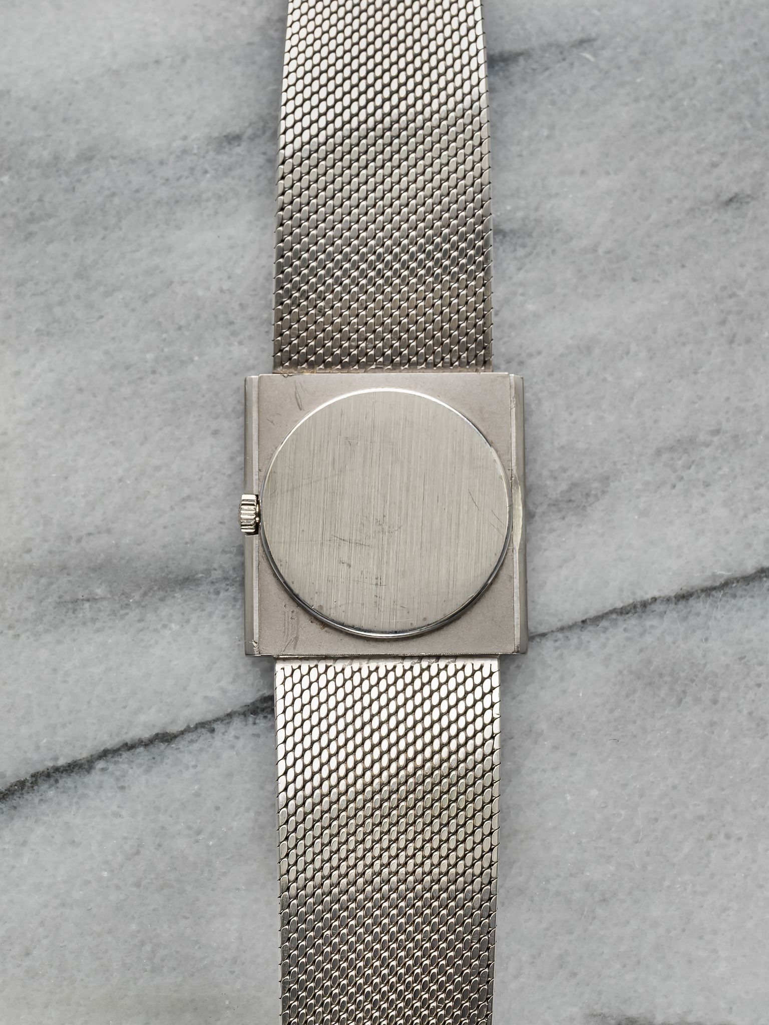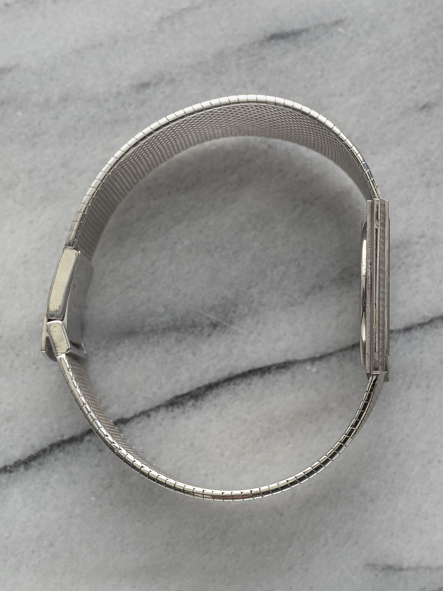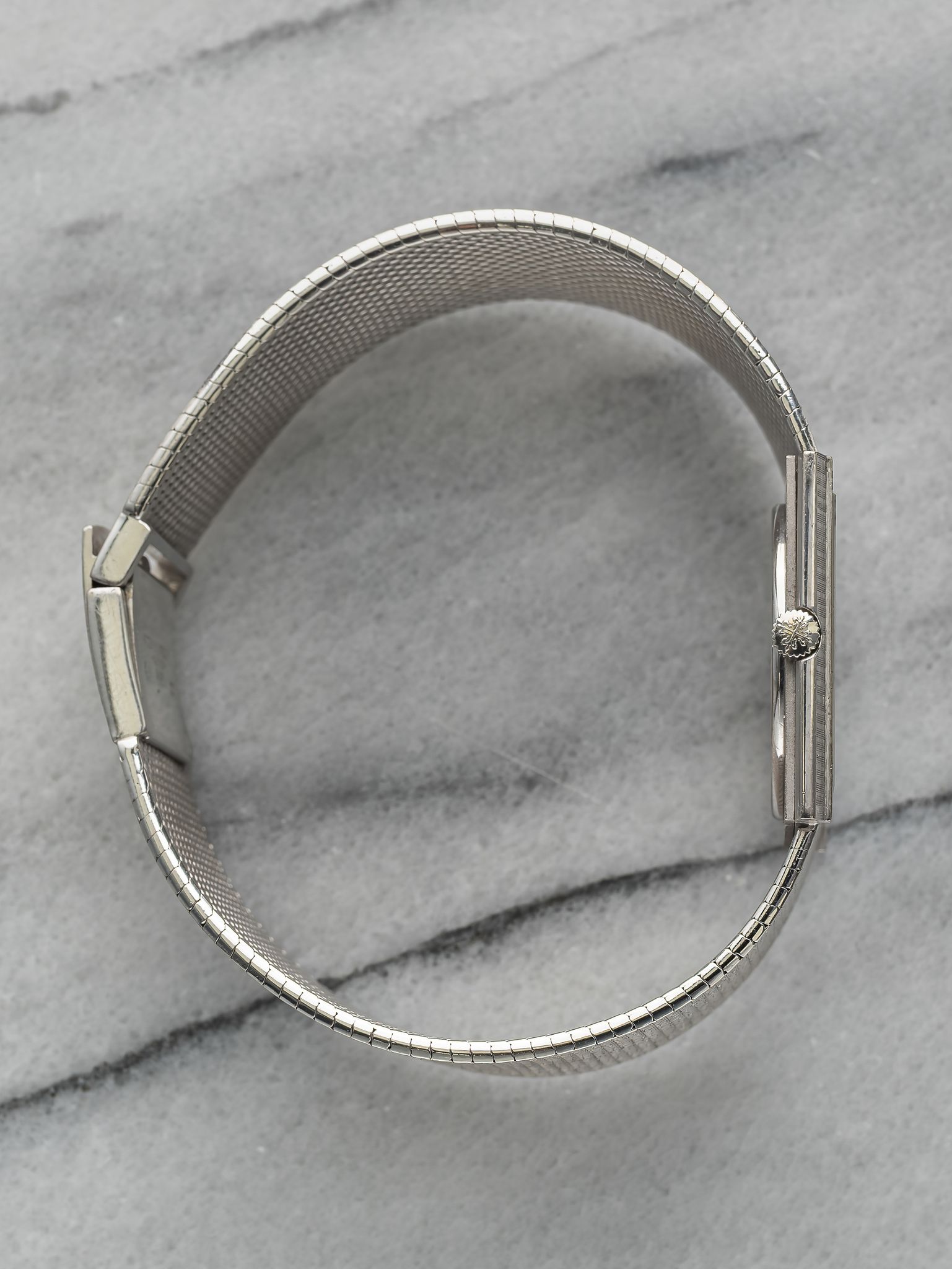 Here's a vintage Patek Philippe reference number 3494 manual wind in 18K white gold with a grey Roman numeral dial from the 80s. Tiffany & Co stamp at 6 o’clock. Recently serviced. Keeps great time and is fully functional. Measurements include a 32mm case across and an 18mm lug width (signed clasp) that fits up to a 7 inch wrist. Matching white hands and hour markers. White gold case and bracelet. The piece is unisex , it can be worn by both men and women. Interesting texture on the integrated bracelet, as seen in photos. There is an engraving on the casebook, as seen in photos. The piece is great alternative and value from other pieces offered by AP. All parts are original including the dial, case, and movement. the dial and case are in great cosmetic, untouched condition.