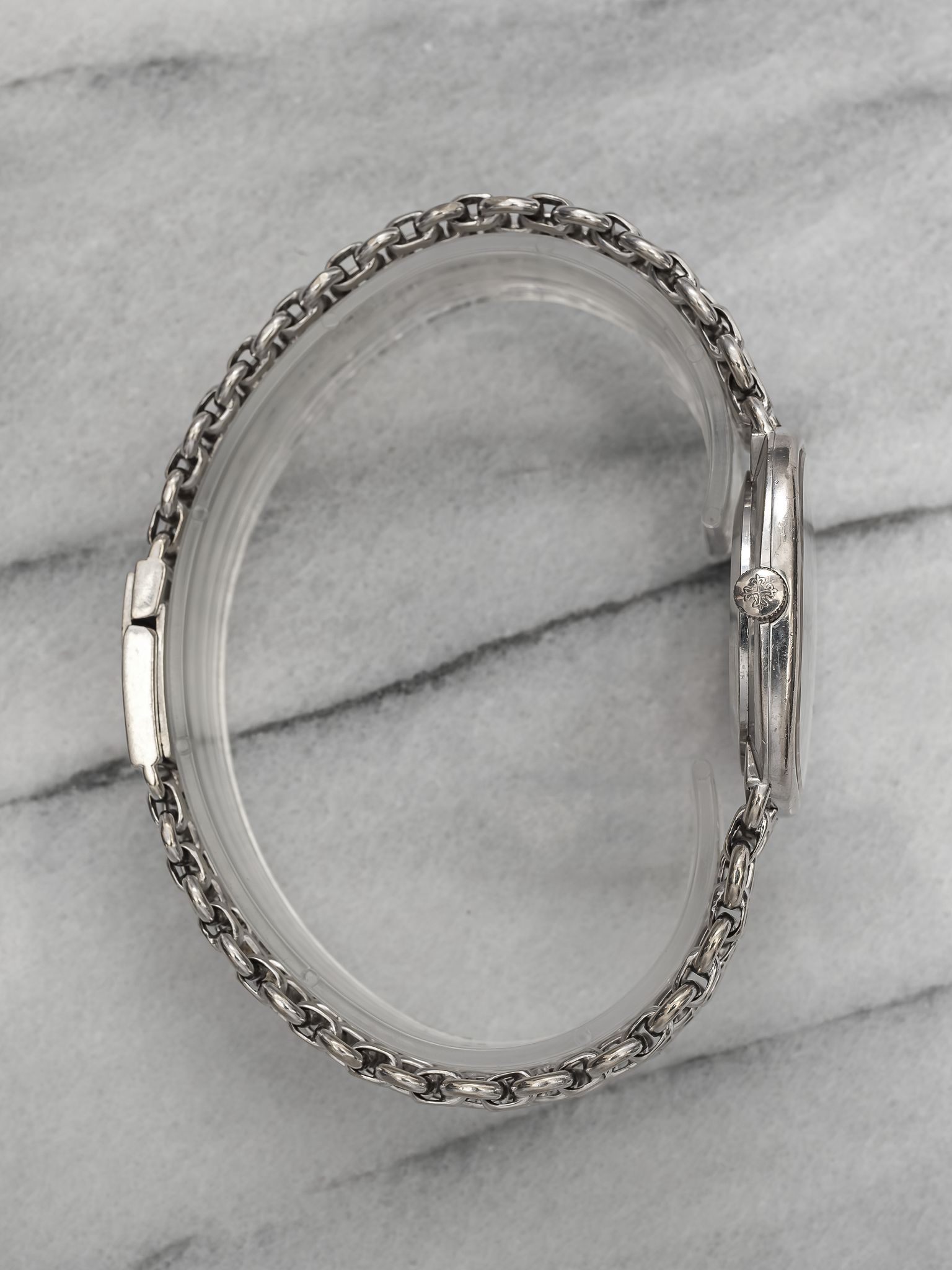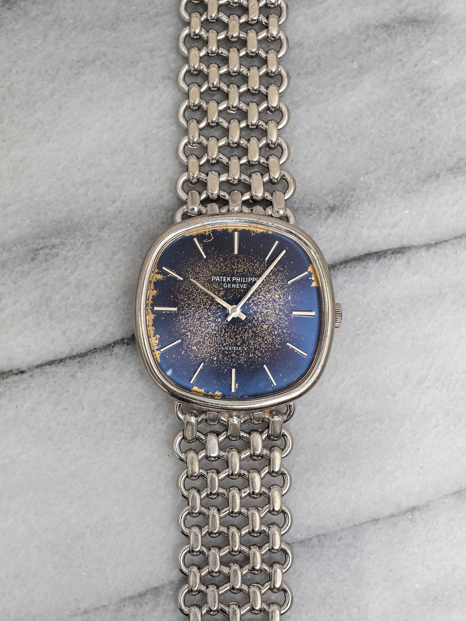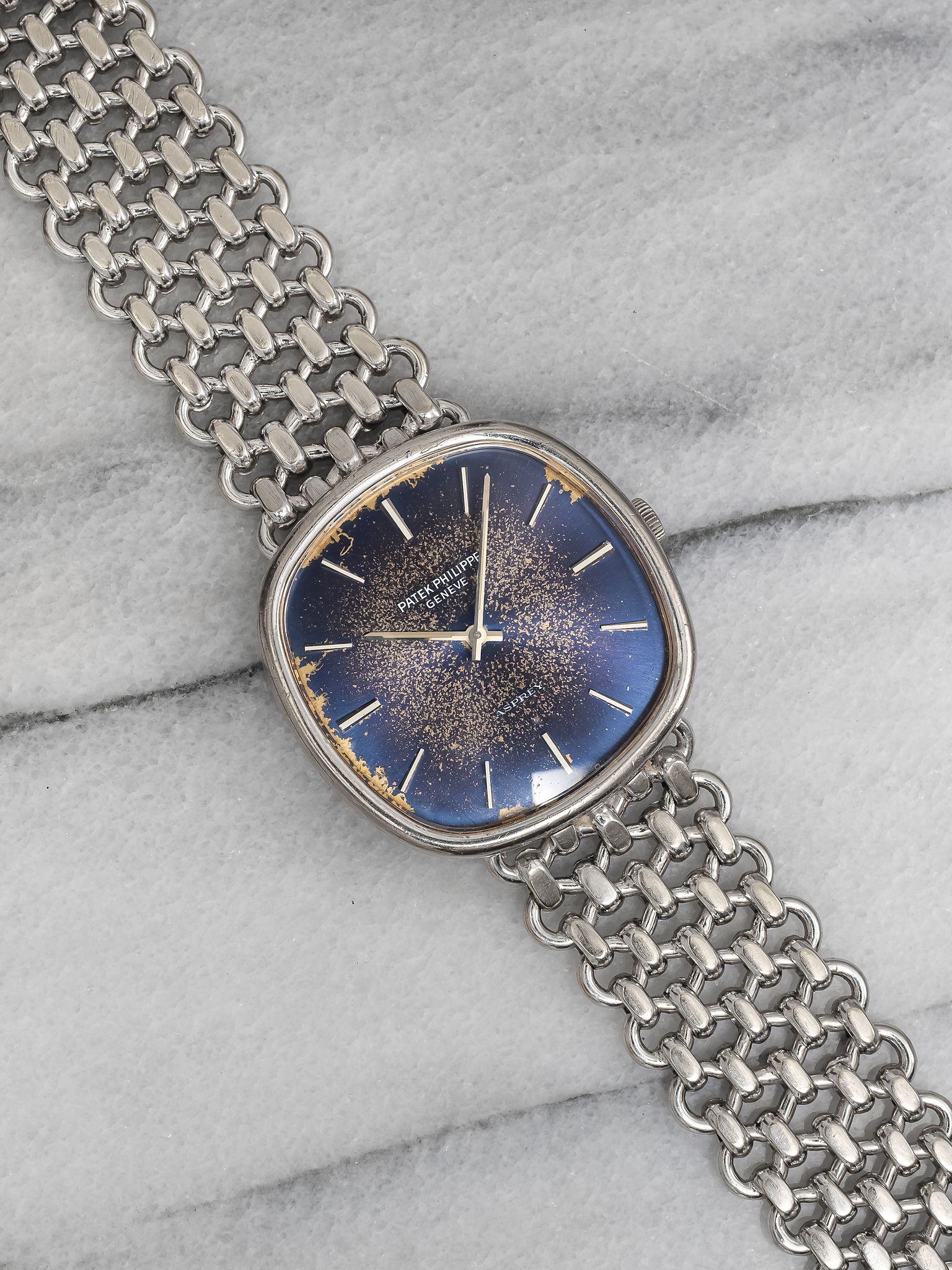 Here’s a Patek Philippe Ellipse reference 3544 in 18K white gold manual wind with a sunburst blue patina dial from the 1980s. Measurements include a 32mm case and a bracelet that fits up to a 7.25 inch wrist. "Asprey" stamp at 6 a clock, quite rare to see. The dial developed some aging/ patina throughout due to age, alot of exposure to the sun. Some chipping around the hour markers as seen in photos. Fitted on its original matching chain-link bracelet for a seamless and refined look. Slim, minimalist design with applied gold indices, Matching silver stick hands and hour markers. Sigma markings at 6 a clock indicate that the hands and hour markers are made of gold. Original case, dial, bracelet, and movement. Fully functional and keeping time.