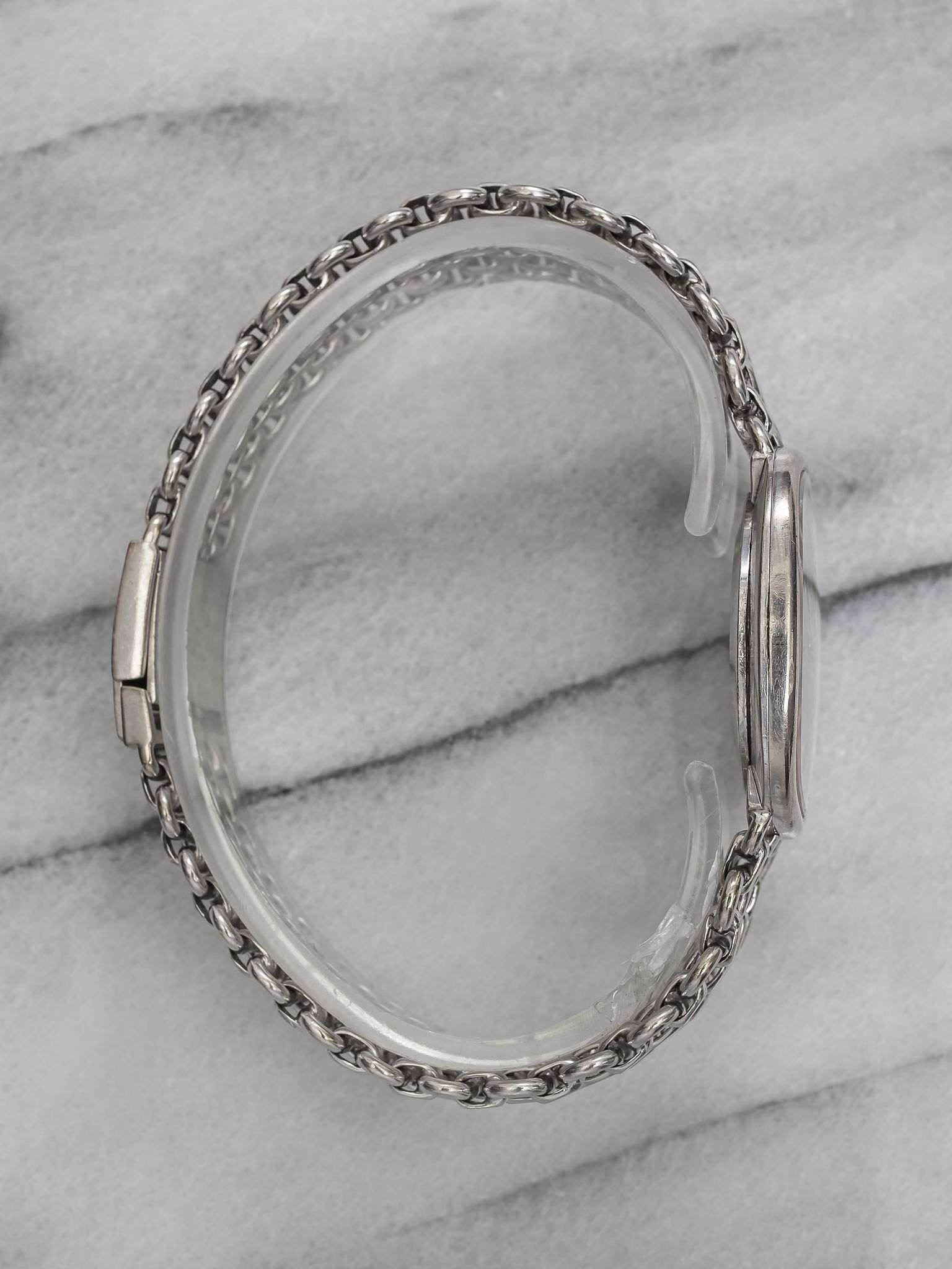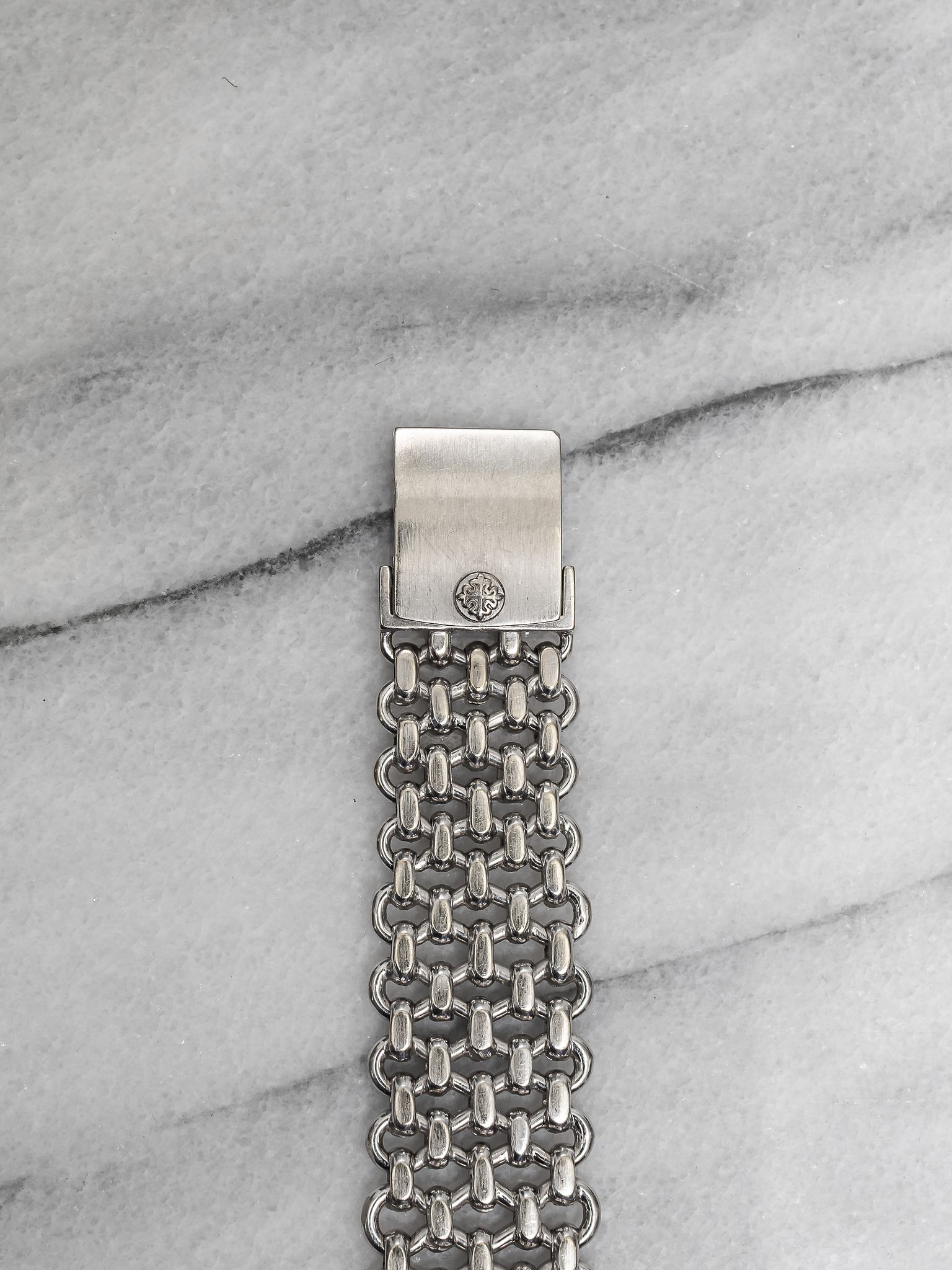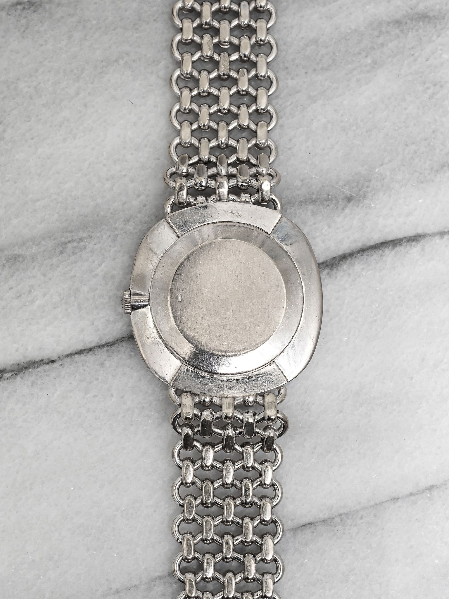 Here’s a Patek Philippe Ellipse reference 3544 in 18K white gold manual wind with a sunburst blue patina dial from the 1980s. Measurements include a 32mm case and a bracelet that fits up to a 7.25 inch wrist. "Asprey" stamp at 6 a clock, quite rare to see. The dial developed some aging/ patina throughout due to age, alot of exposure to the sun. Some chipping around the hour markers as seen in photos. Fitted on its original matching chain-link bracelet for a seamless and refined look. Slim, minimalist design with applied gold indices, Matching silver stick hands and hour markers. Sigma markings at 6 a clock indicate that the hands and hour markers are made of gold. Original case, dial, bracelet, and movement. Fully functional and keeping time.