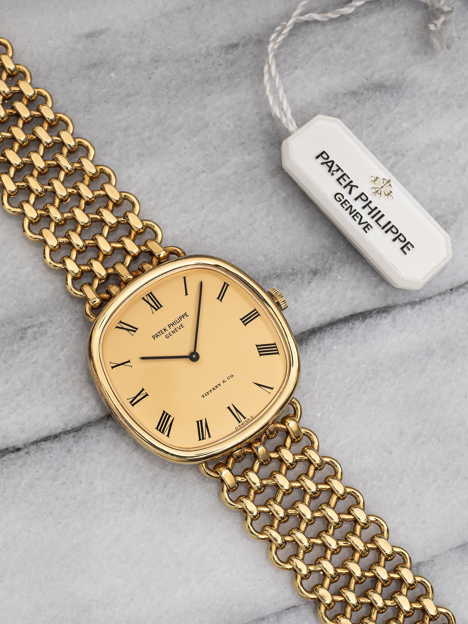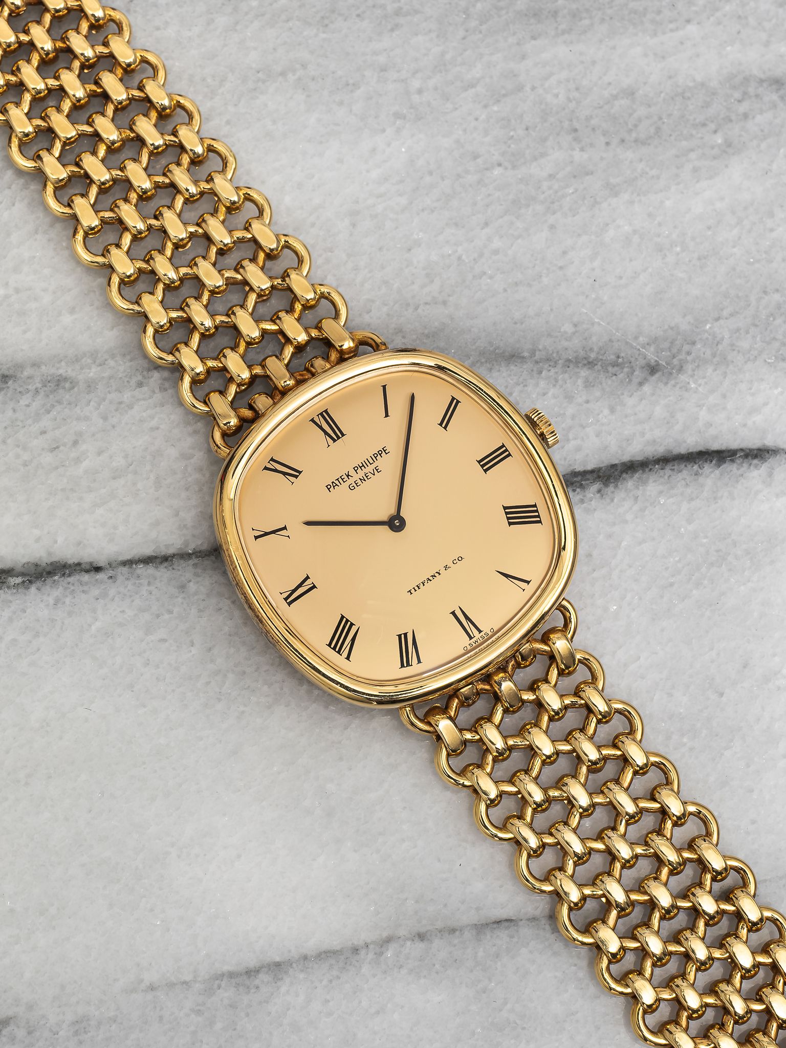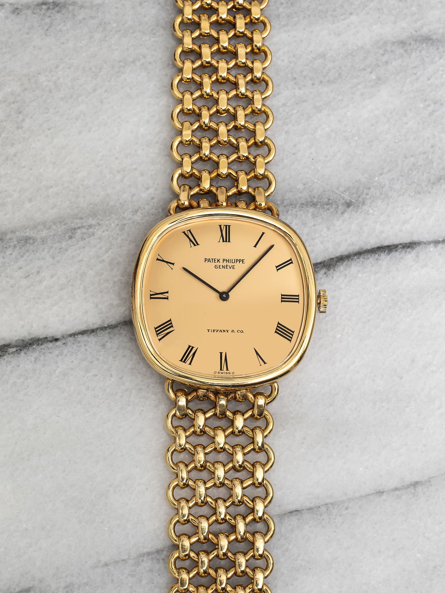 Here’s a Patek Philippe Ellipse reference 3544 in 18K yellow gold manual wind with a sunburst champagne dial from the 1980s. Measurements include a 32mm case and a bracelet that fits up to a 7.25 inch wrist. "Tiffany & Co" stamp at 6 a clock, quite rare to see. Fitted on its original matching chain-link bracelet for a seamless and refined look. Slim, minimalist design with applied gold indices, Matching black hands and hour markers (roman numerals). Sigma markings at 6 a clock indicate that the hands and hour markers are made of gold. Original case, dial, bracelet, and movement. Fully functional and keeping time.