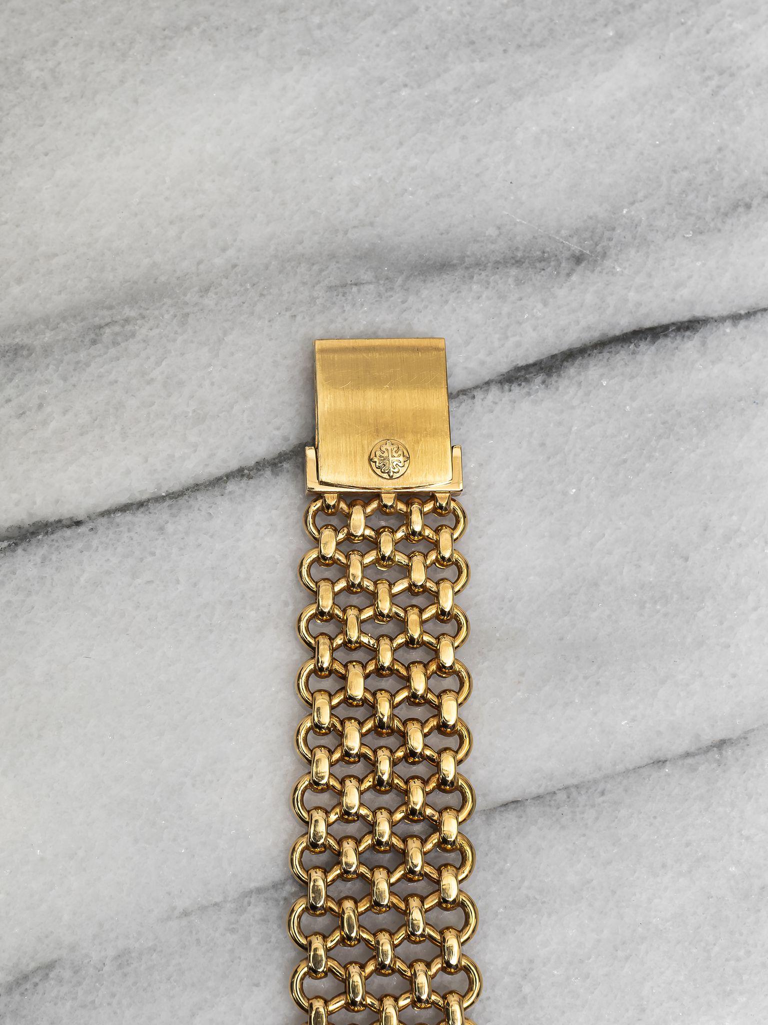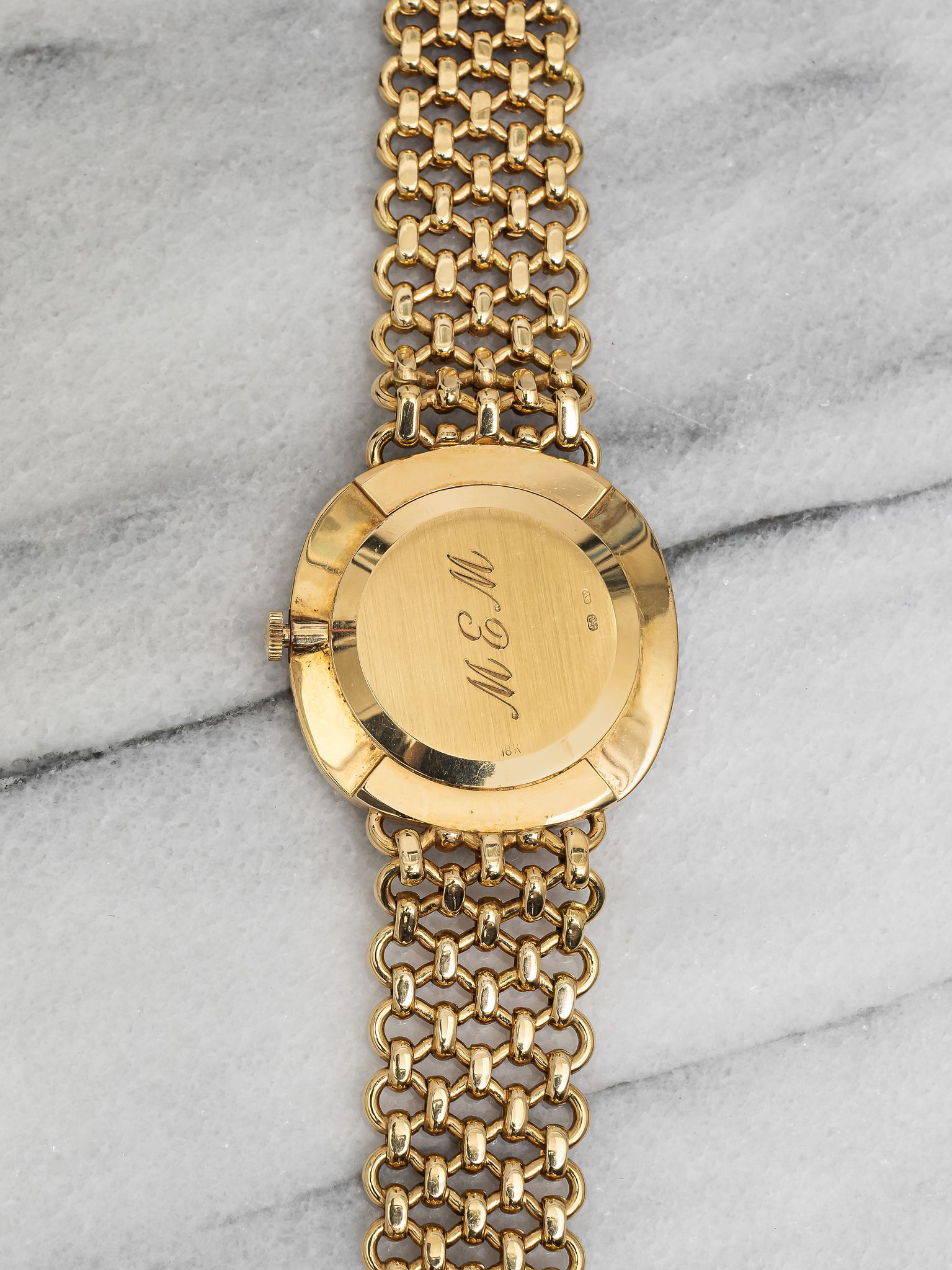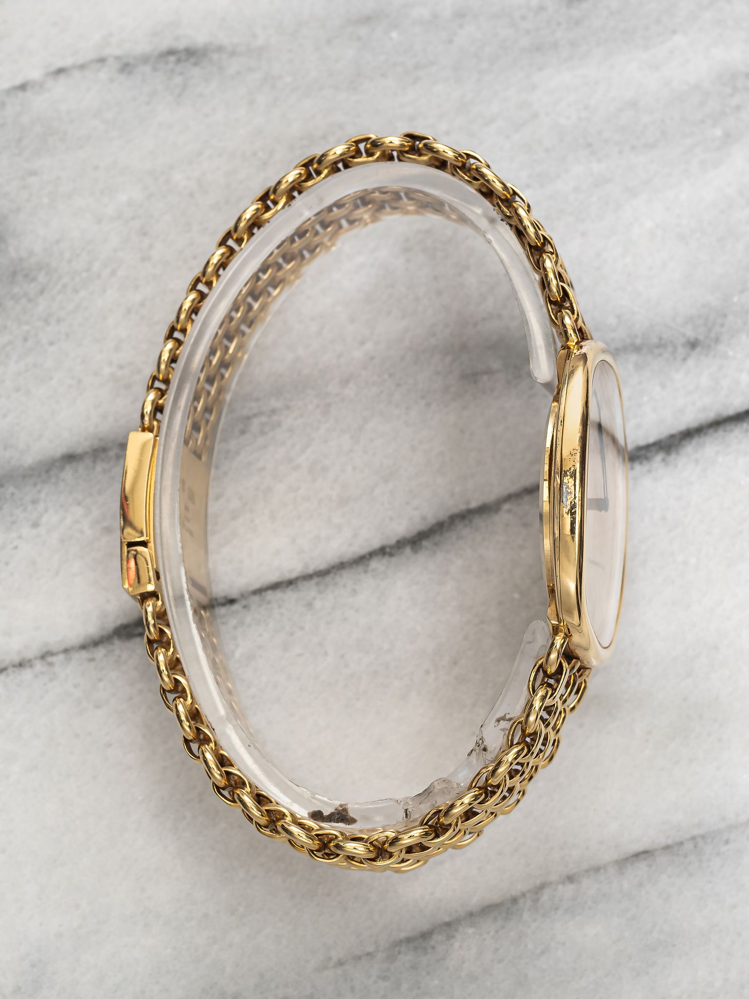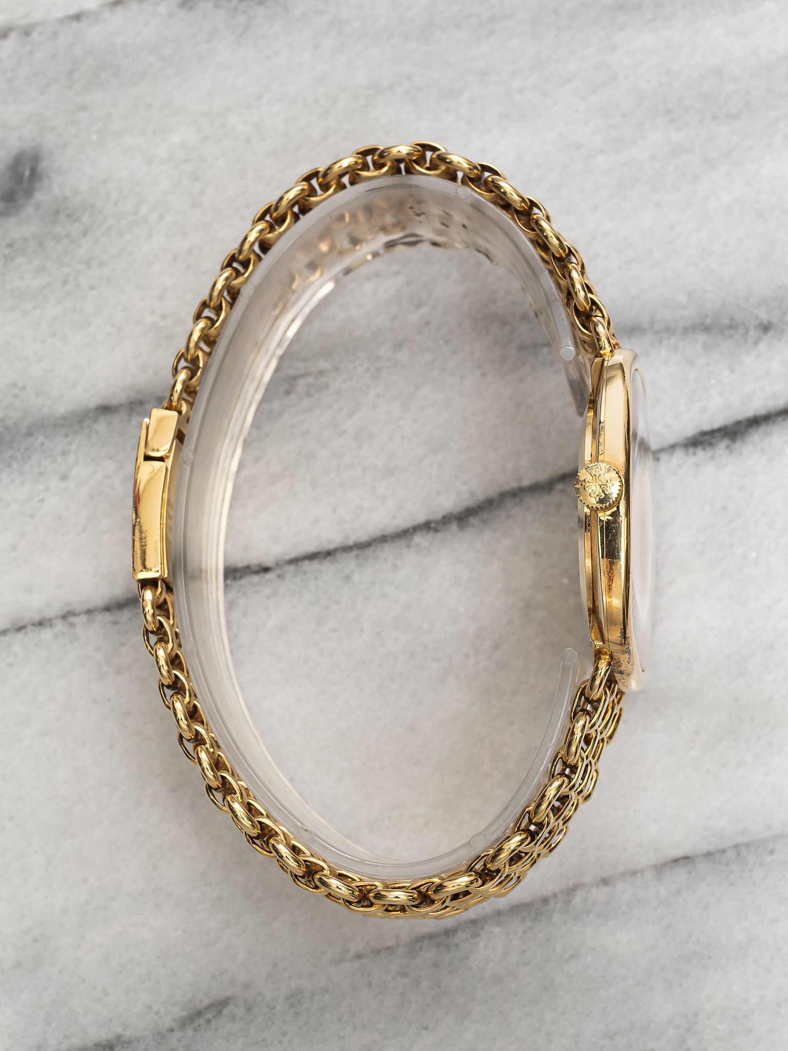 Here’s a Patek Philippe Ellipse reference 3544 in 18K yellow gold manual wind with a sunburst champagne dial from the 1980s. Measurements include a 32mm case and a bracelet that fits up to a 7.25 inch wrist. "Tiffany & Co" stamp at 6 a clock, quite rare to see. Fitted on its original matching chain-link bracelet for a seamless and refined look. Slim, minimalist design with applied gold indices, Matching black hands and hour markers (roman numerals). Sigma markings at 6 a clock indicate that the hands and hour markers are made of gold. Original case, dial, bracelet, and movement. Fully functional and keeping time.