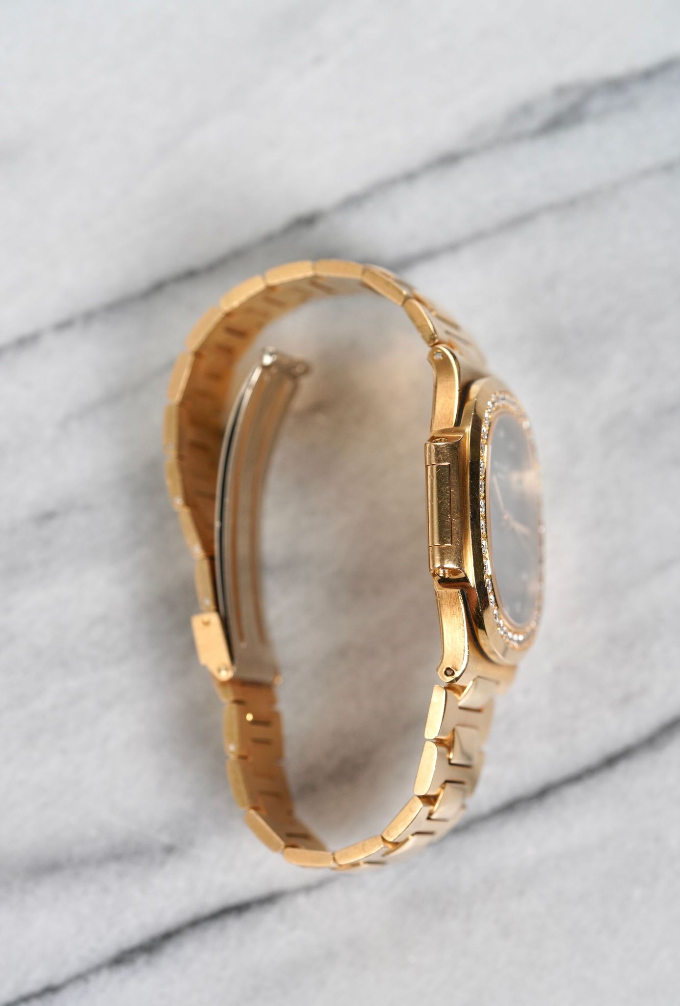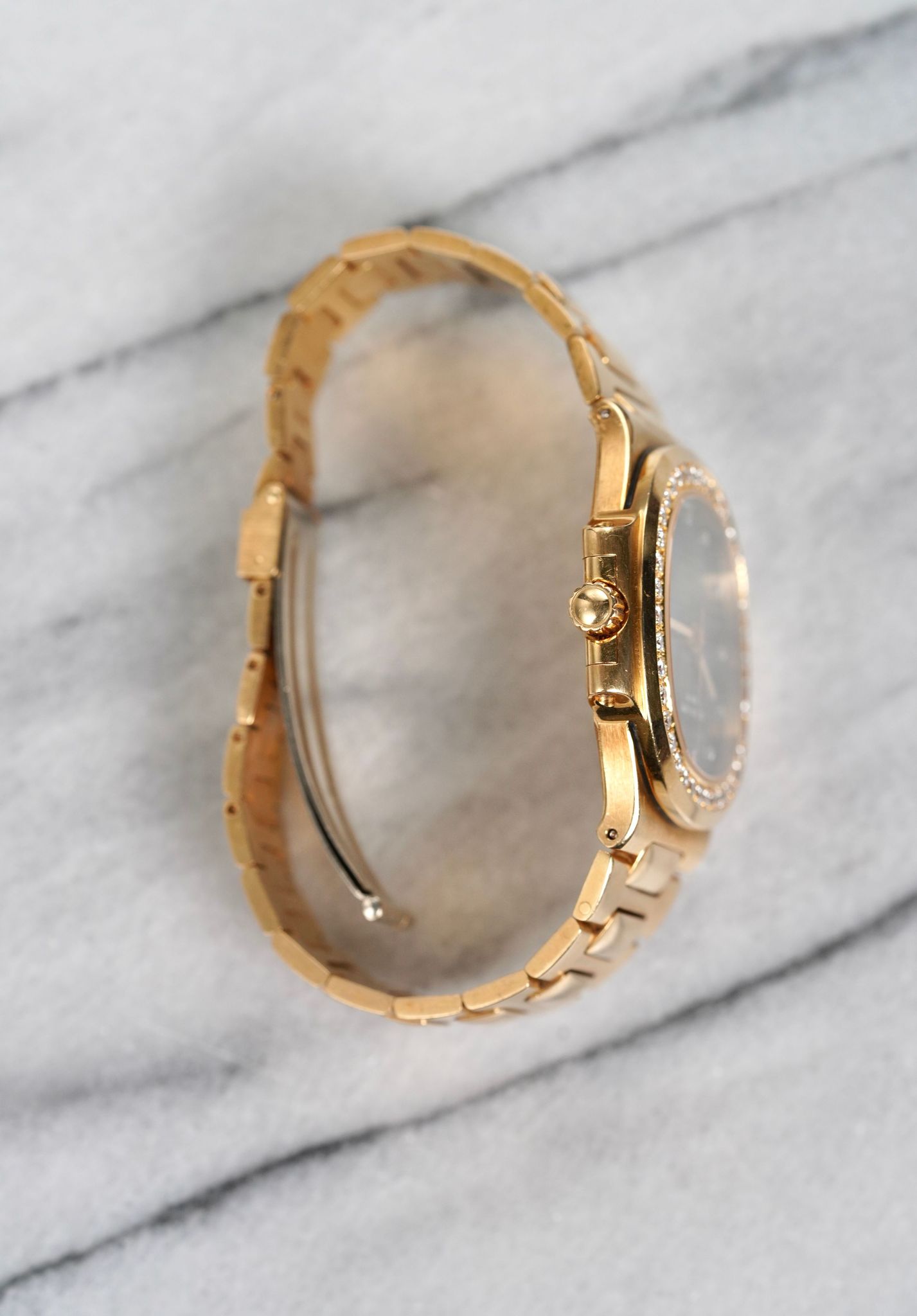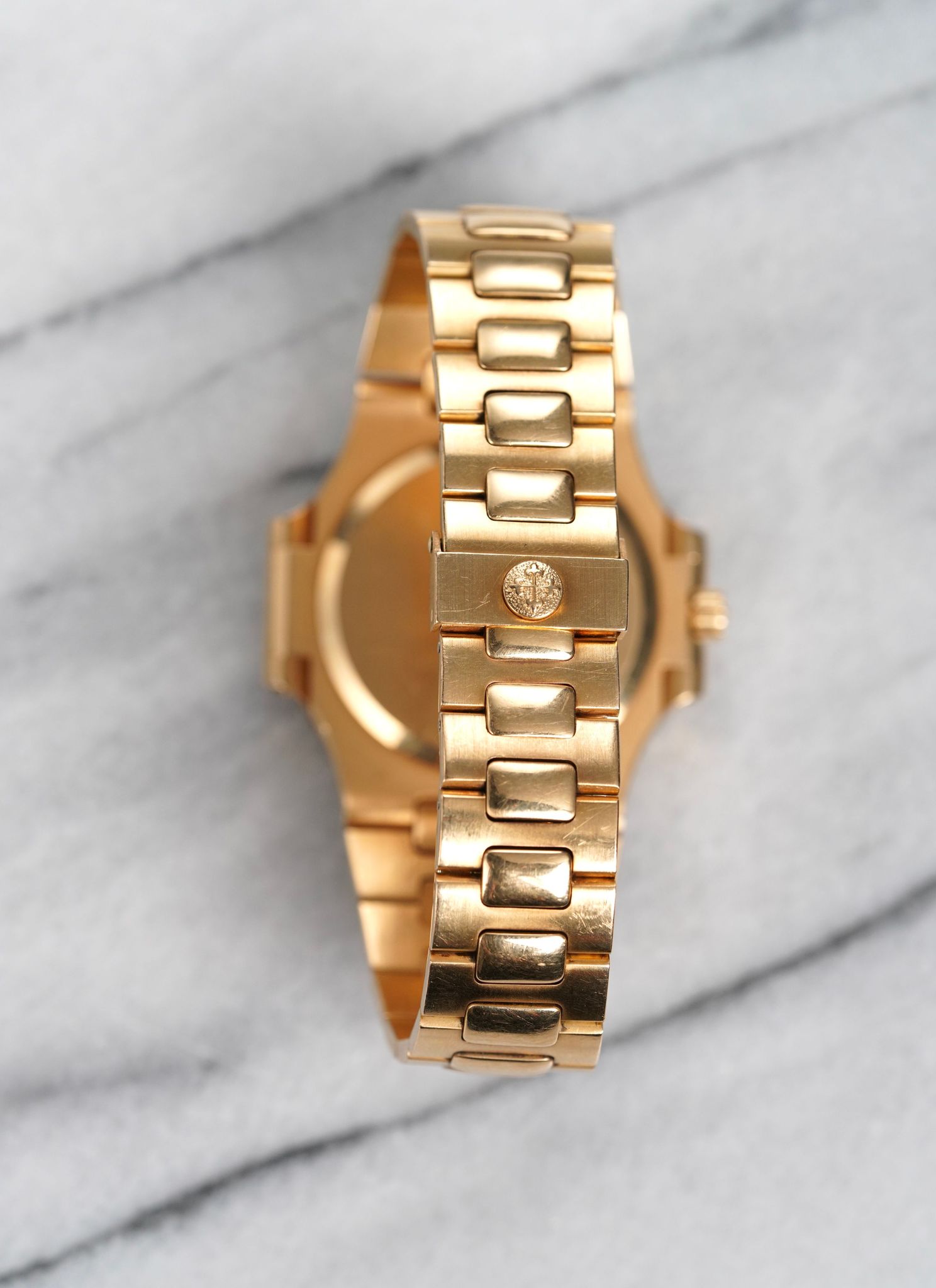 Here’s a Patek Philippe reference 3800J Nautilus with a blue dial with diamond markers in 18k yellow gold from the 1990s. Measurements include a 37mm case and fits up to a 7 inch wrist. Factory diamond bezel that compliments the diamond markers. Quickset date function at 3 a clock. This mid-size icon features the classic Nautilus design with integrated bracelet, slim profile, and elegant proportions. The case and bracelet are in great shape. Original case, dial, bracelet, and movement. Fully functional and keeping time.